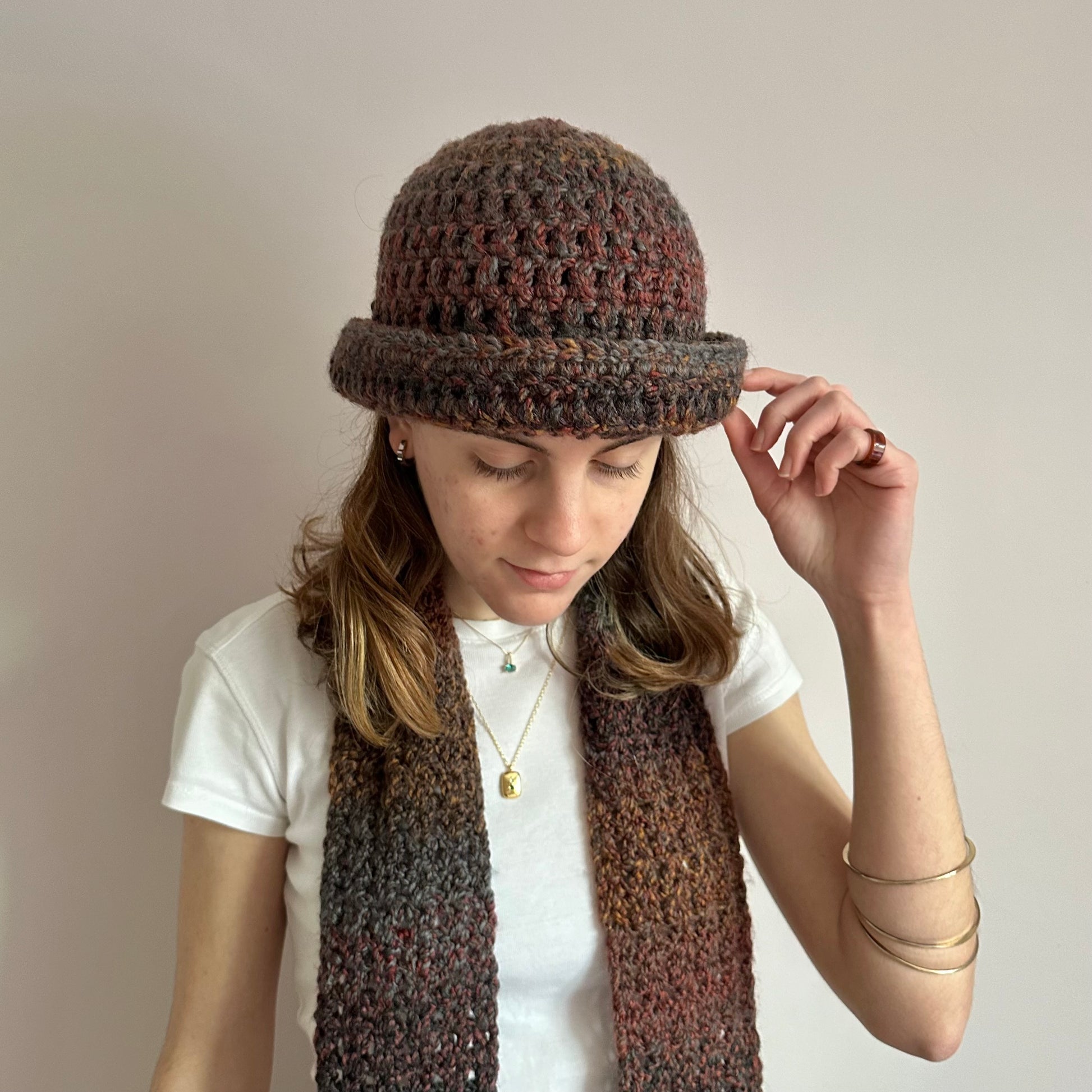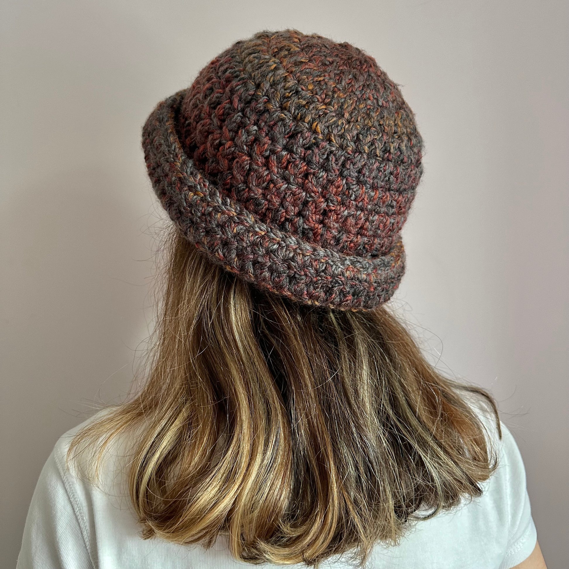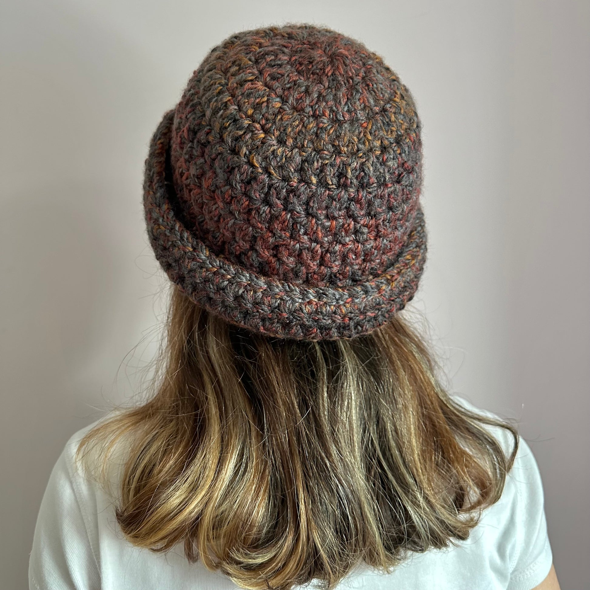 Handmade brown, grey and orange chunky crochet bowler hat