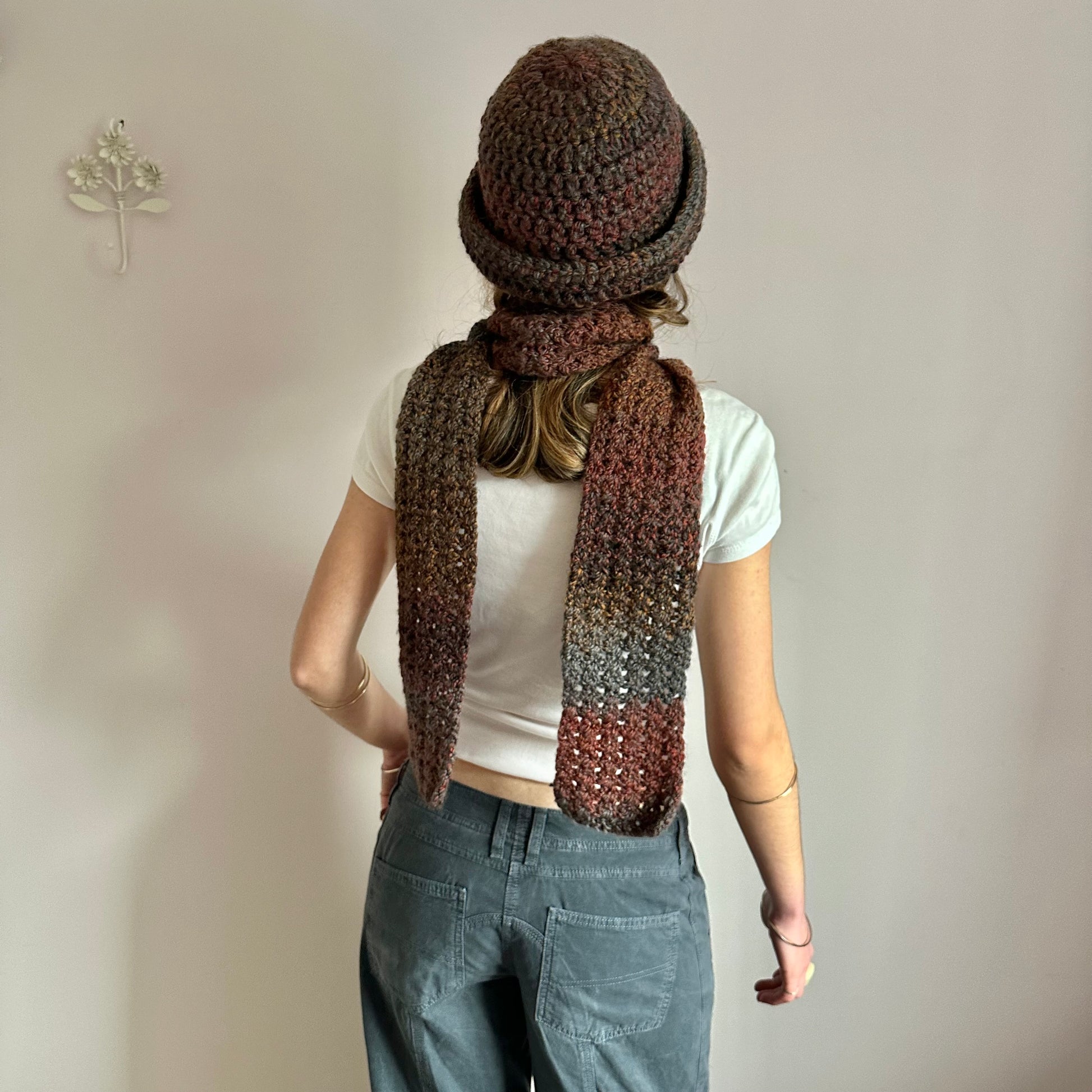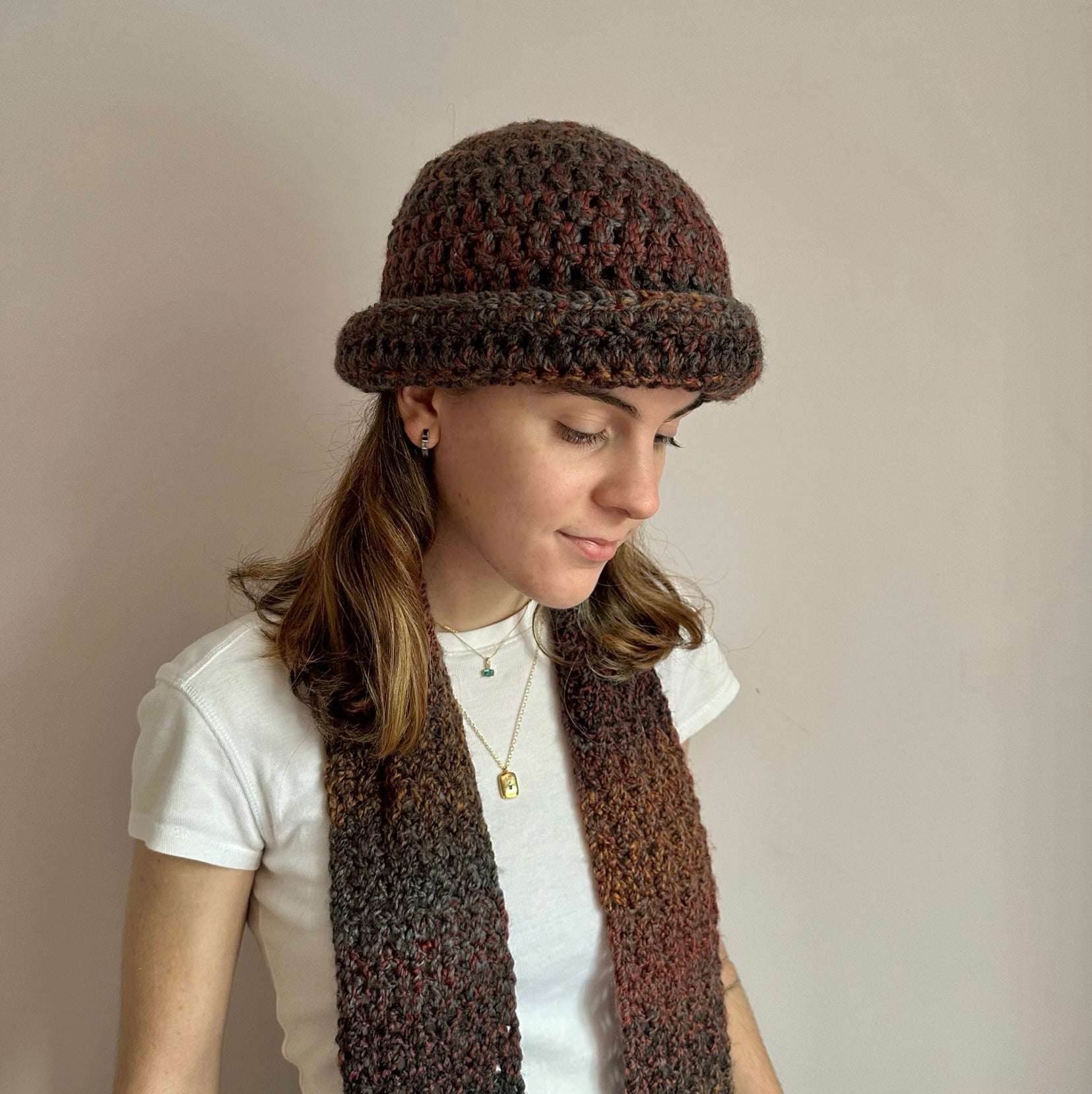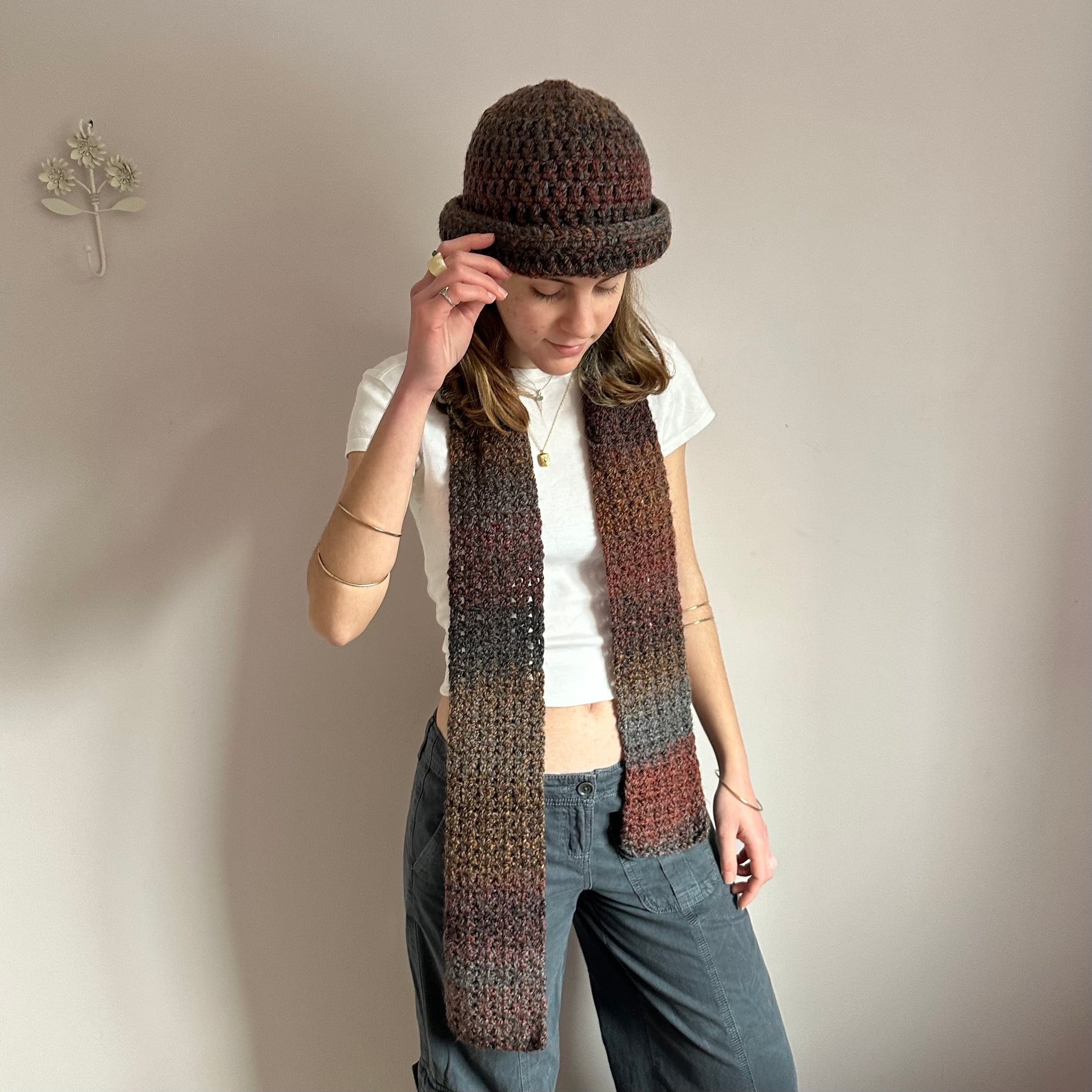 Handmade brown, grey and orange chunky crochet bowler hat