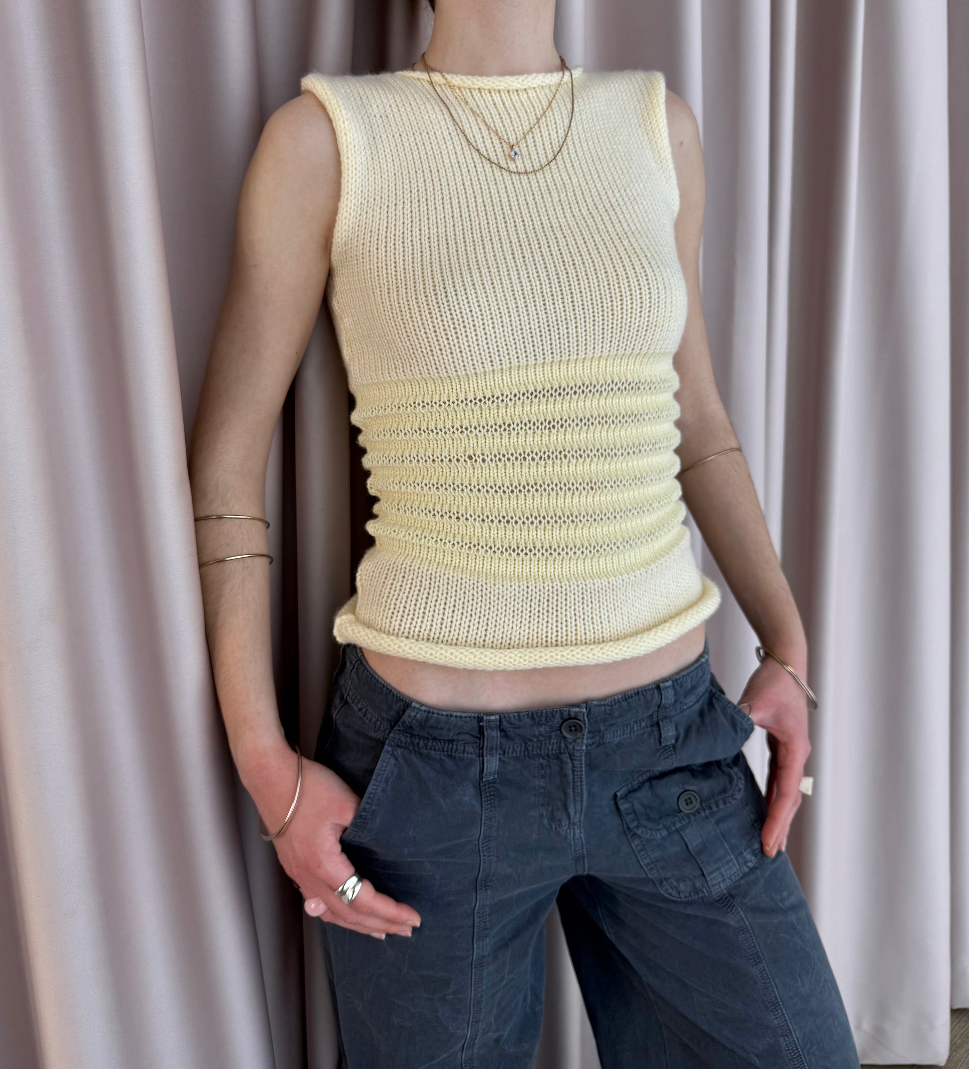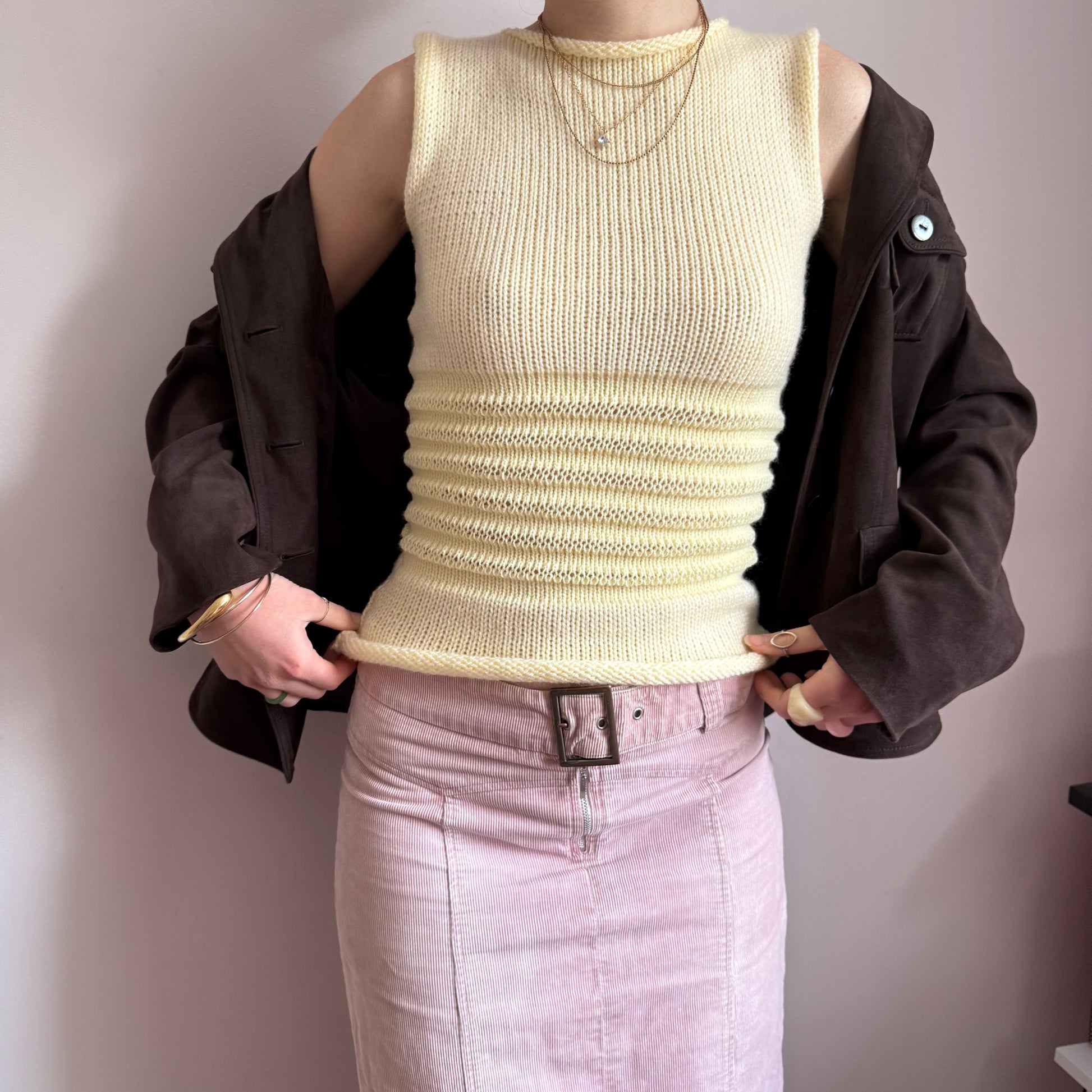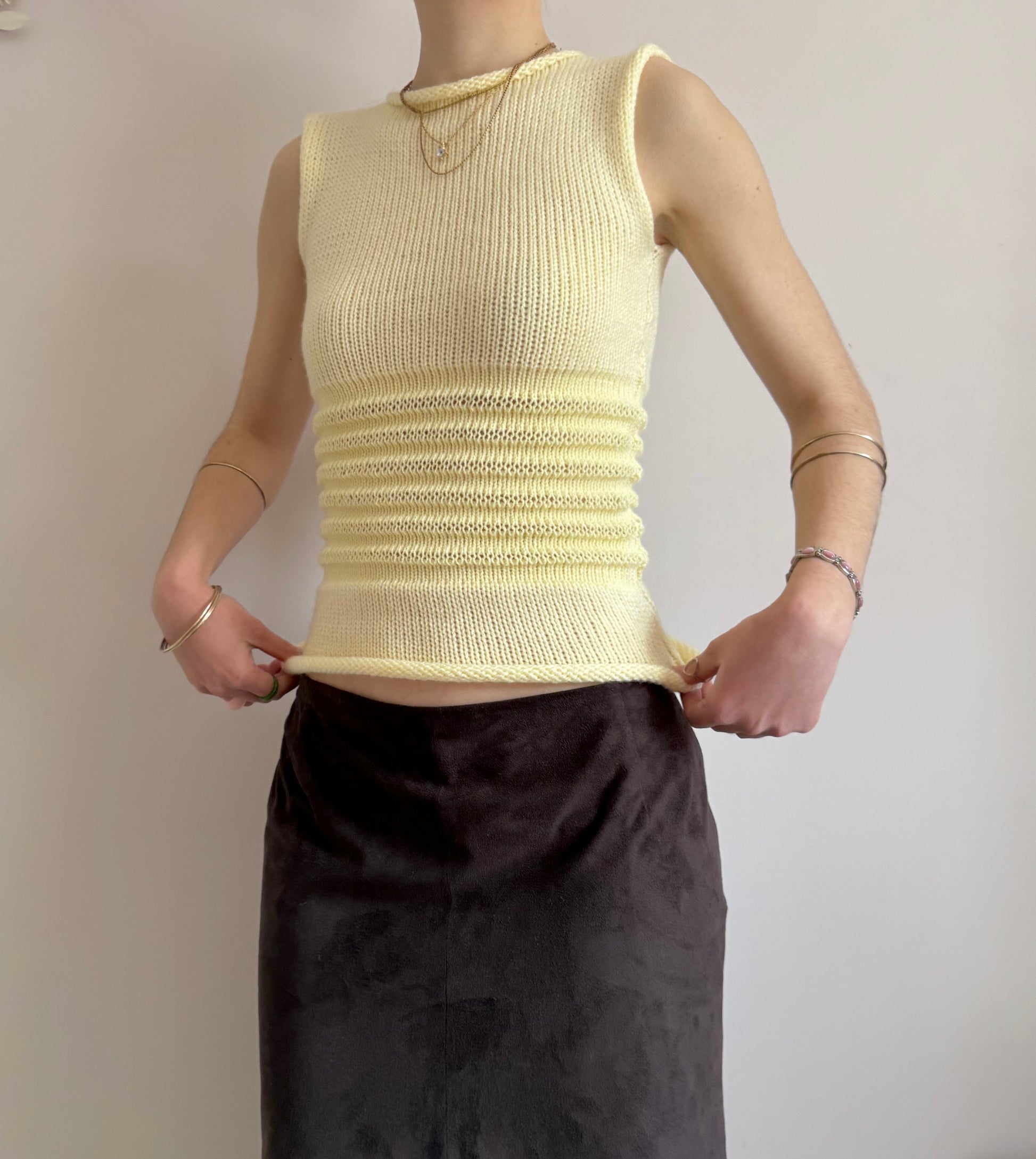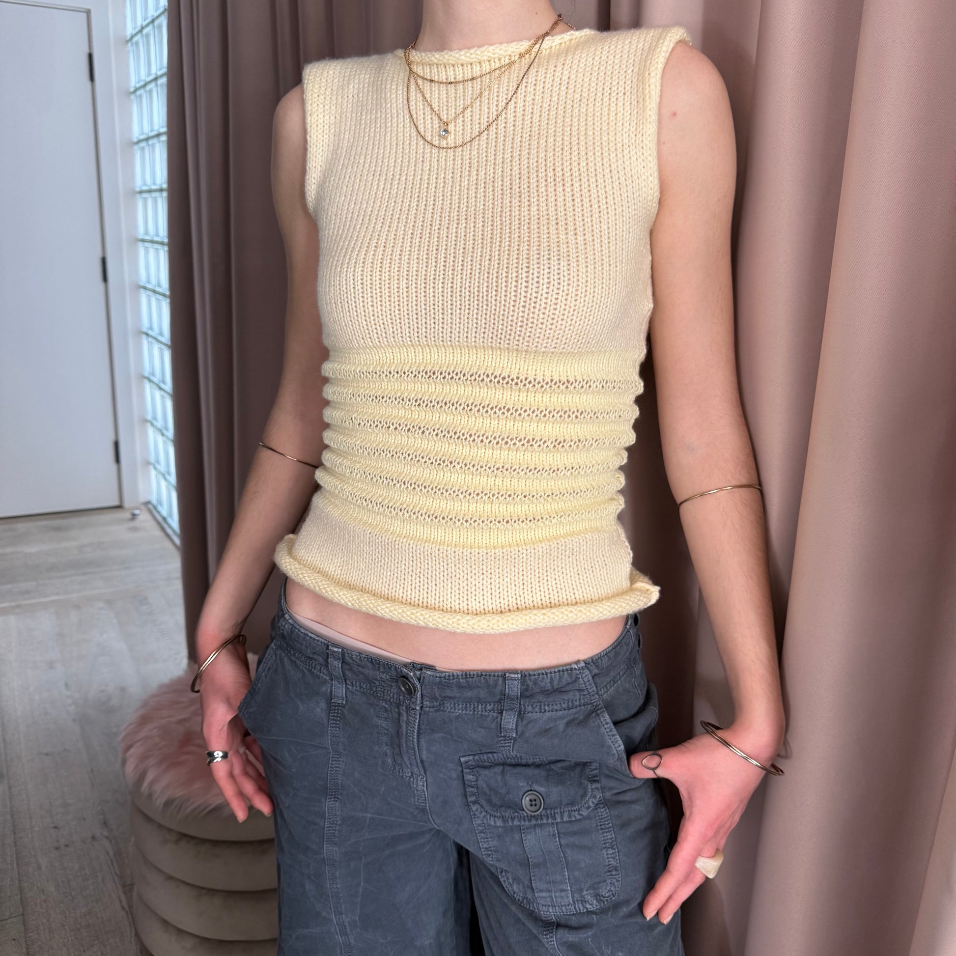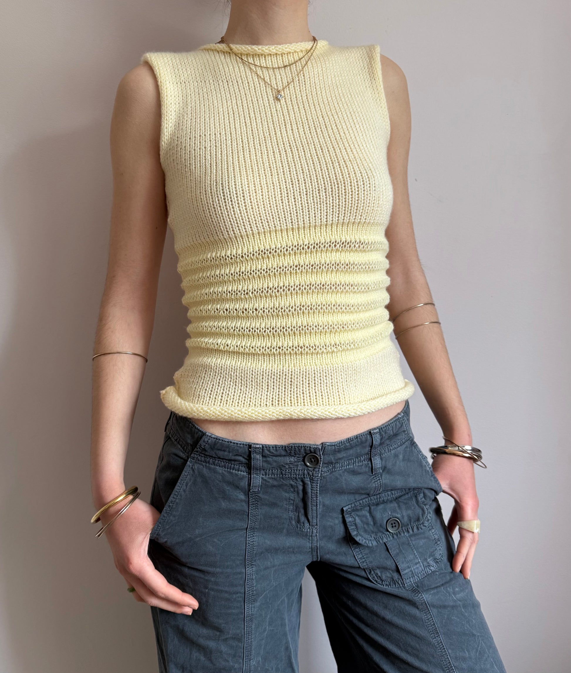 Handmade light butter yellow knit vest with shirred / ruched effect