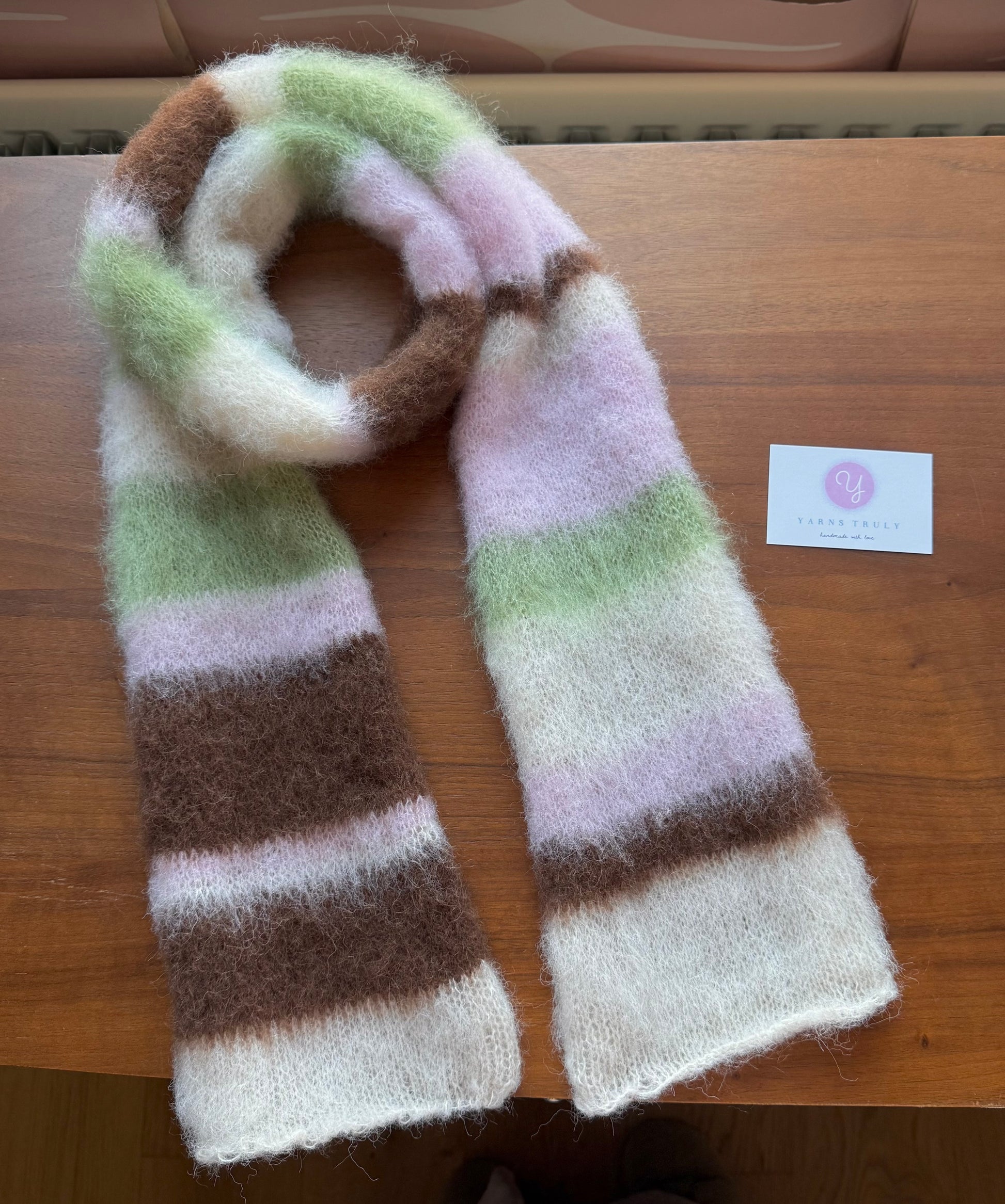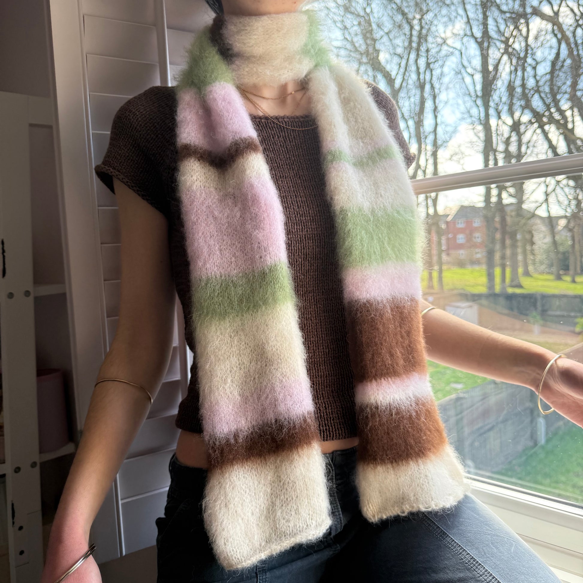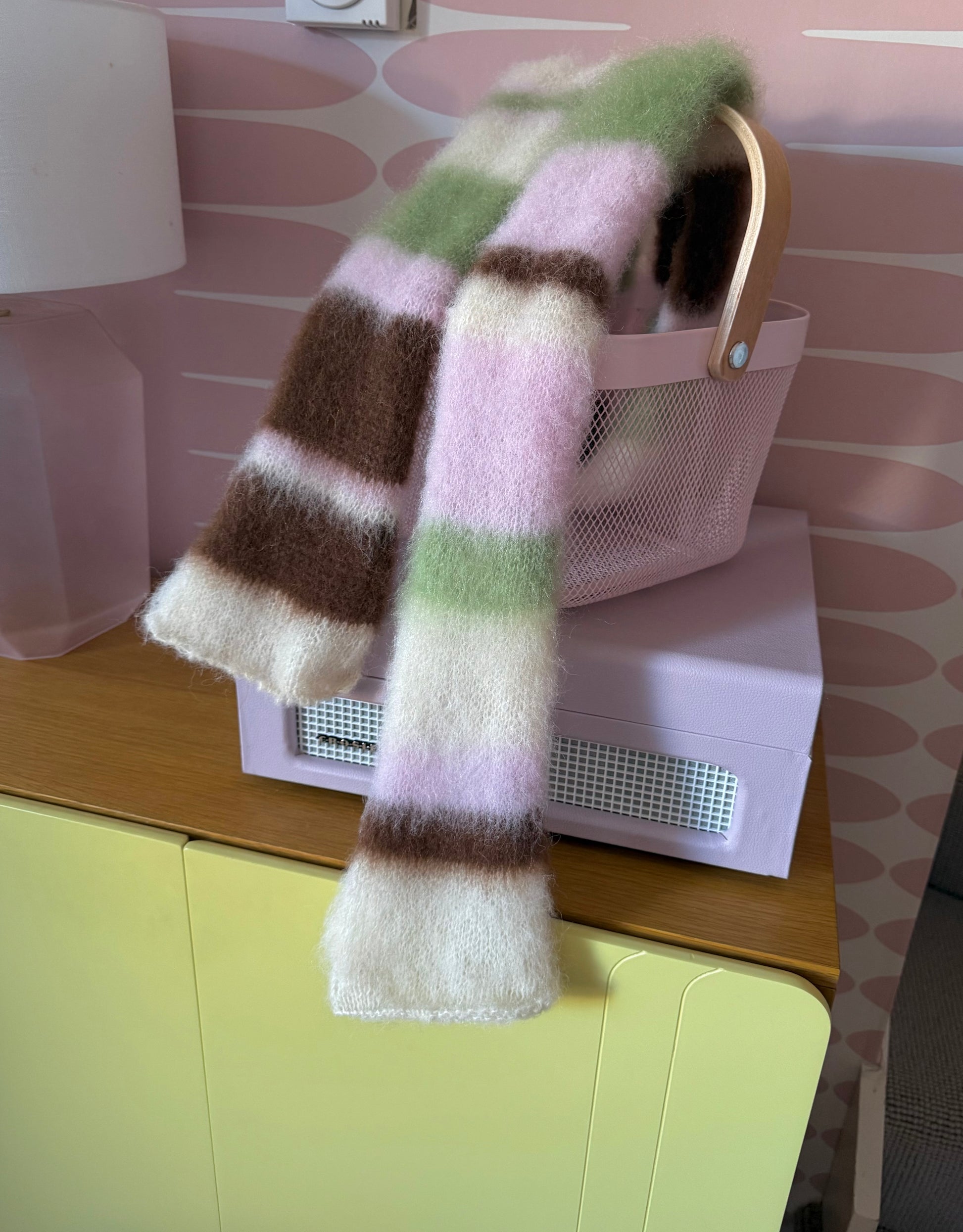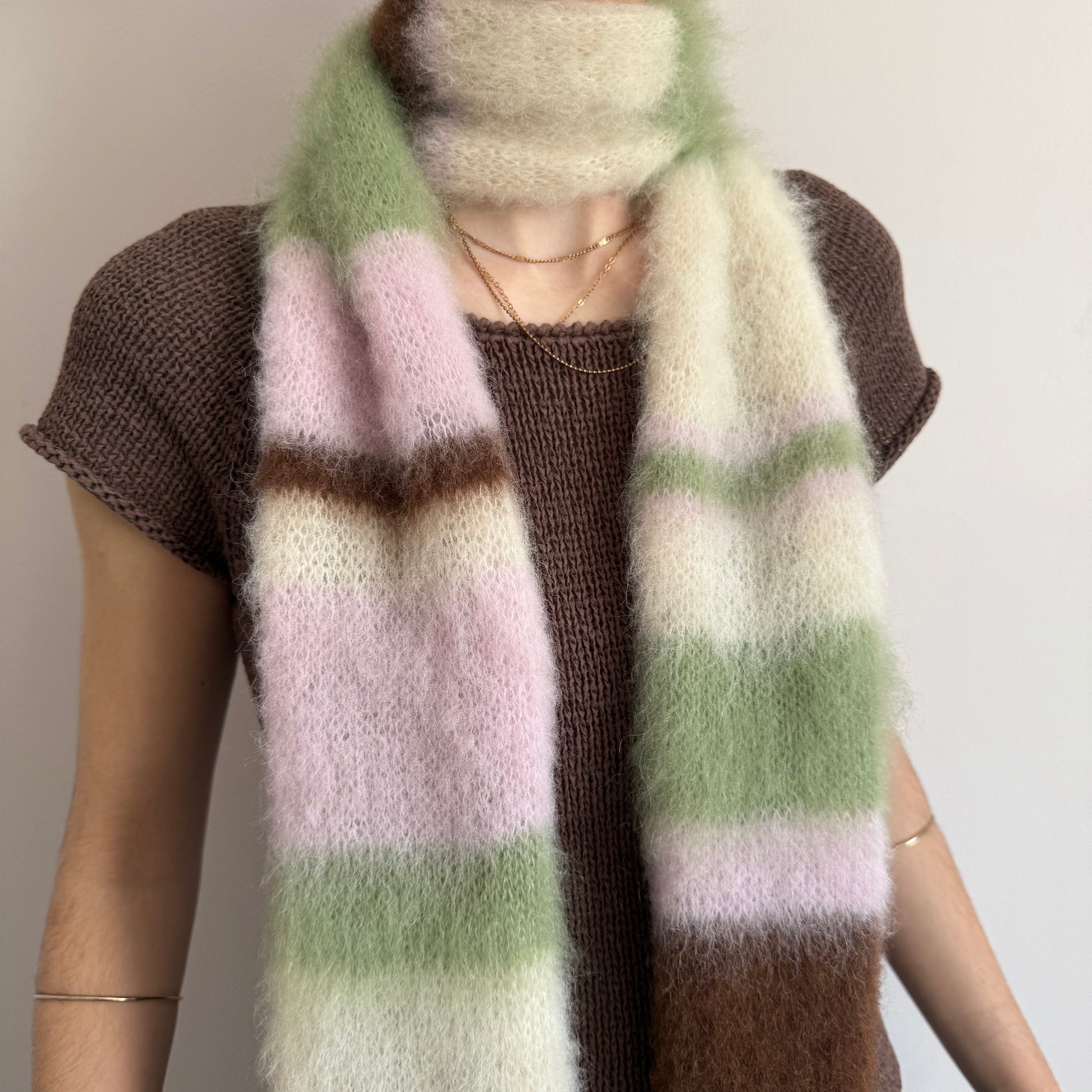 Knit mohair stripy scarf in the yummiest colour combo of baby pink, matcha green, brown and cream! ๐ชก๐ต Choose between the full width or a skinner scarf! (Swipe through the pics to see the difference between the two) โจ
