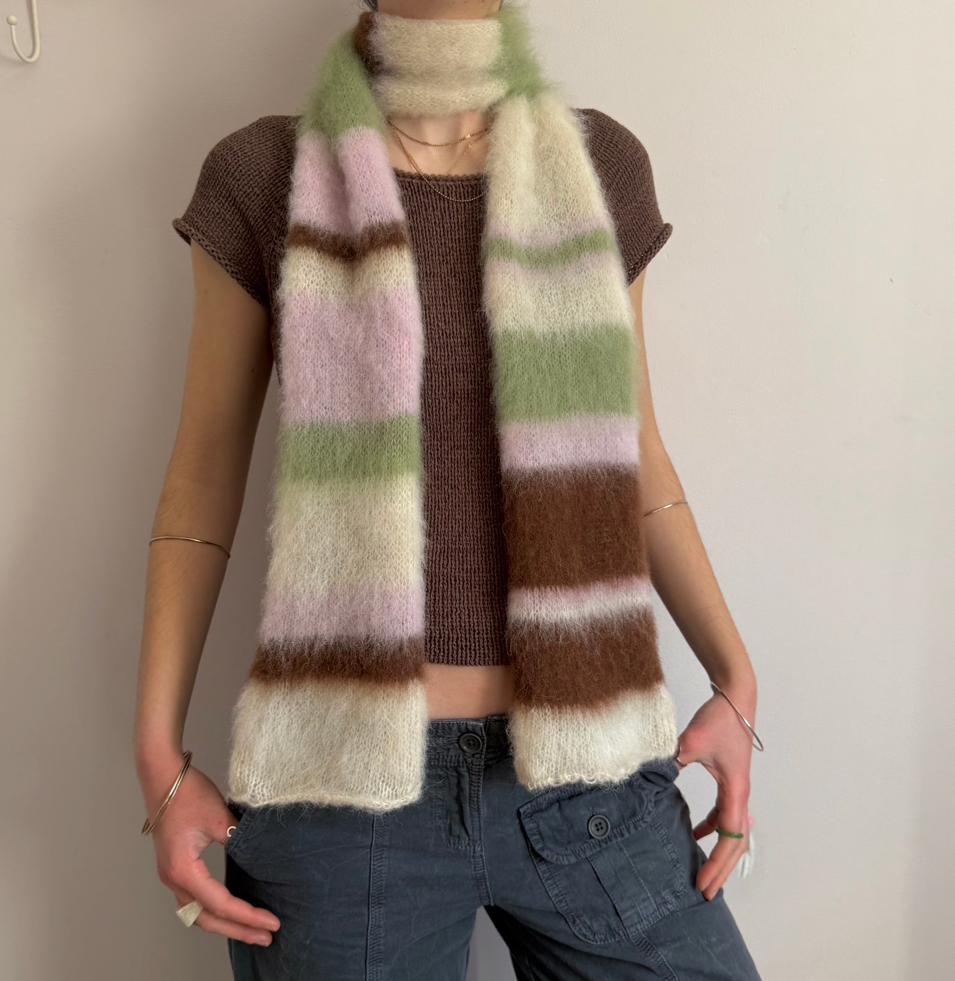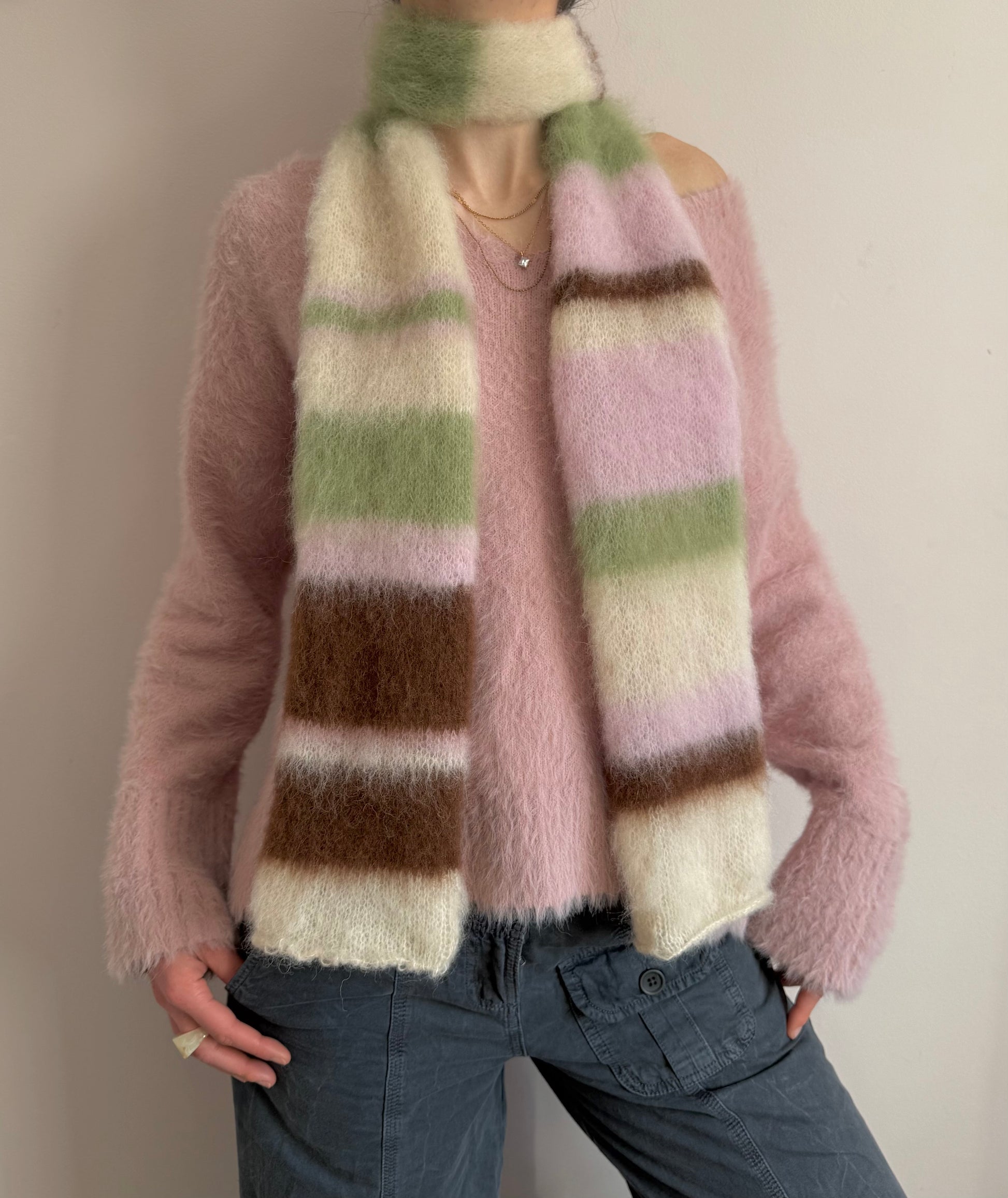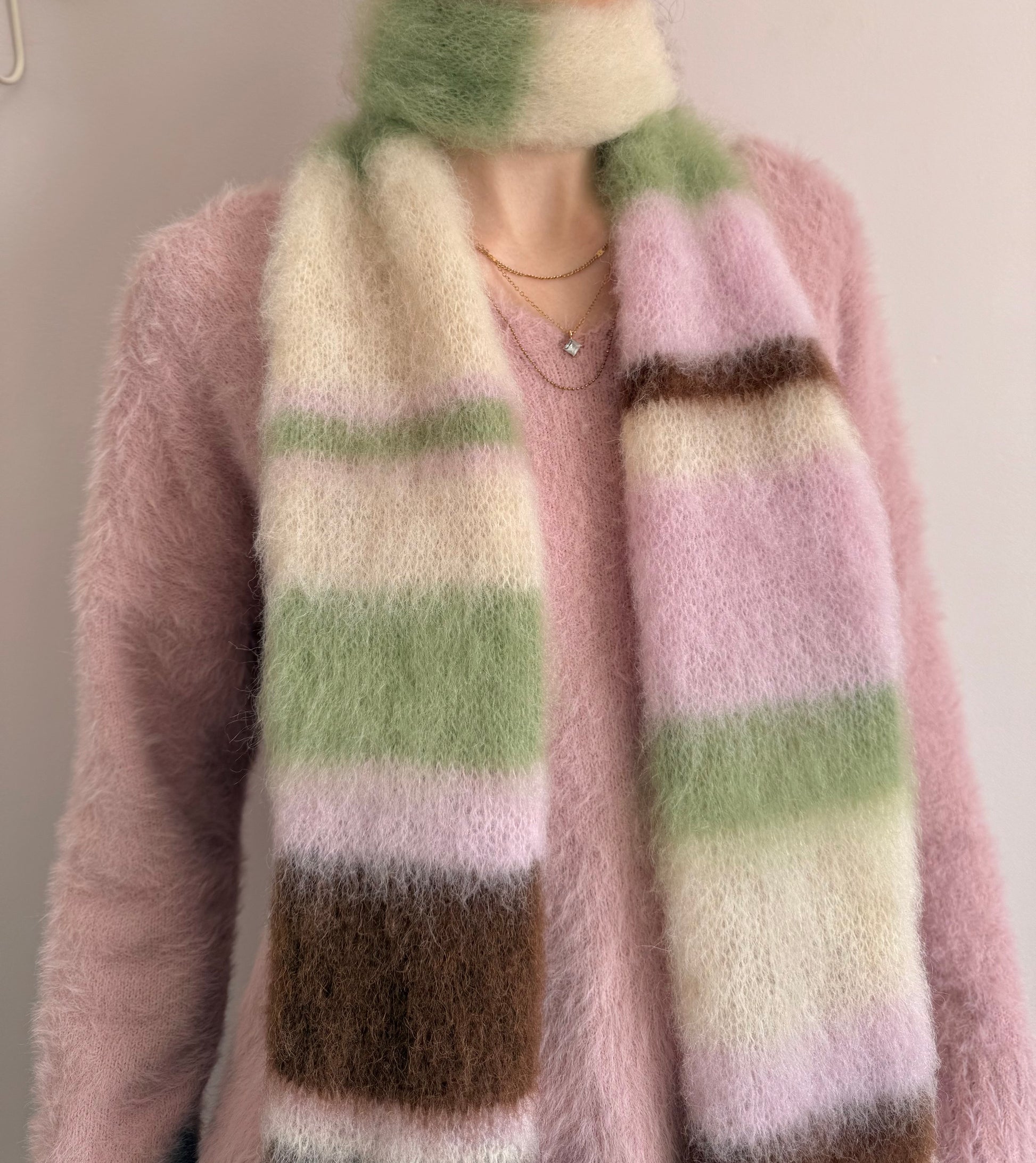 Knit mohair stripy scarf in the yummiest colour combo of baby pink, matcha green, brown and cream! ๐ชก๐ต Choose between the full width or a skinner scarf! (Swipe through the pics to see the difference between the two) โจ