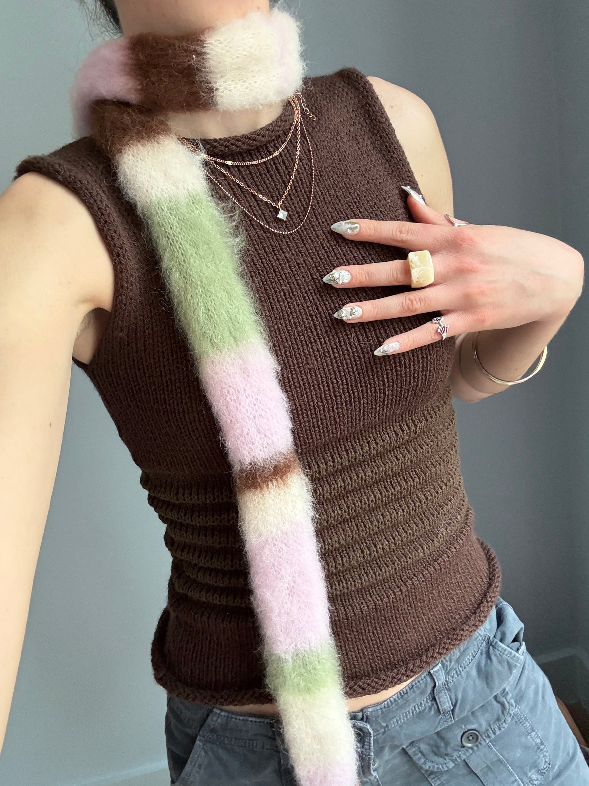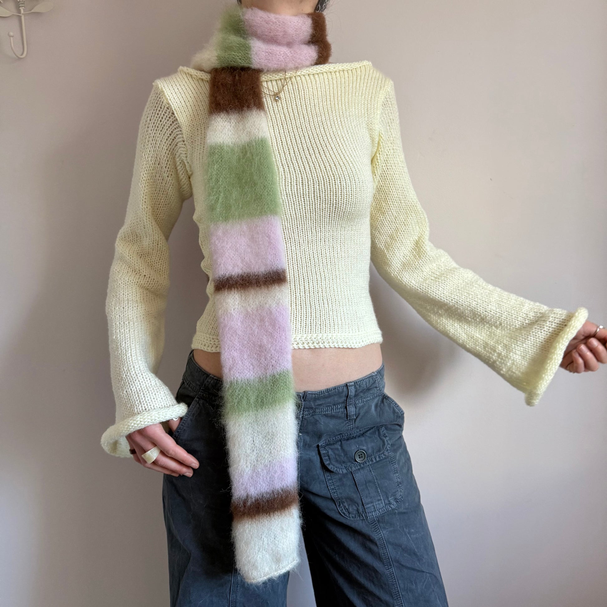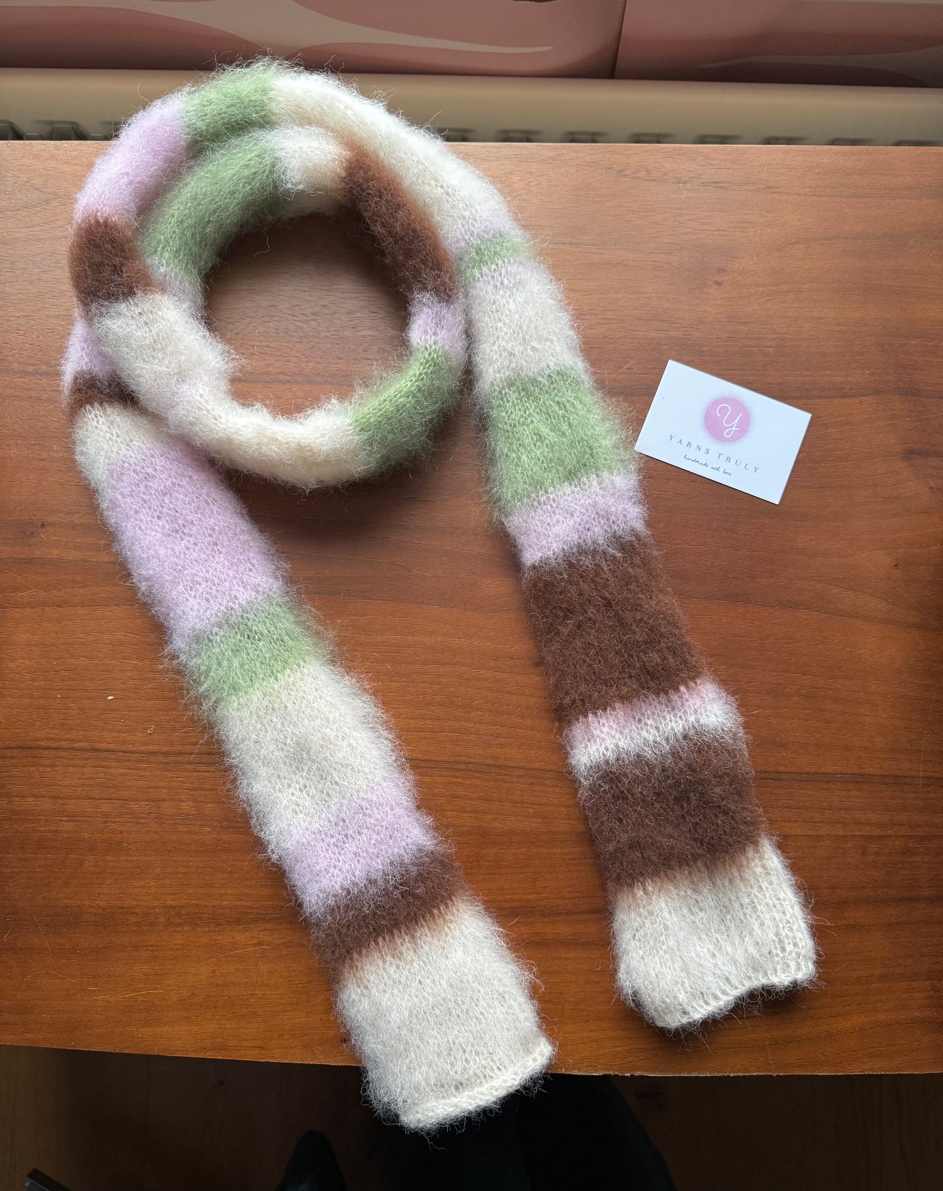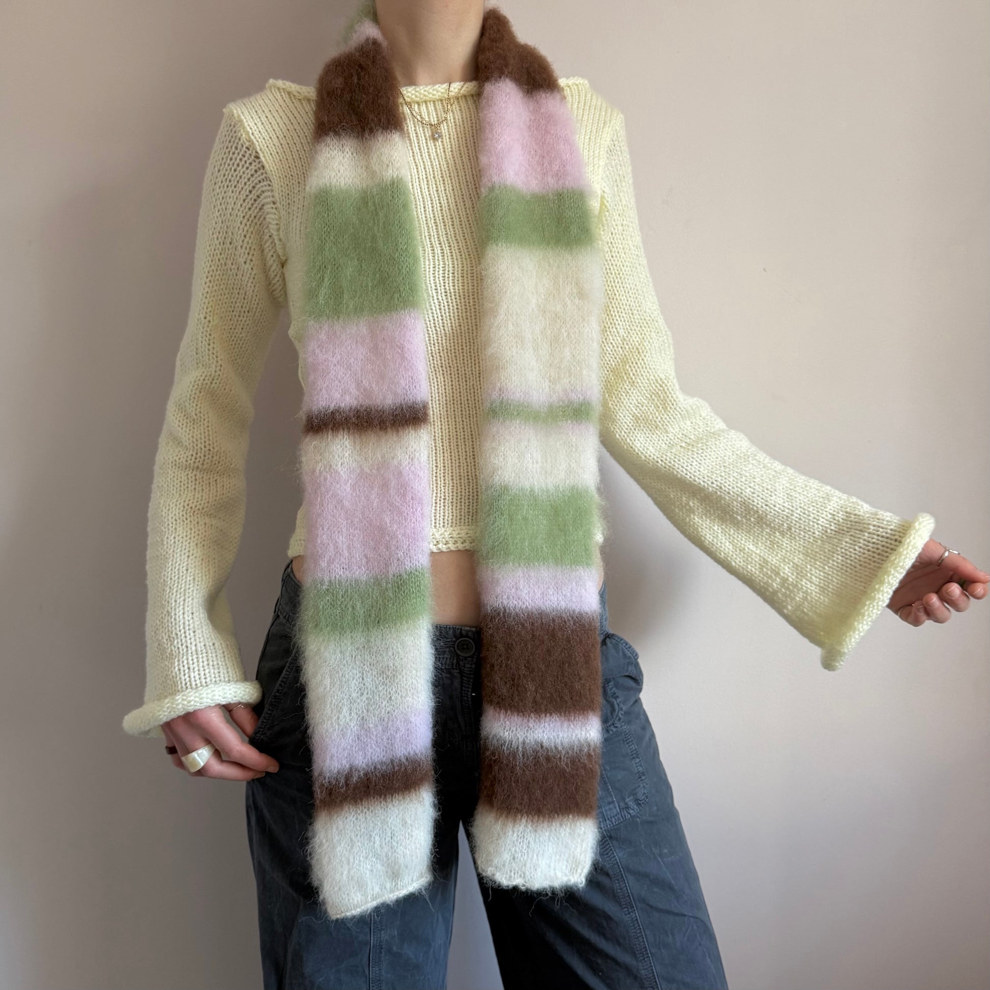 Knit mohair stripy scarf in the yummiest colour combo of baby pink, matcha green, brown and cream! ๐ชก๐ต Choose between the full width or a skinner scarf! (Swipe through the pics to see the difference between the two) โจ