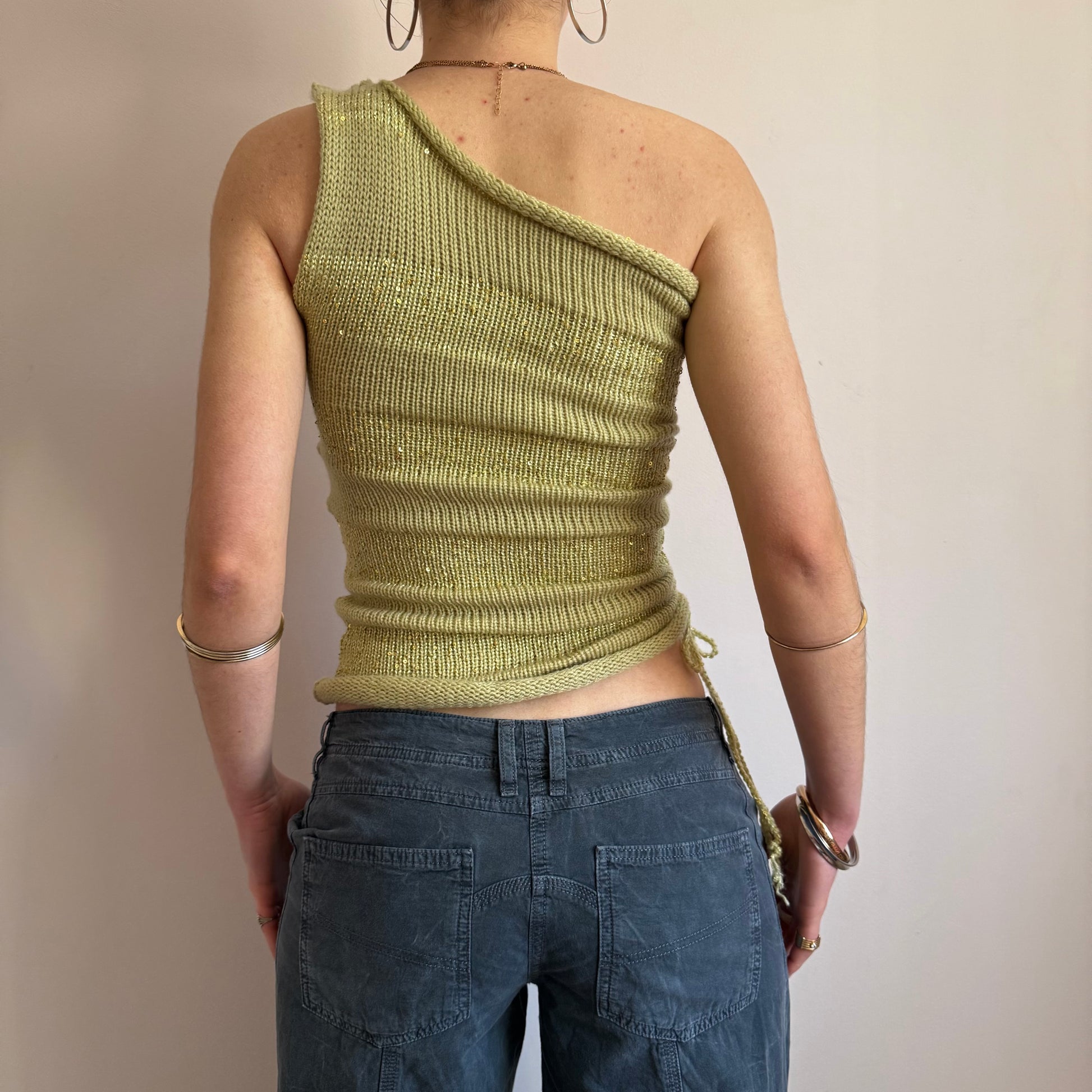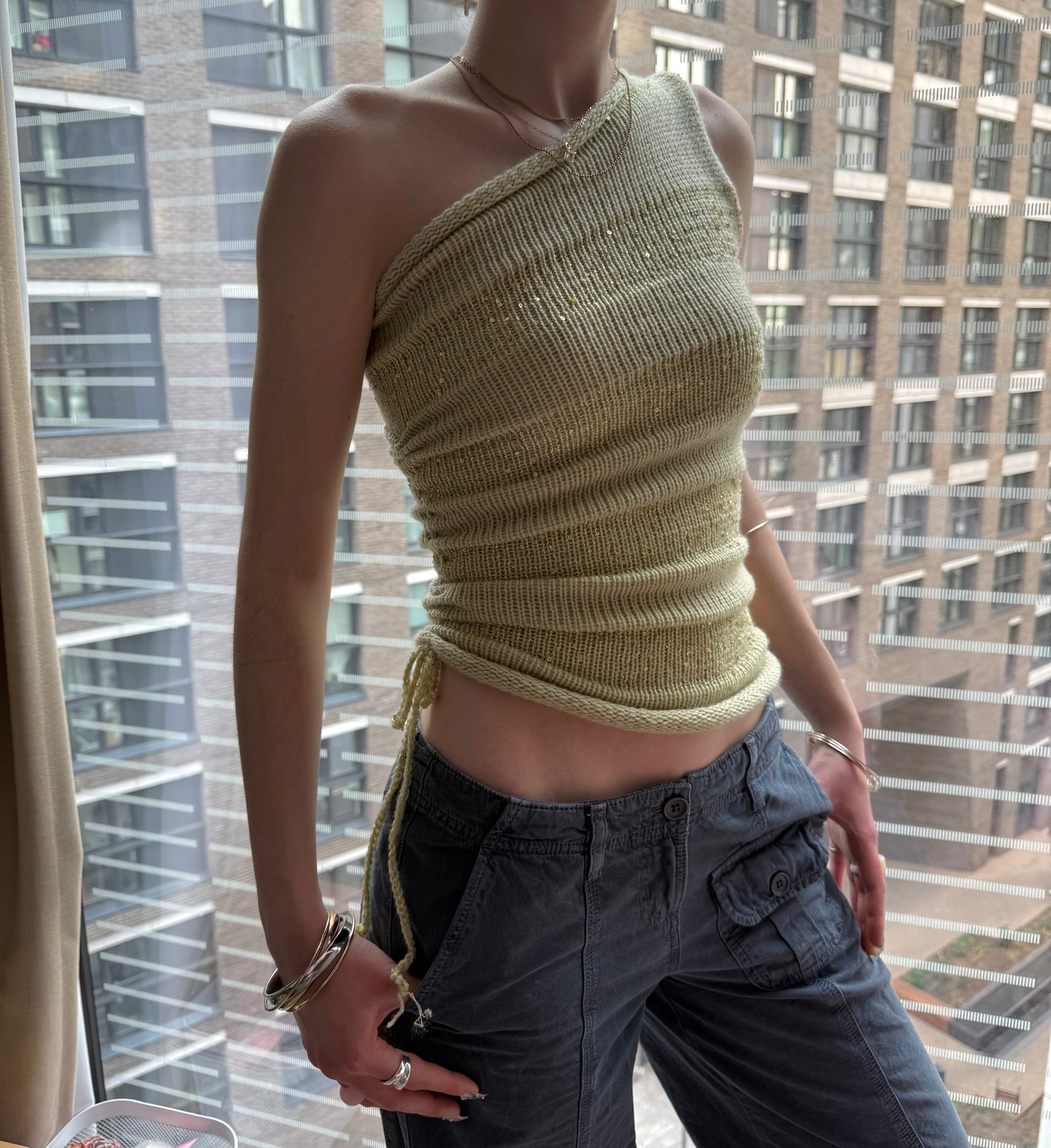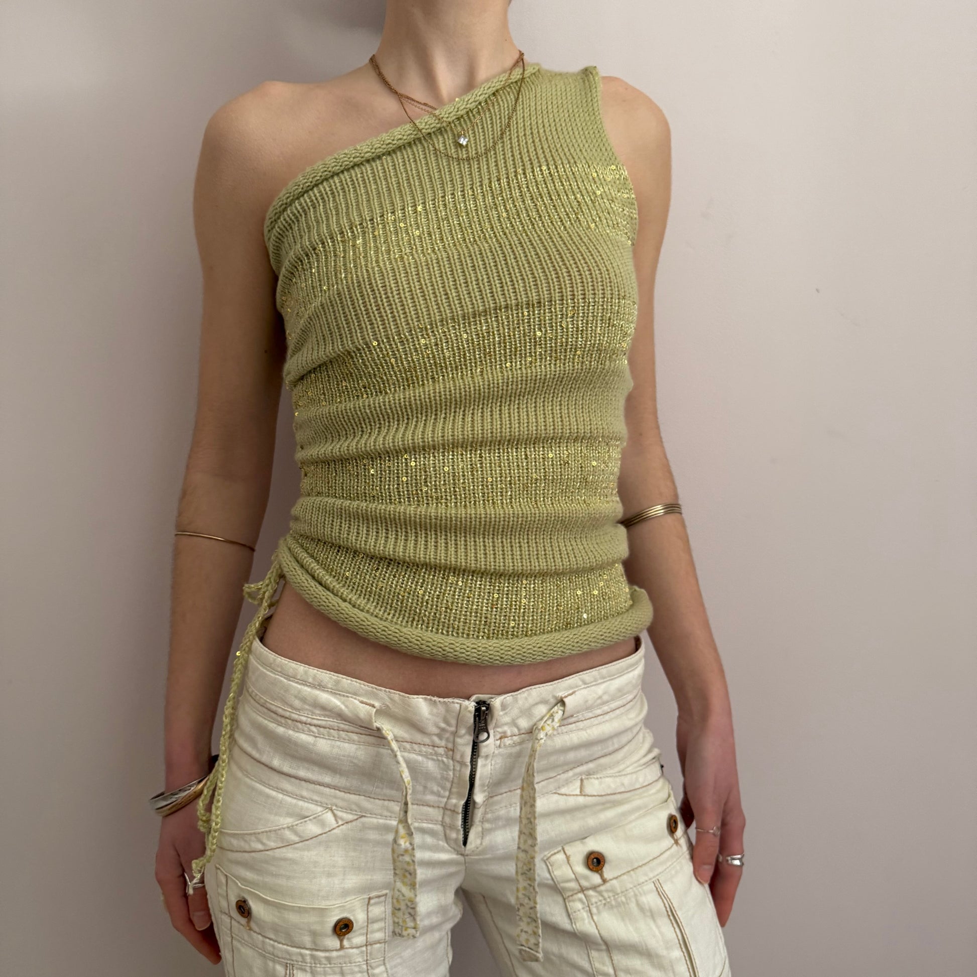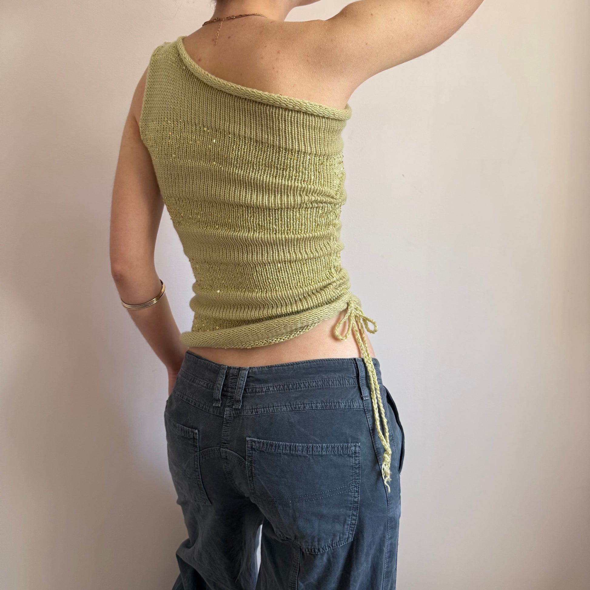 New design! ✨ The cutest glittery knitted one shoulder top with a draped effect in a gorgeous light green colour 🍵