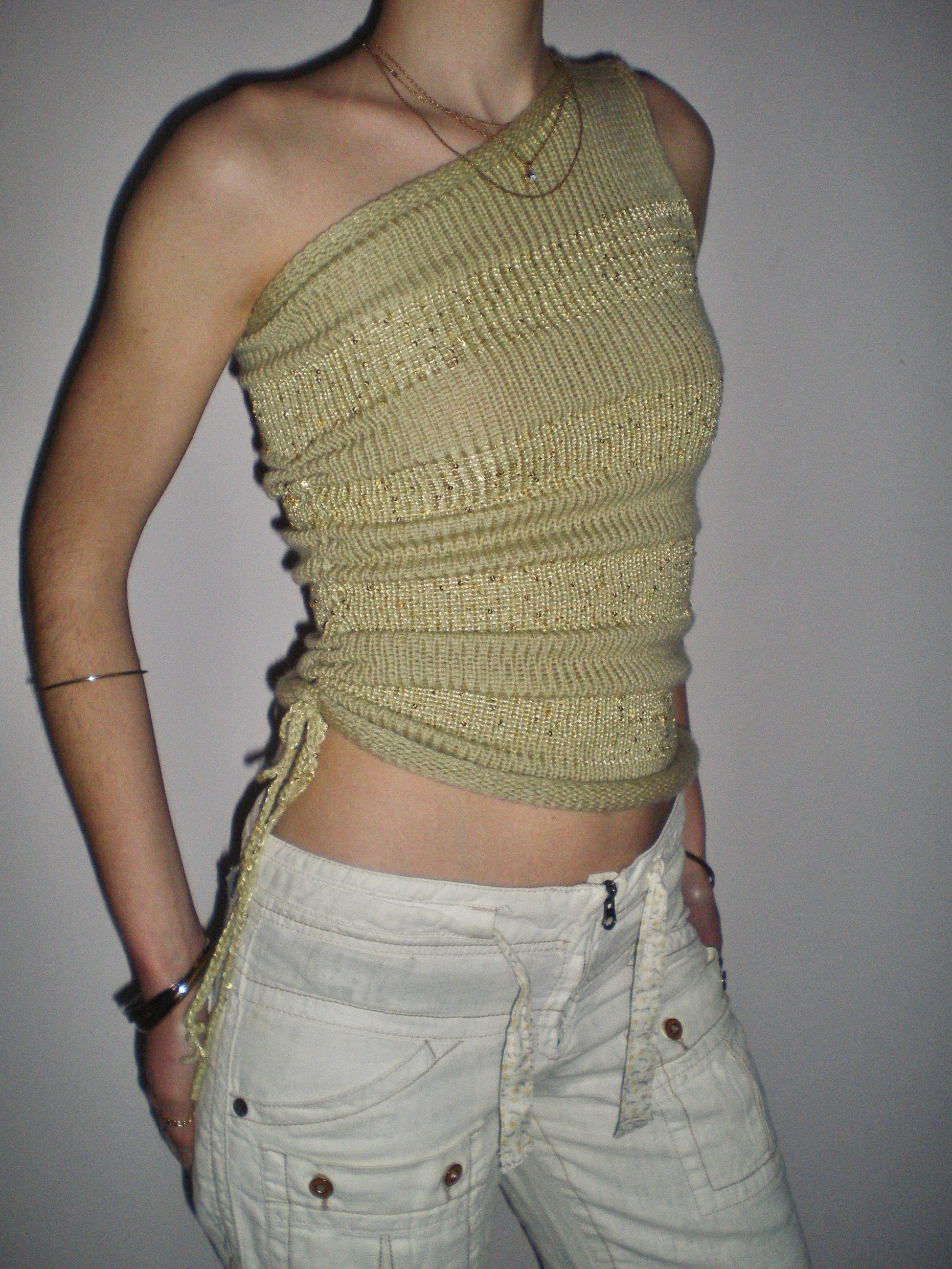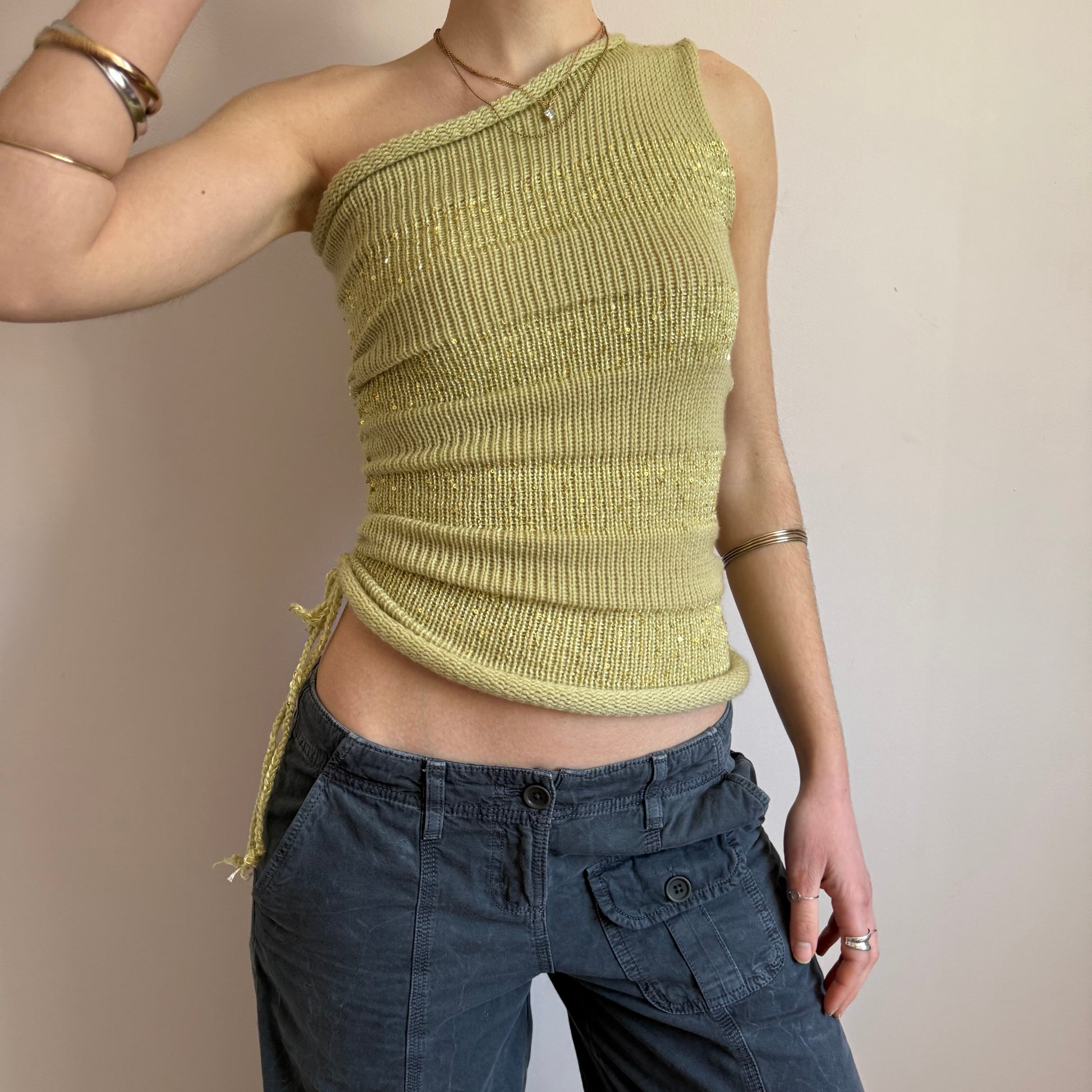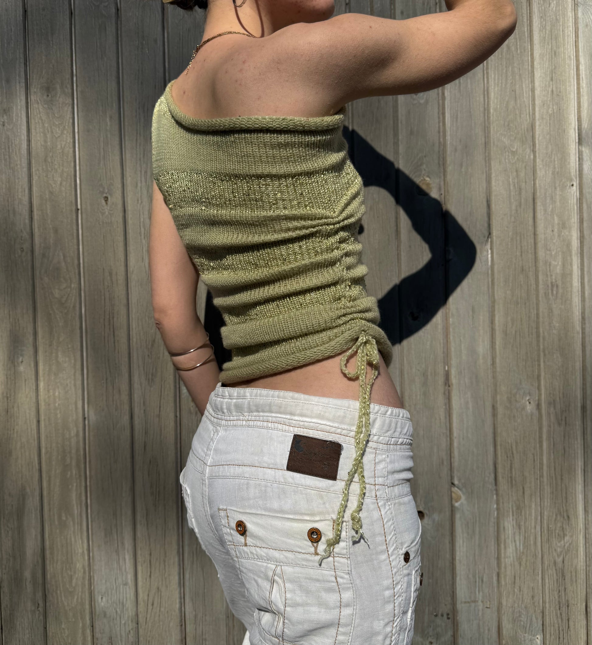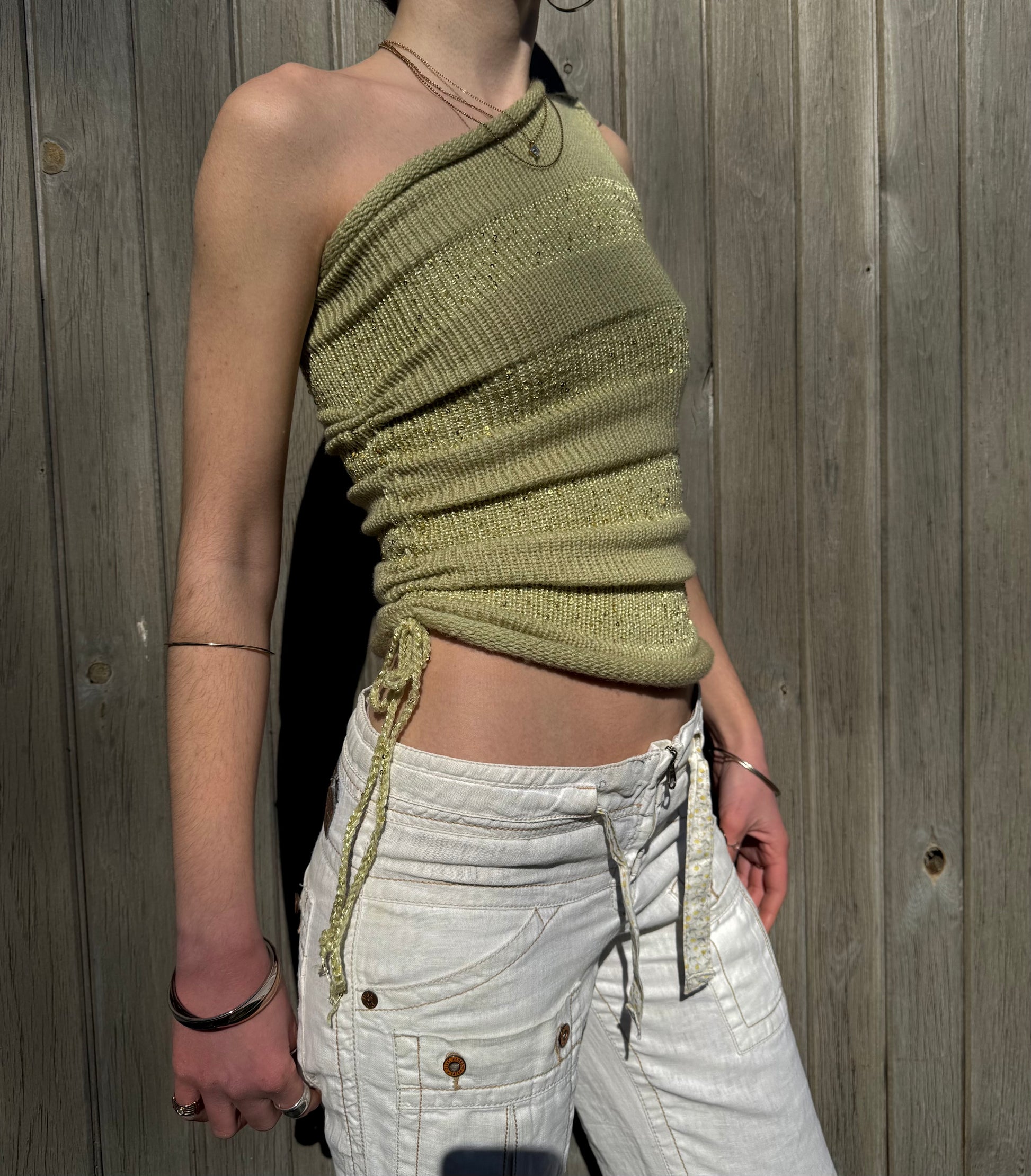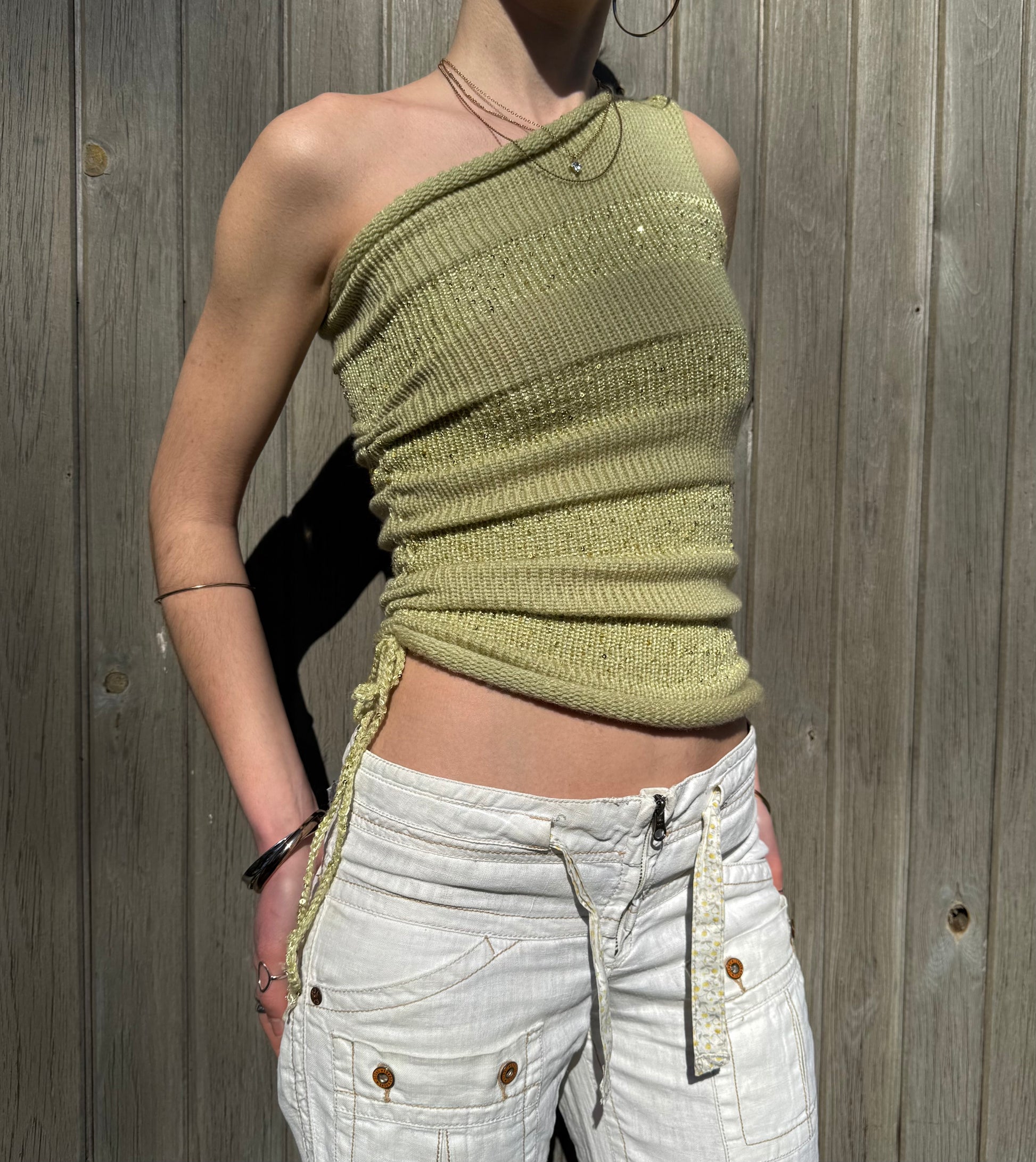 New design! ✨ The cutest glittery knitted one shoulder top with a draped effect in a gorgeous light green colour 🍵