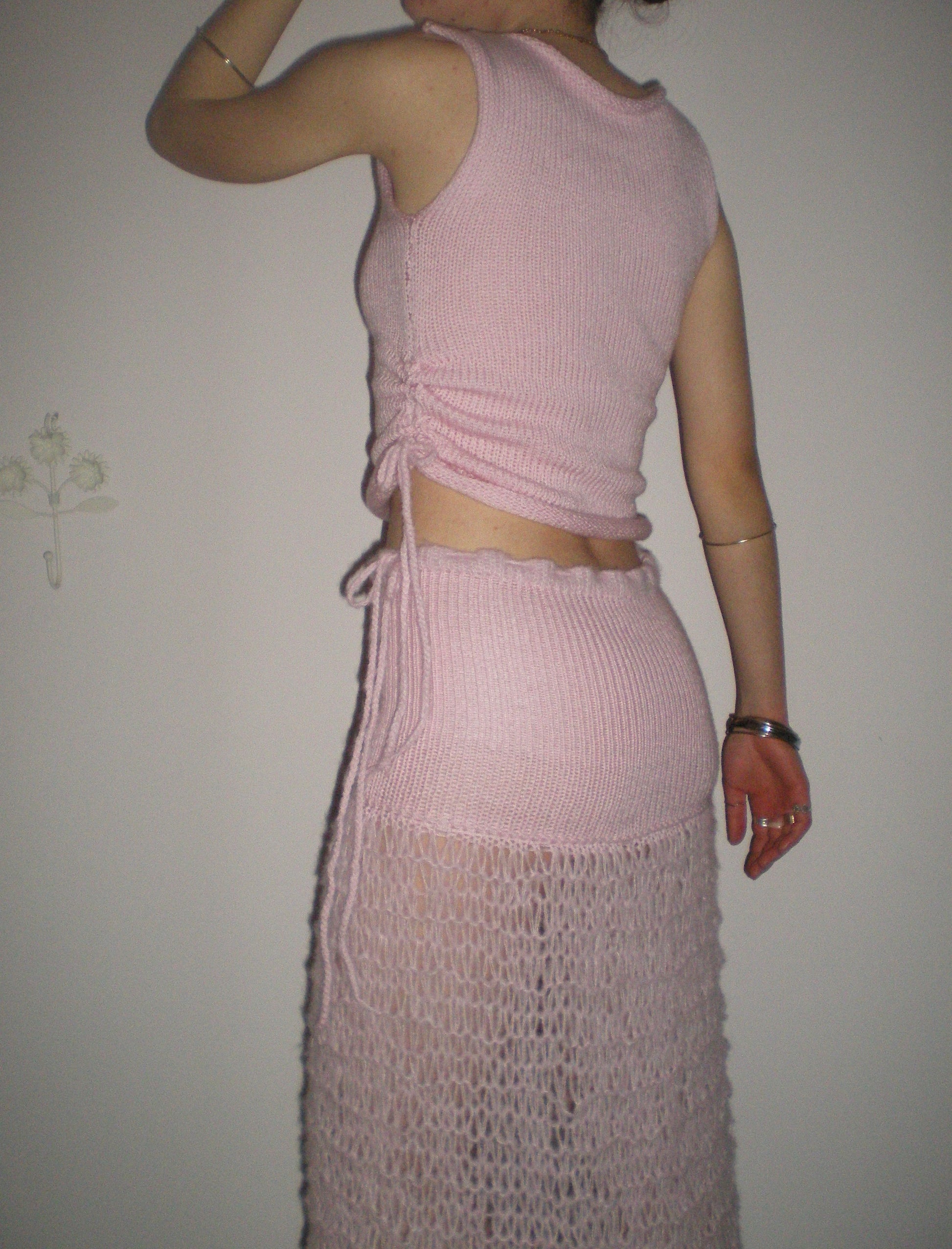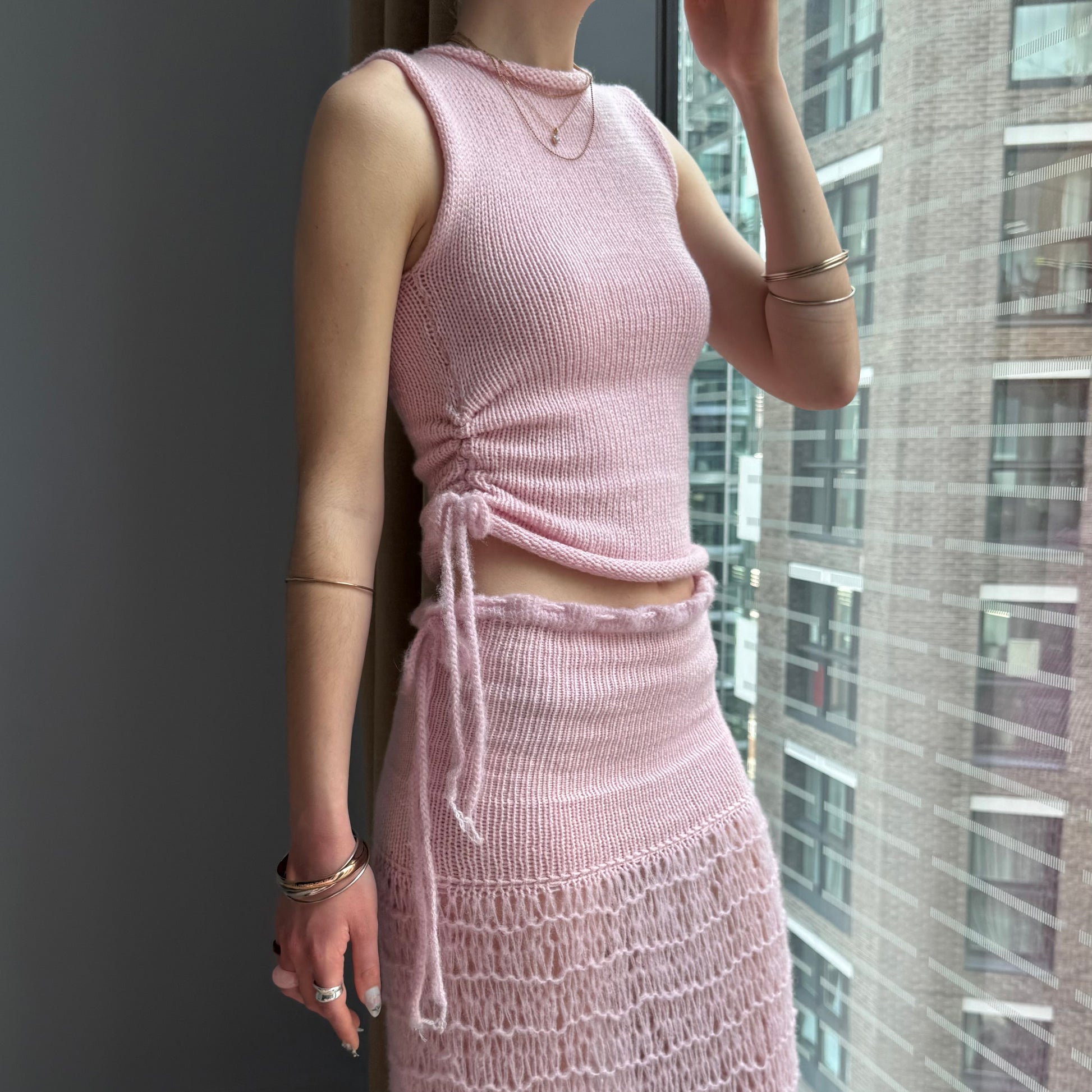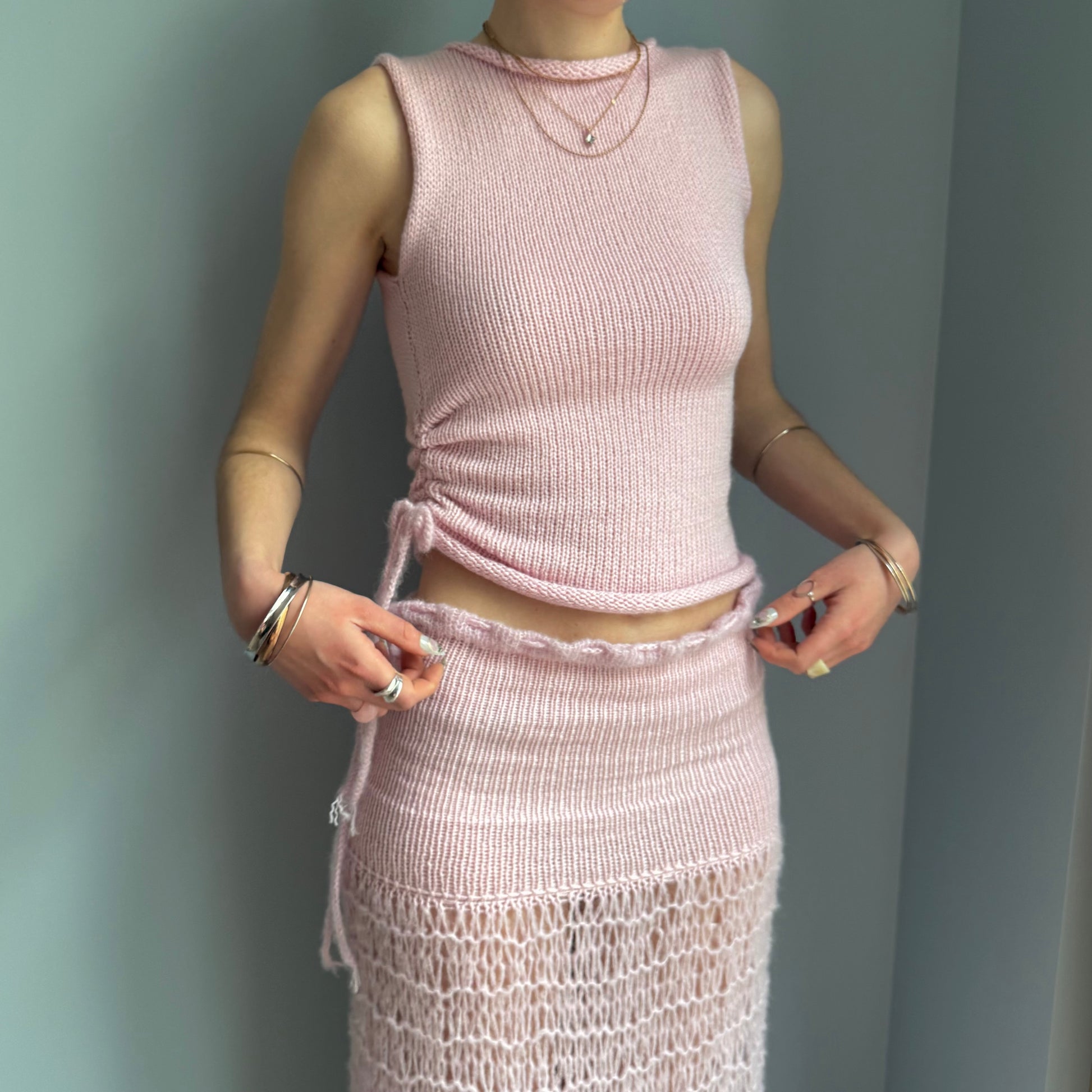 The cutest baby pink knit vest with adjustable mohair drawstring ruched side 🌸 part of the Sakura collection