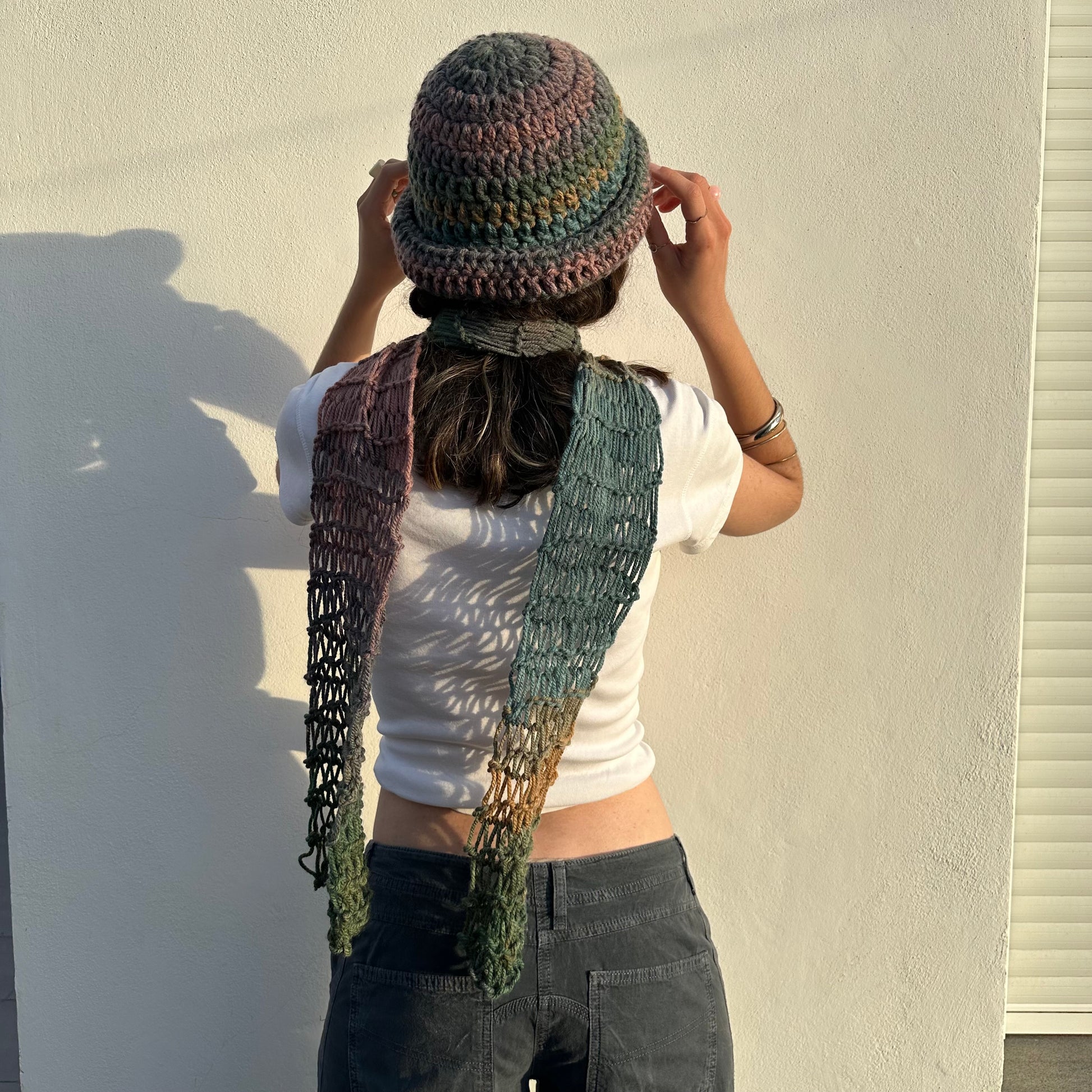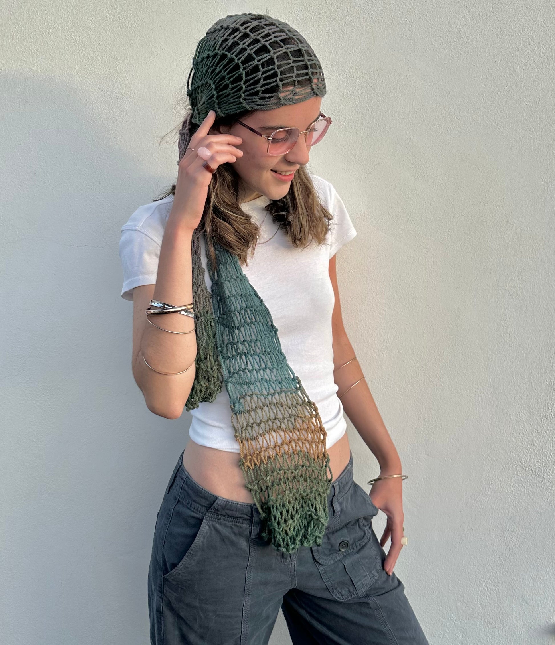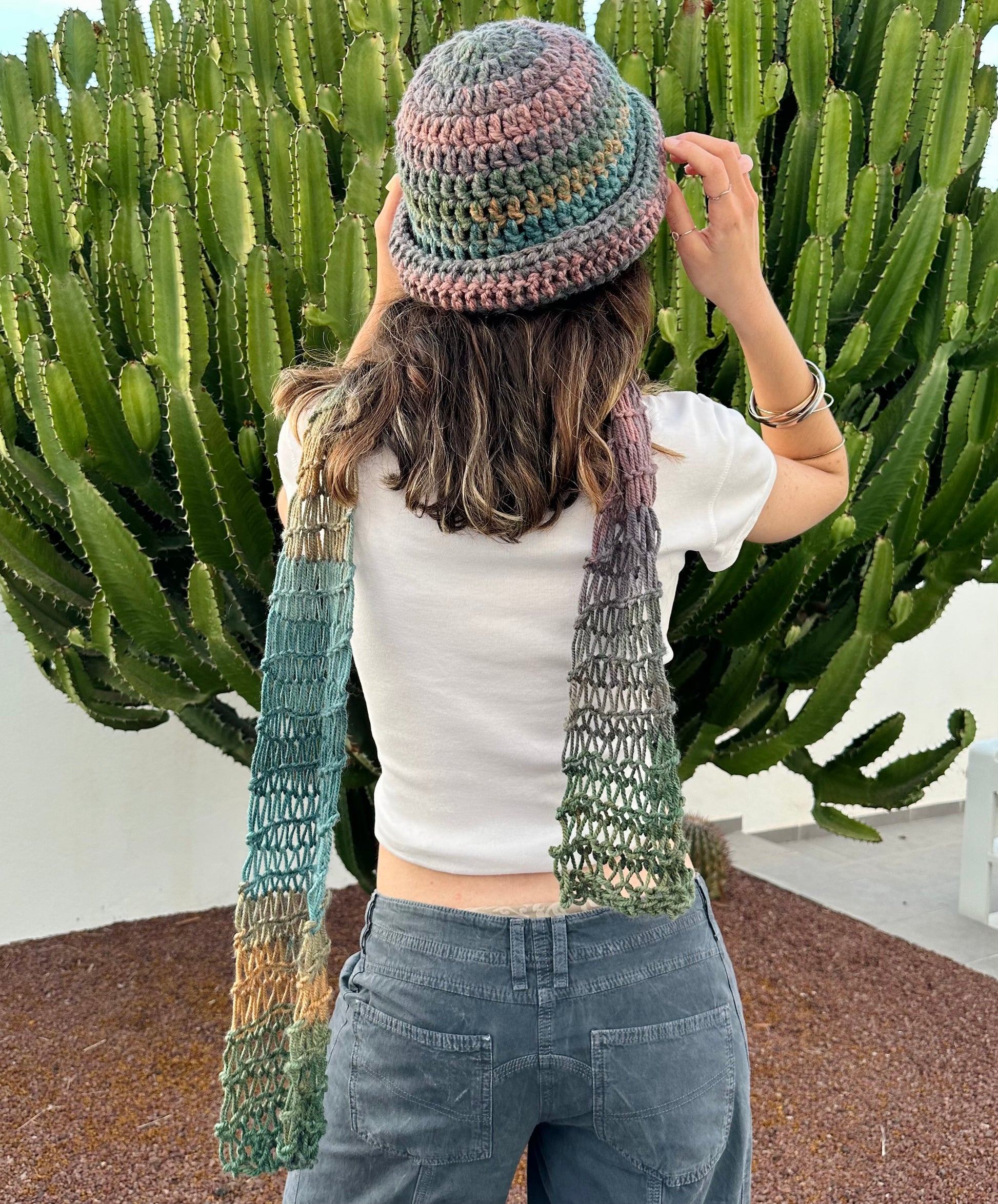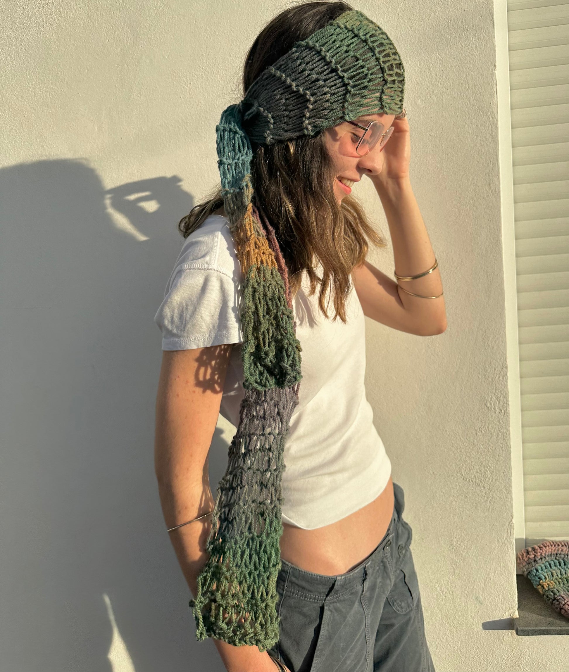 Handmade ombré fishnet knitted scarf in green, brown, blue and yellow