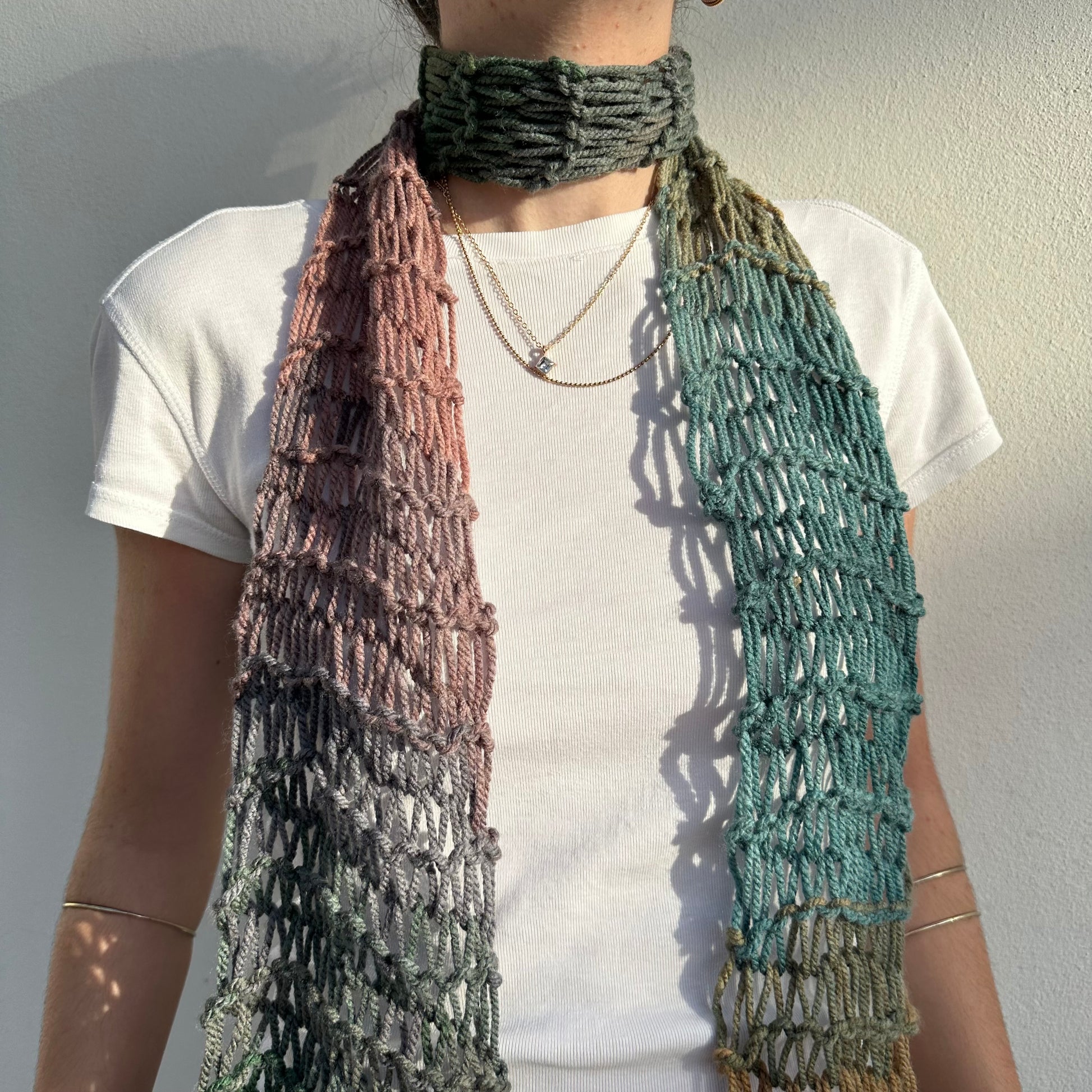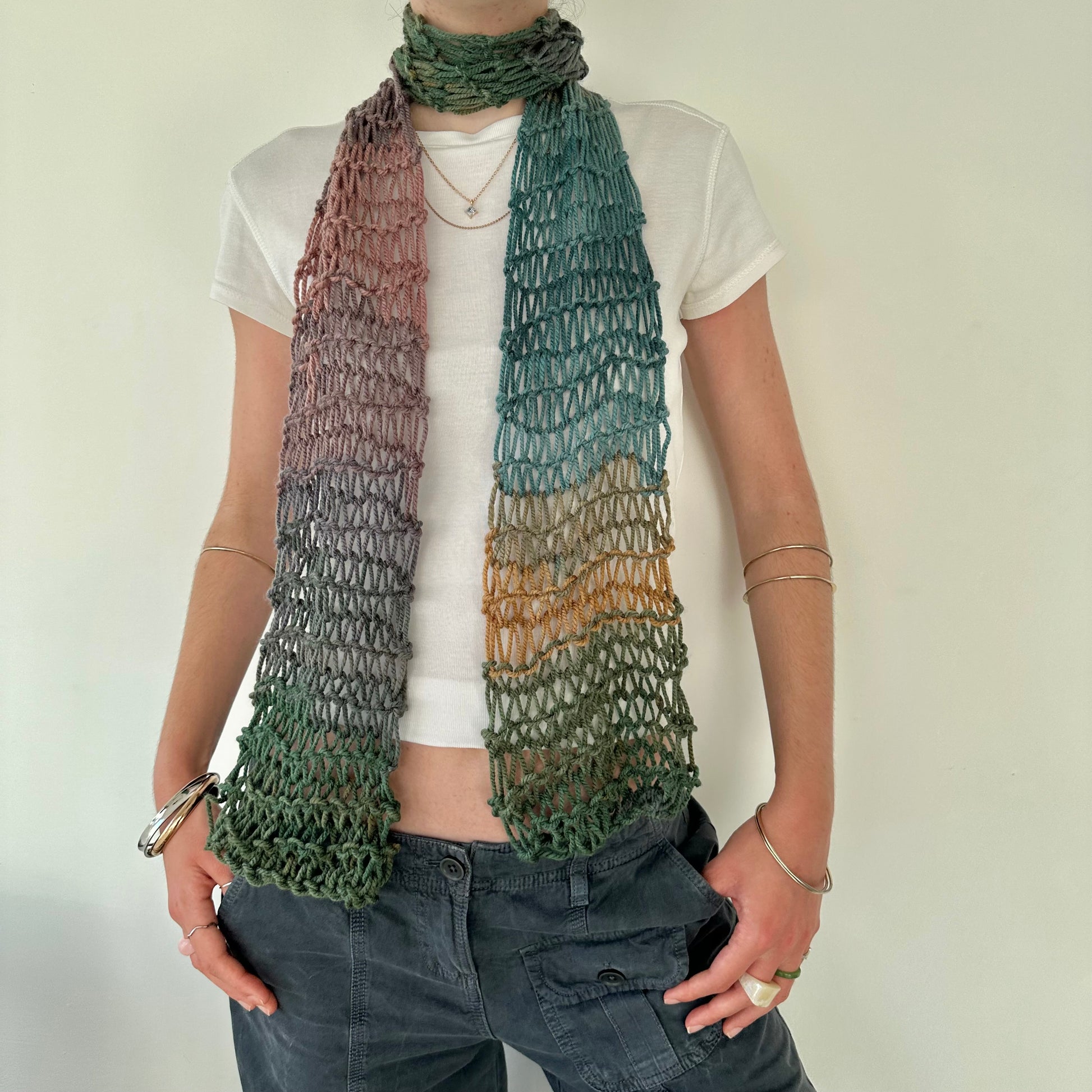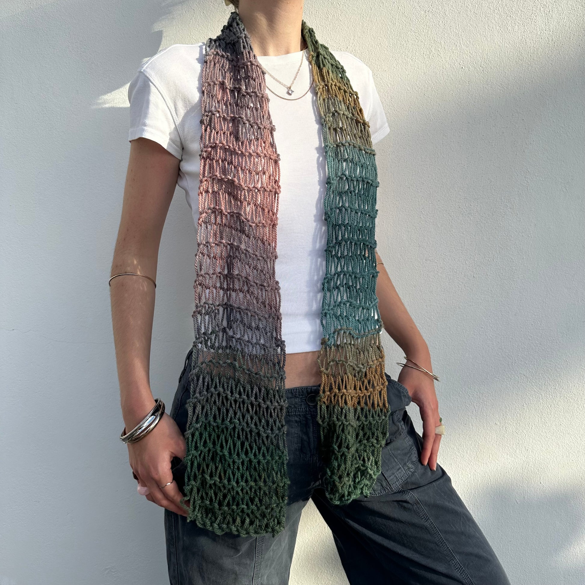 Hand-knitted fishnet / distressed knit scarf in gorgeous ombré shades of green, brown, blue and yellow 🐠