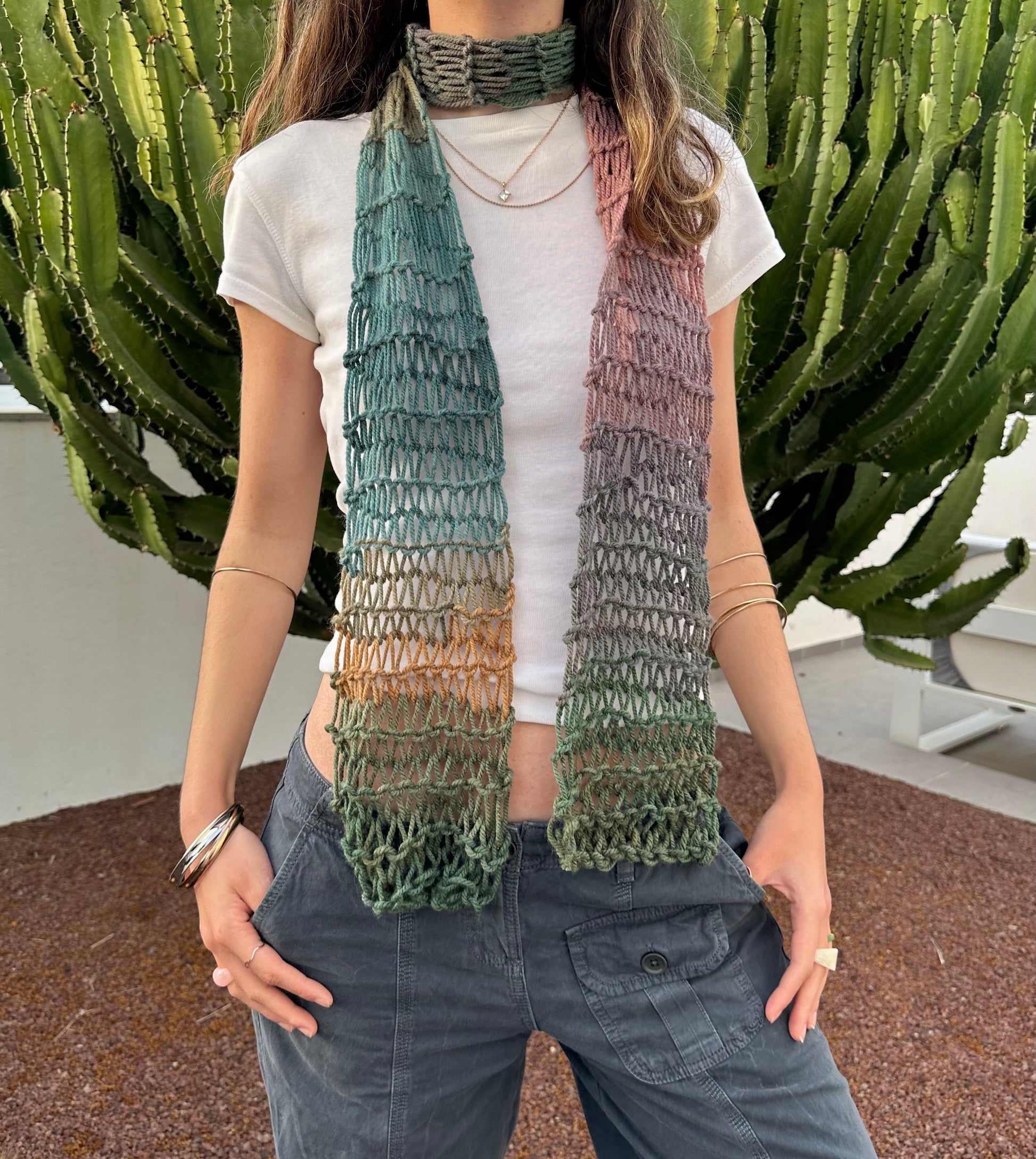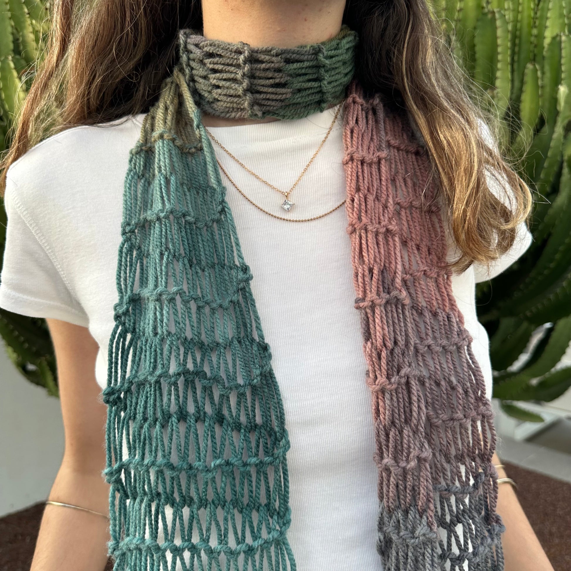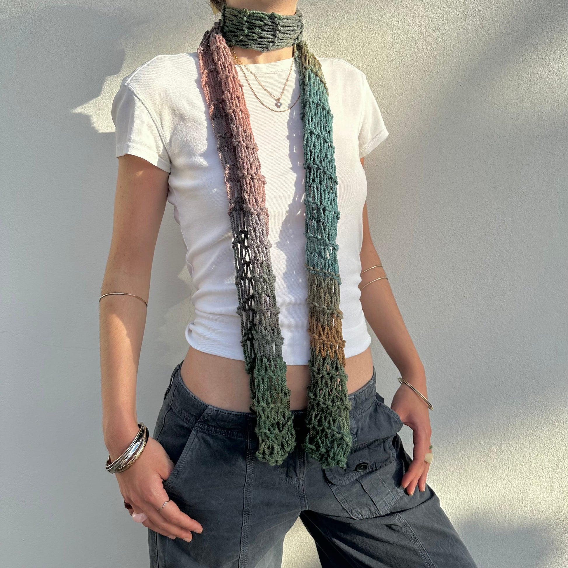 Hand-knitted fishnet / distressed knit scarf in gorgeous ombré shades of green, brown, blue and yellow 🐠