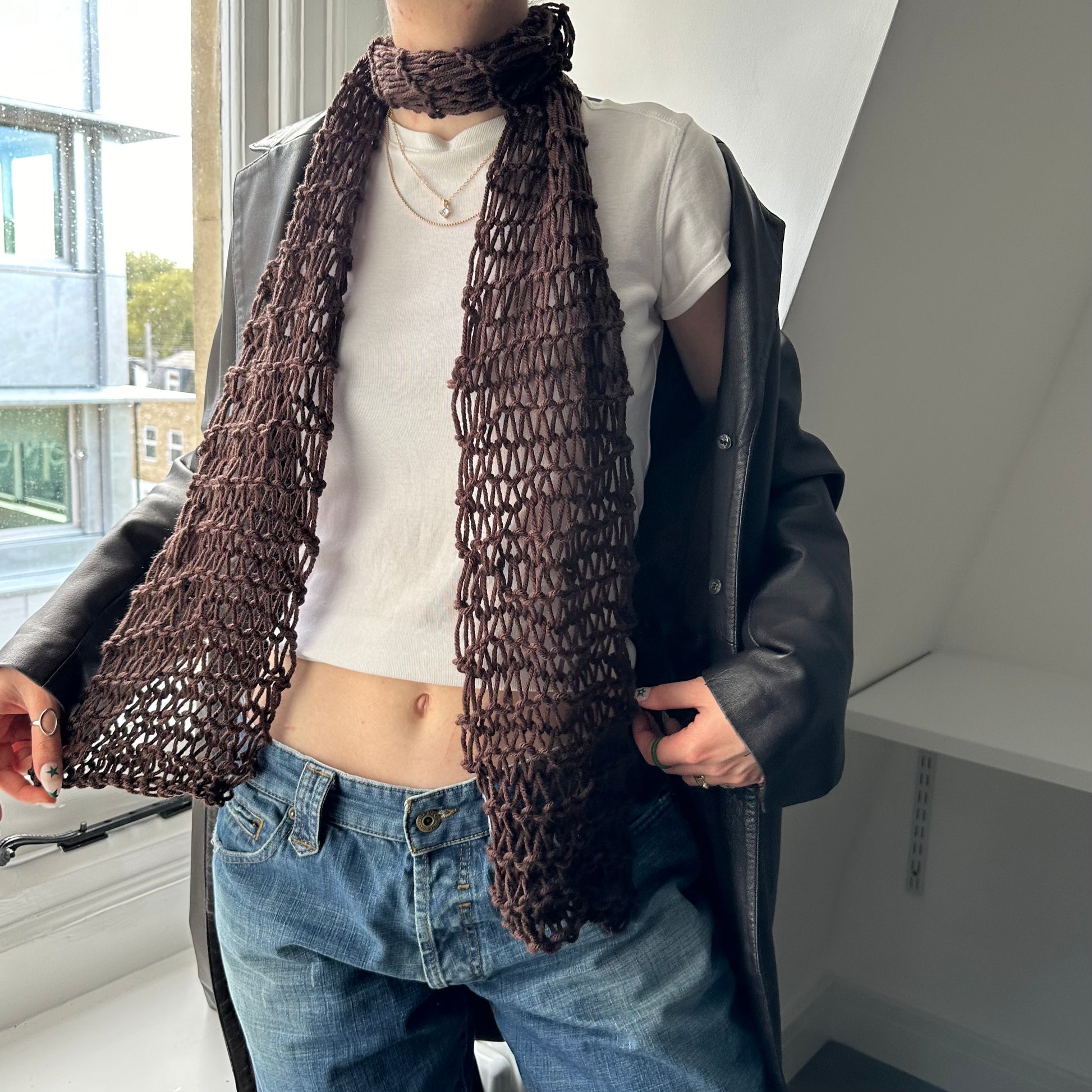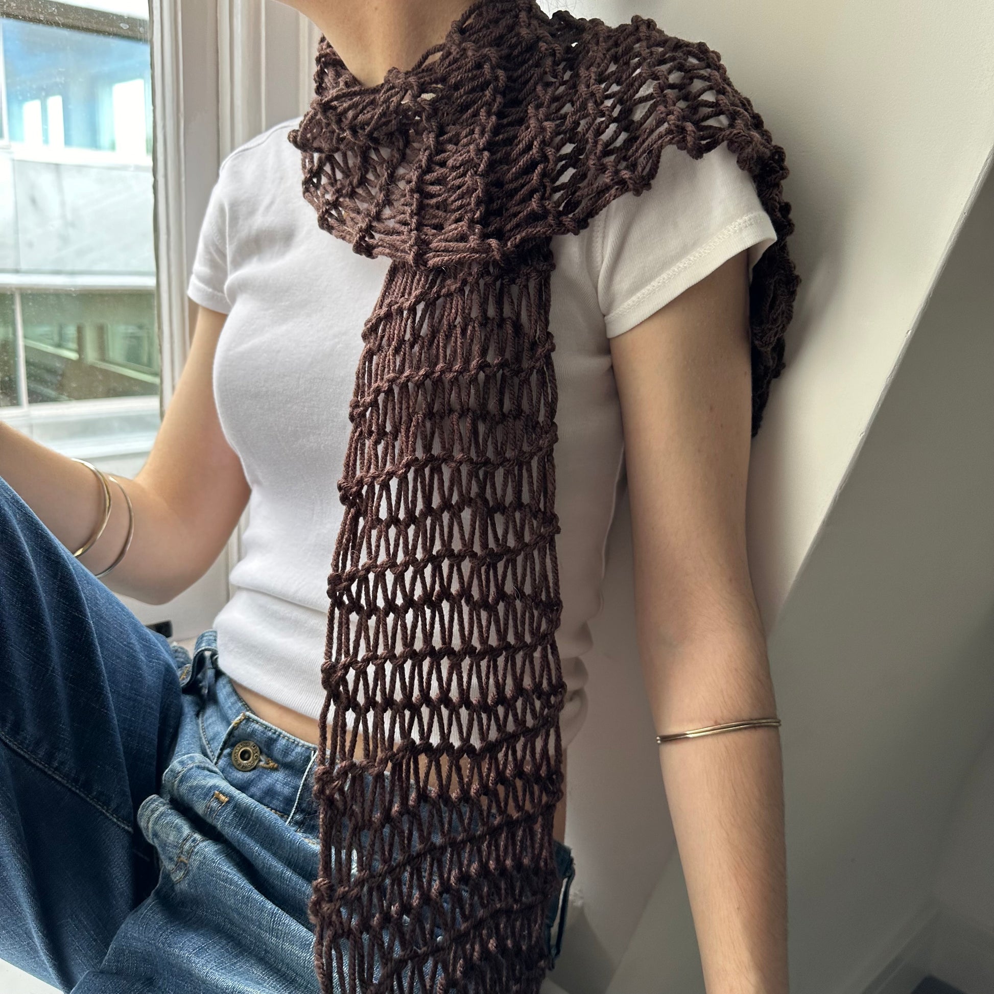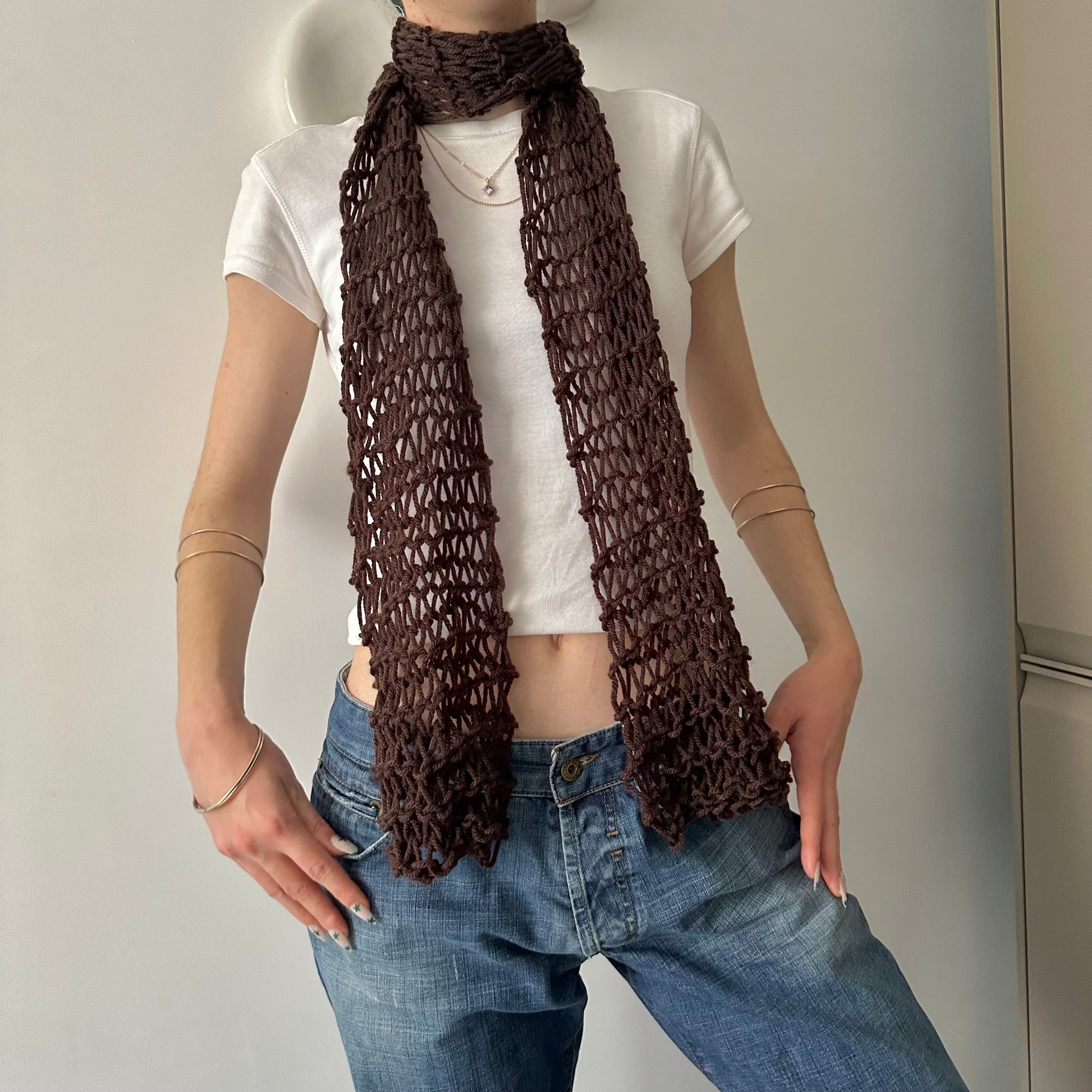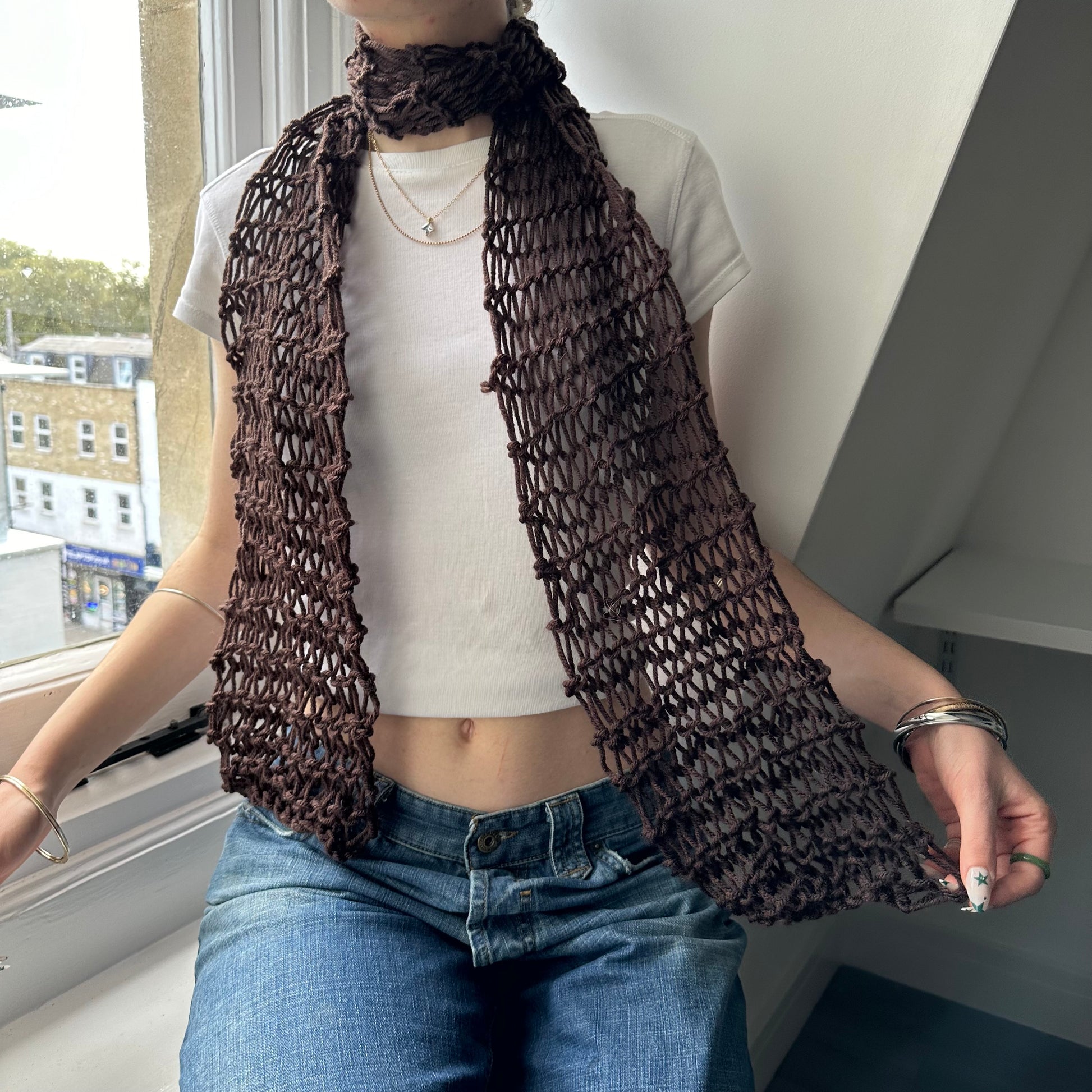 Hand-knitted fishnet / distressed knit scarf in brown 🤎