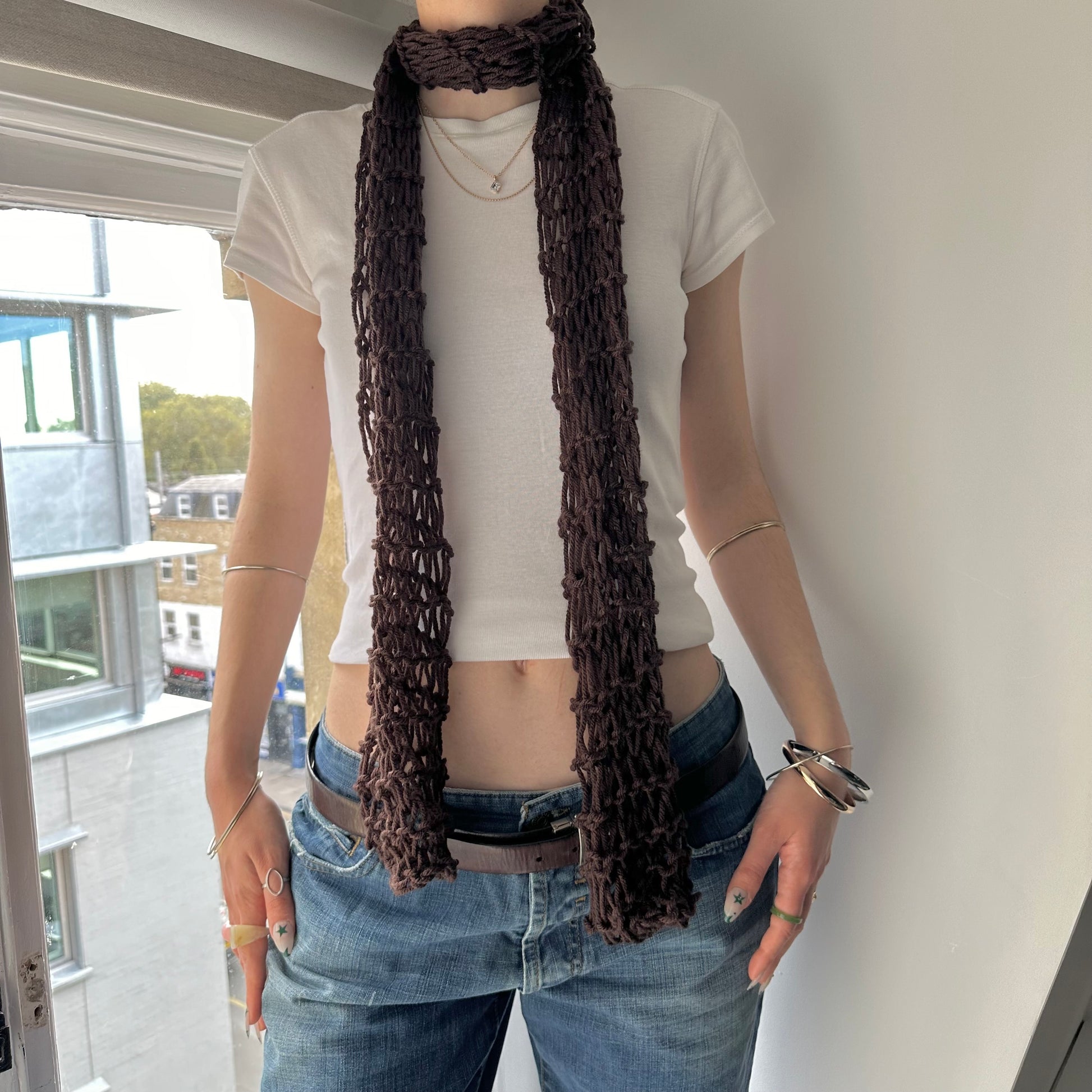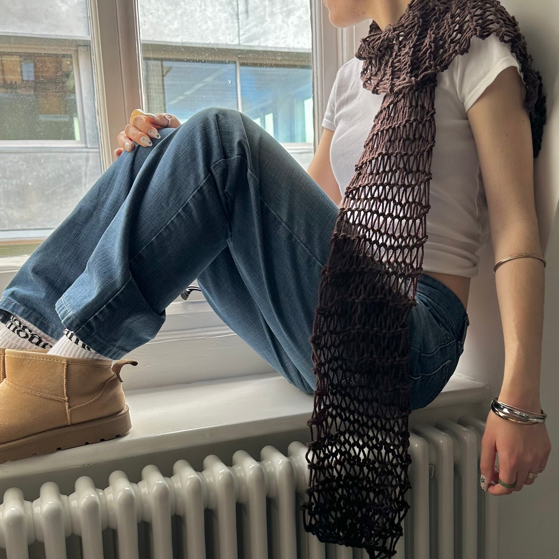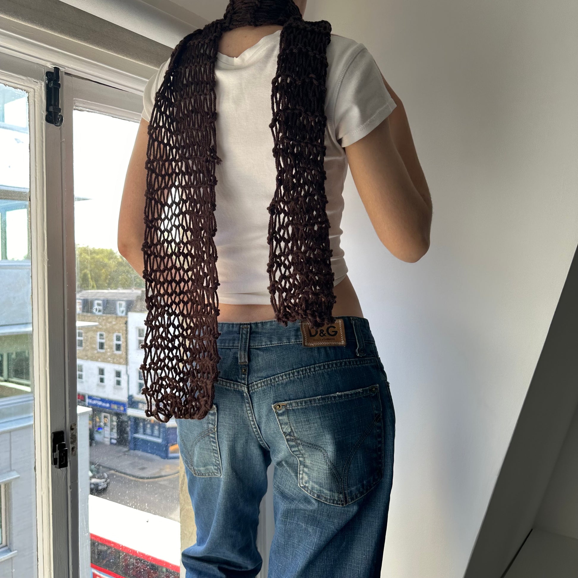 Hand-knitted fishnet / distressed knit scarf in brown 🤎