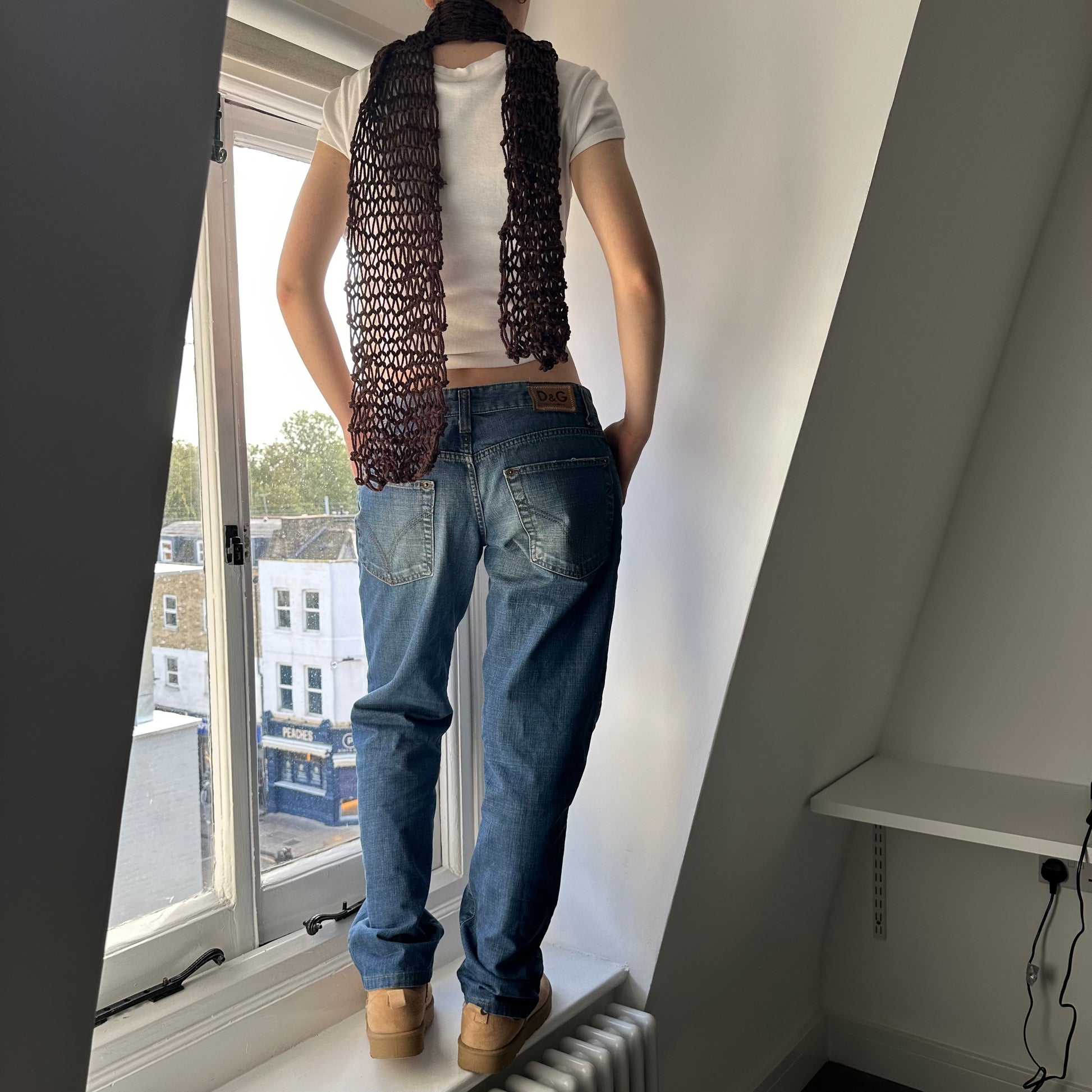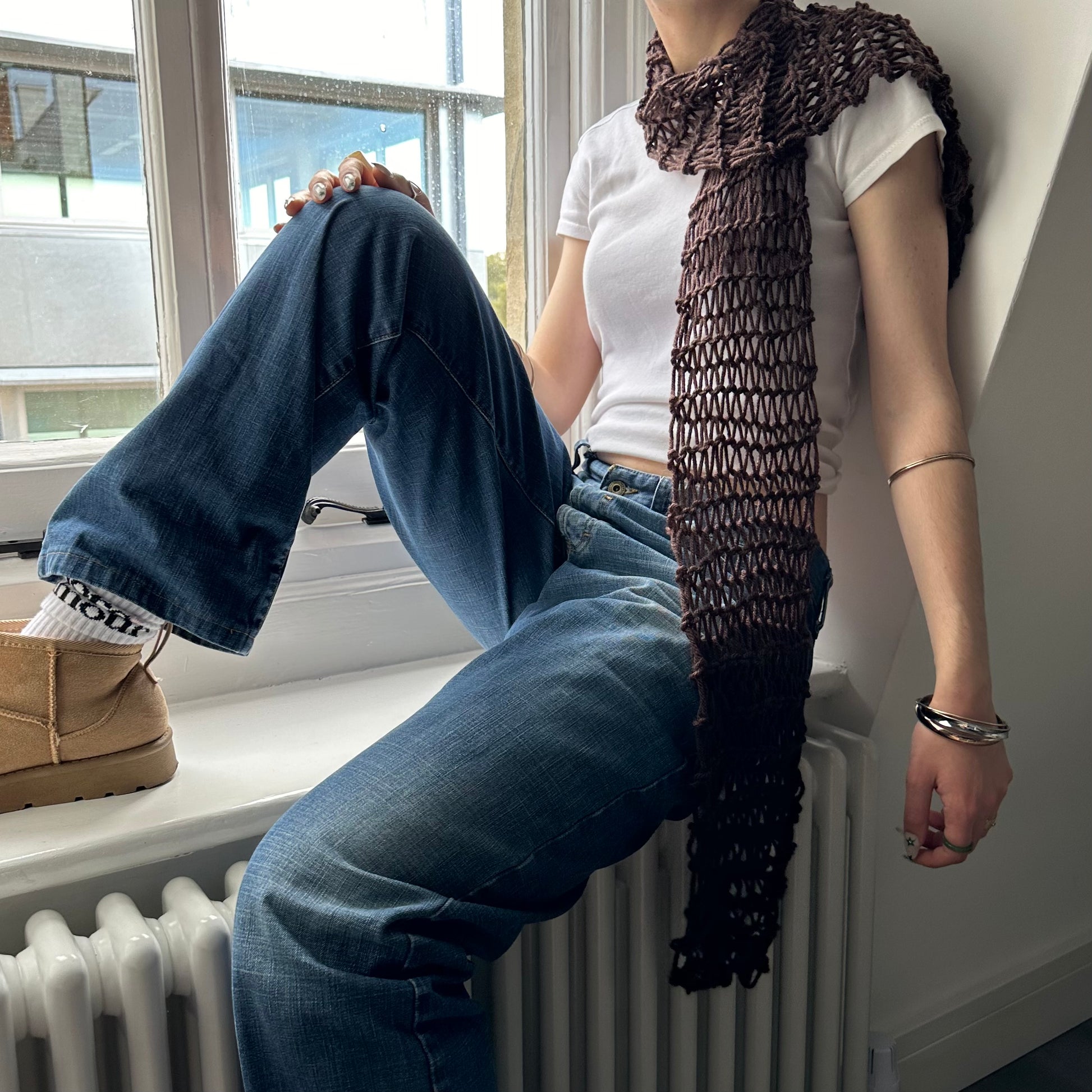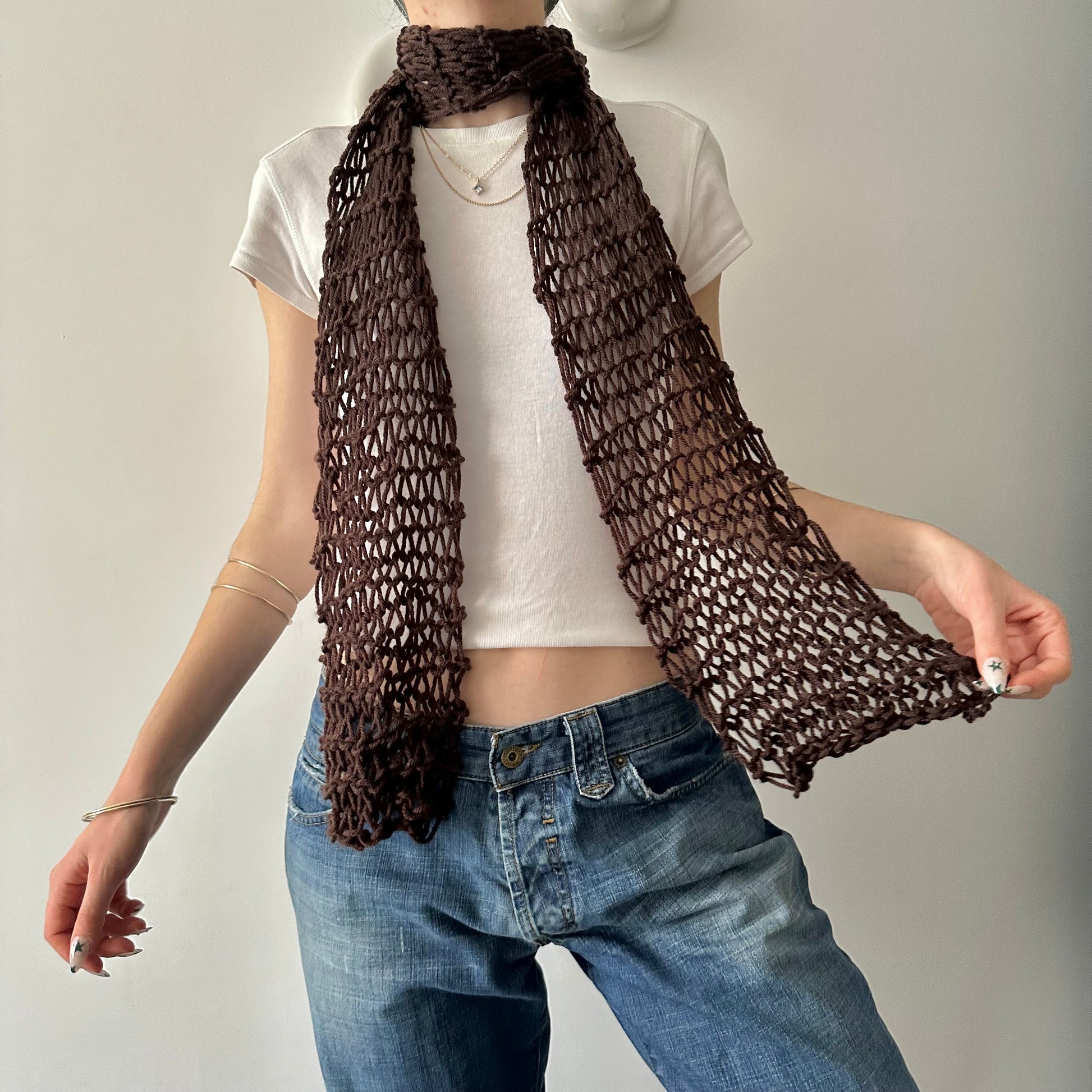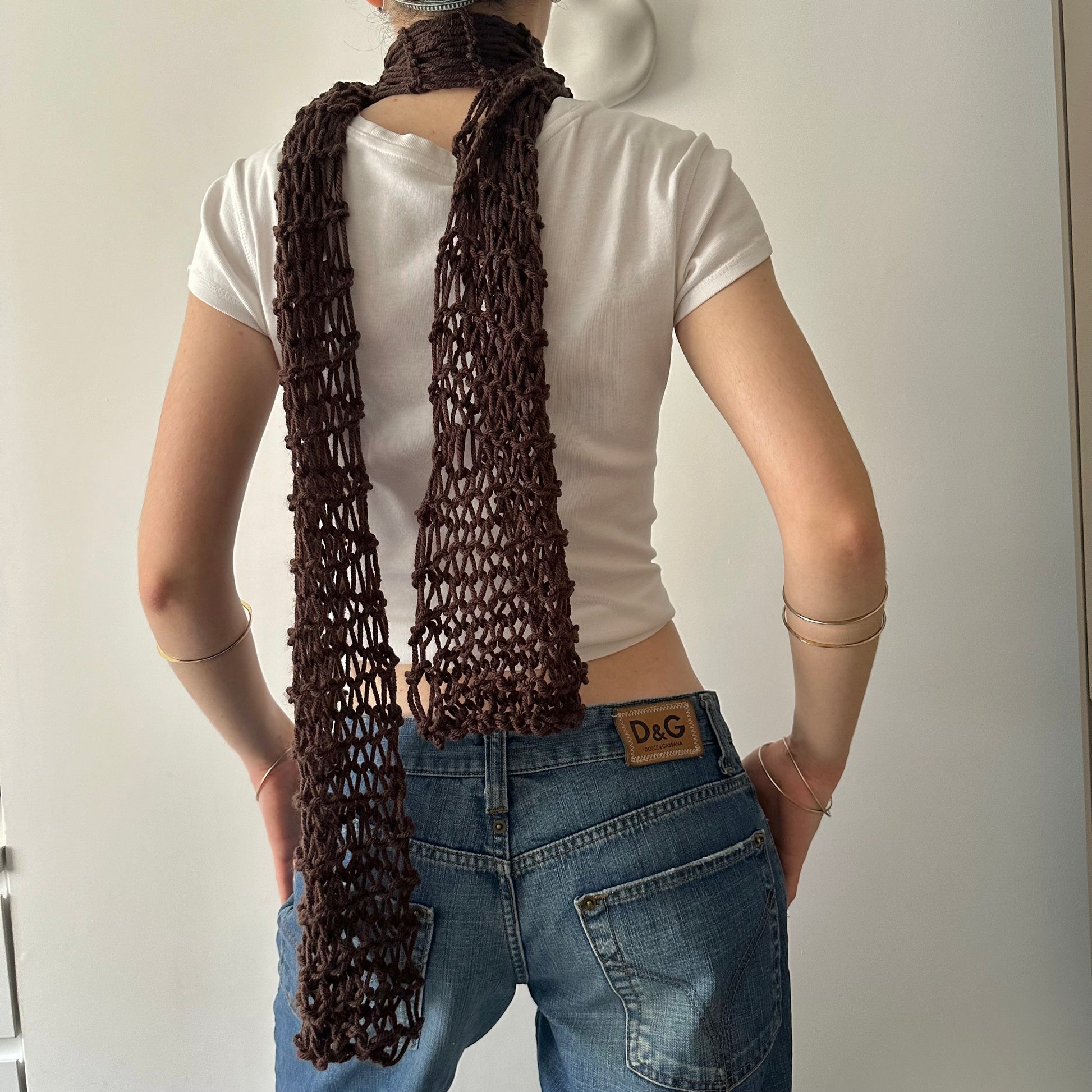 Hand-knitted fishnet / distressed knit scarf in brown 🤎