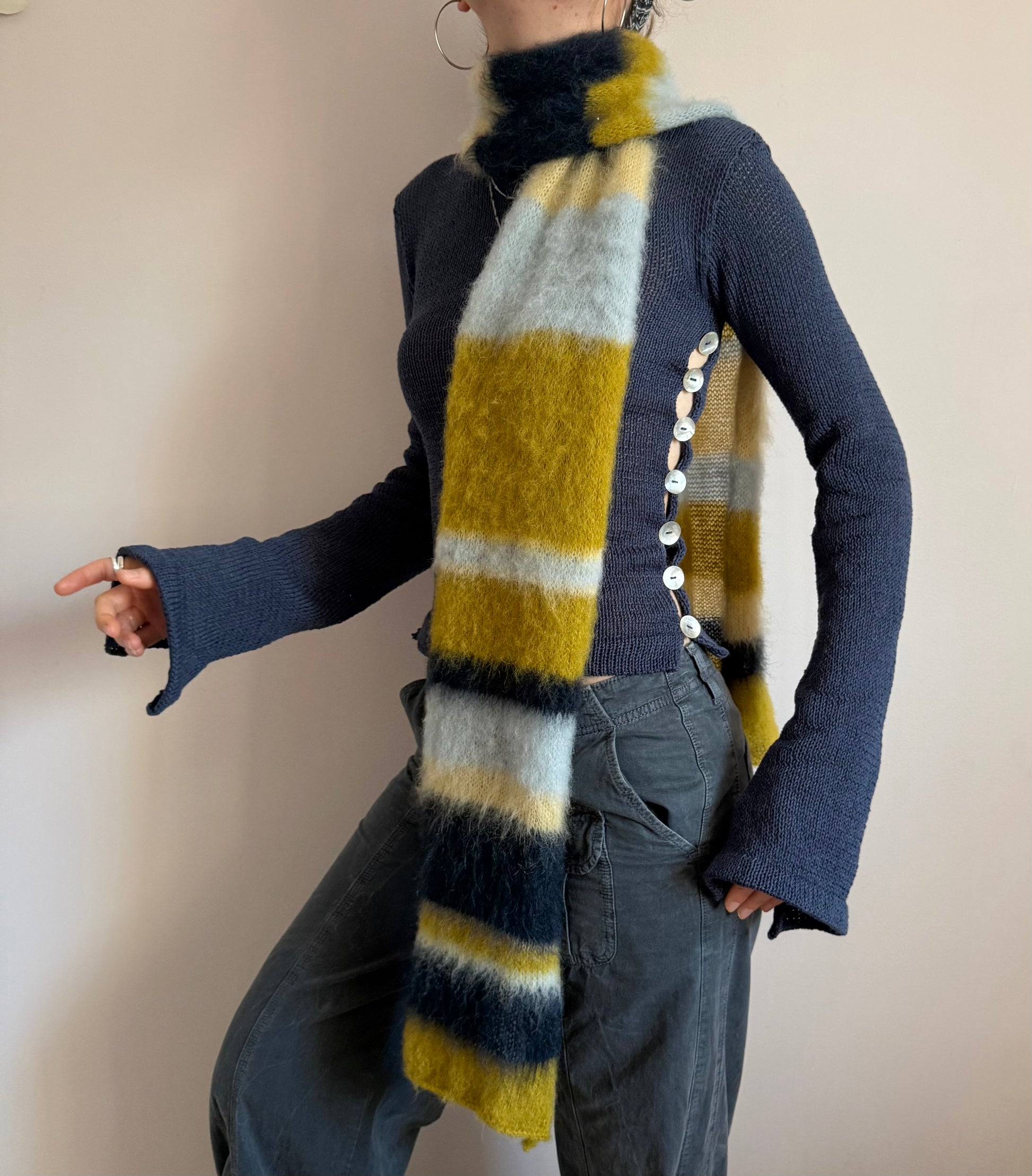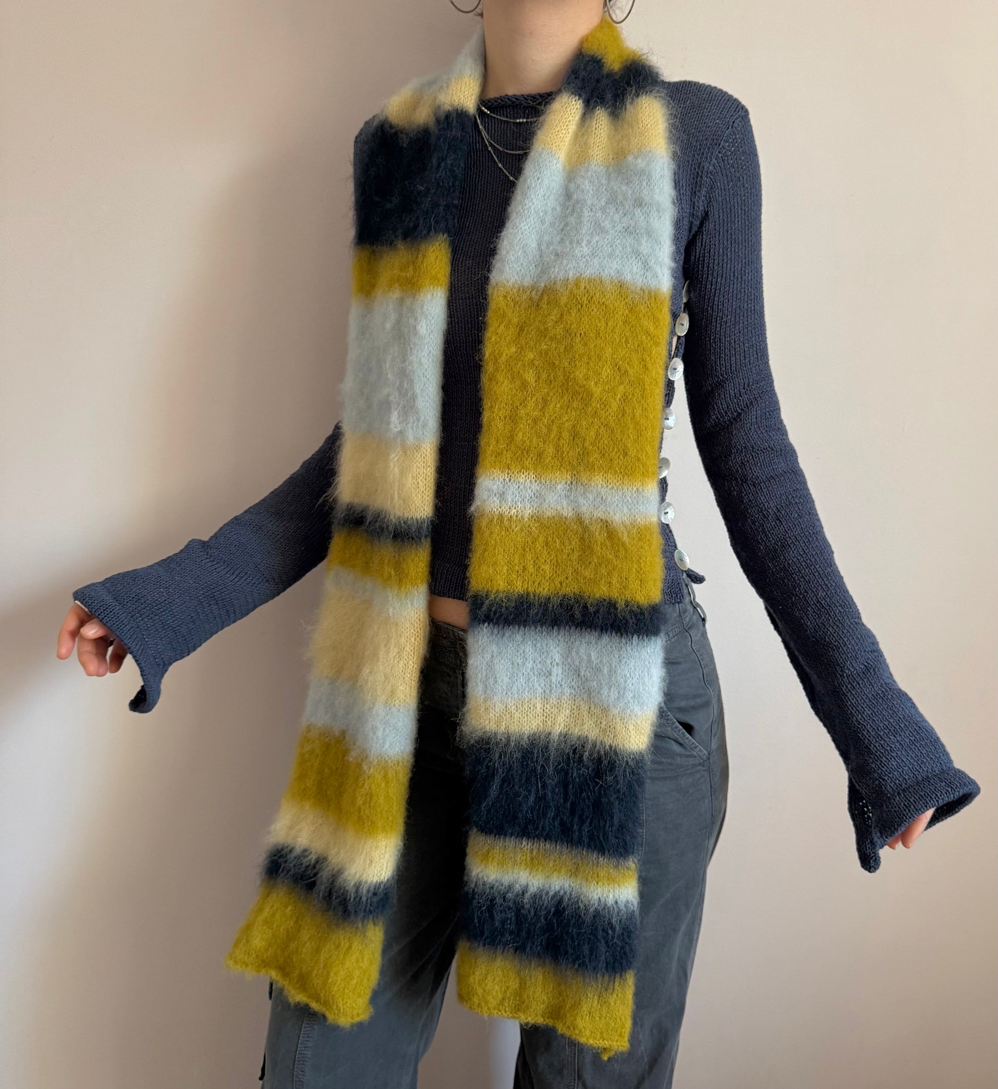 Extra wide knit mohair stripy scarf in the coolest colour combo of navy blue, bay blue, light yellow and chartreuse 💙🐠