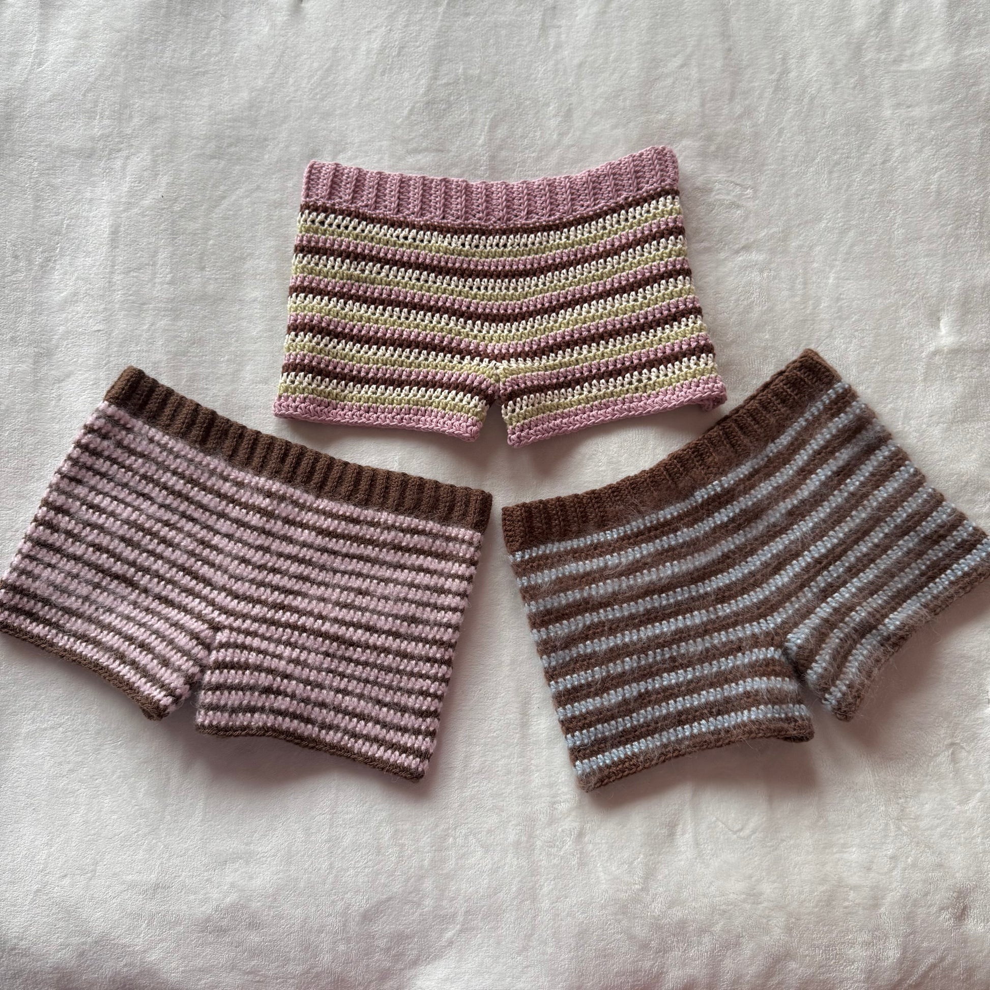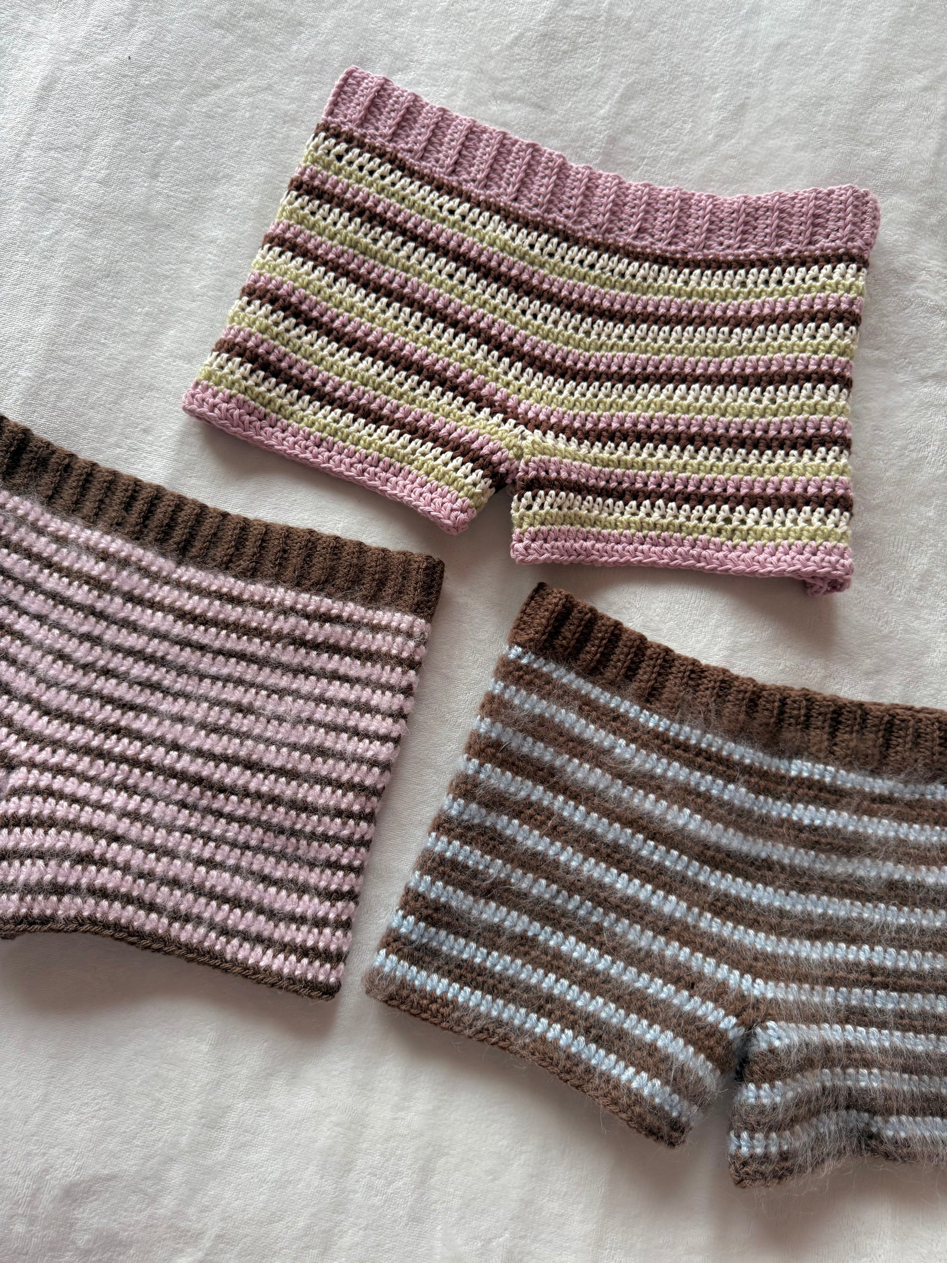 Handmade cotton striped crochet shorts in a gorgeous pink, brown, green and cream colour combo! 🌸
