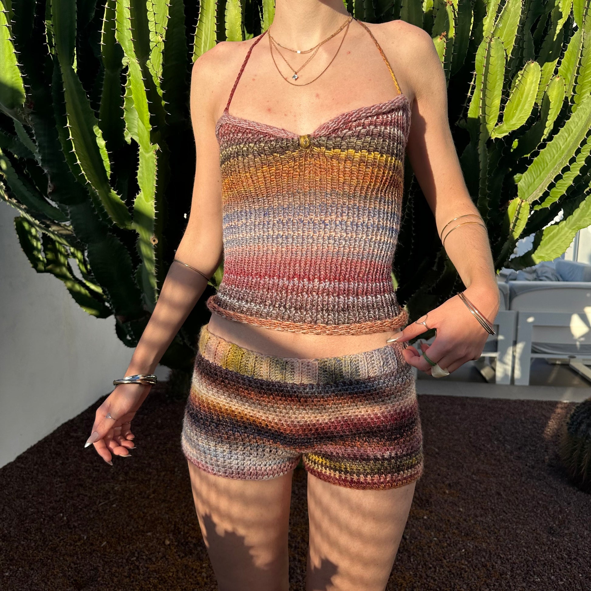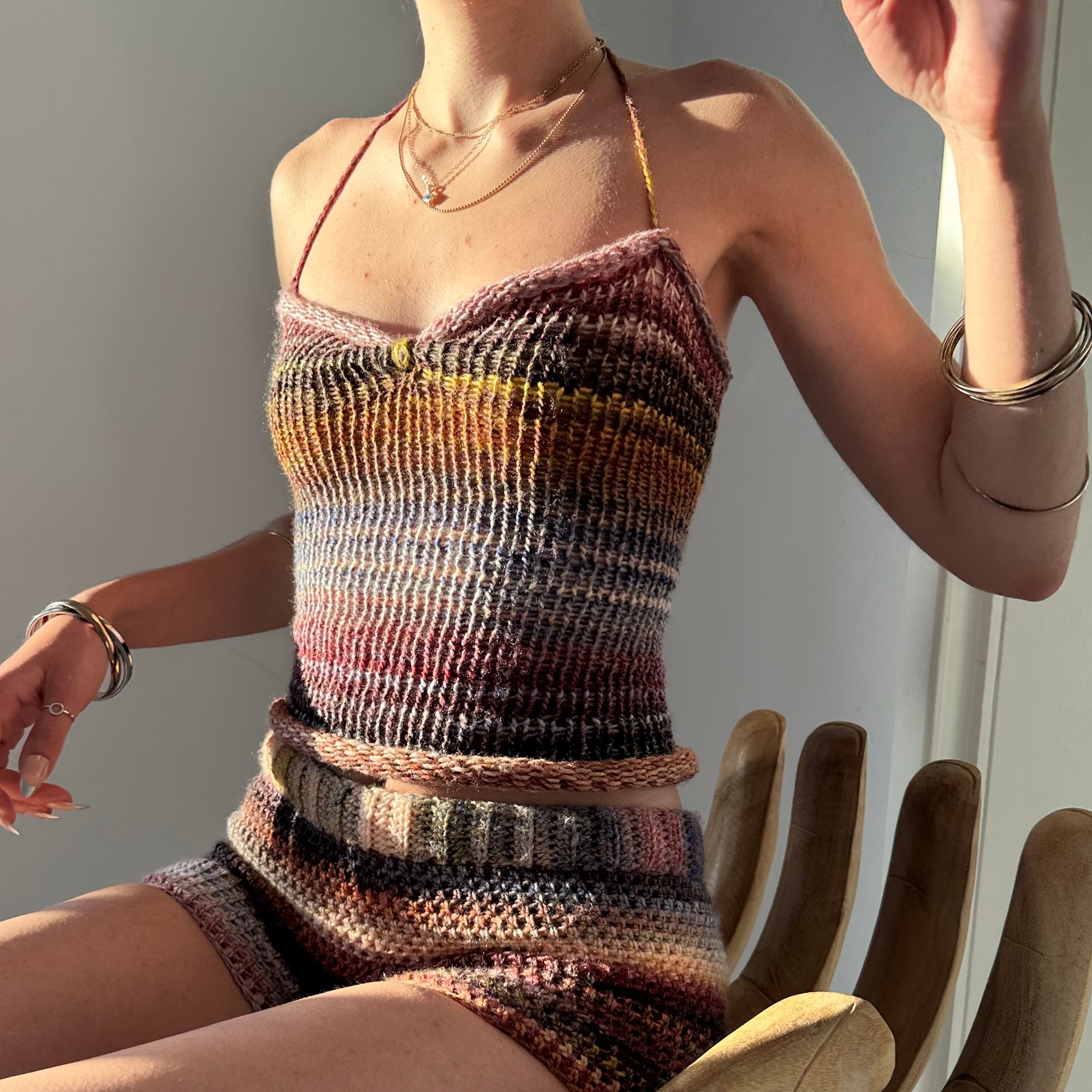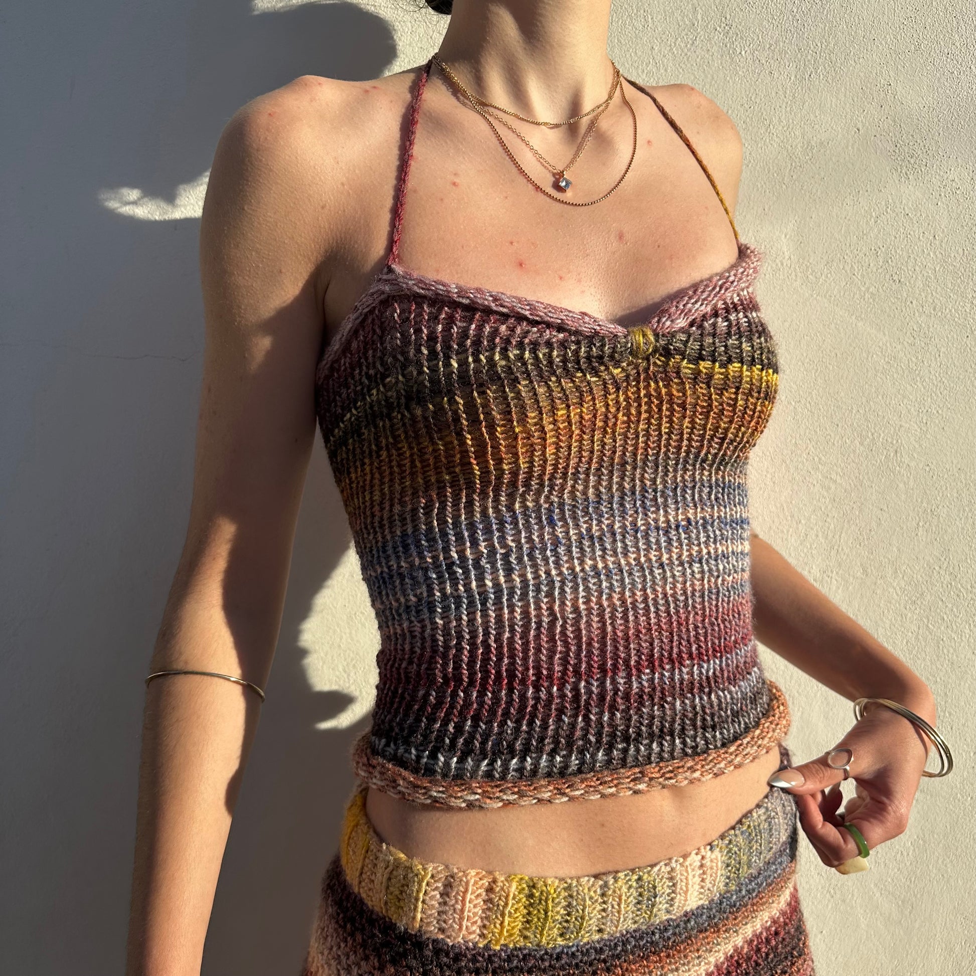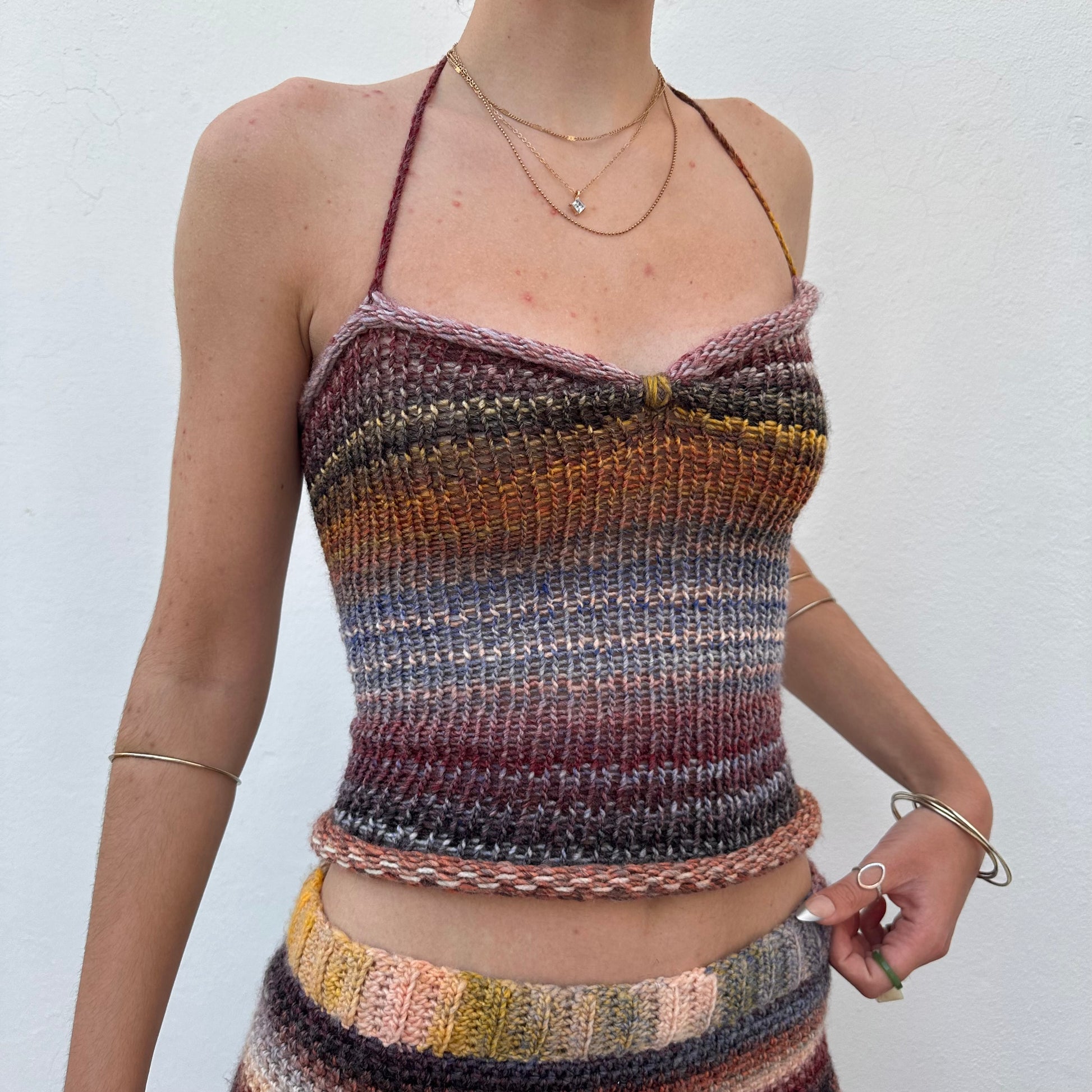 Ombré striped knit halter top with ruched bust detail ✨🤎 gorgeous yellow, black, cream and burgundy ombré colourway.