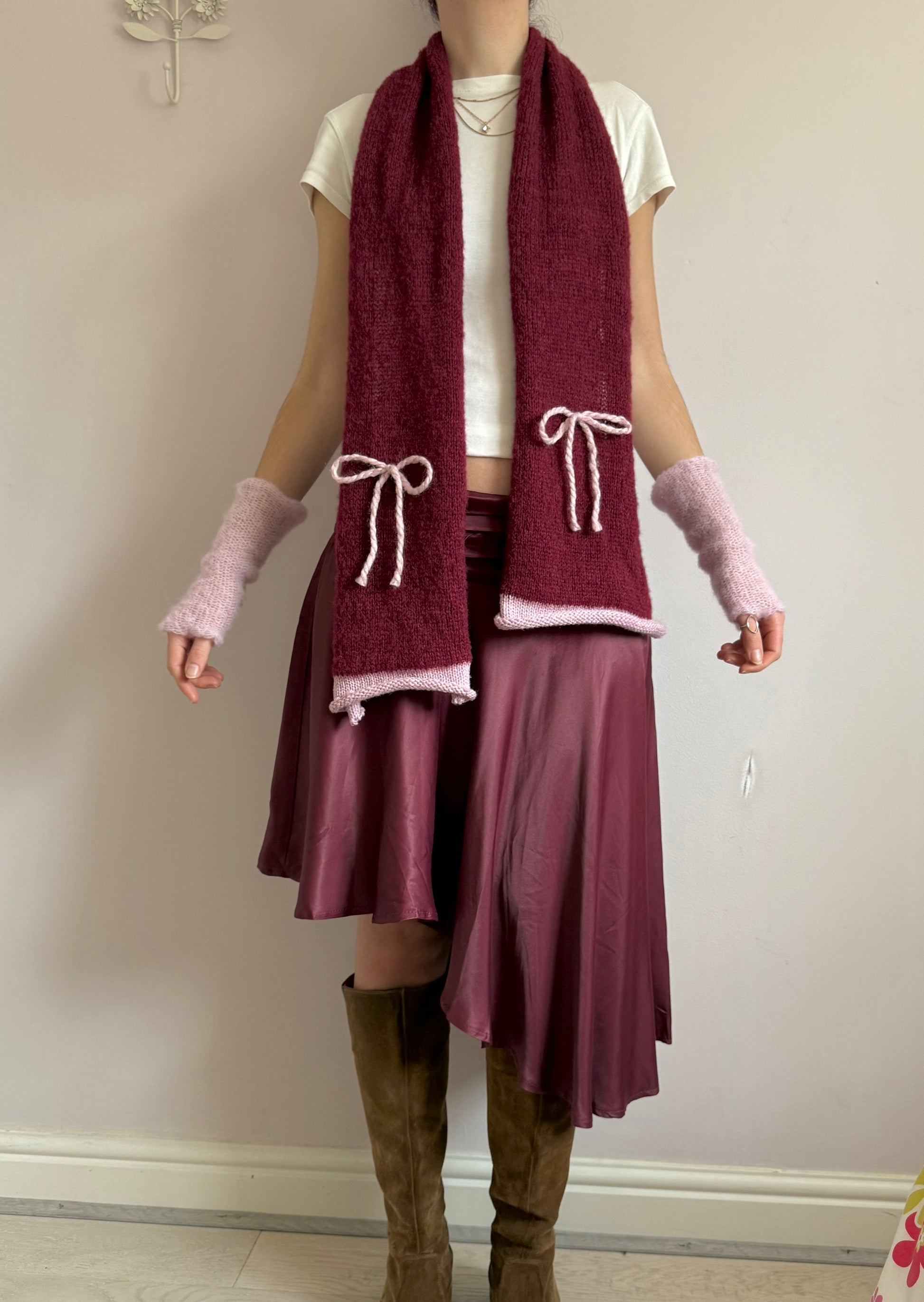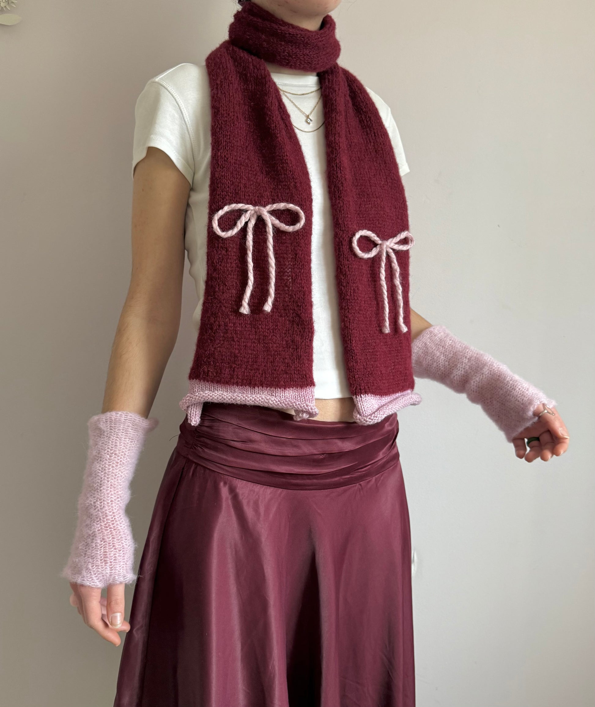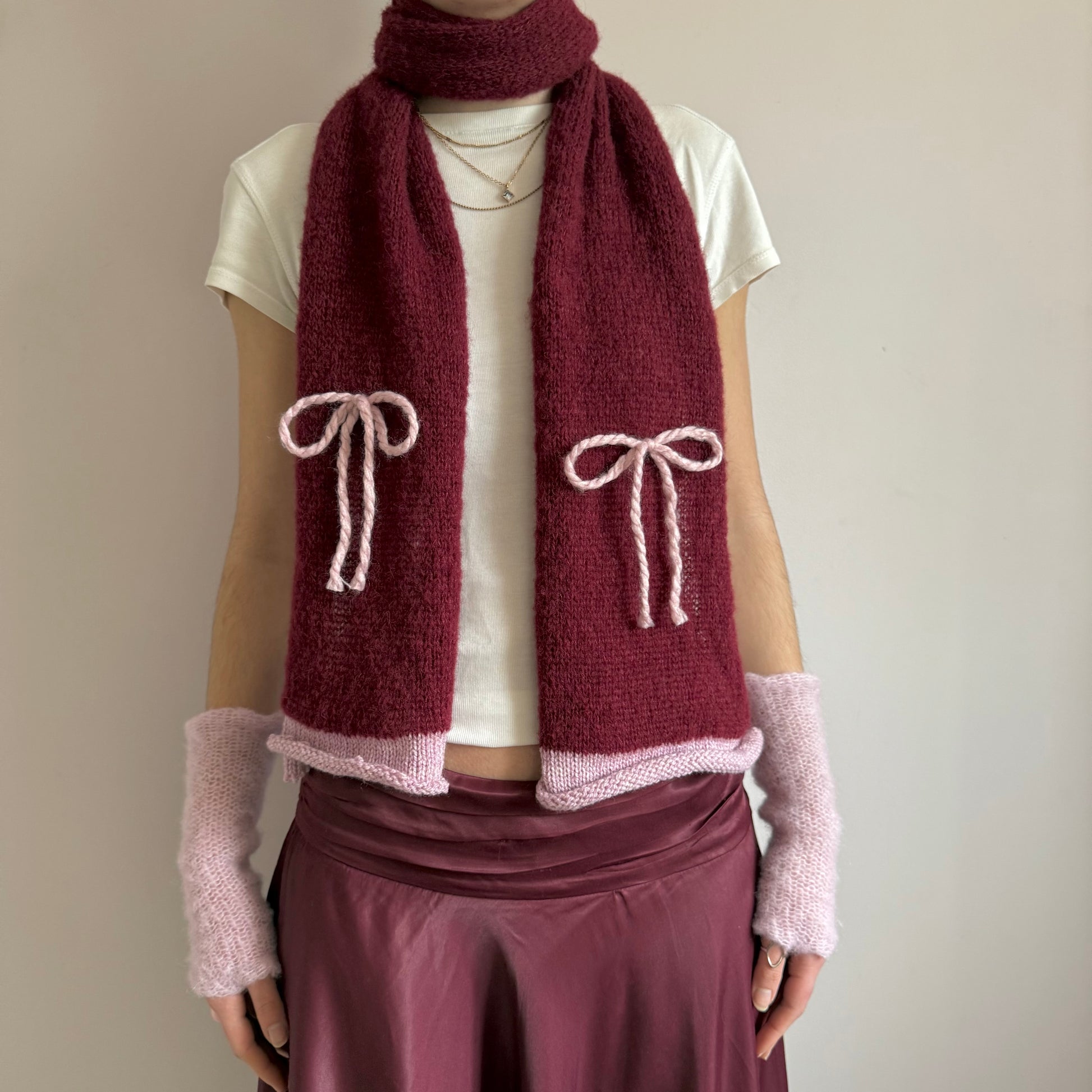 Handmade knitted burgundy and baby pink mohair bow scarf