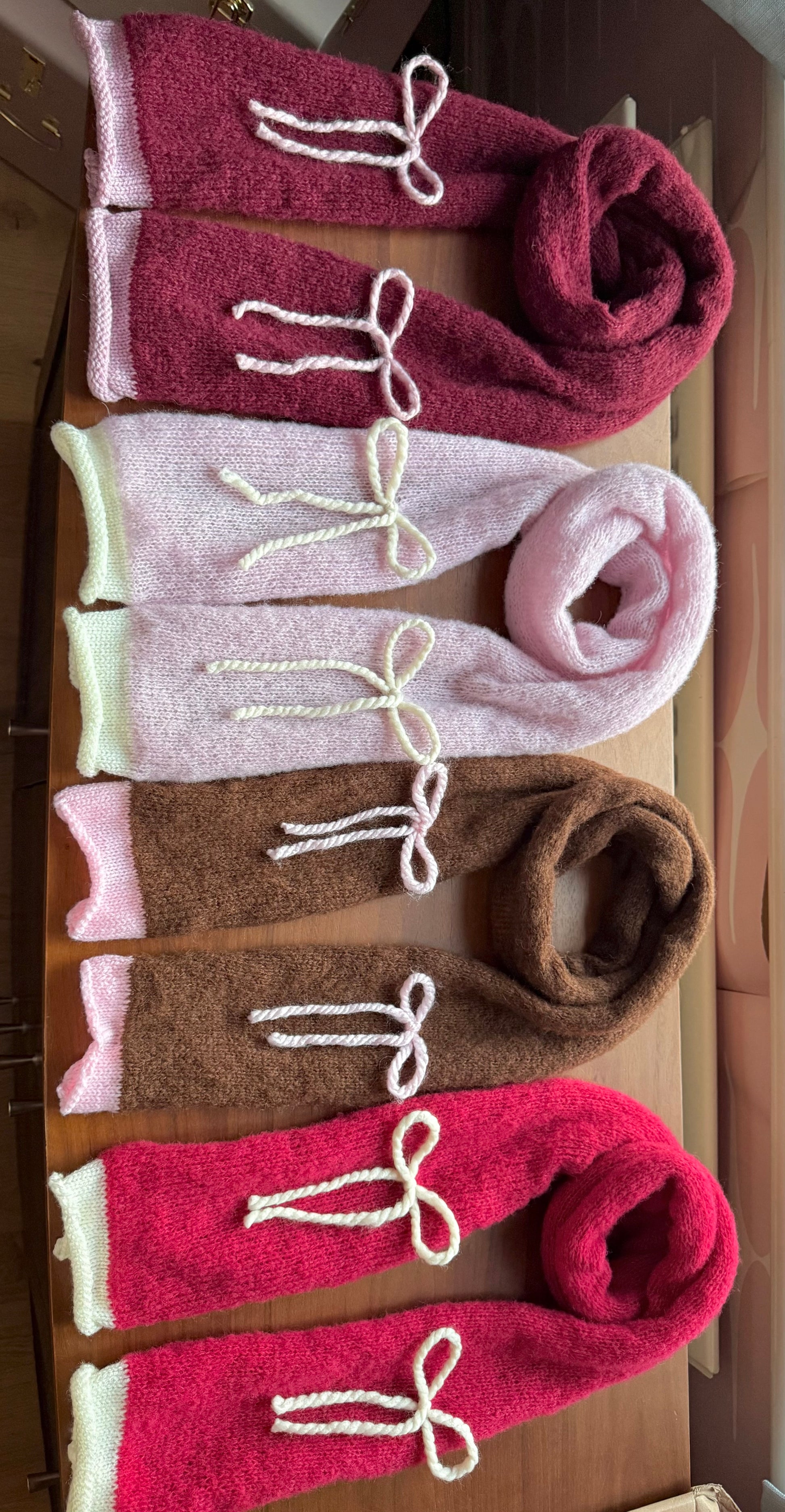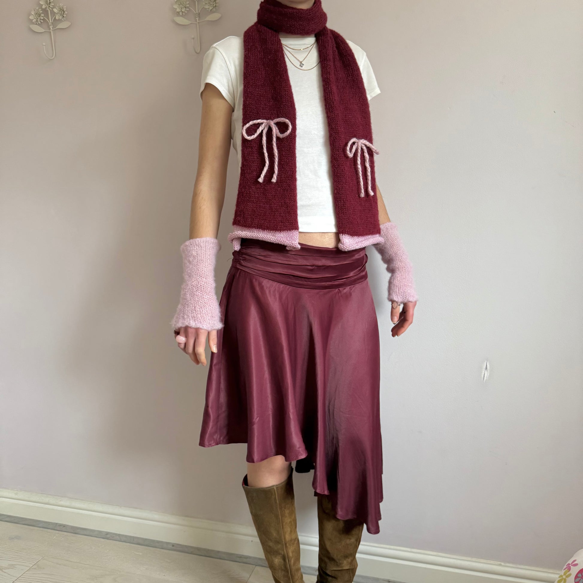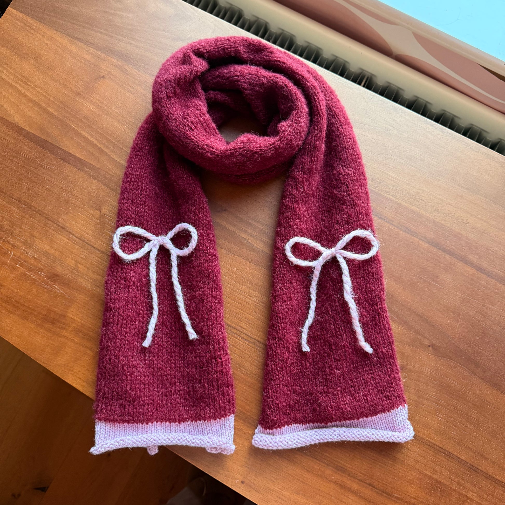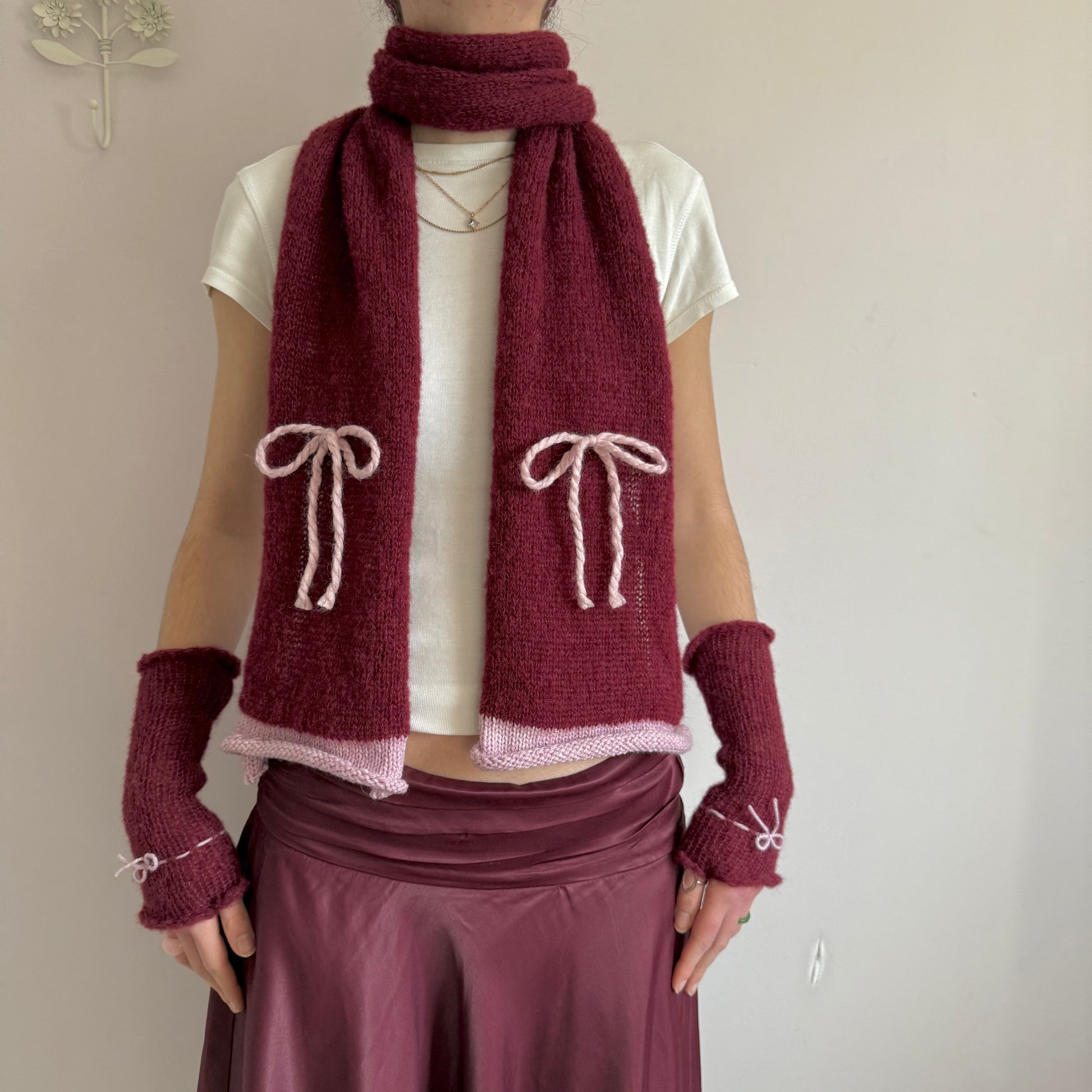 Handmade knitted burgundy and baby pink mohair bow scarf