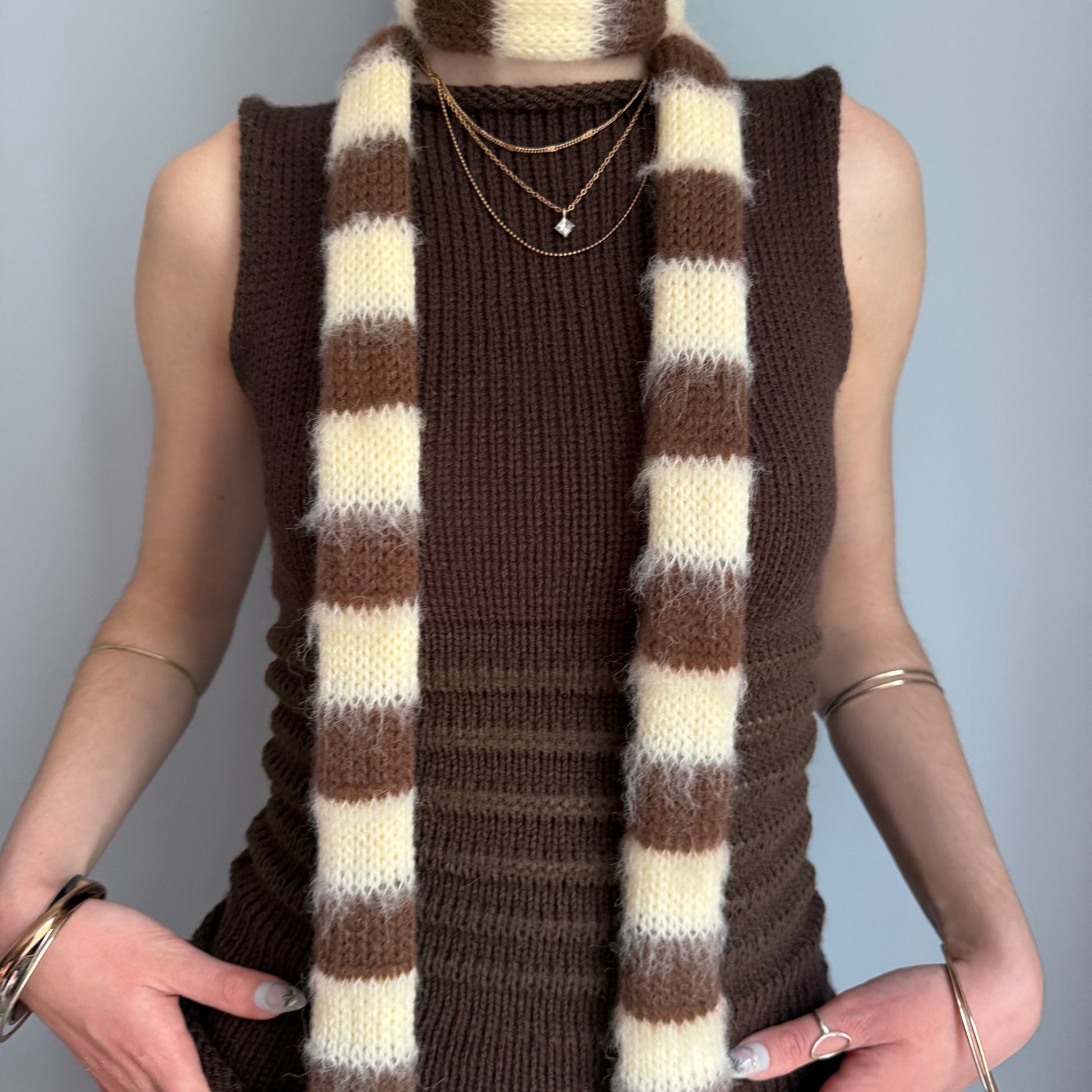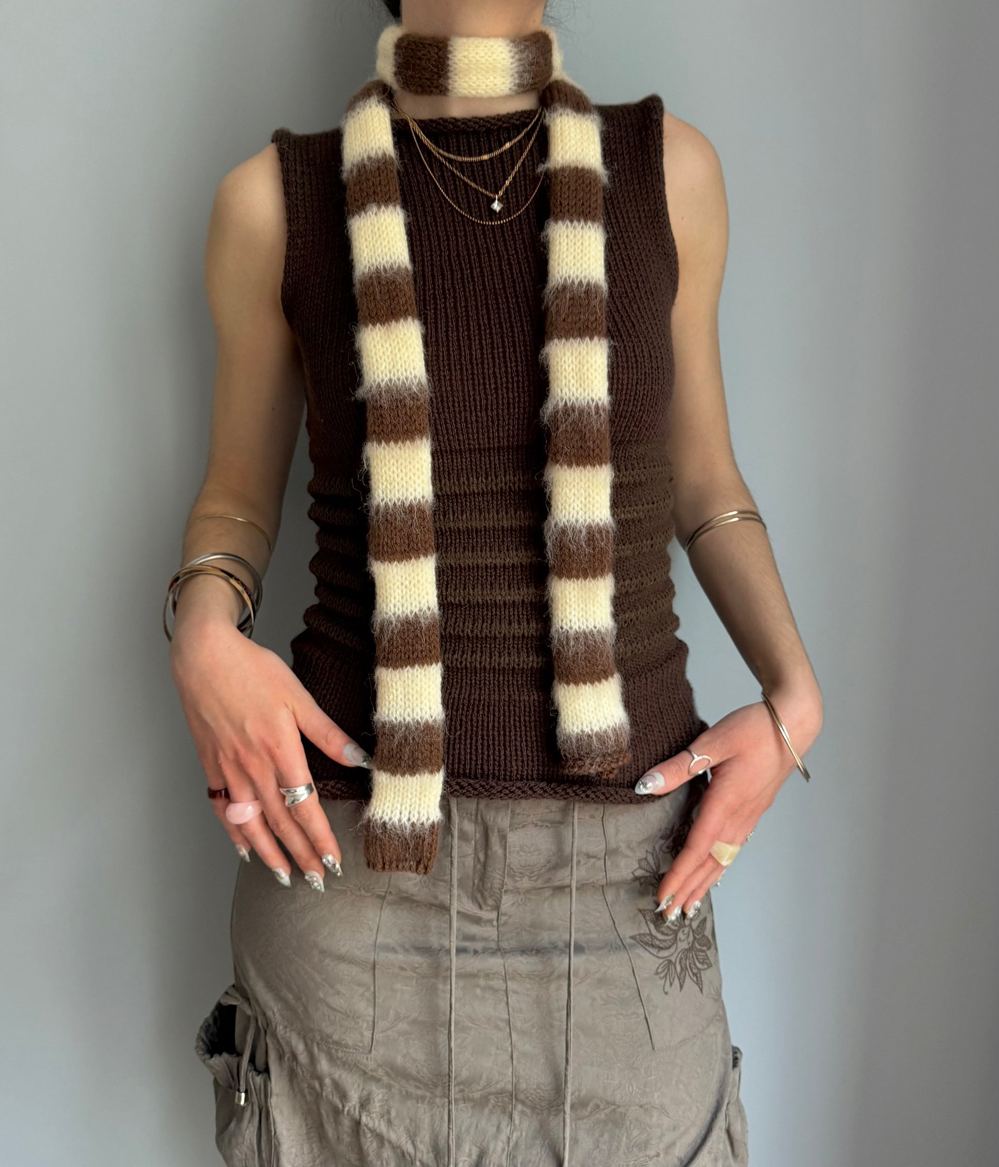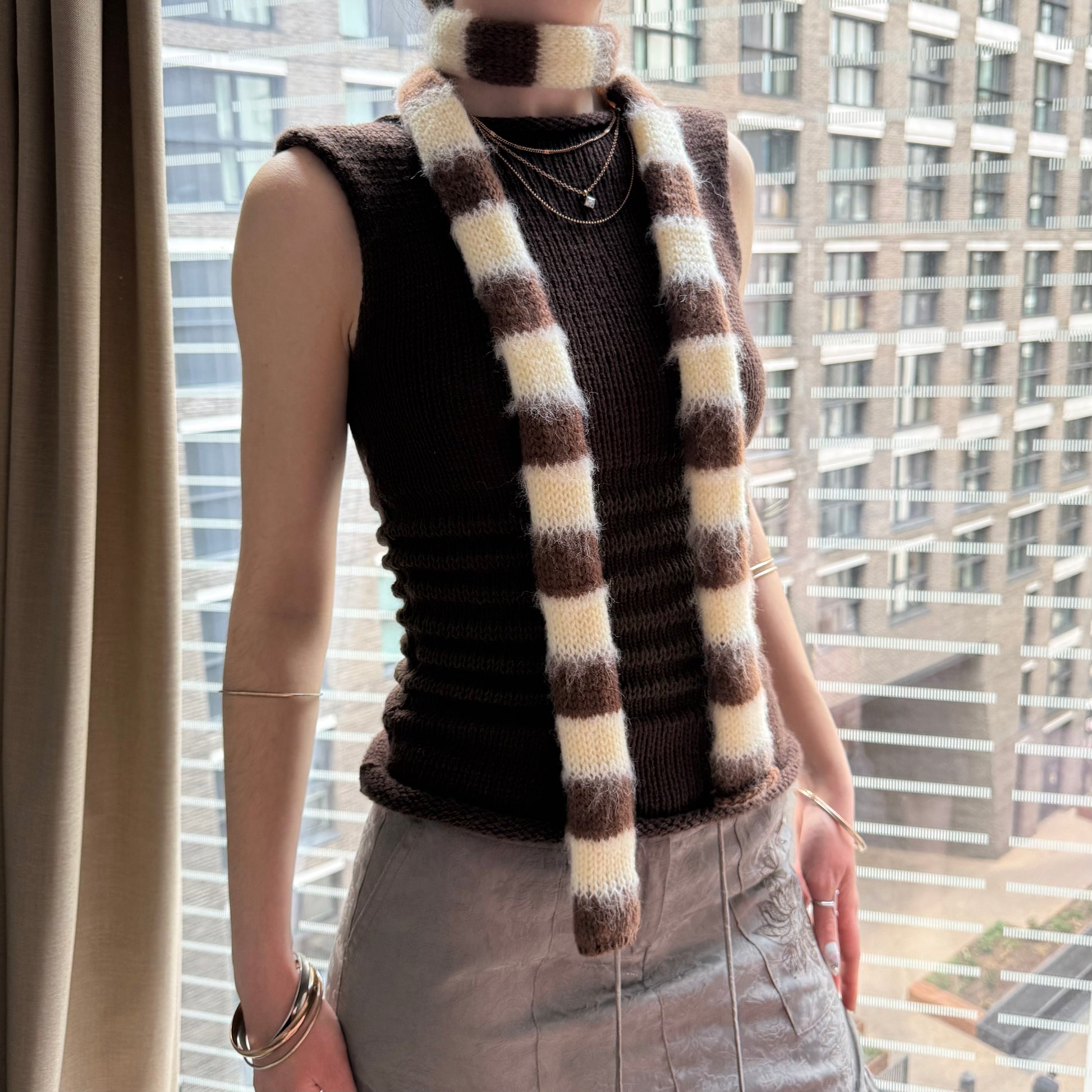 Handmade knitted brown and light yellow mohair striped skinny scarf