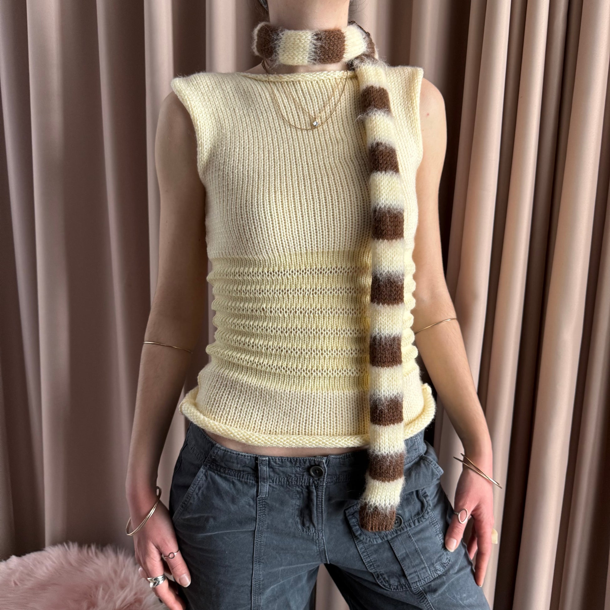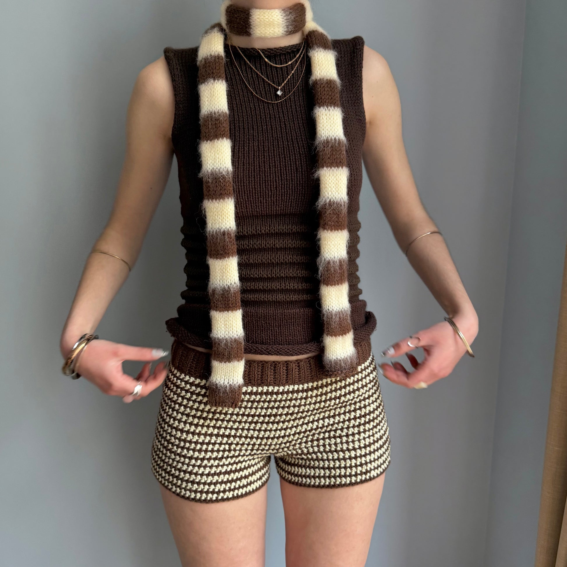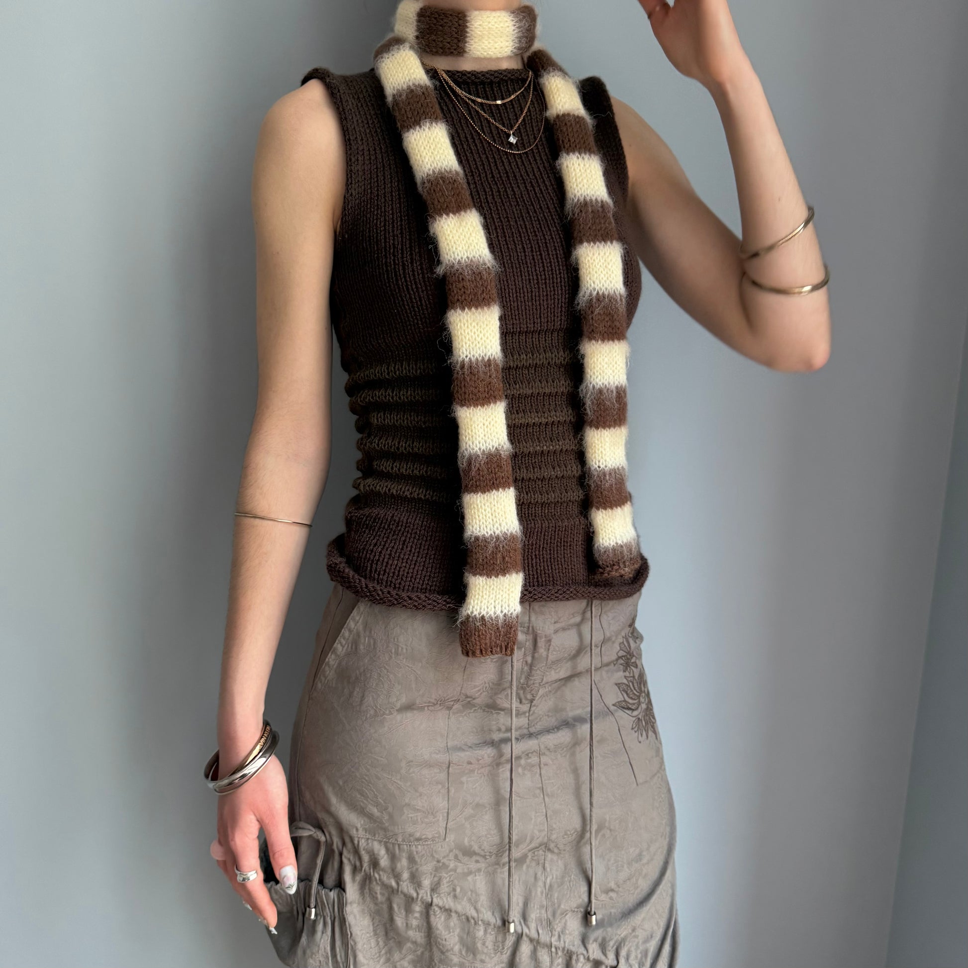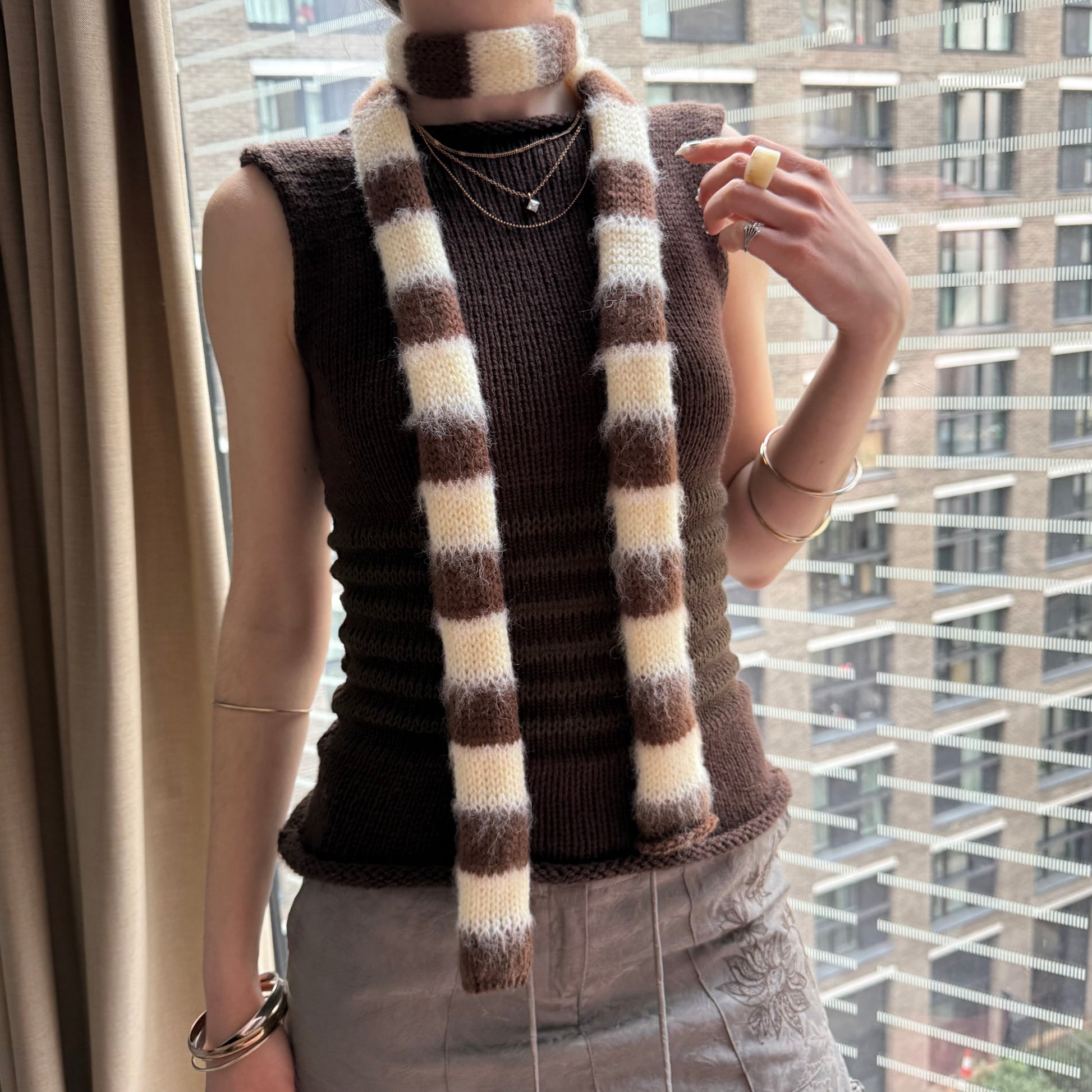 Handmade knitted brown and light yellow mohair striped skinny scarf