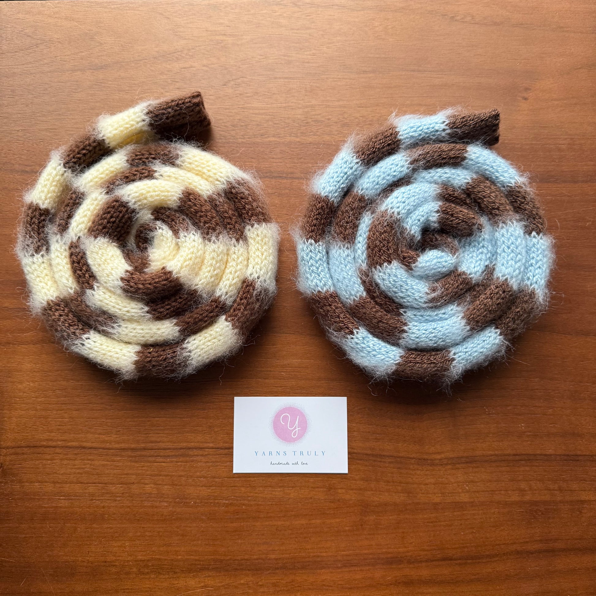 Striped knit skinny scarf in a gorgeous butter yellow and brown colourway featuring super fluffy mohair - the perfect addition to your outfit! ⭐️🤎☁️