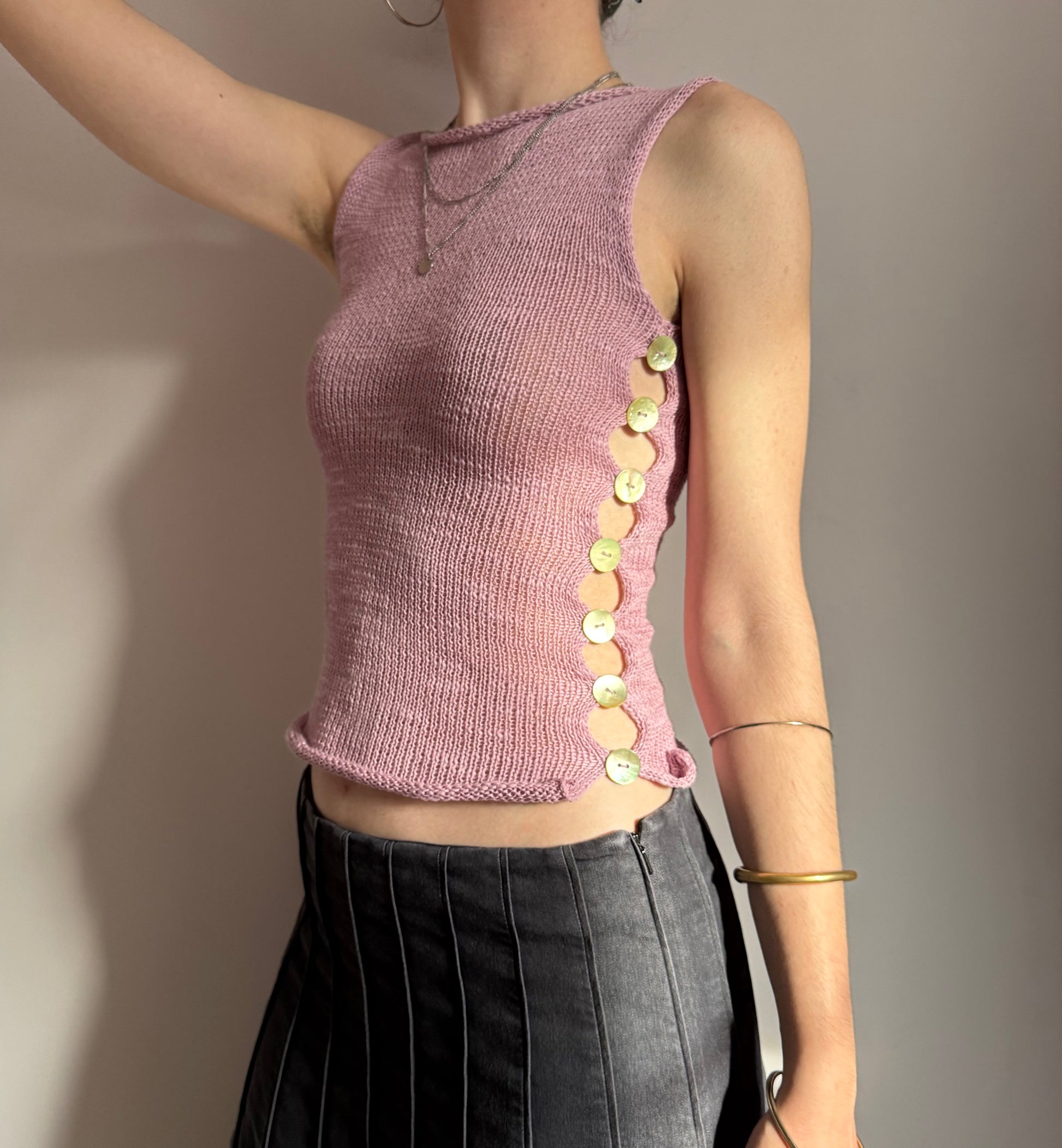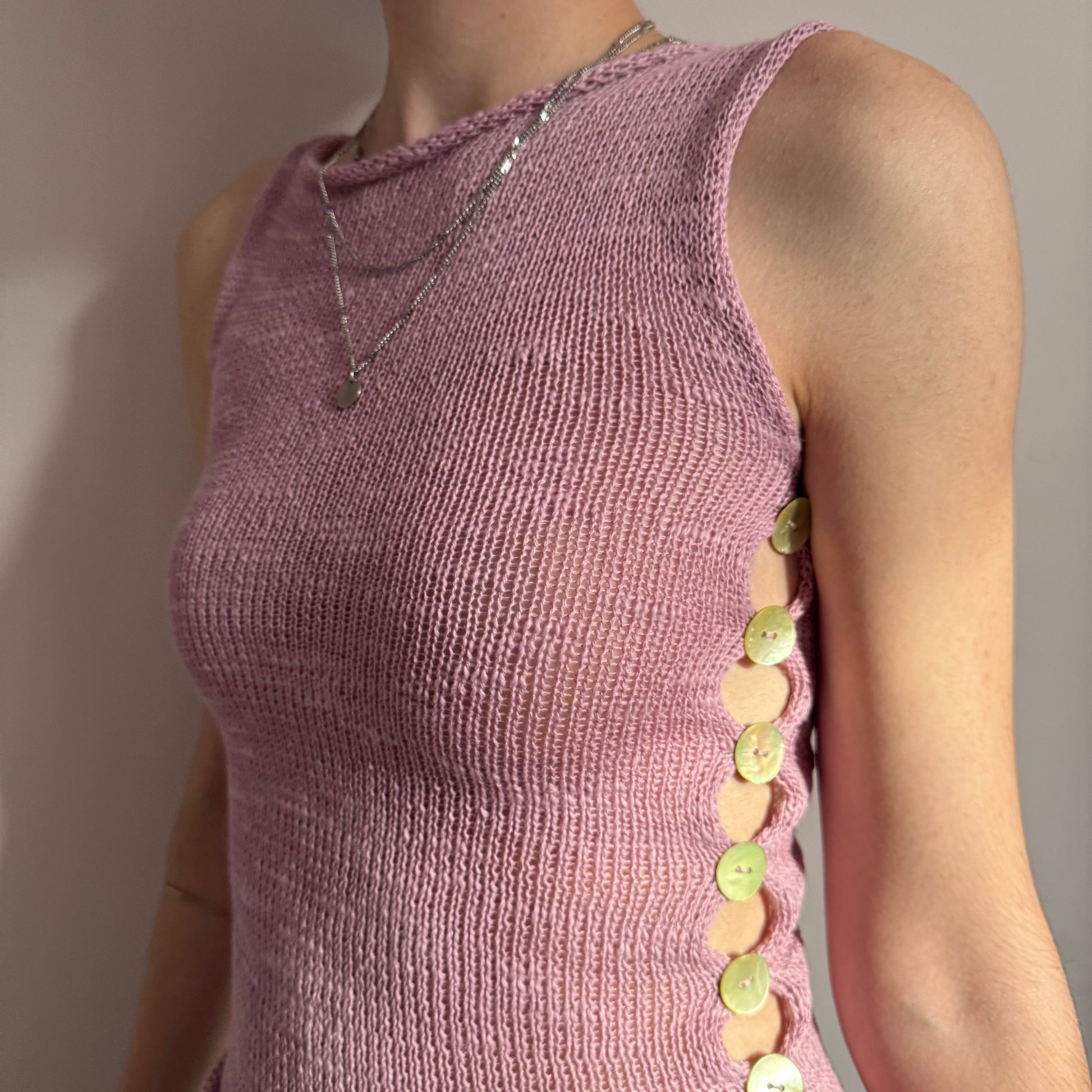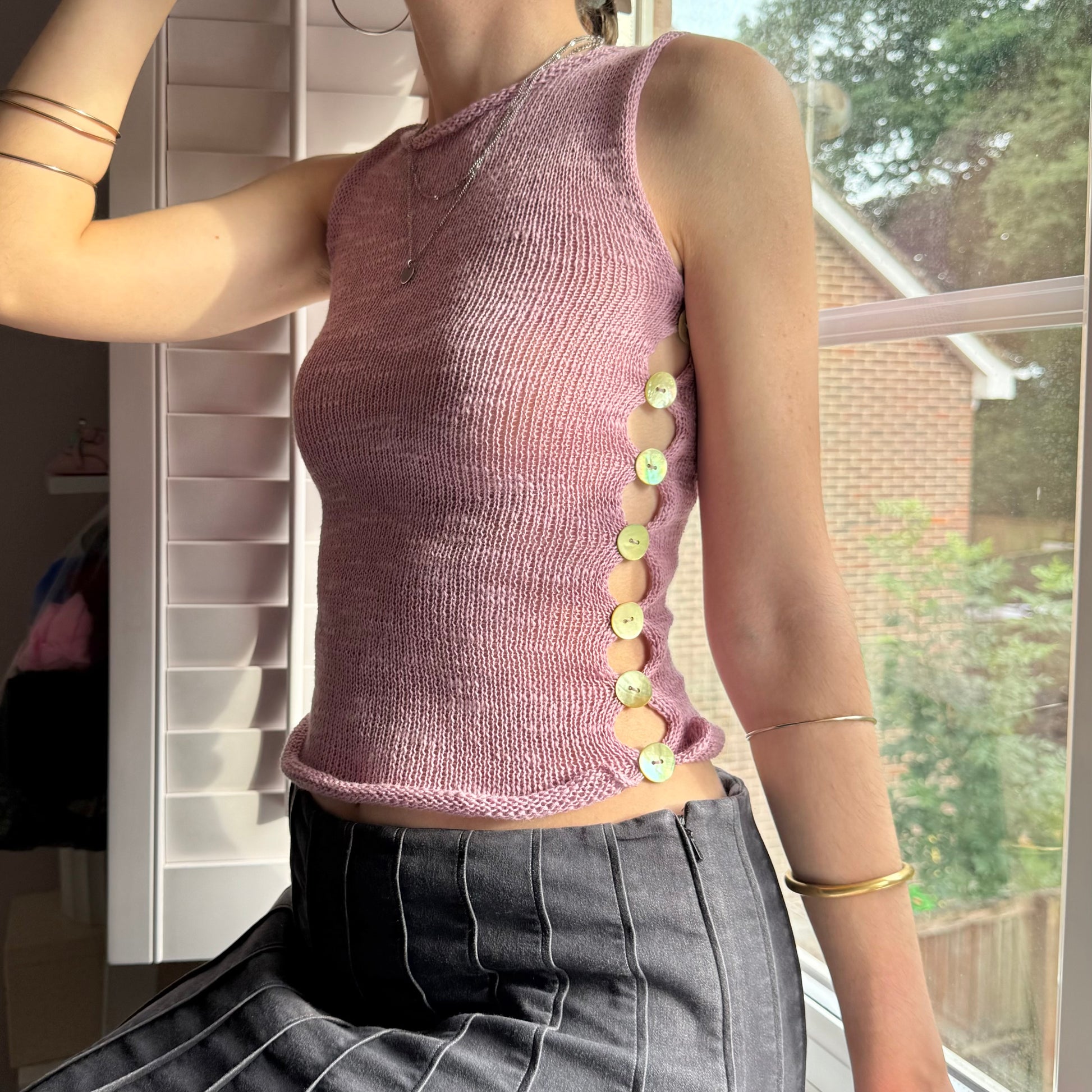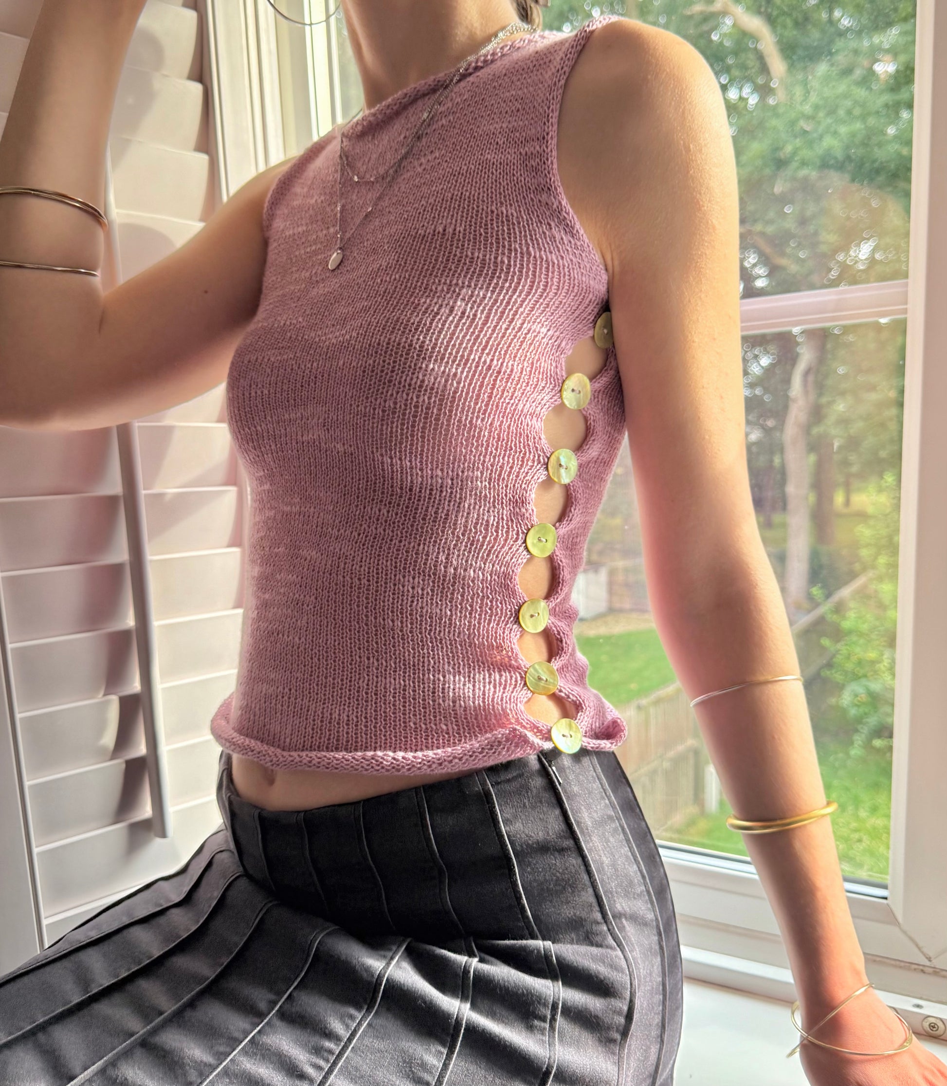 Lilac / dusky pink knitted vest with green iridescent mother of pearl button open side 🧚🏻