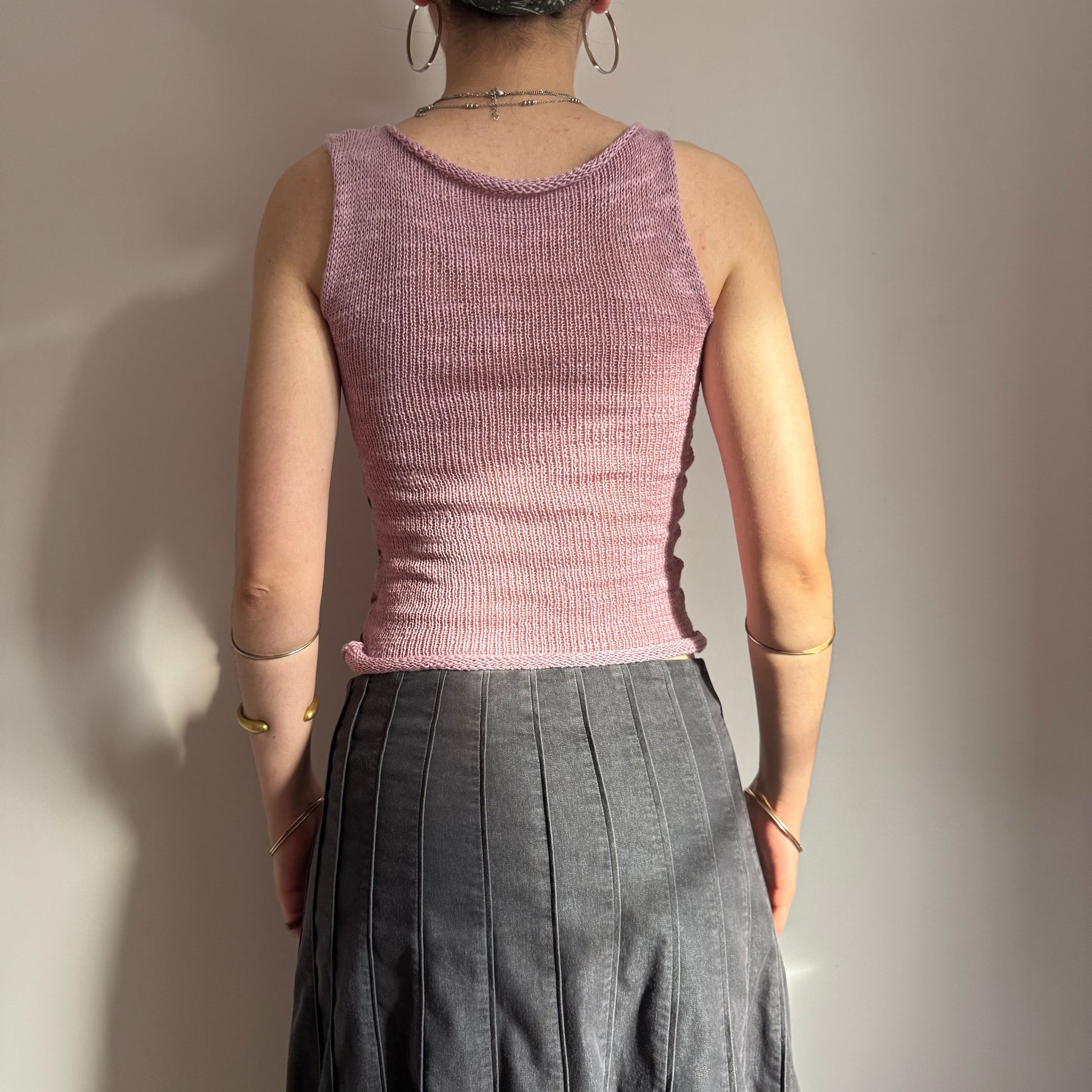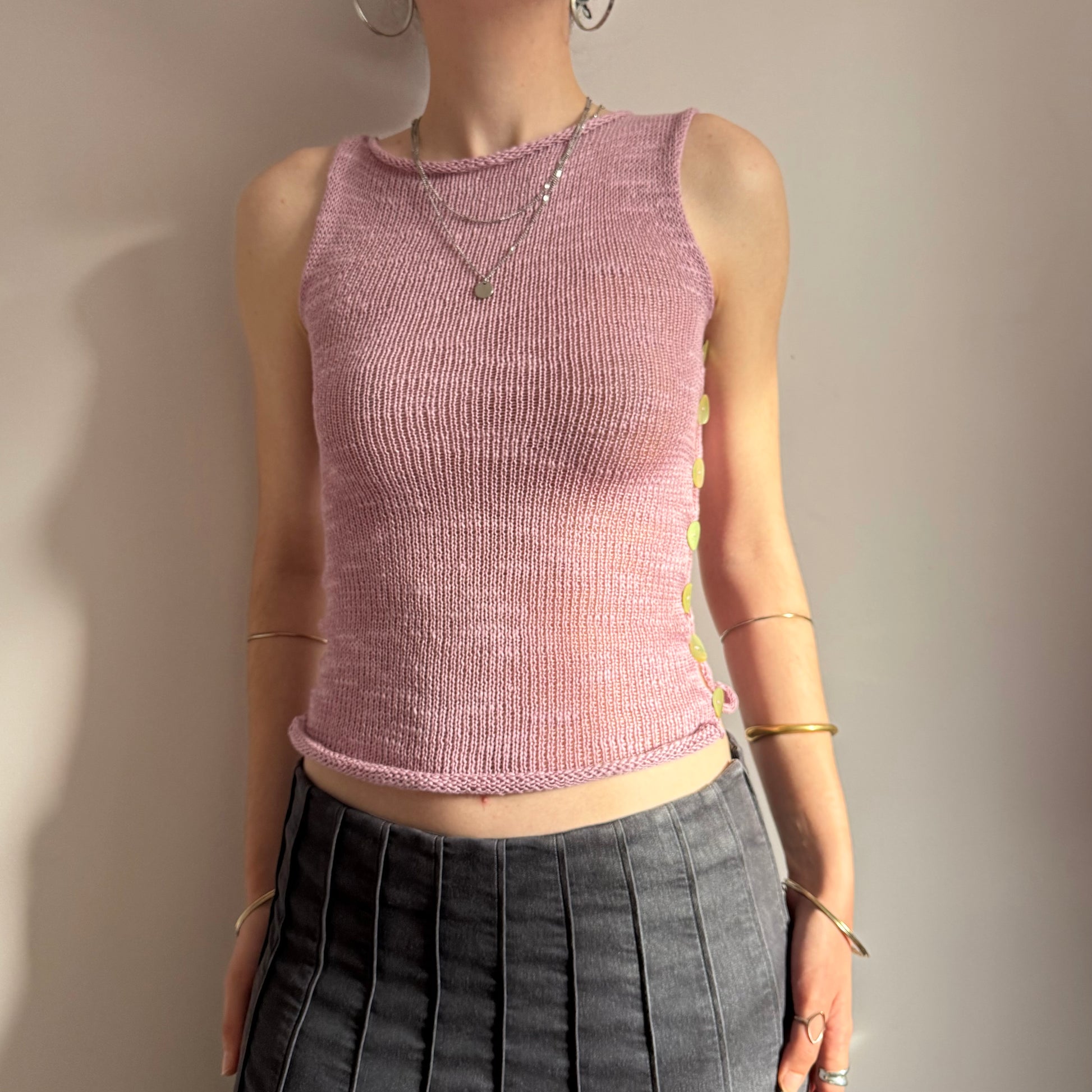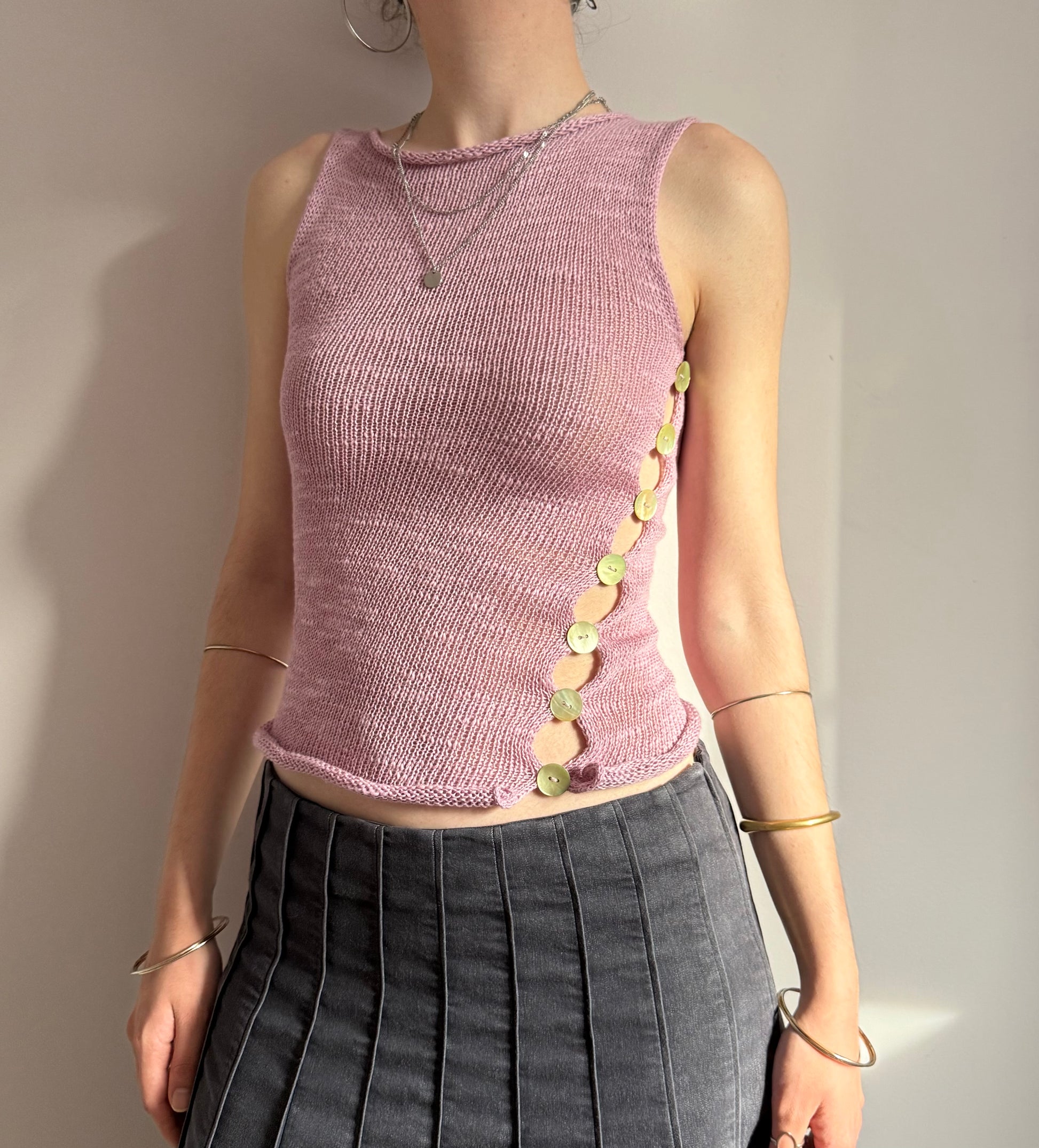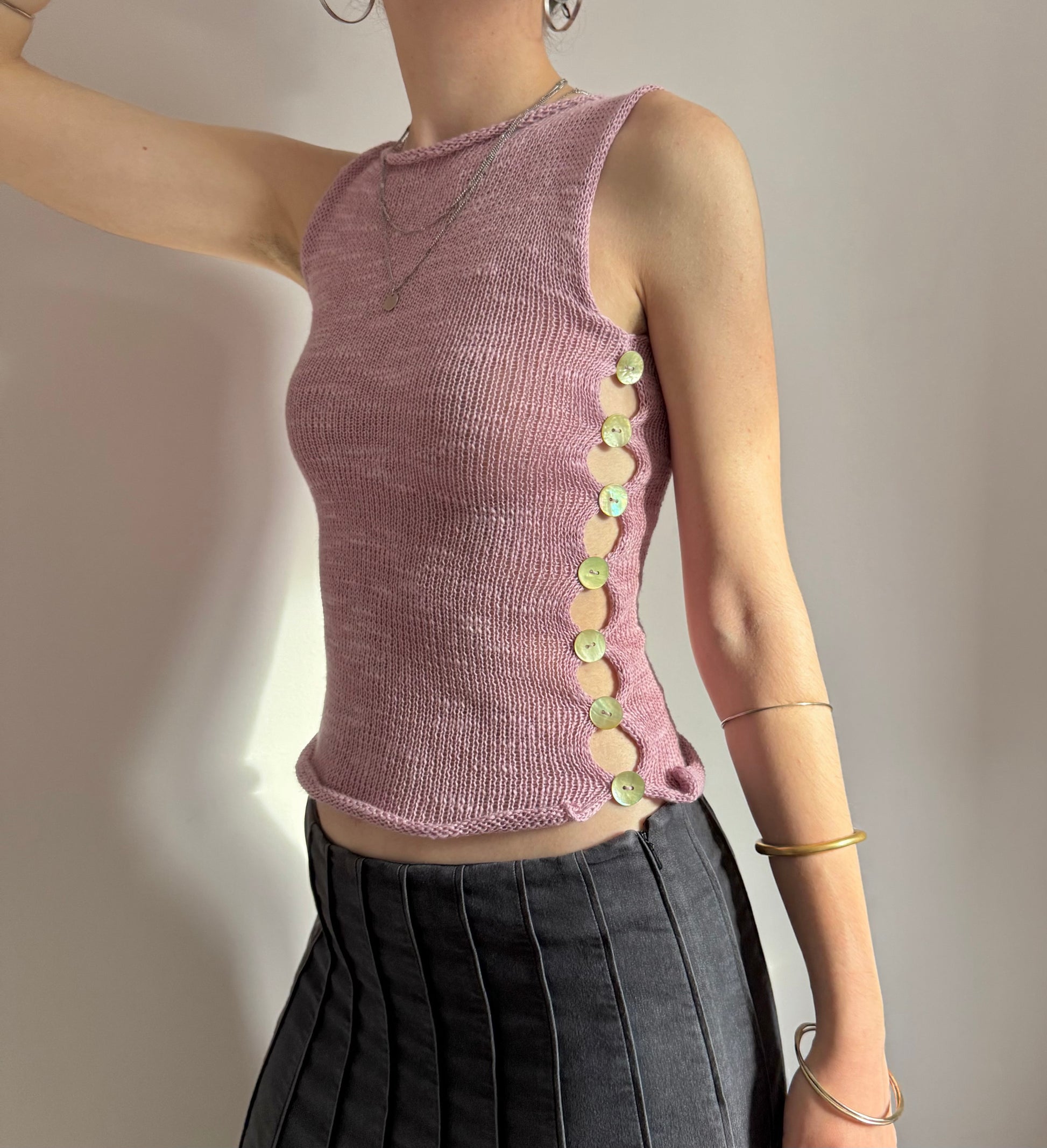 Lilac / dusky pink knitted vest with green iridescent mother of pearl button open side 🧚🏻