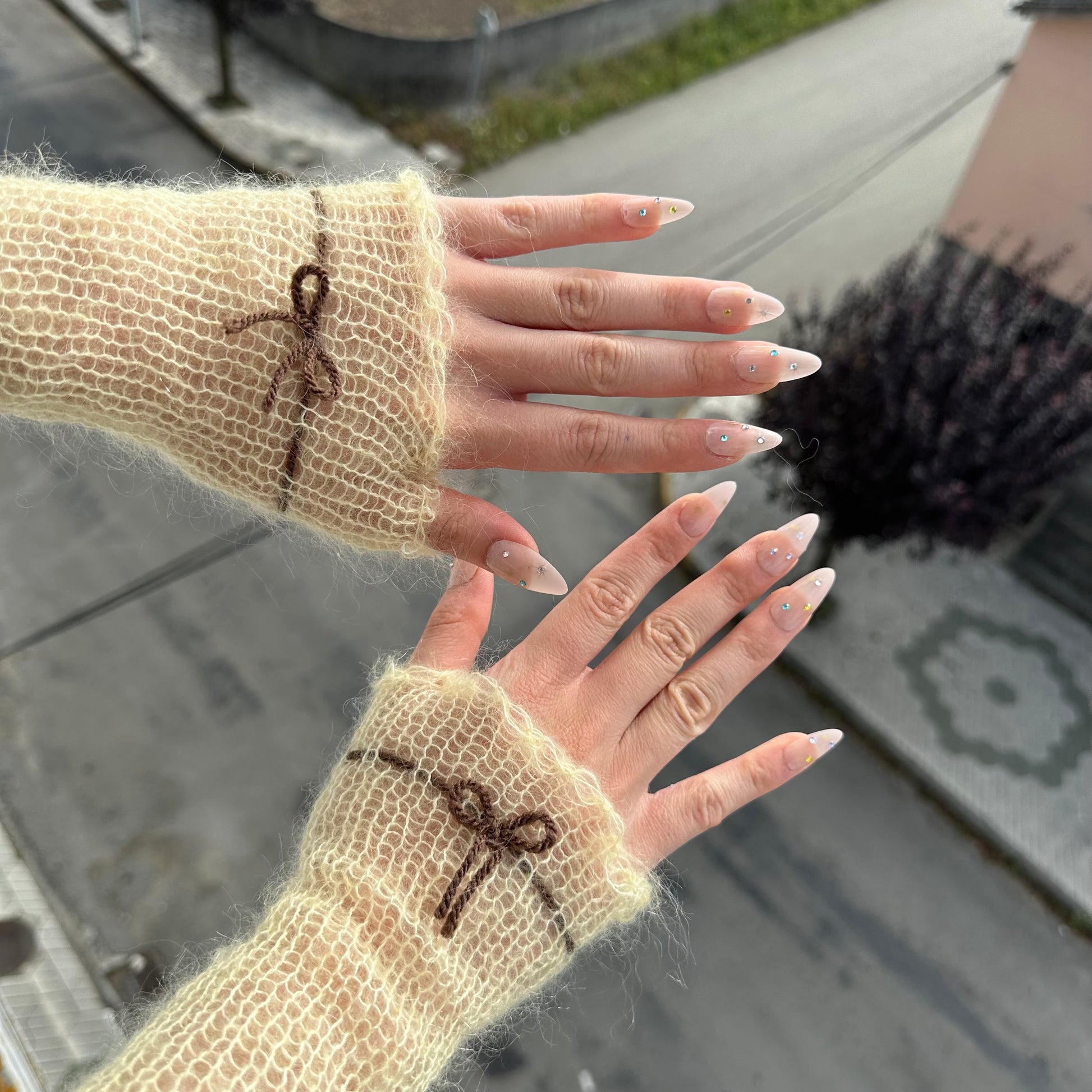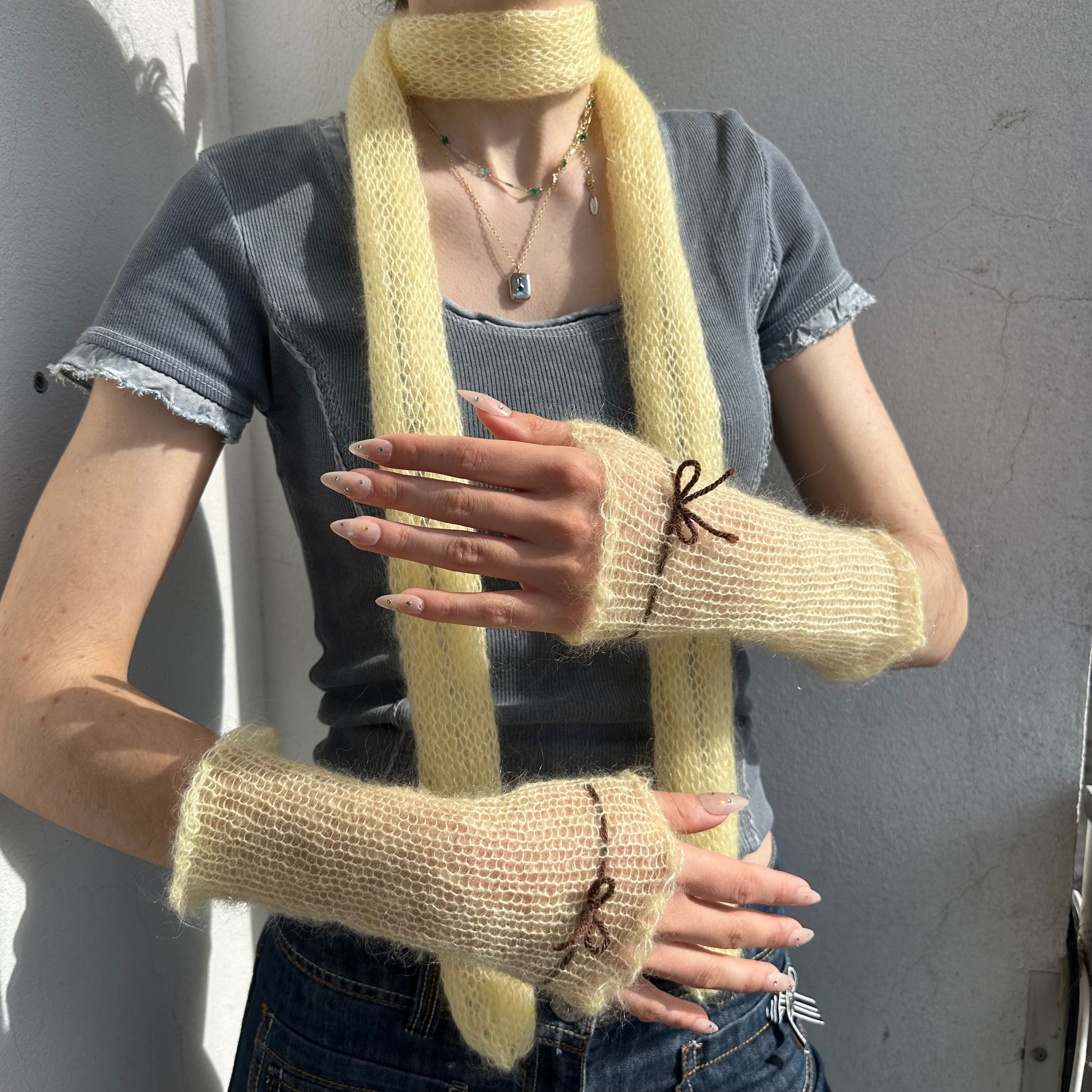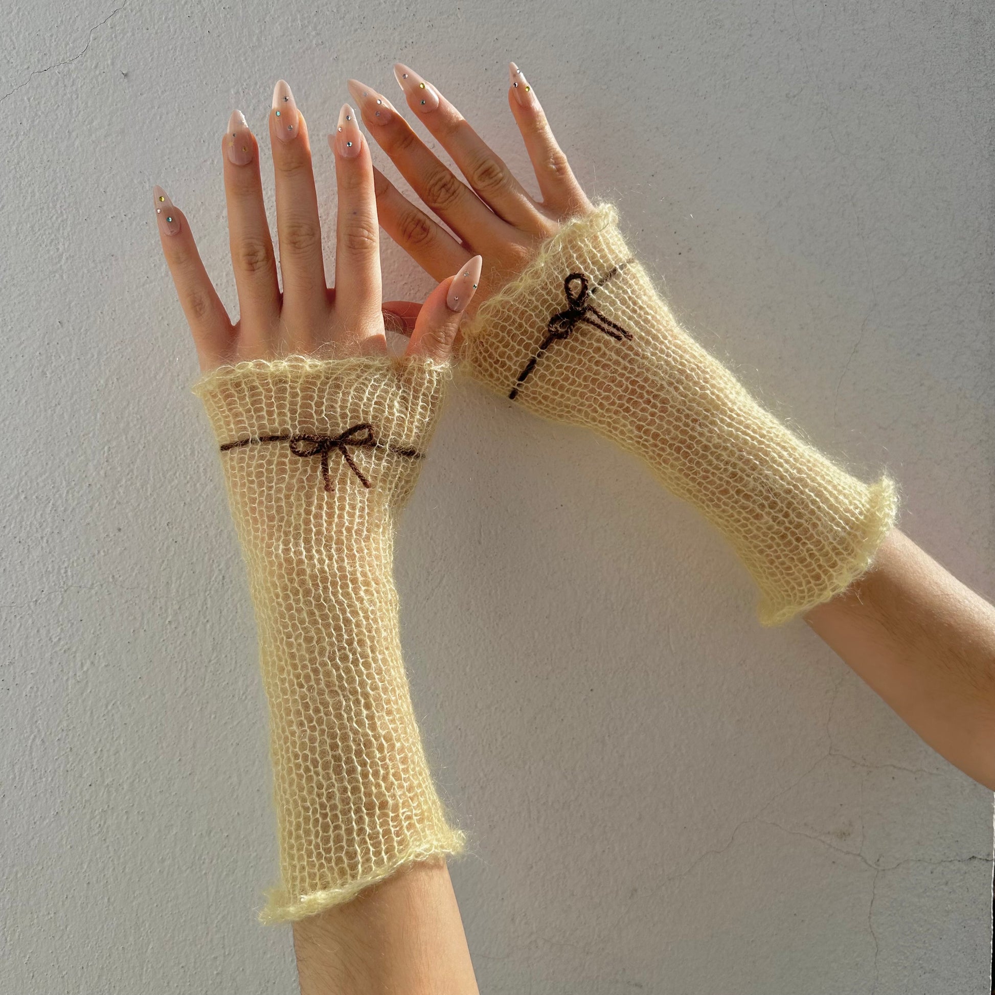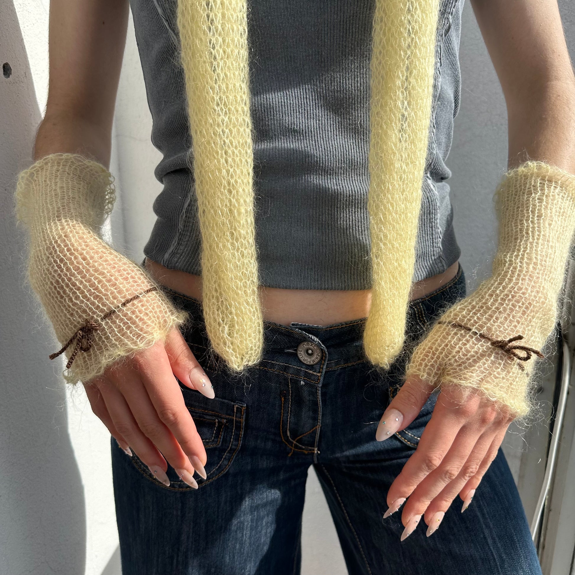The cutest pastel yellow mohair hand warmers with a brown bow 🎀