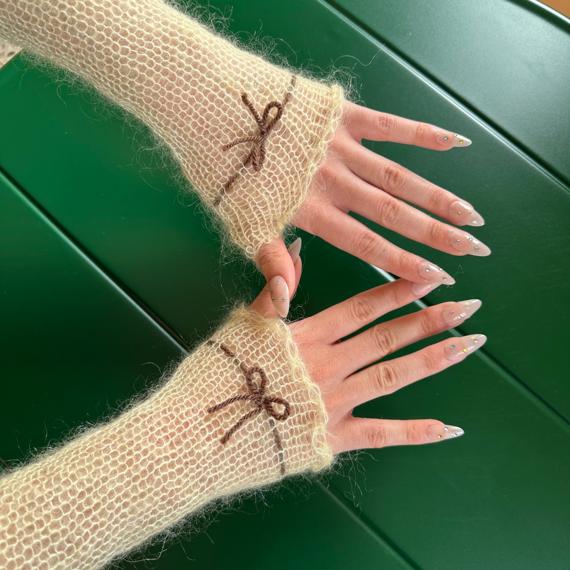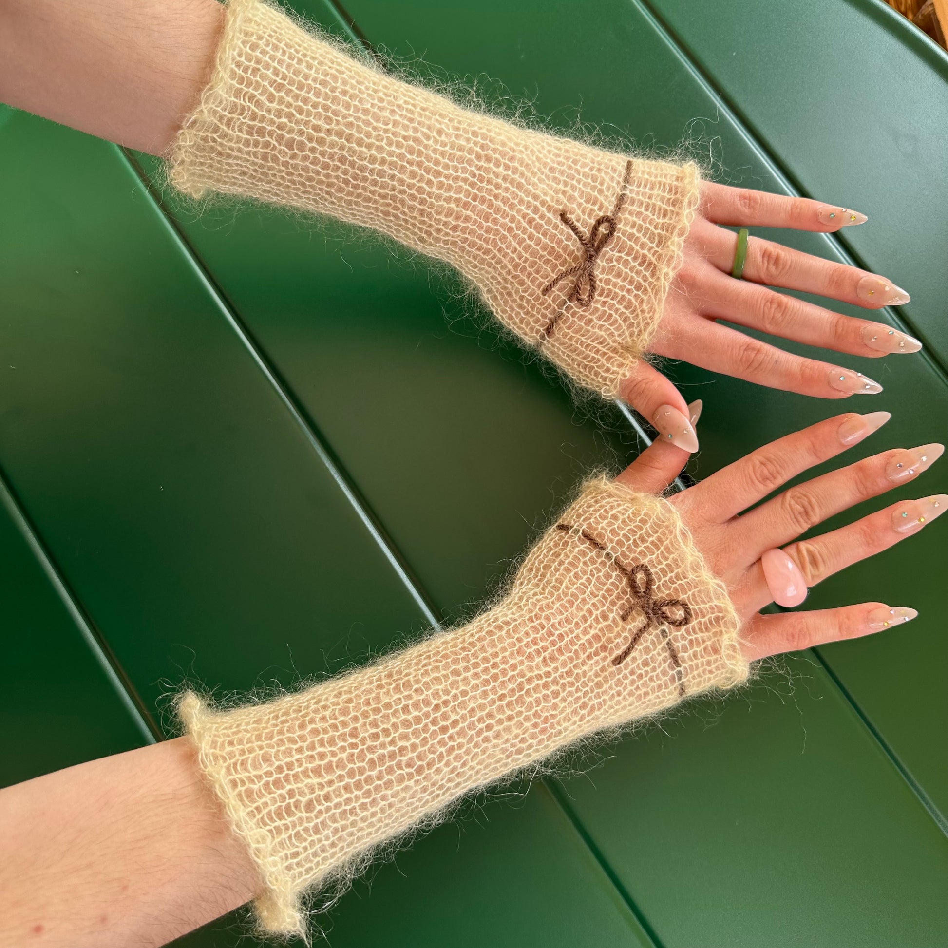 Handmade knitted mohair bow gloves in light yellow and brown - with thumb hole