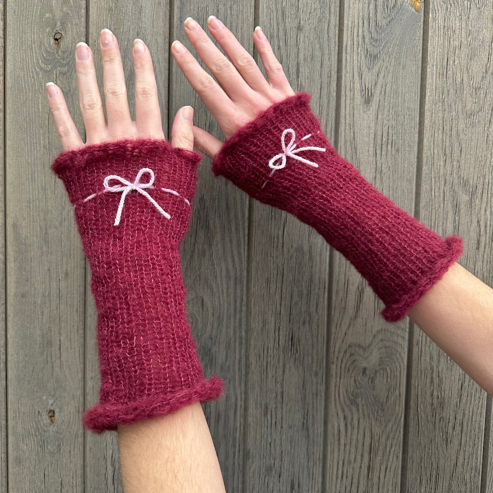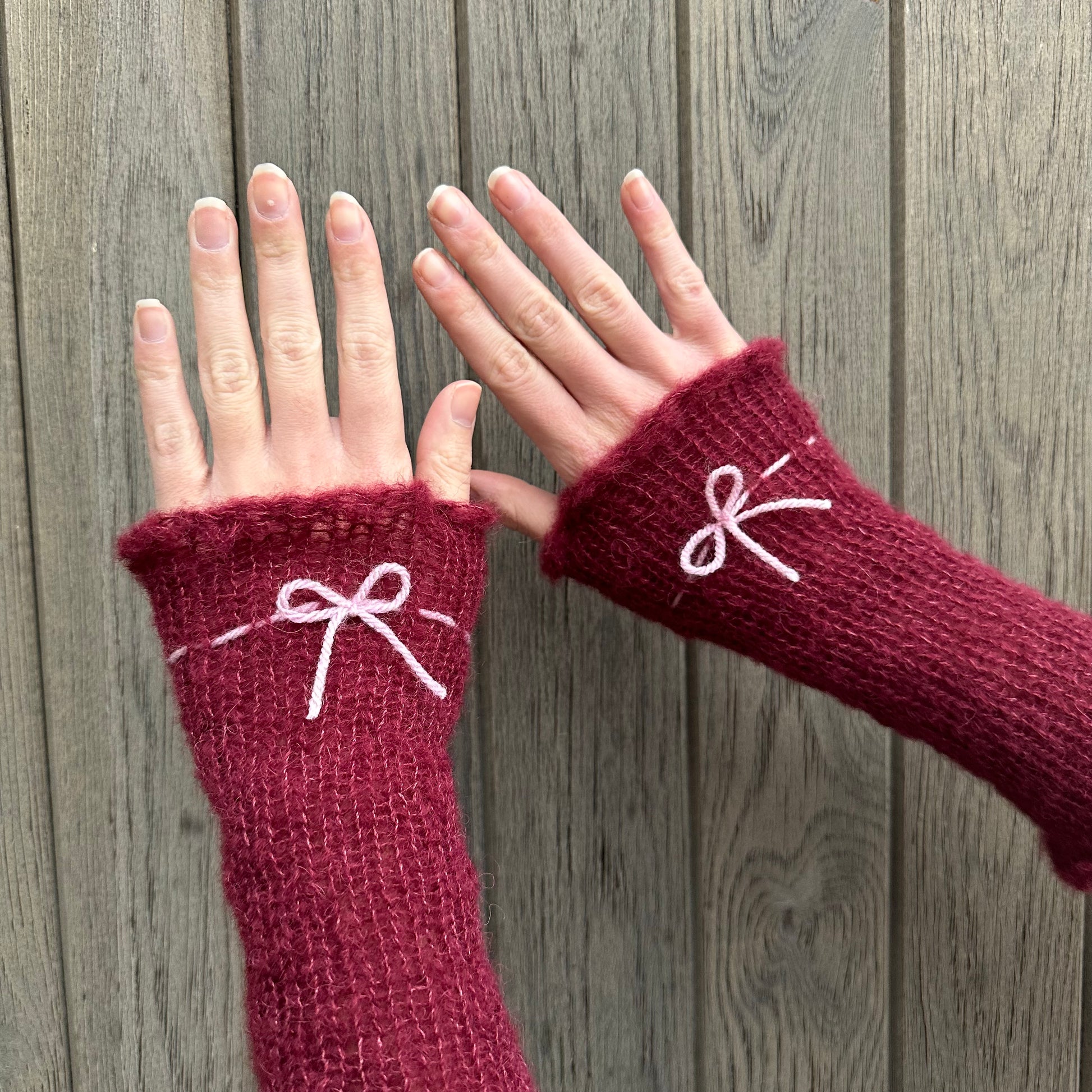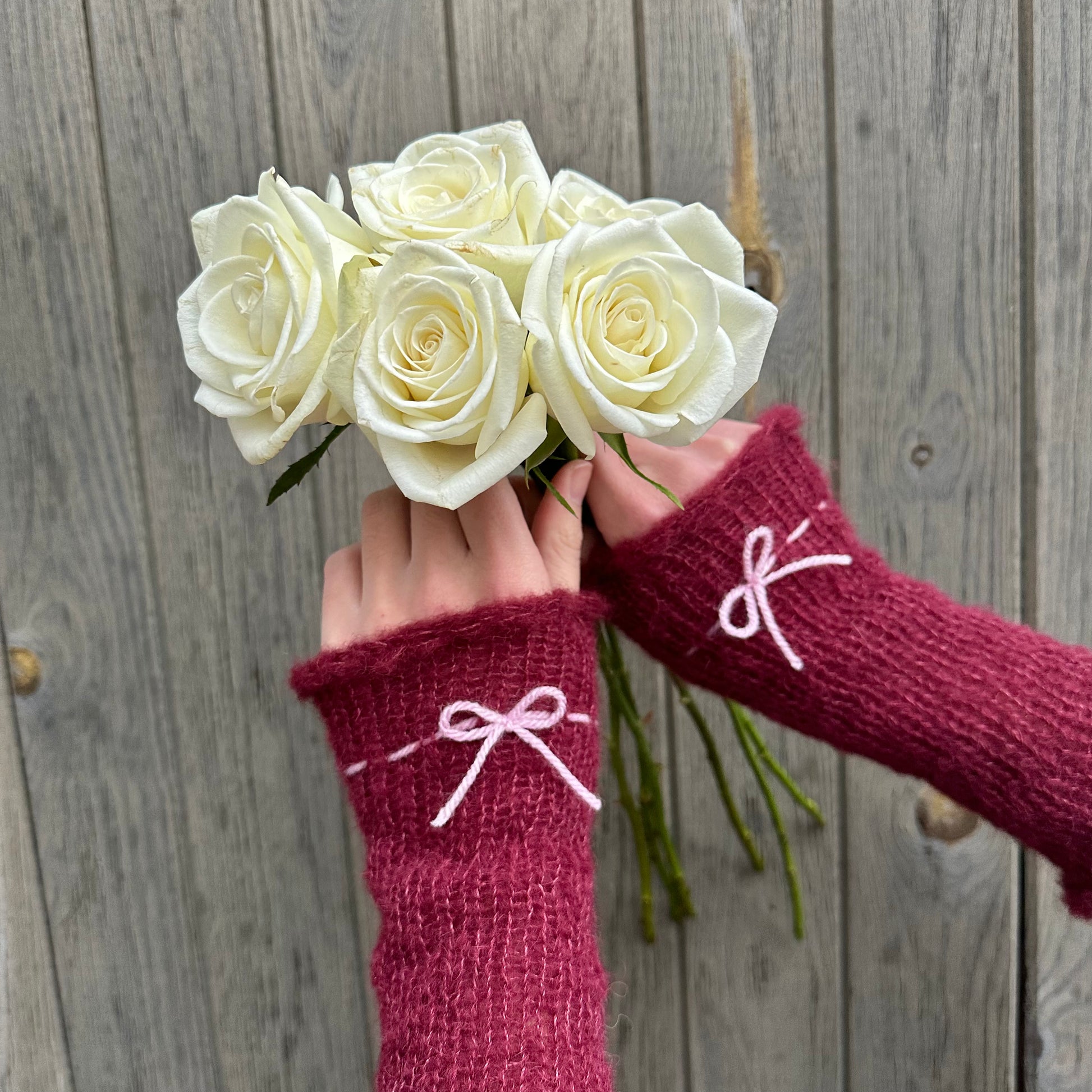 Handmade knitted mohair bow gloves in burgundy and baby pink - with thumb hole