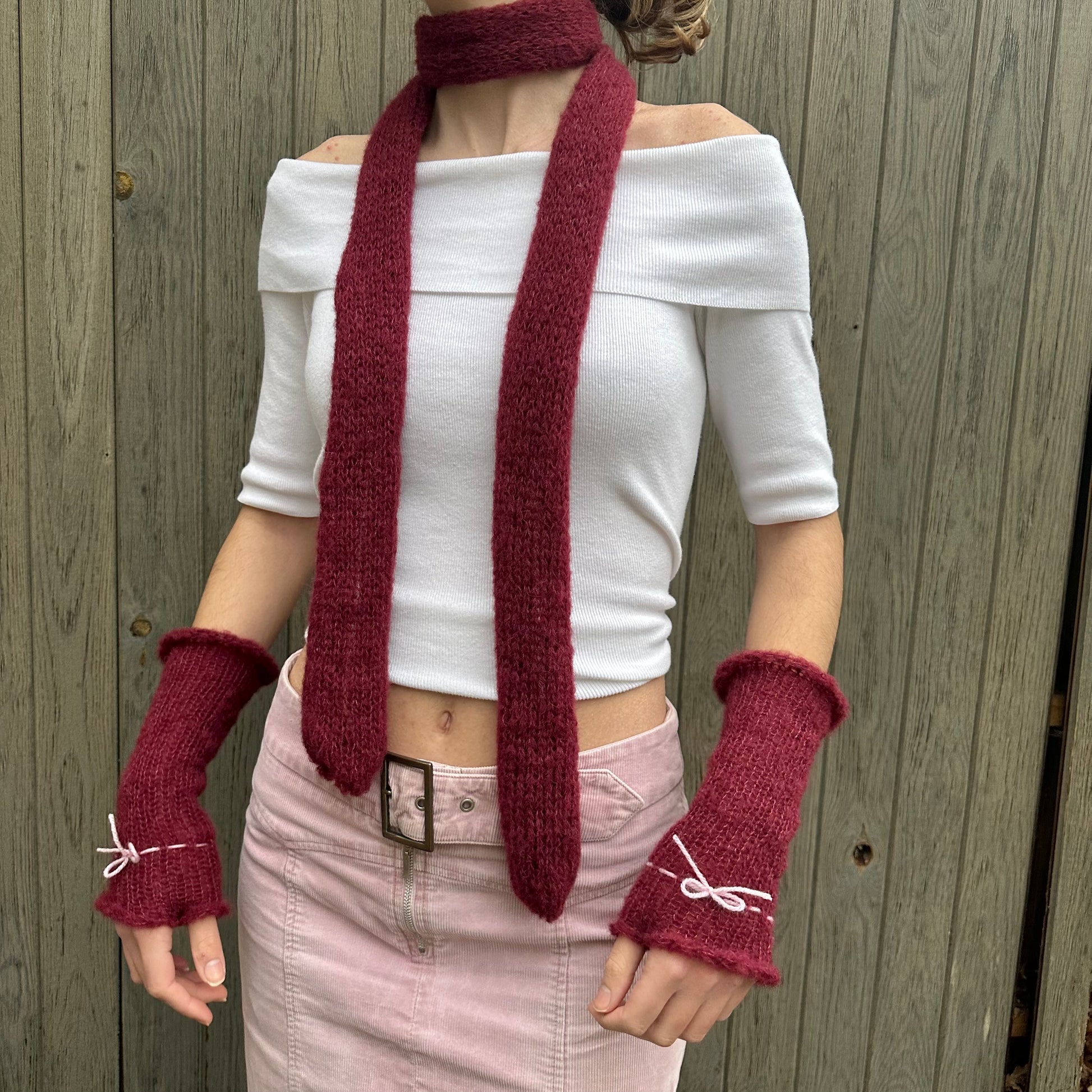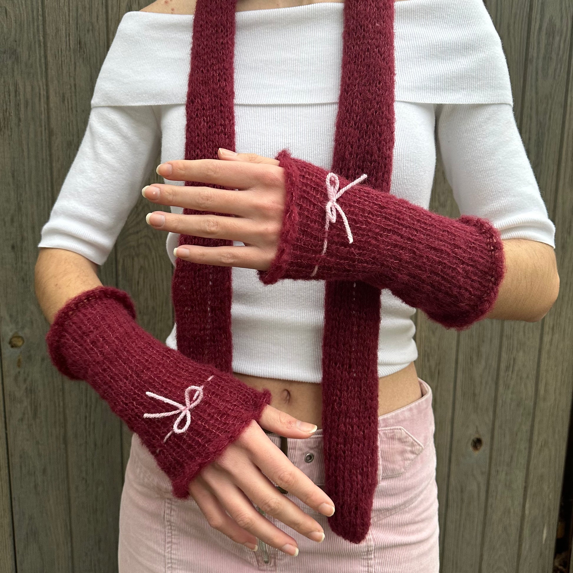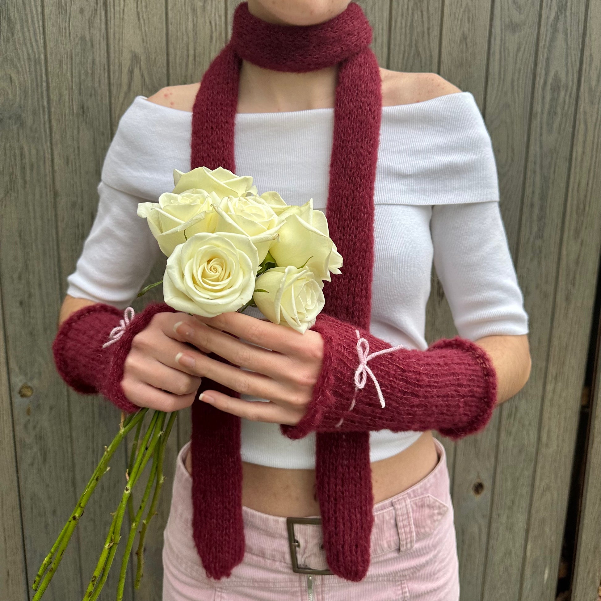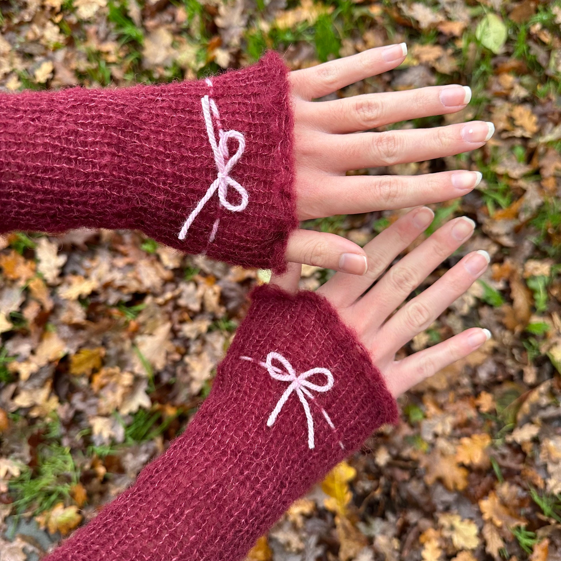 The cutest burgundy mohair hand warmers with a baby pink bow 🎀