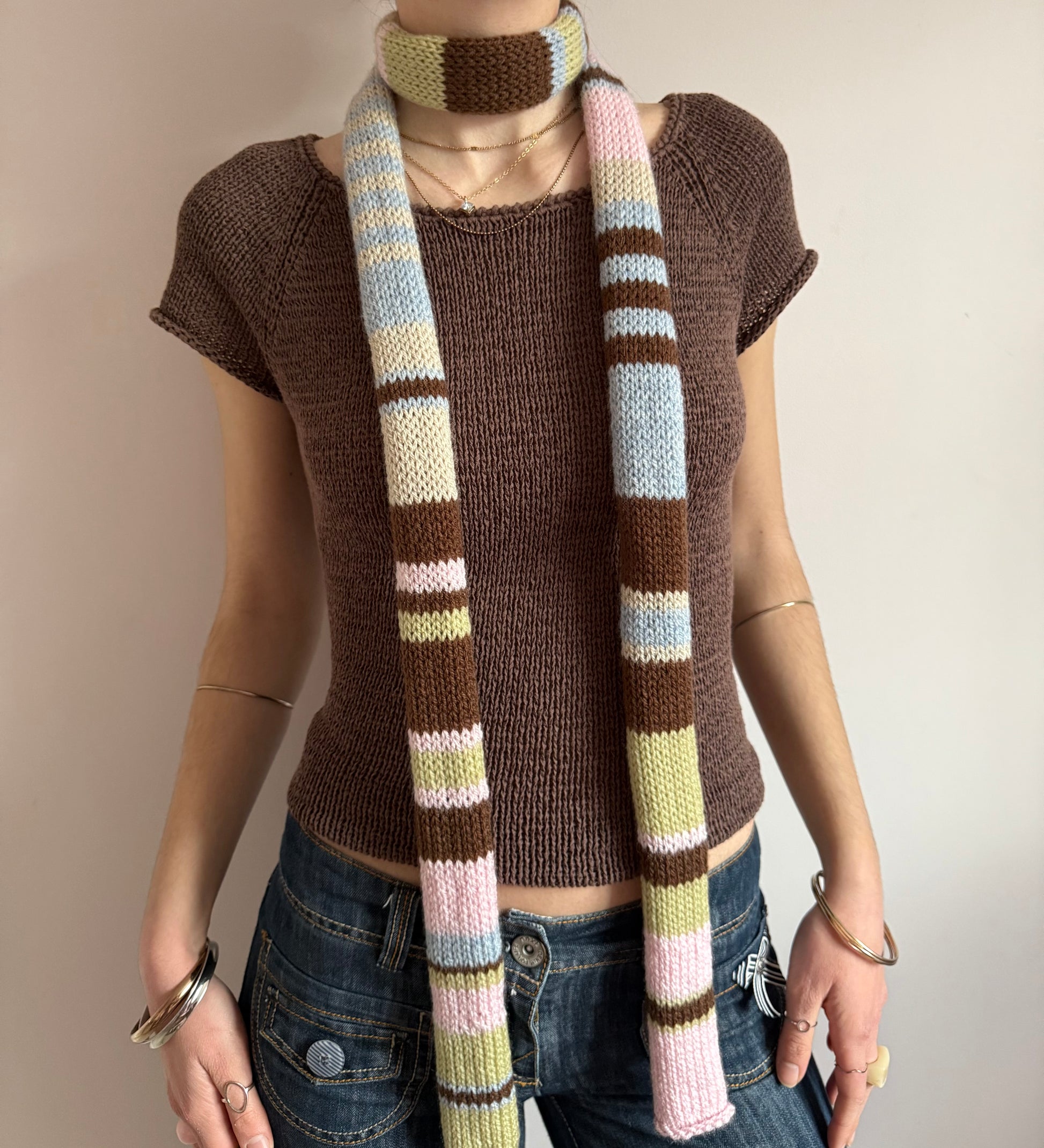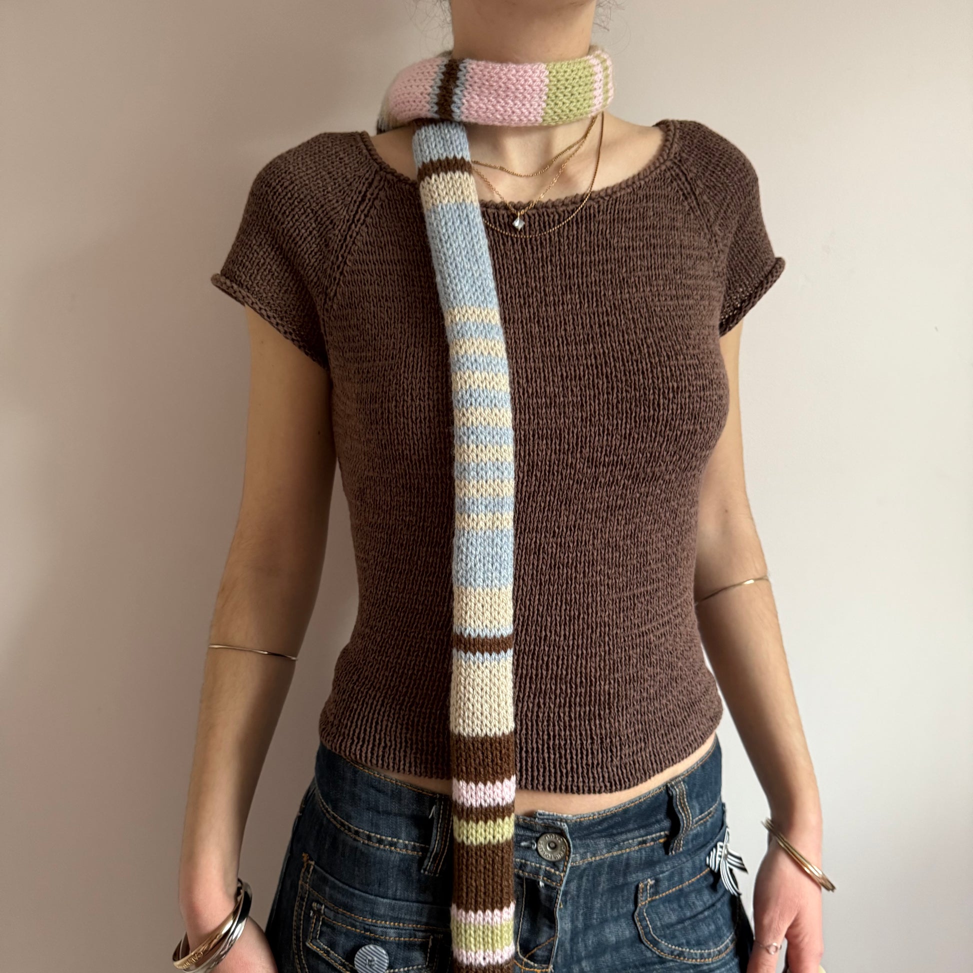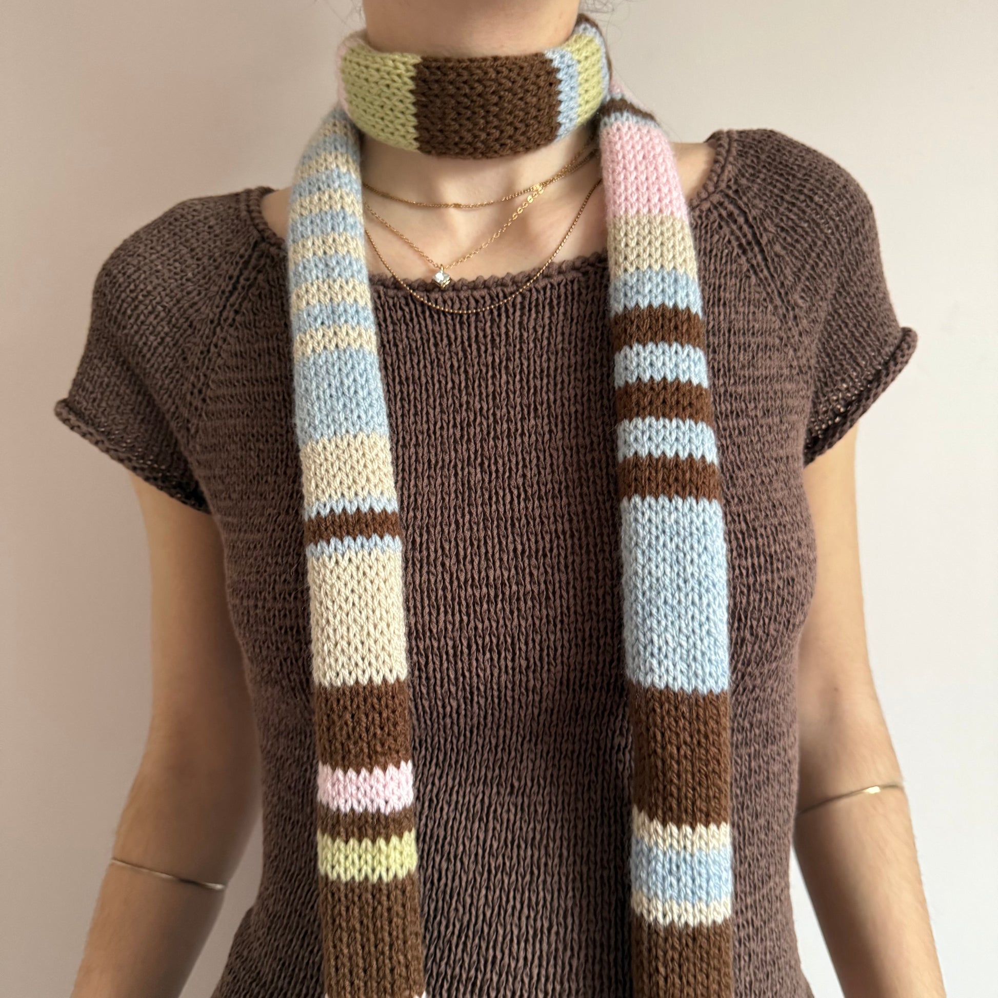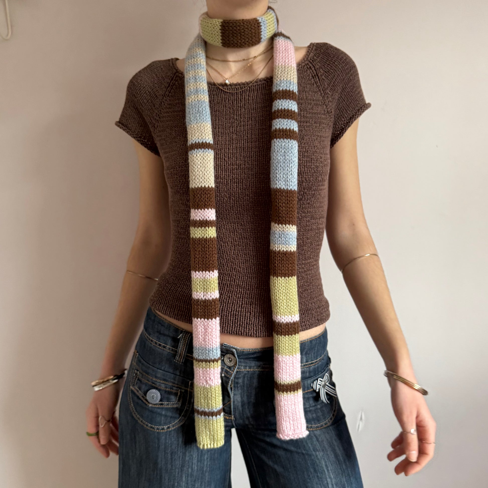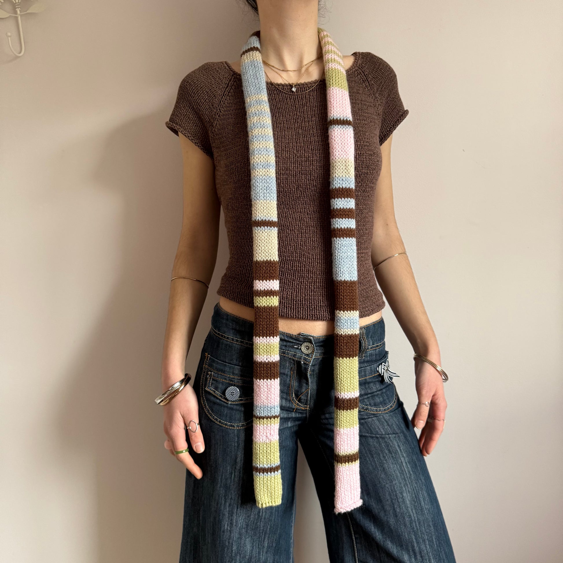 The cutest vintage early 00s / y2k inspired knitted skinny scarf in gorgeous pastel shades - features light blue, beige, green, brown & baby pink stripes! 🌟
