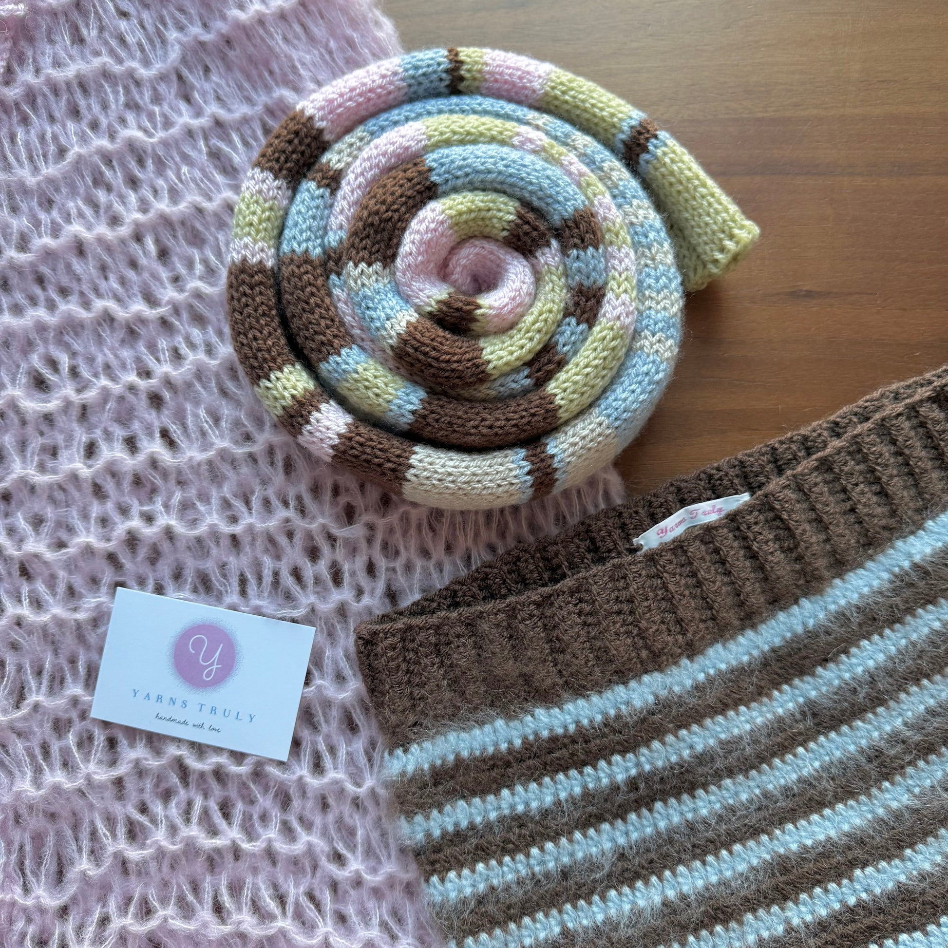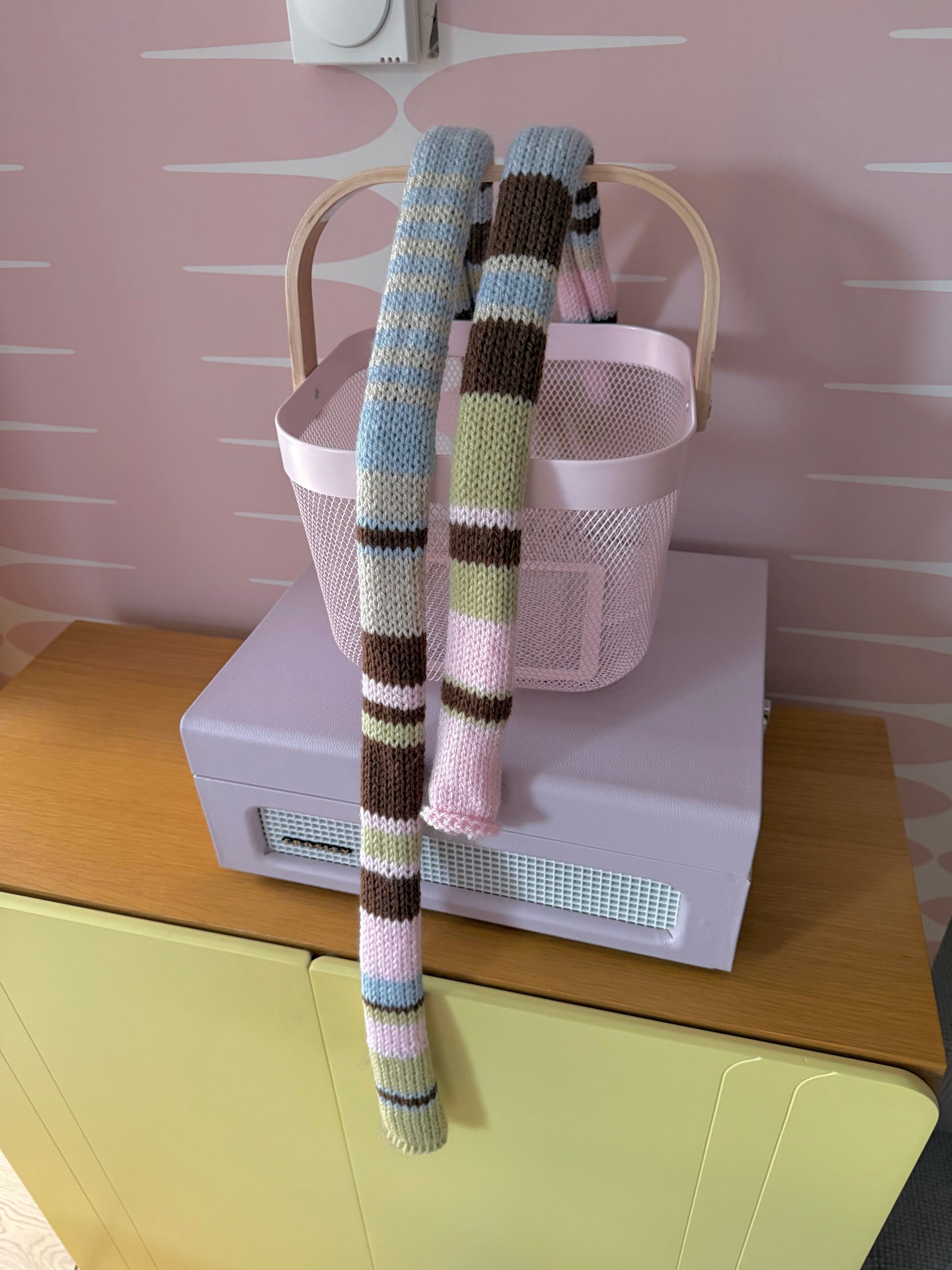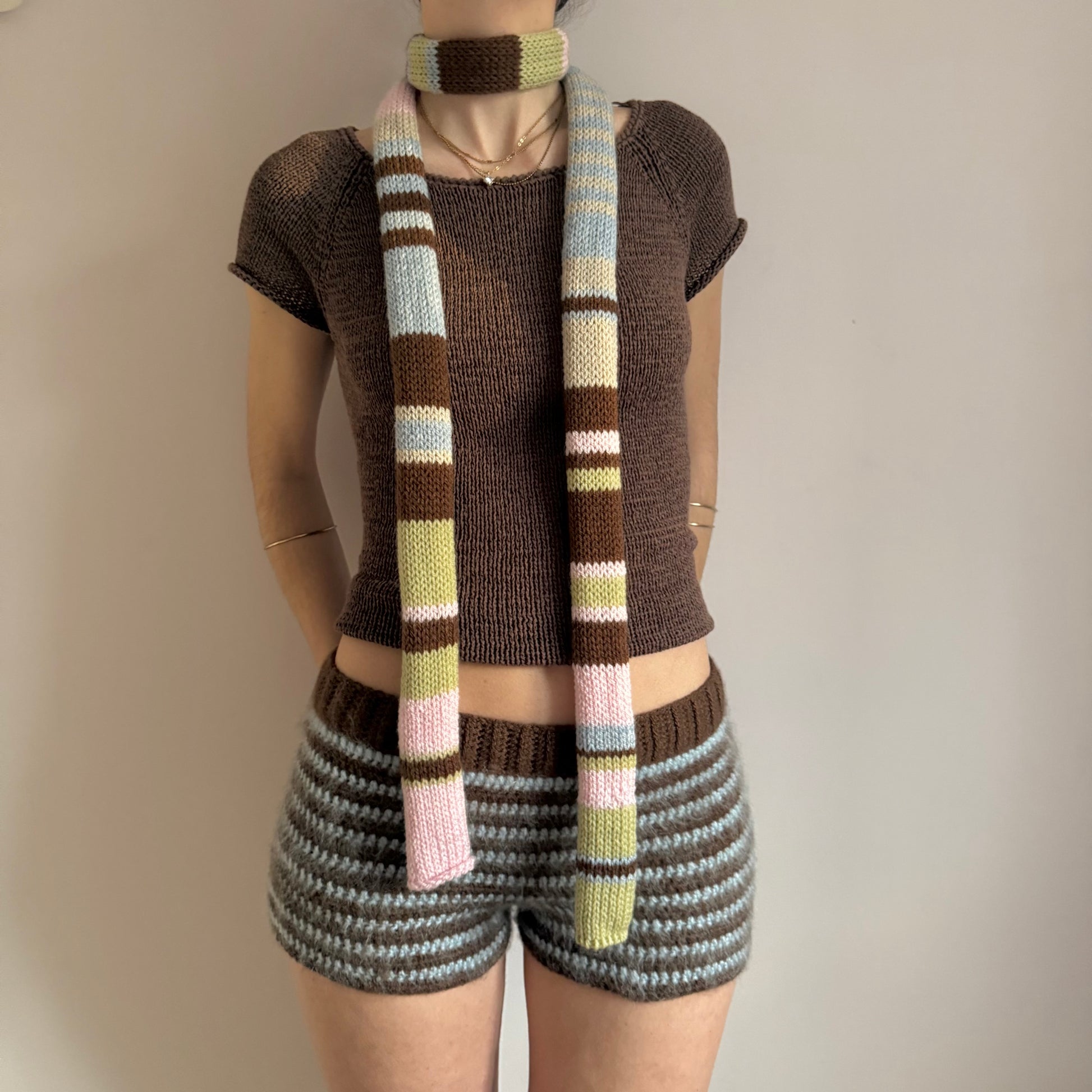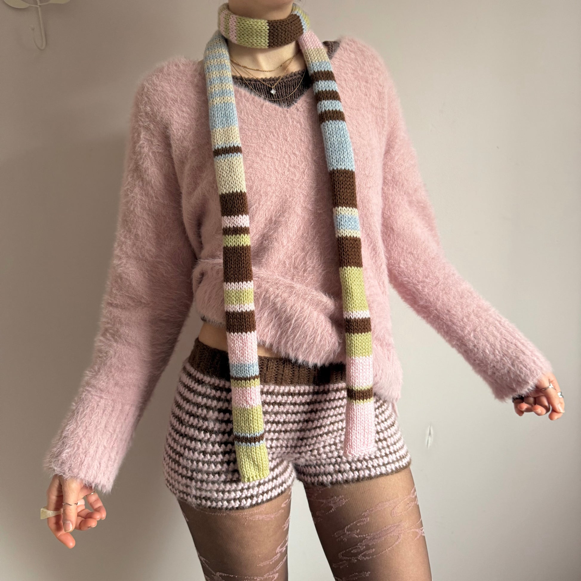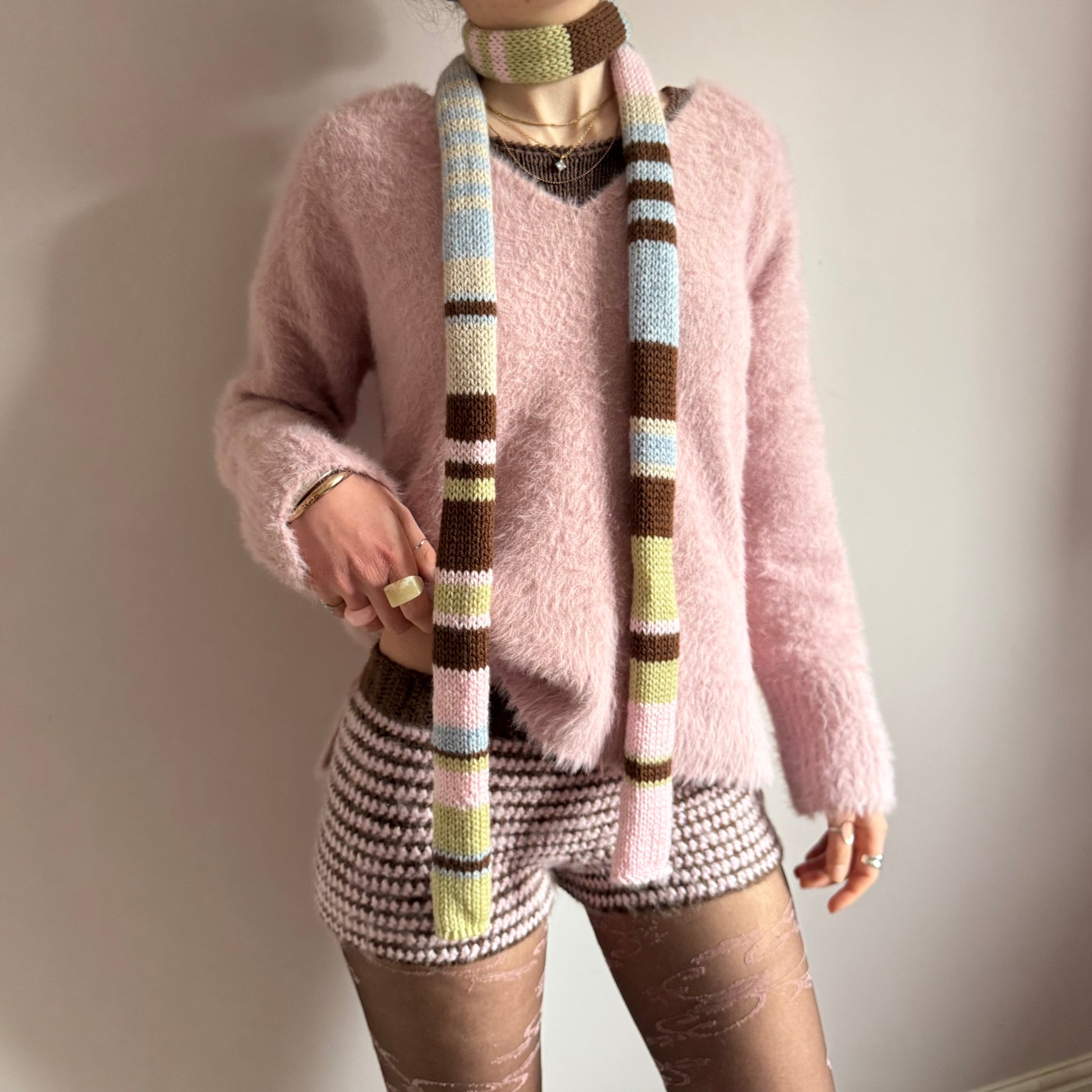 The cutest vintage early 00s / y2k inspired knitted skinny scarf in gorgeous pastel shades - features light blue, beige, green, brown & baby pink stripes! 🌟