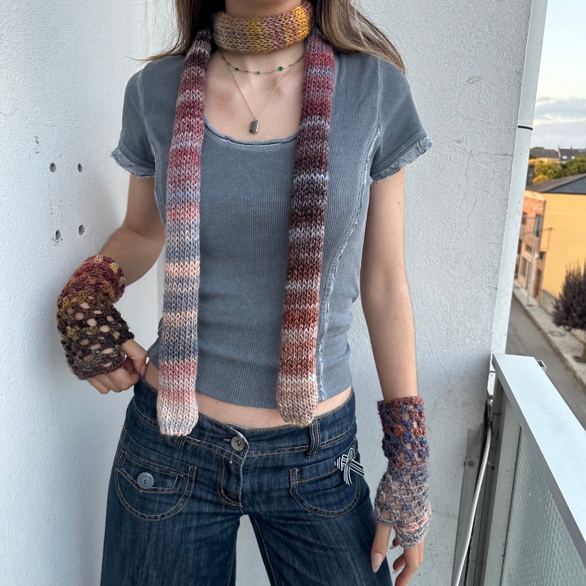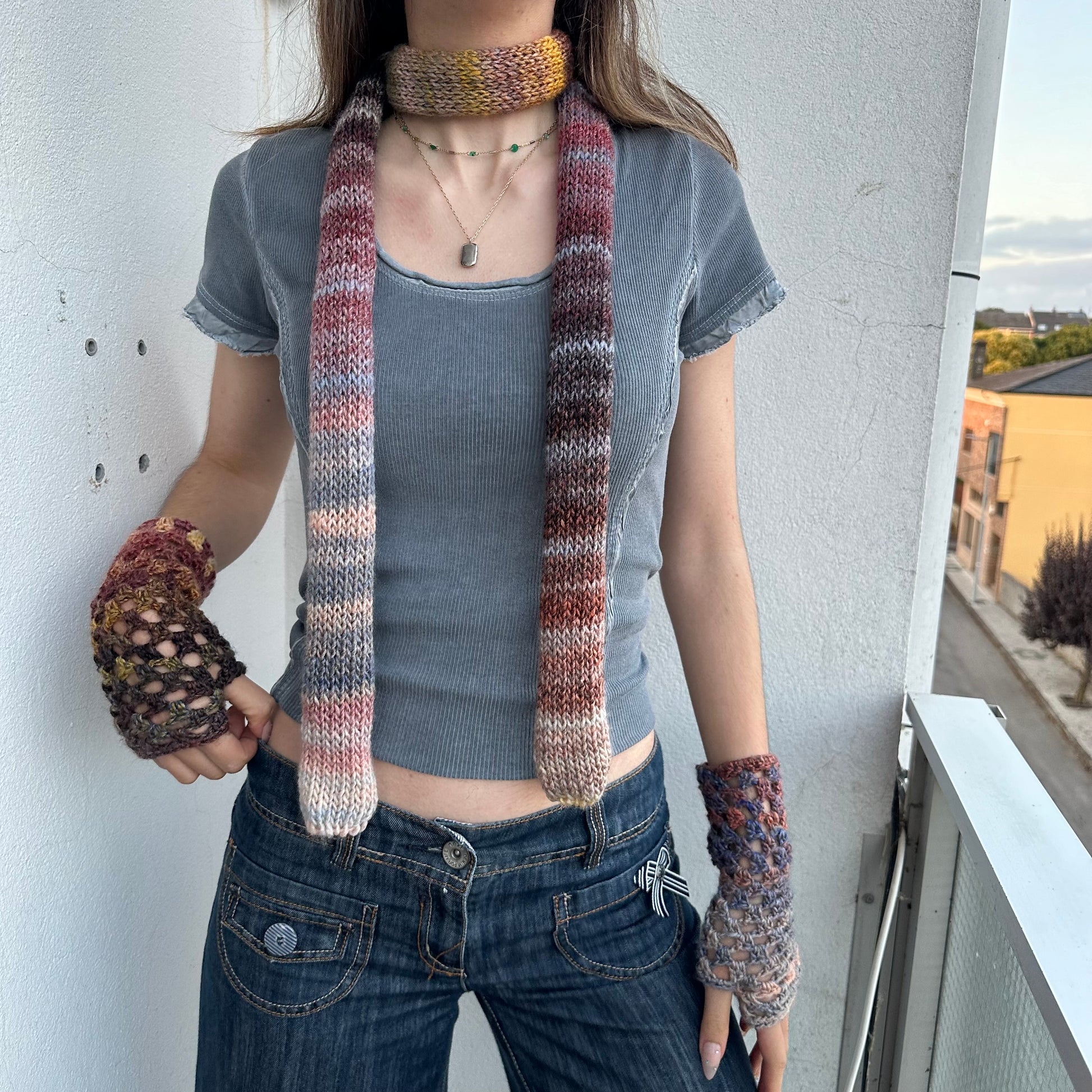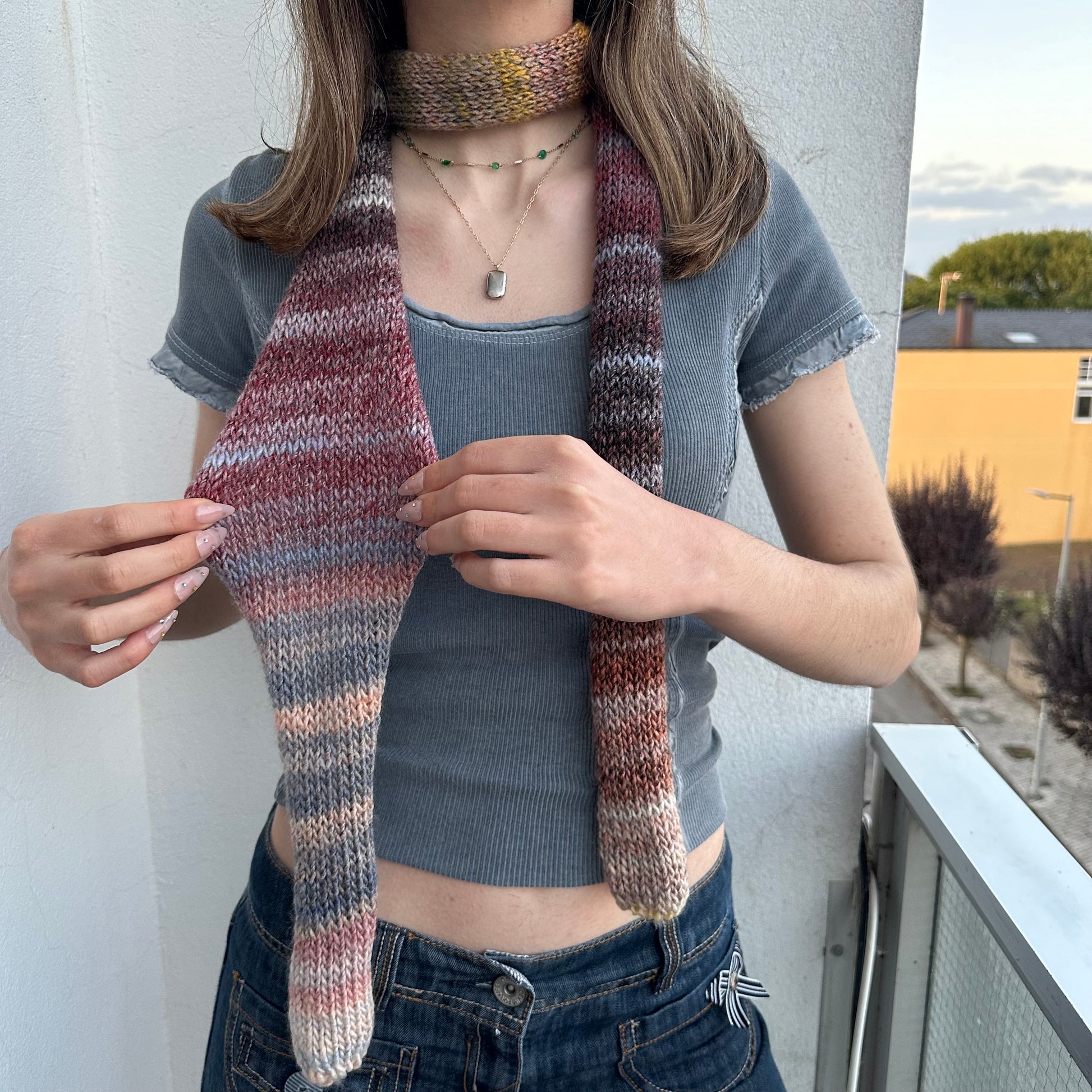 Aurora knit skinny scarf in the most gorgeous burgundy, brown, cream, blue and mustard yellow ombré colourway - the perfect addition to your outfit. Great for all year round! 🌅⭐️