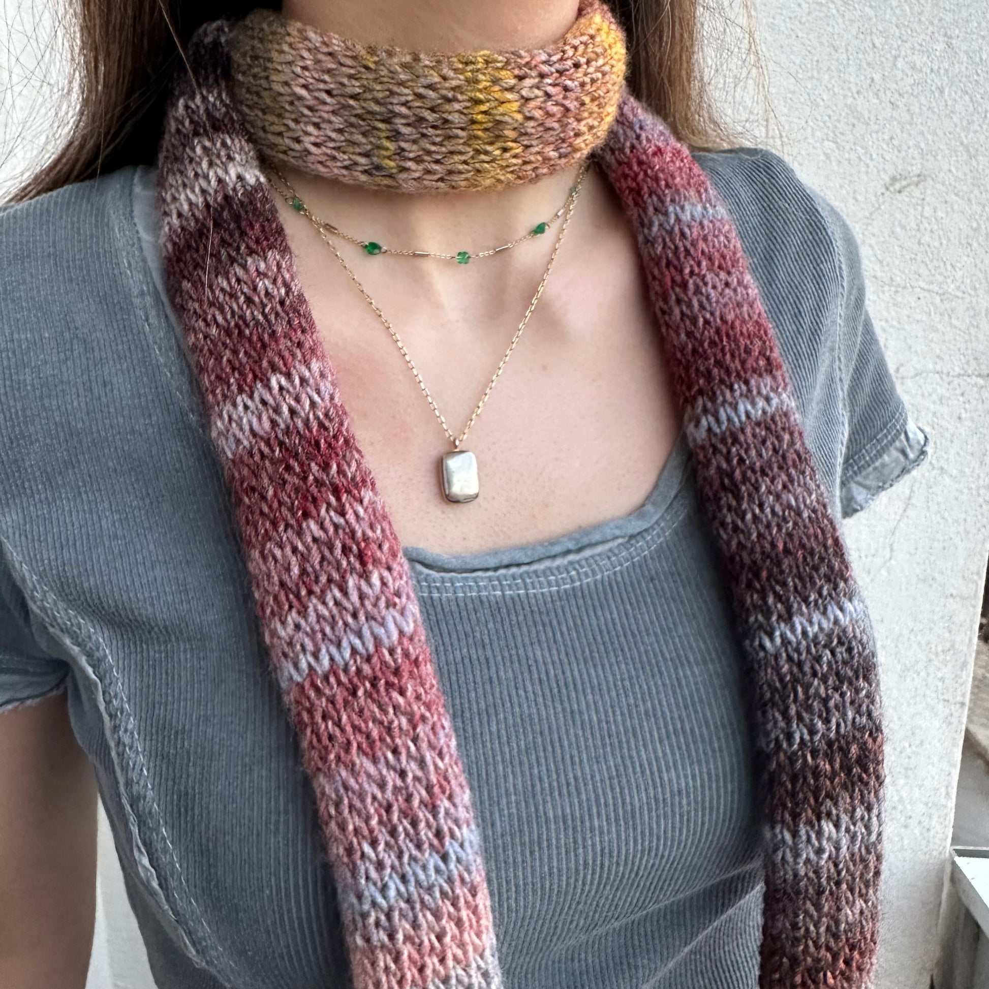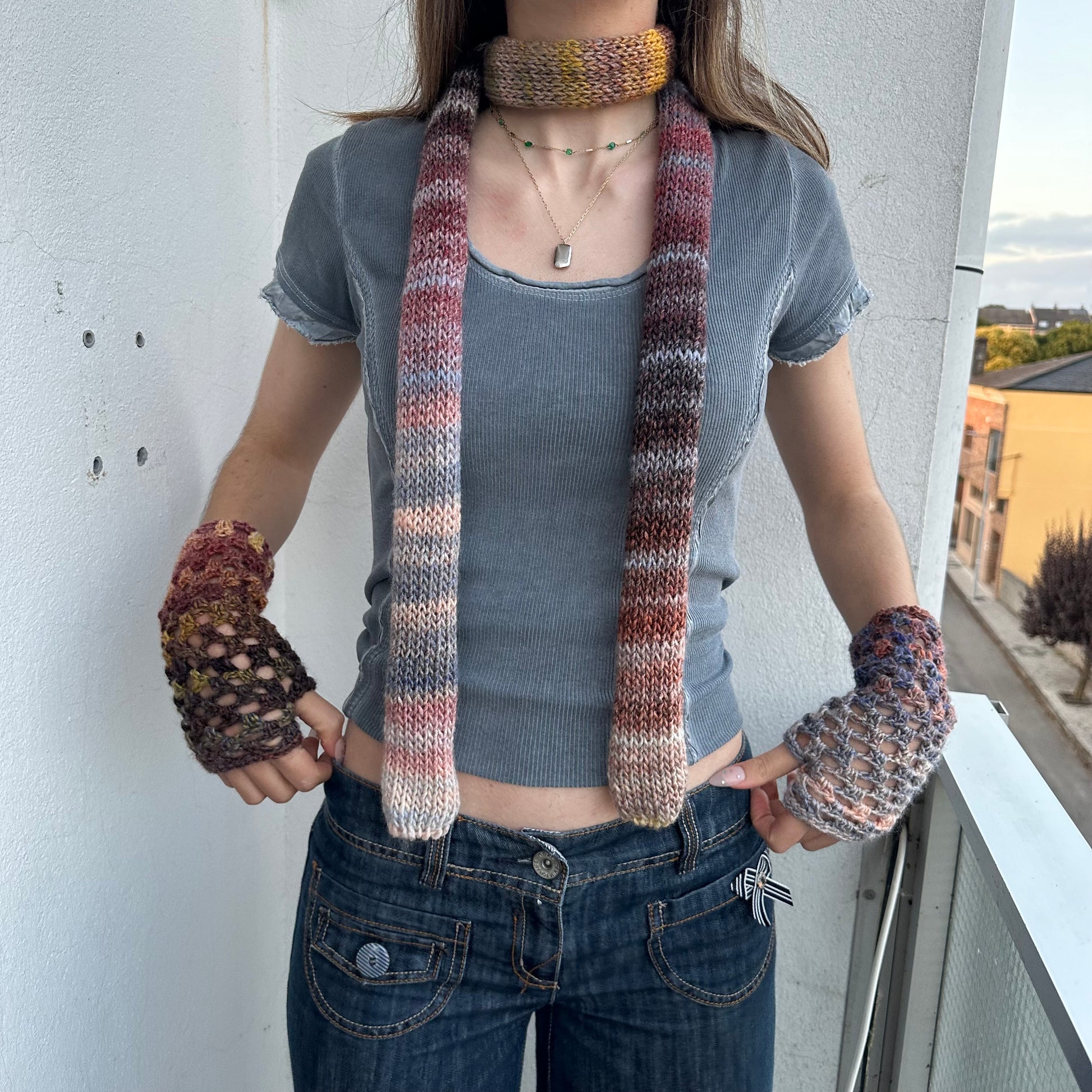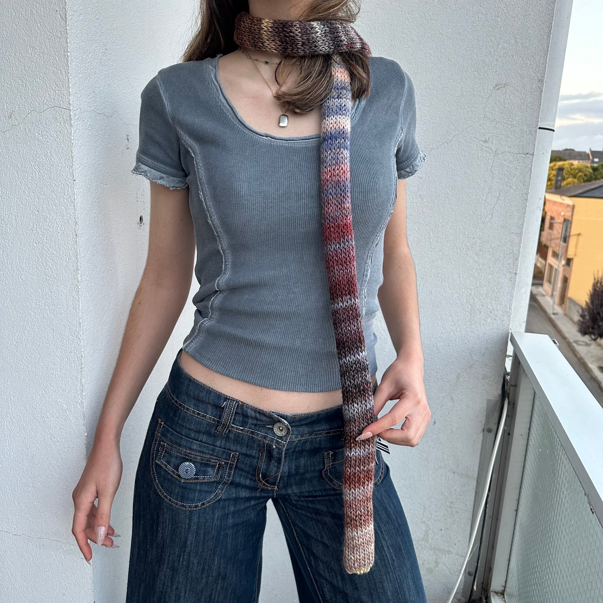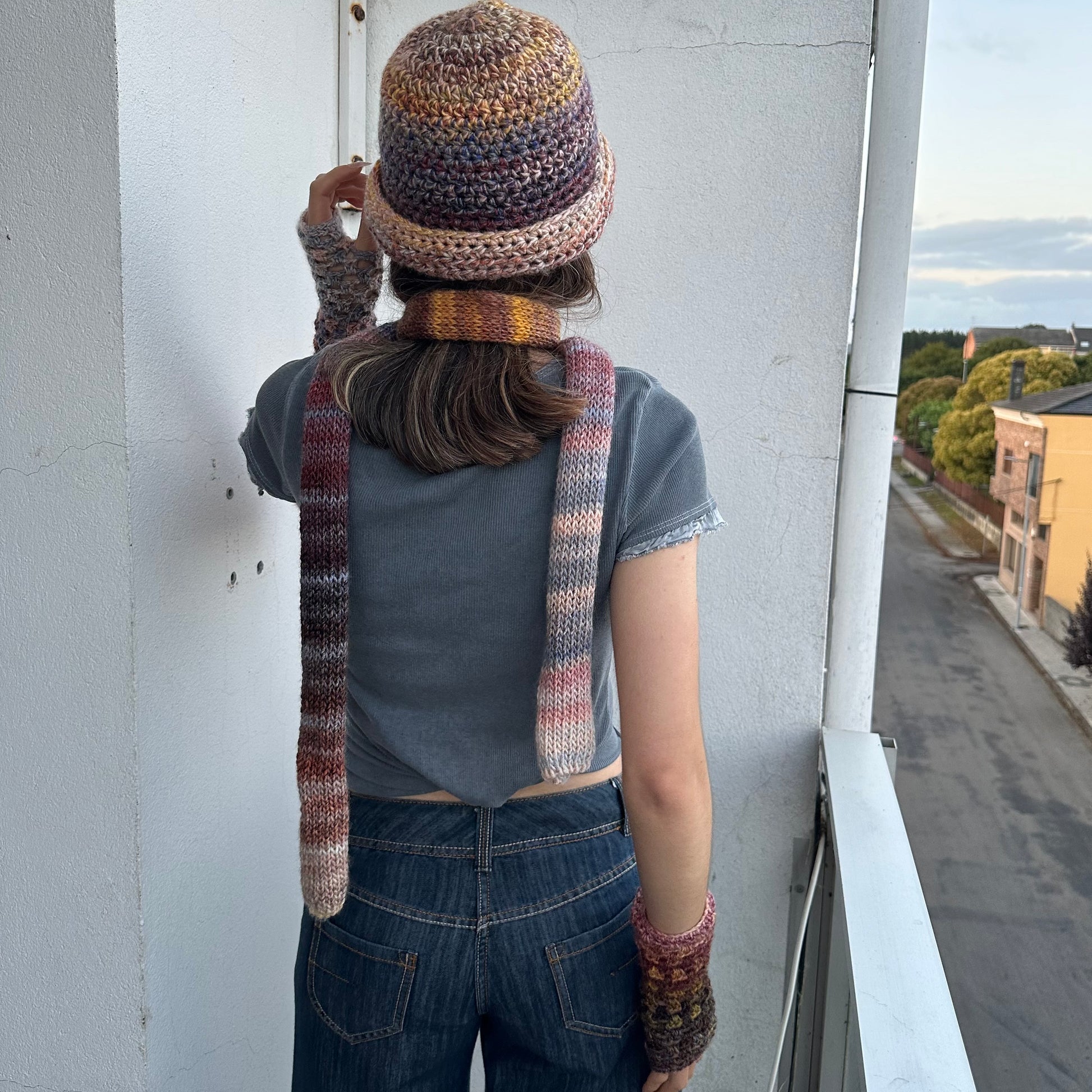 Aurora knit skinny scarf in the most gorgeous burgundy, brown, cream, blue and mustard yellow ombré colourway - the perfect addition to your outfit. Great for all year round! 🌅⭐️