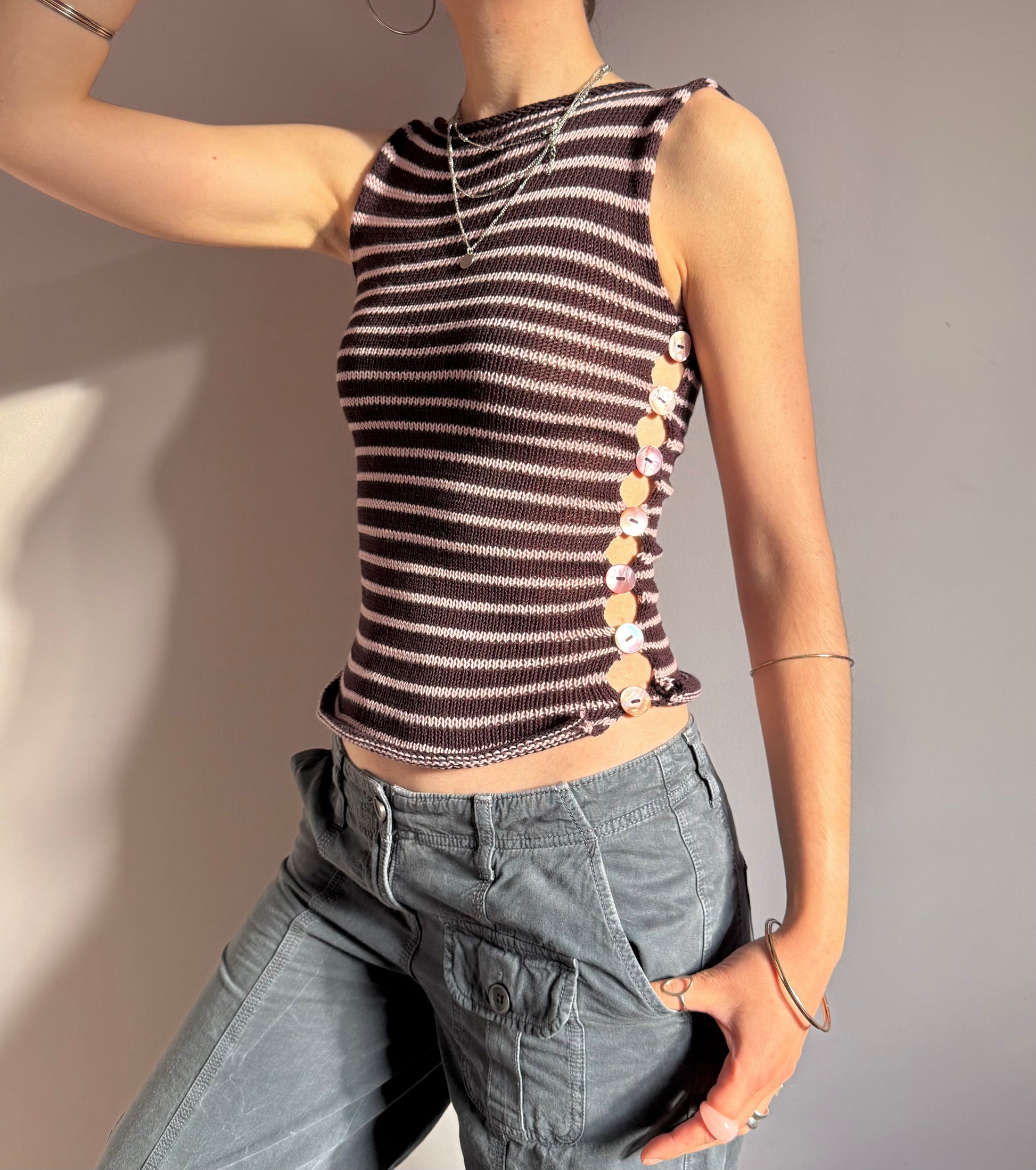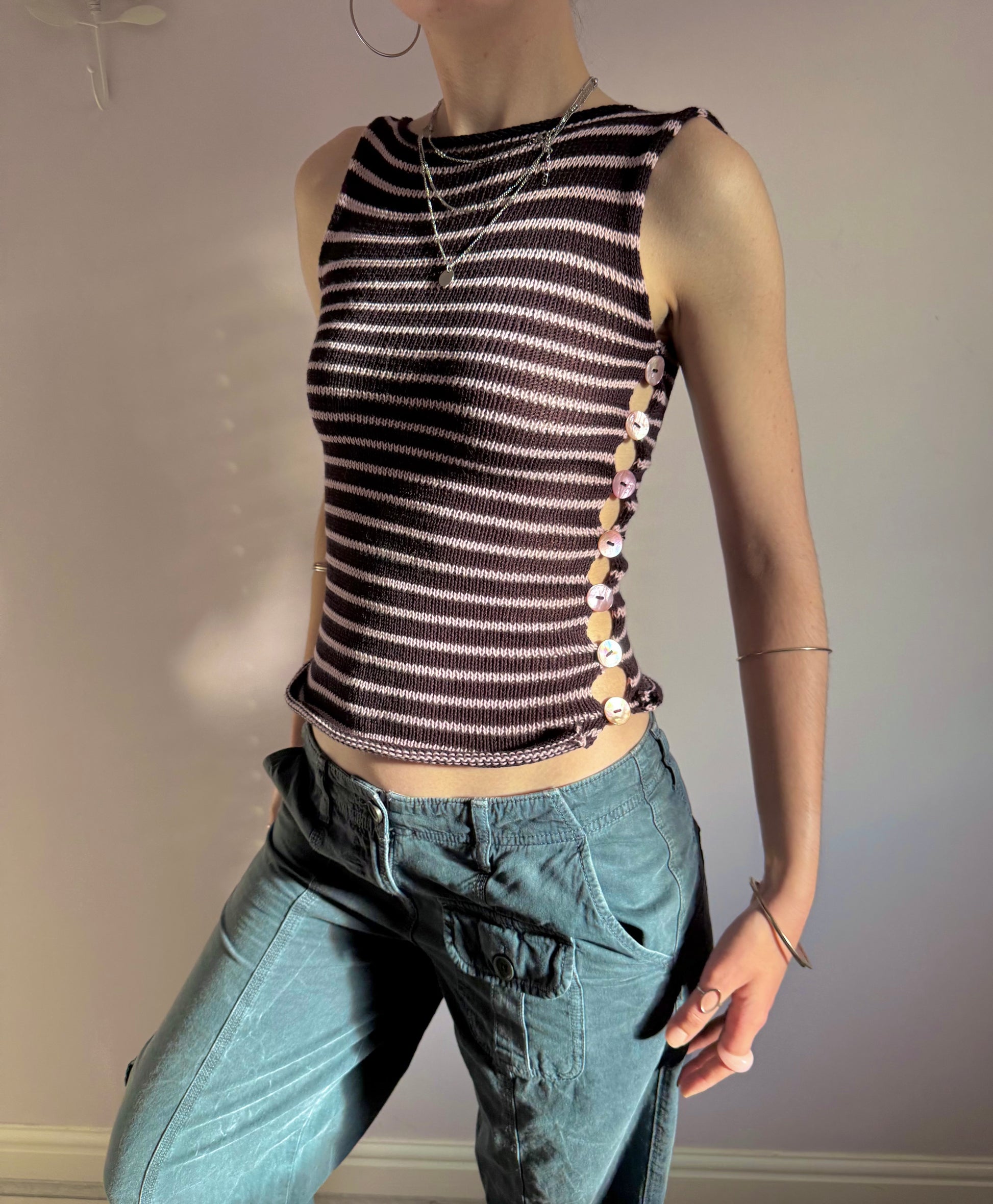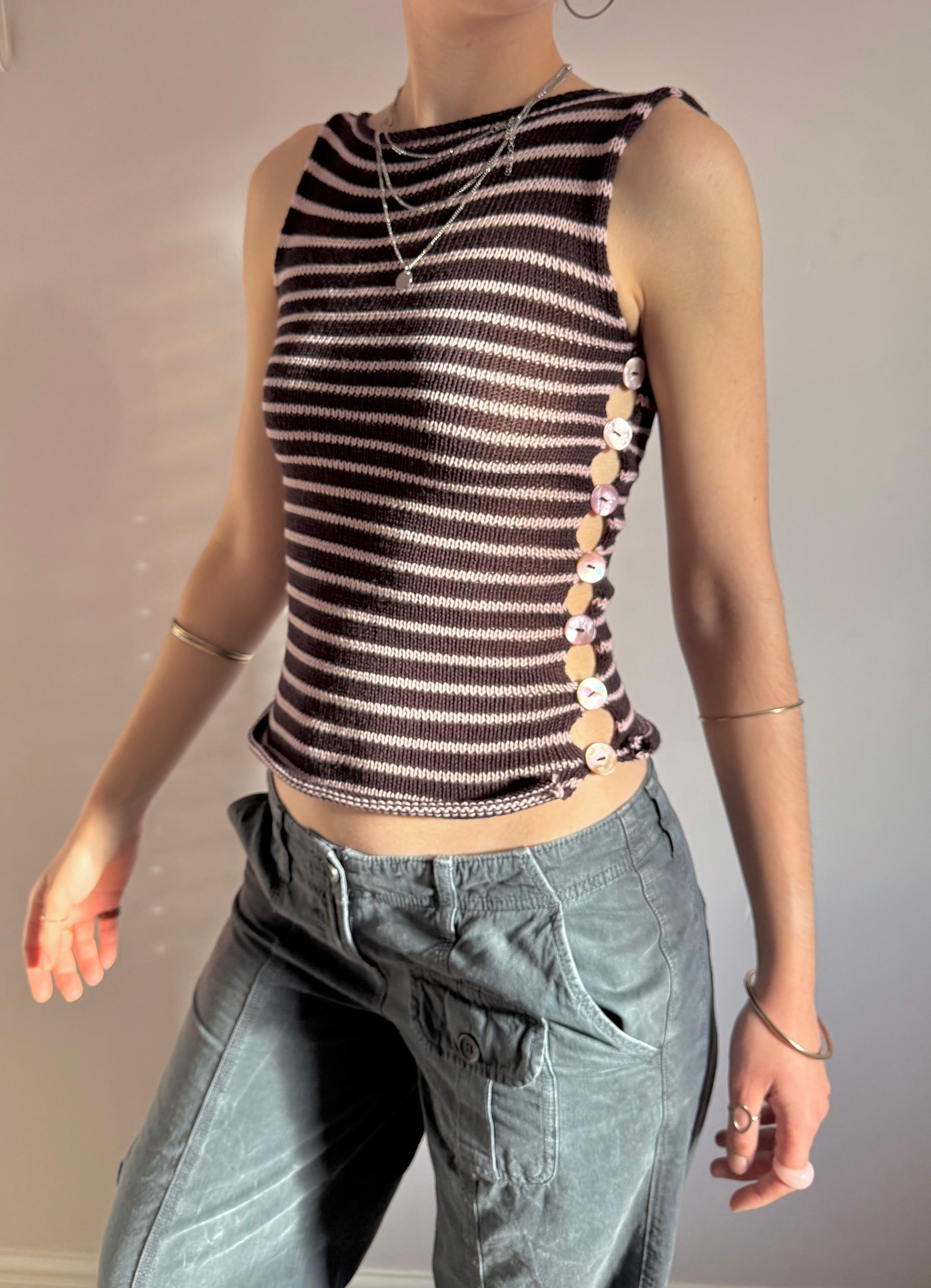 Striped dark purple & dusky pink knitted vest with mother of pearl button open side