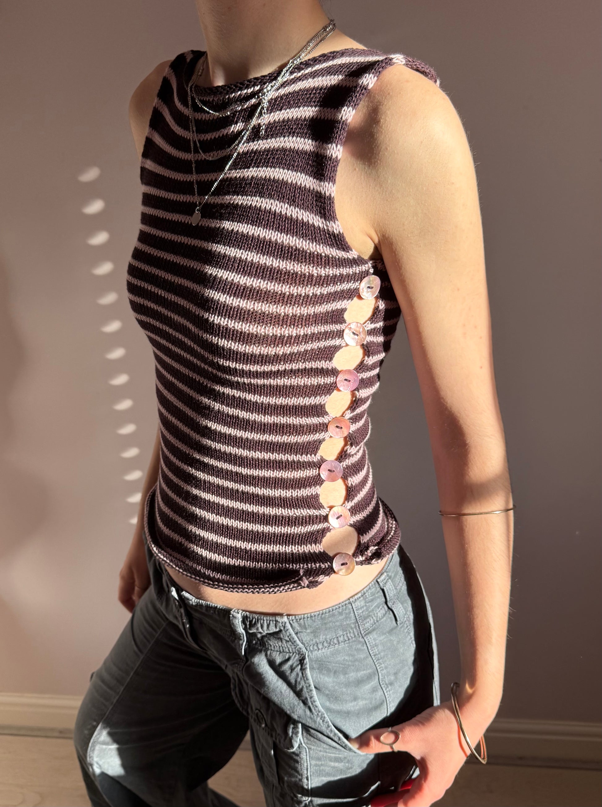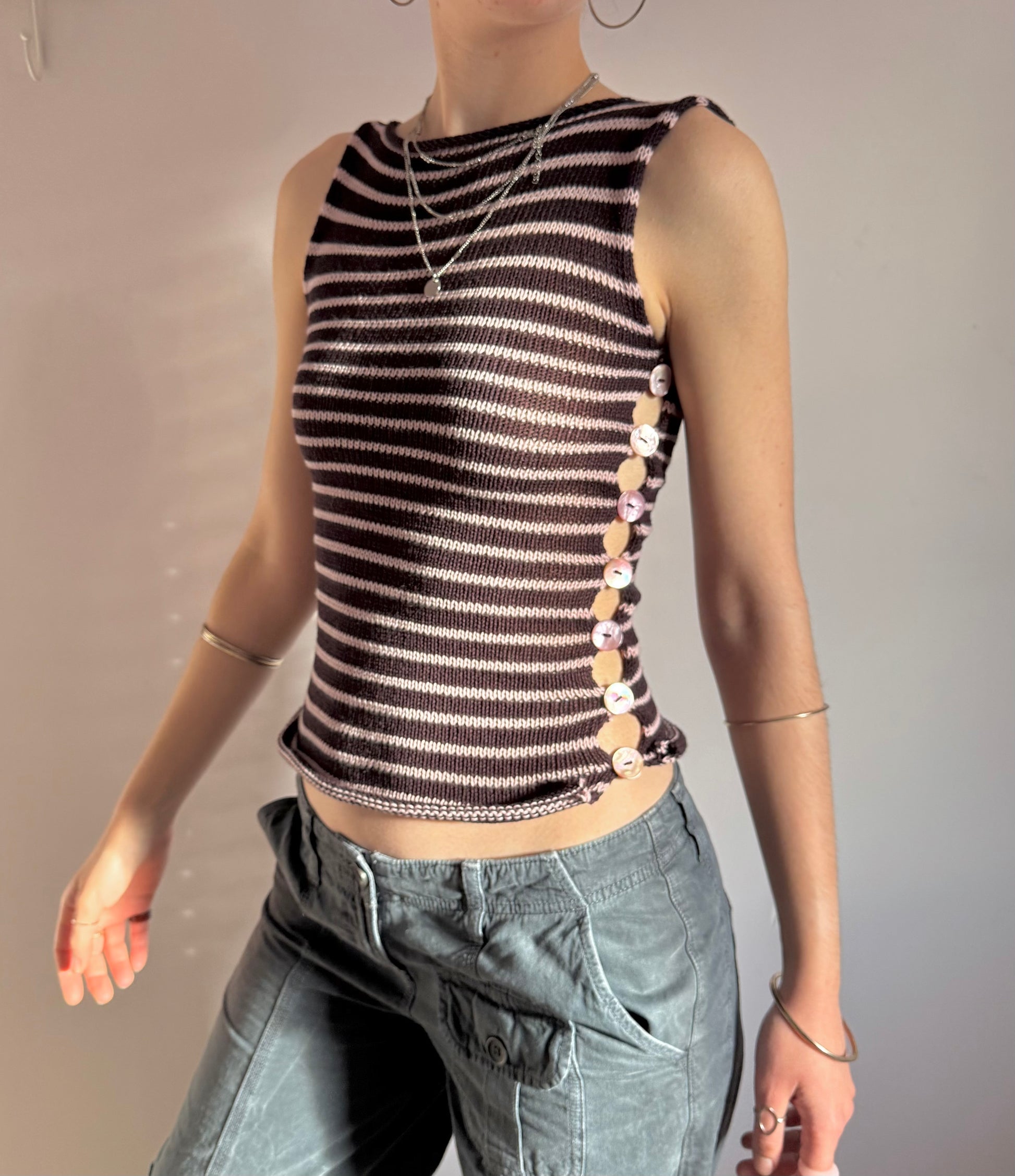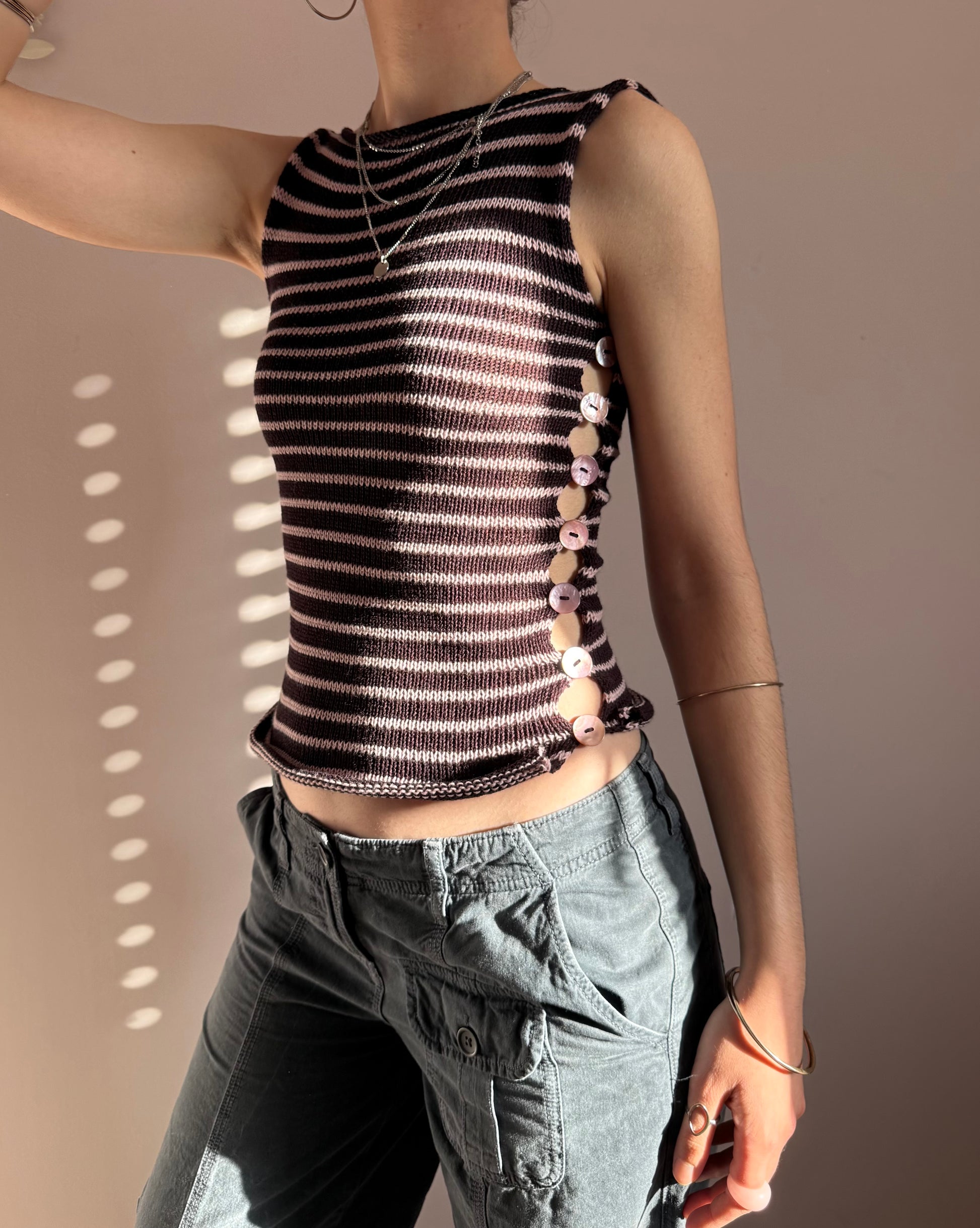 Striped dark purple & dusky pink knitted vest with mother of pearl button open side