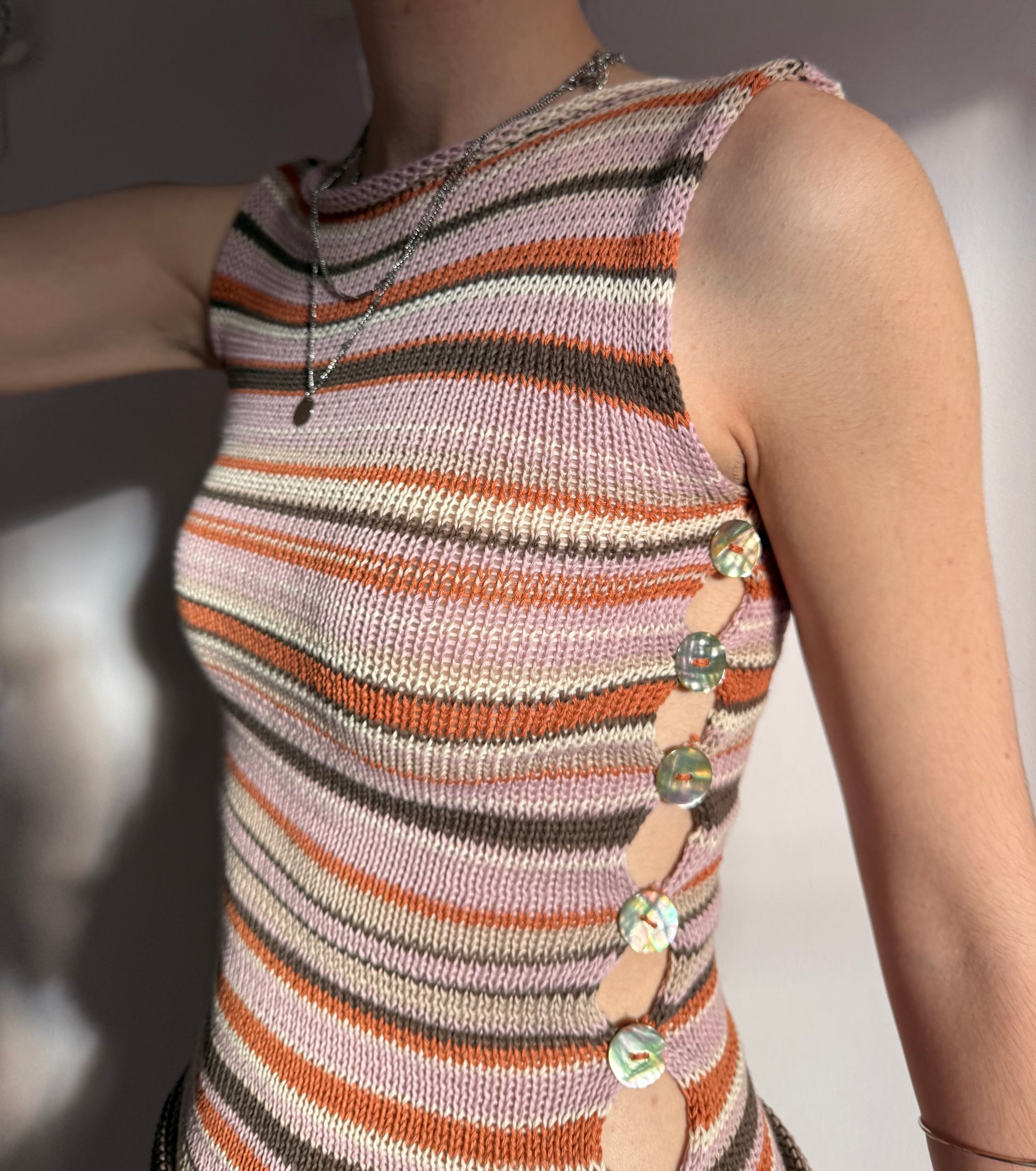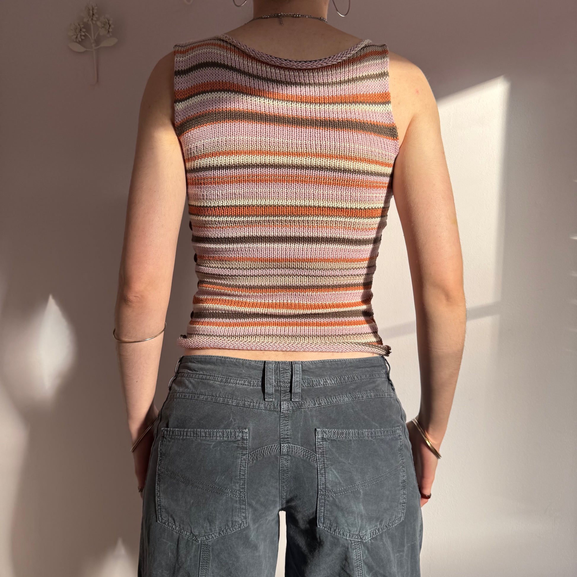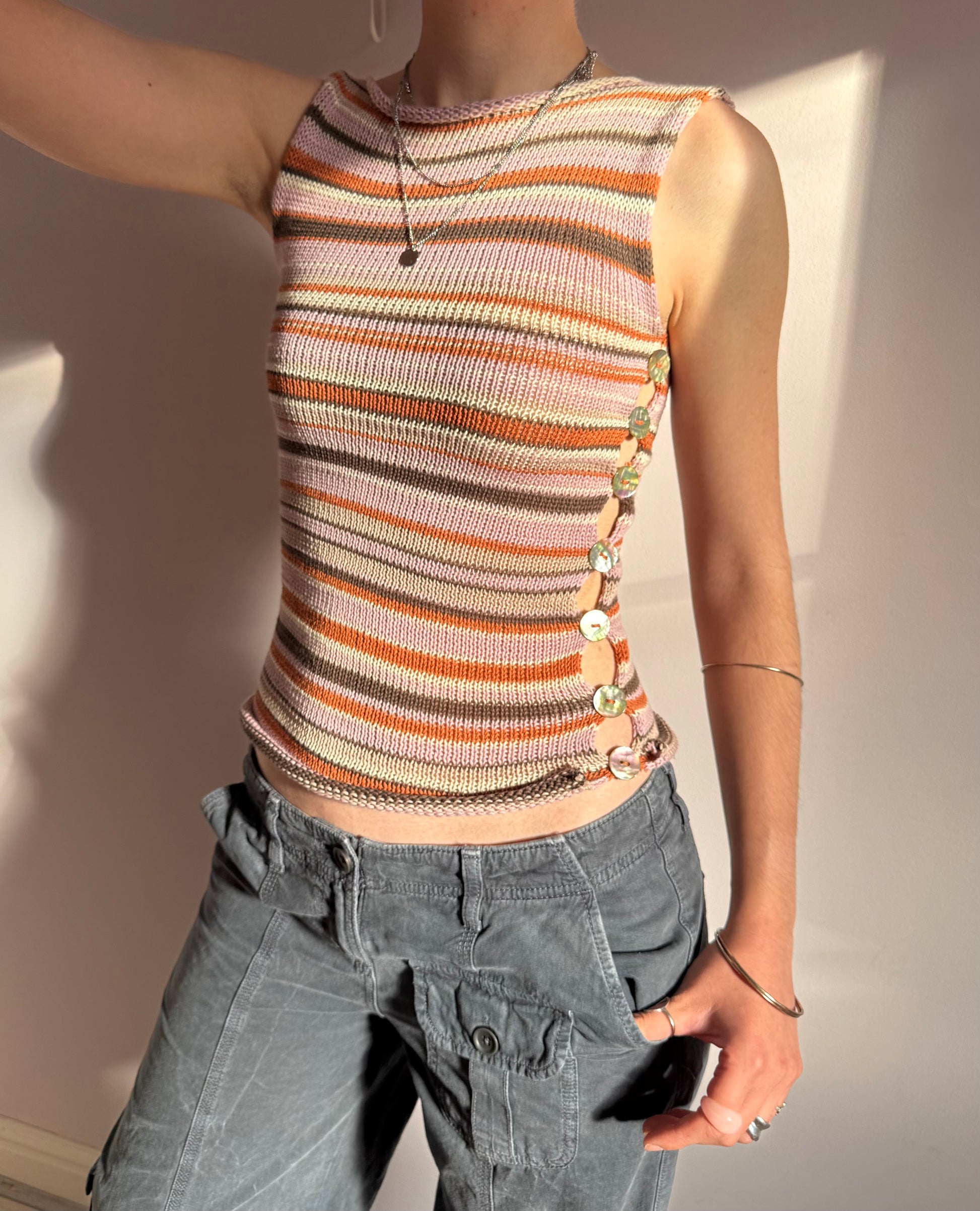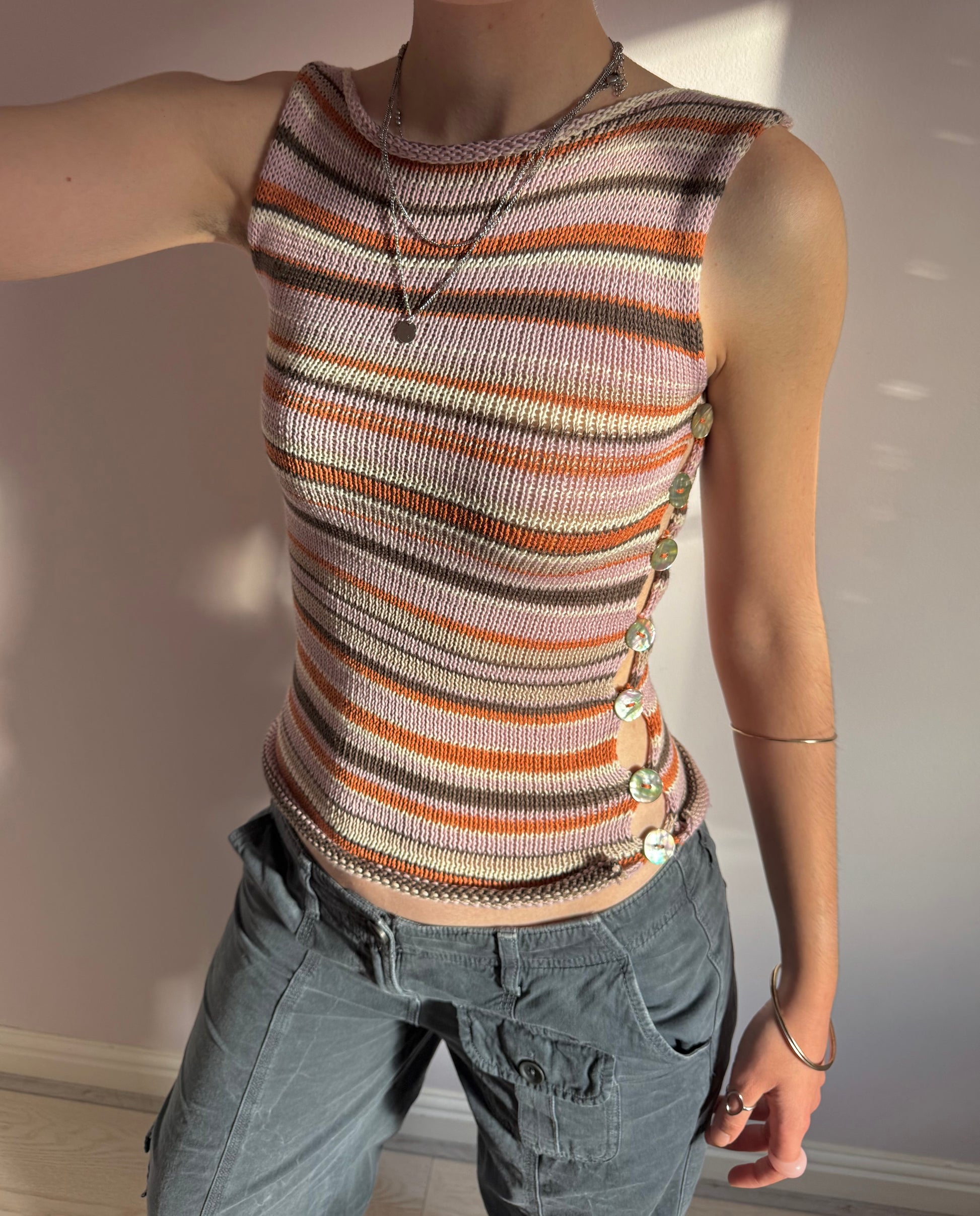 Striped knitted vest in brown, cream, dusky pink and orange with iridescent abalone shell button open side.