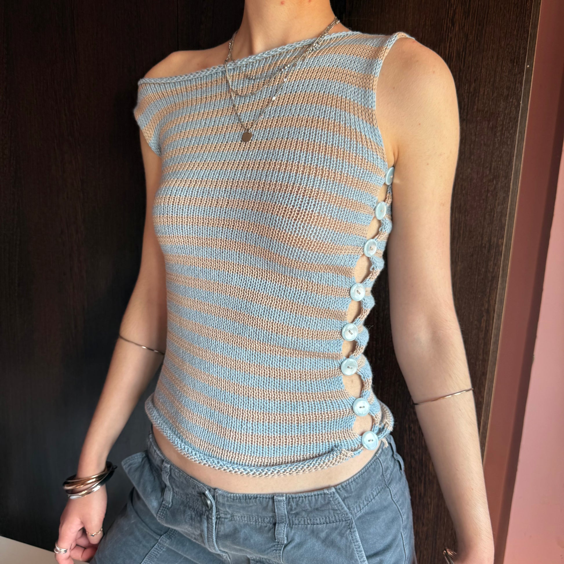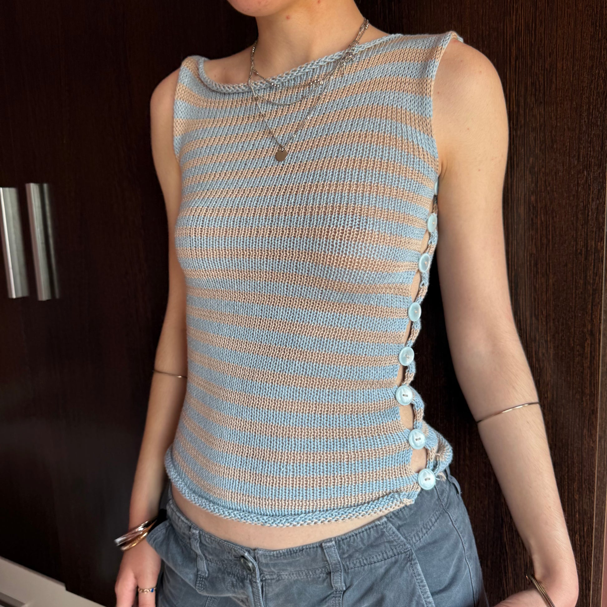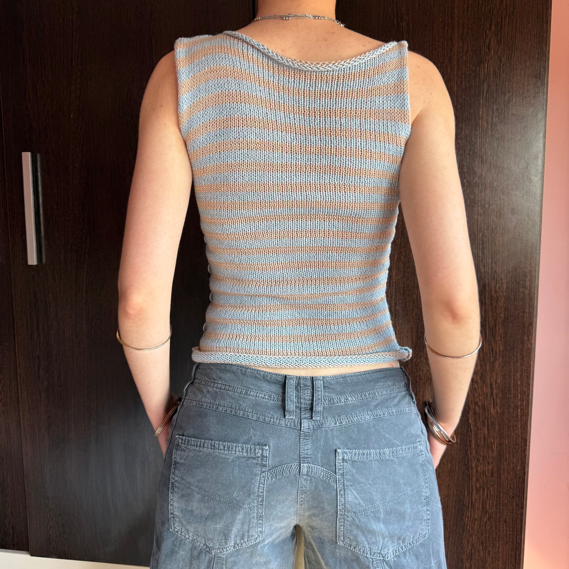 Handmade knitted Pearl Vest - baby blue and beige striped (pre made in size S).