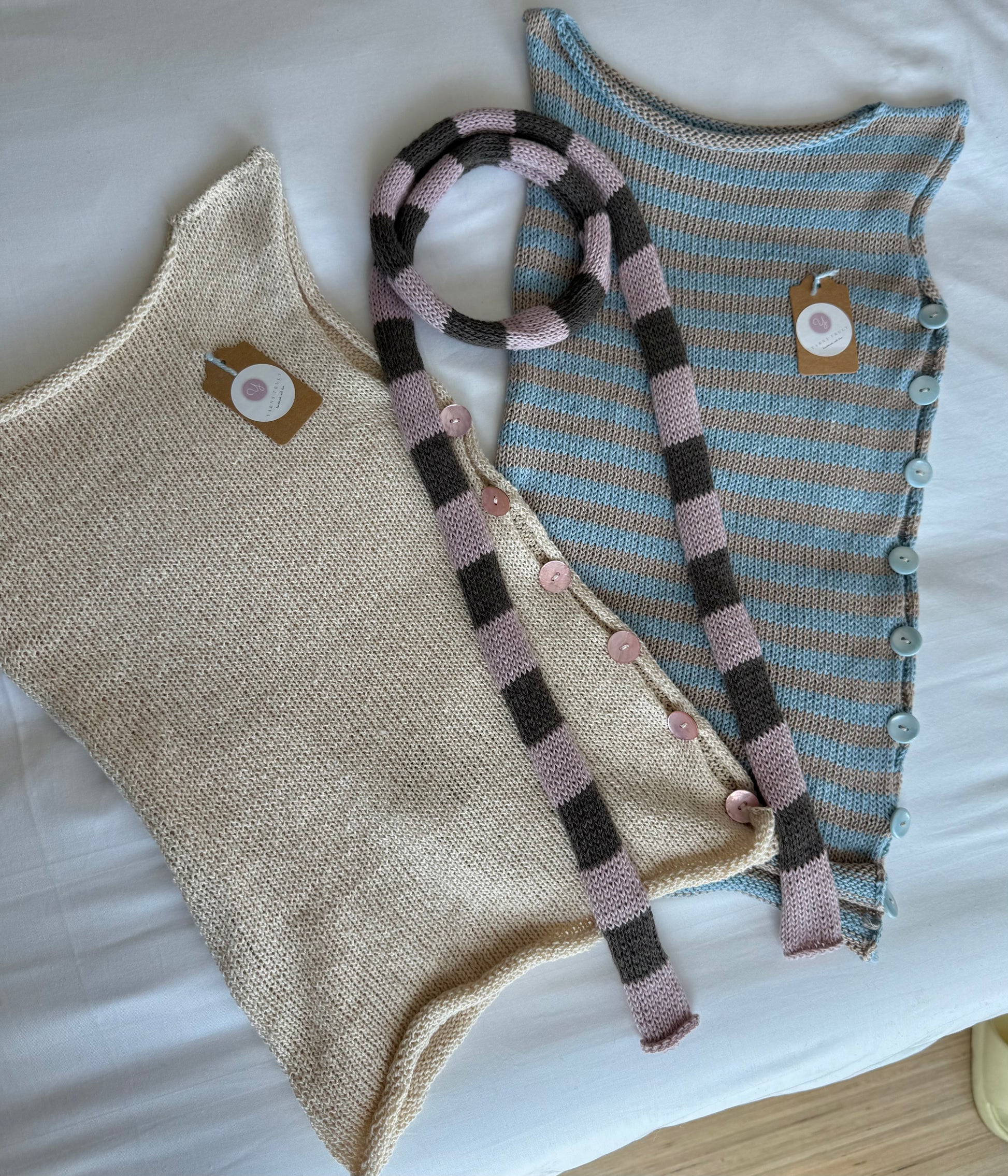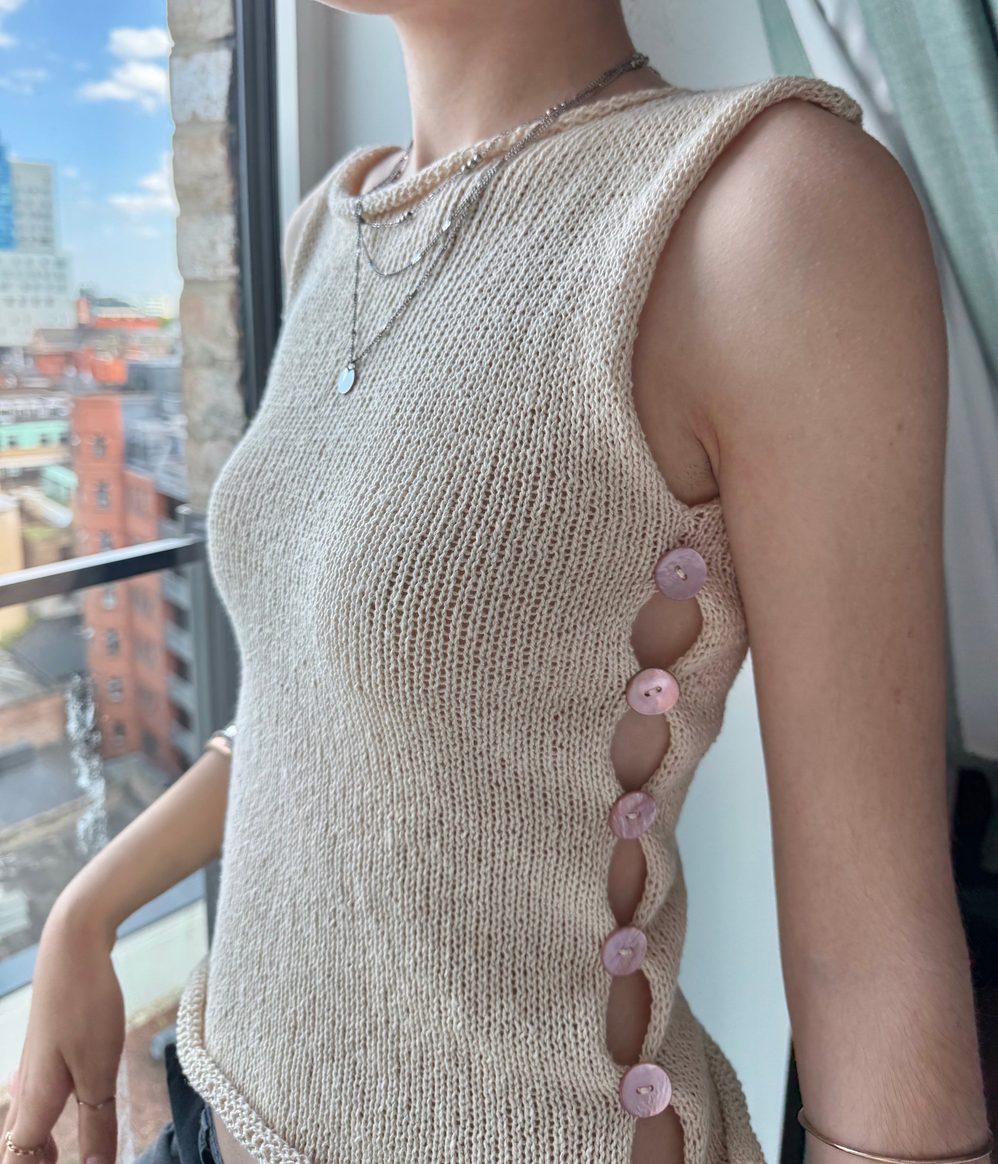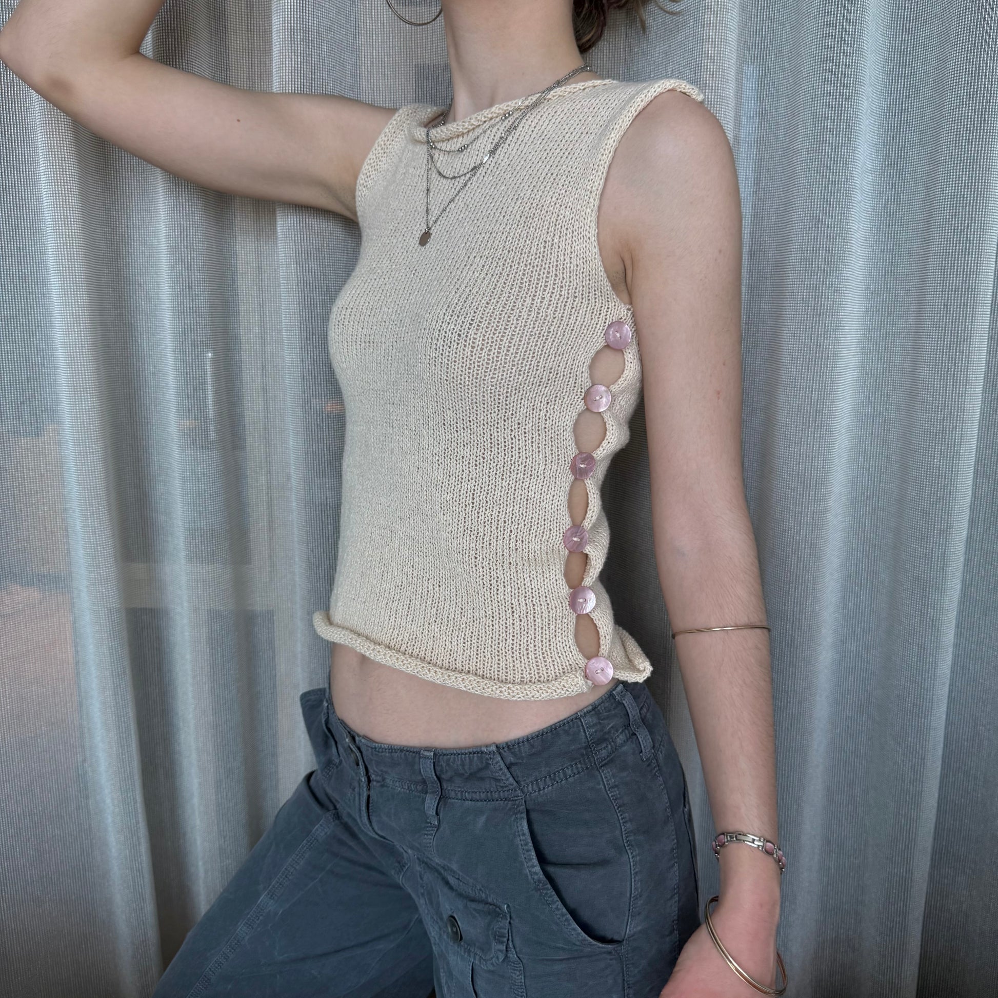 Handmade knitted Pearl Vest in cream with baby pink mother of pearl buttons
