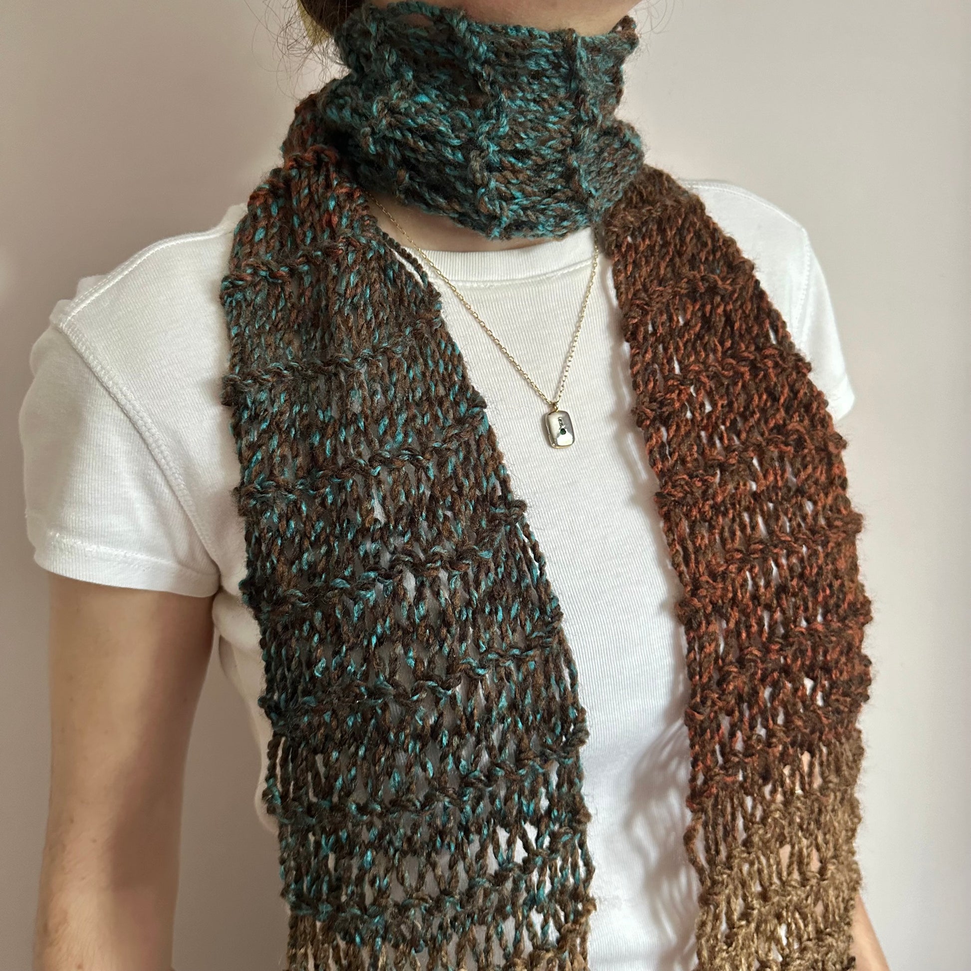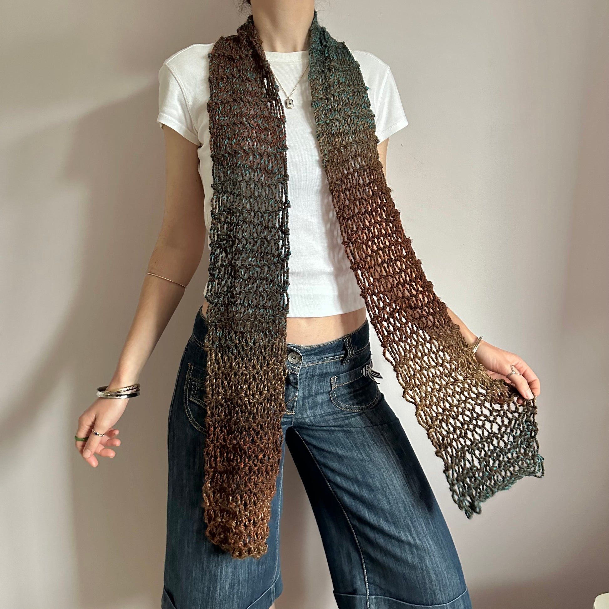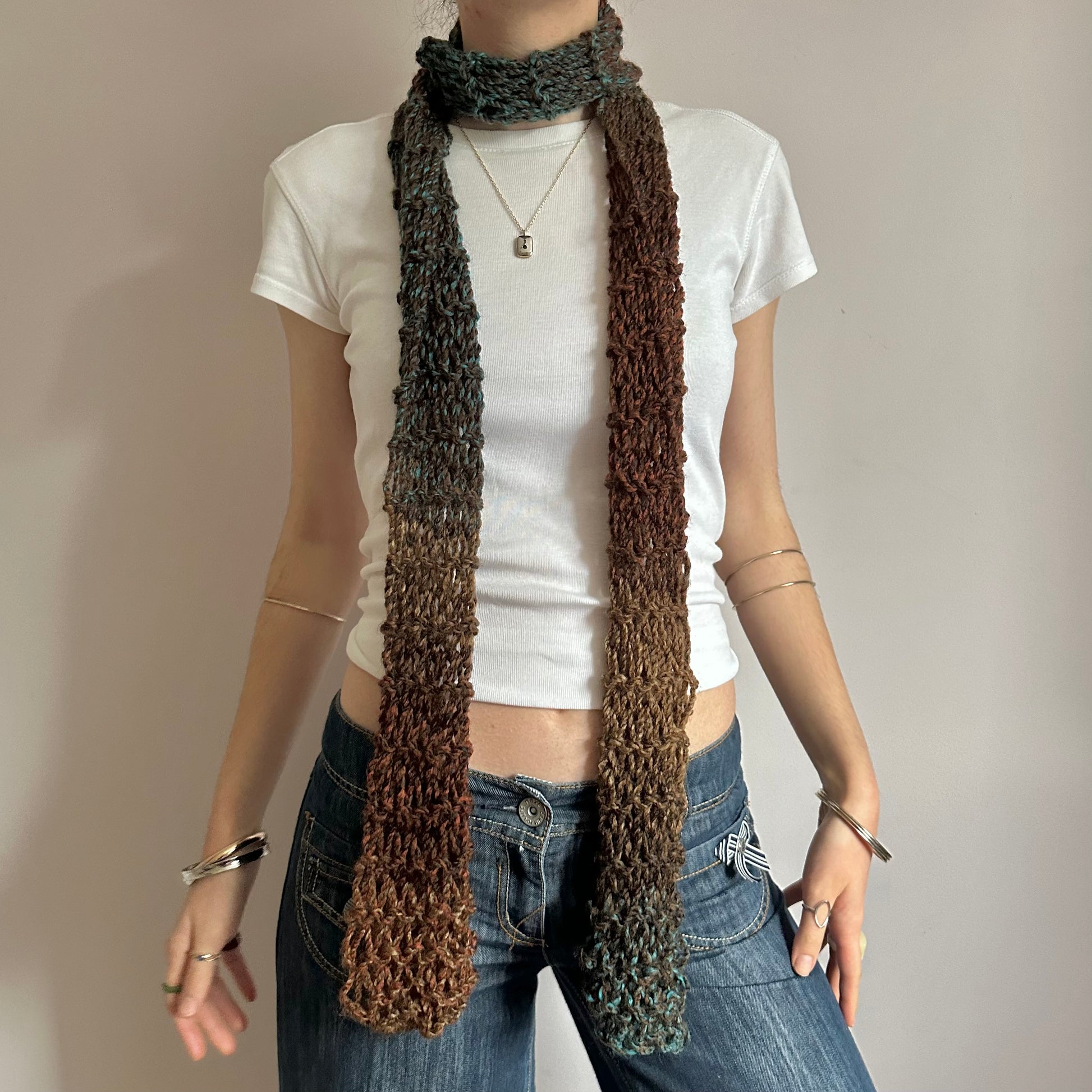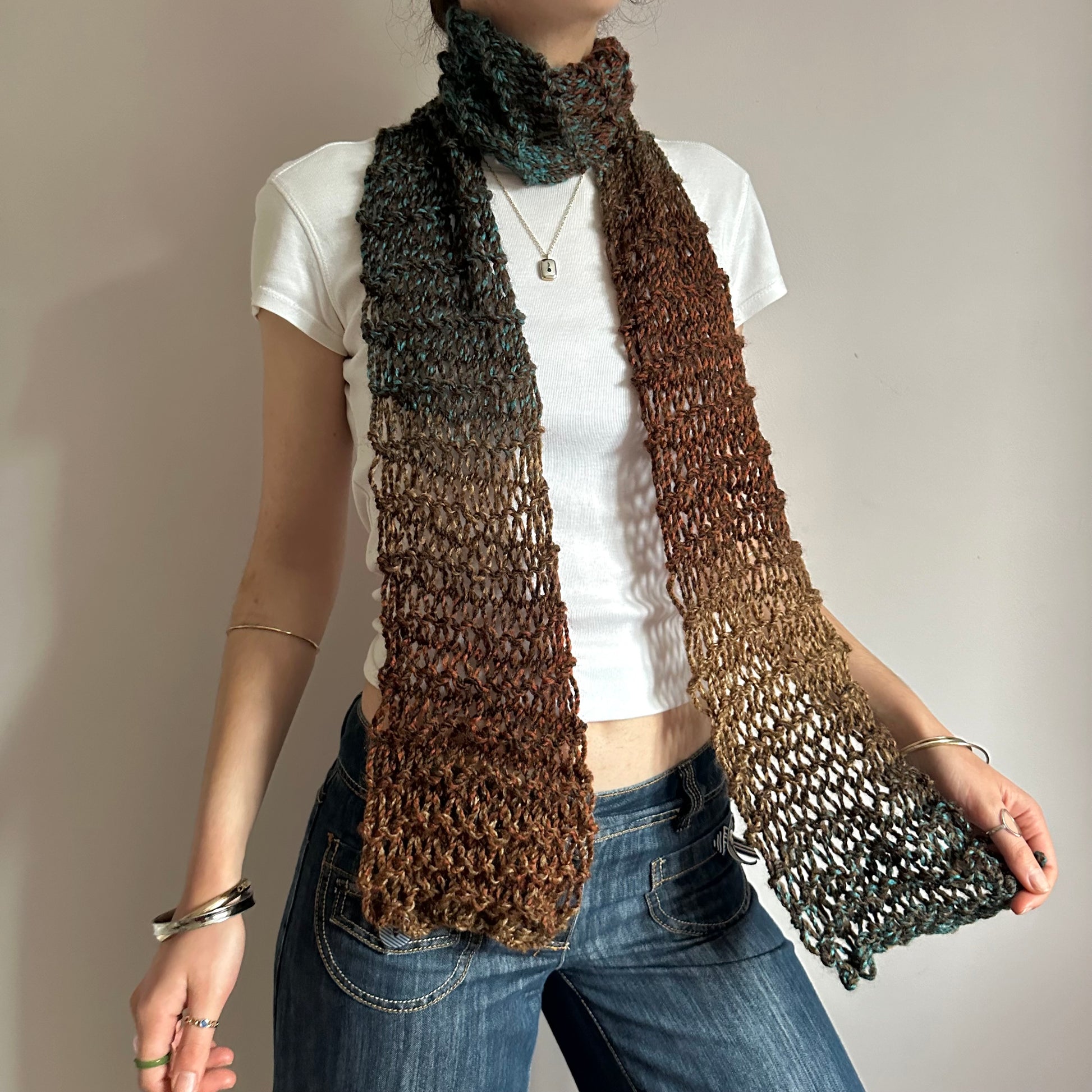 The cutest handmade loose / distressed knit scarf in brown and blue shades 🤎