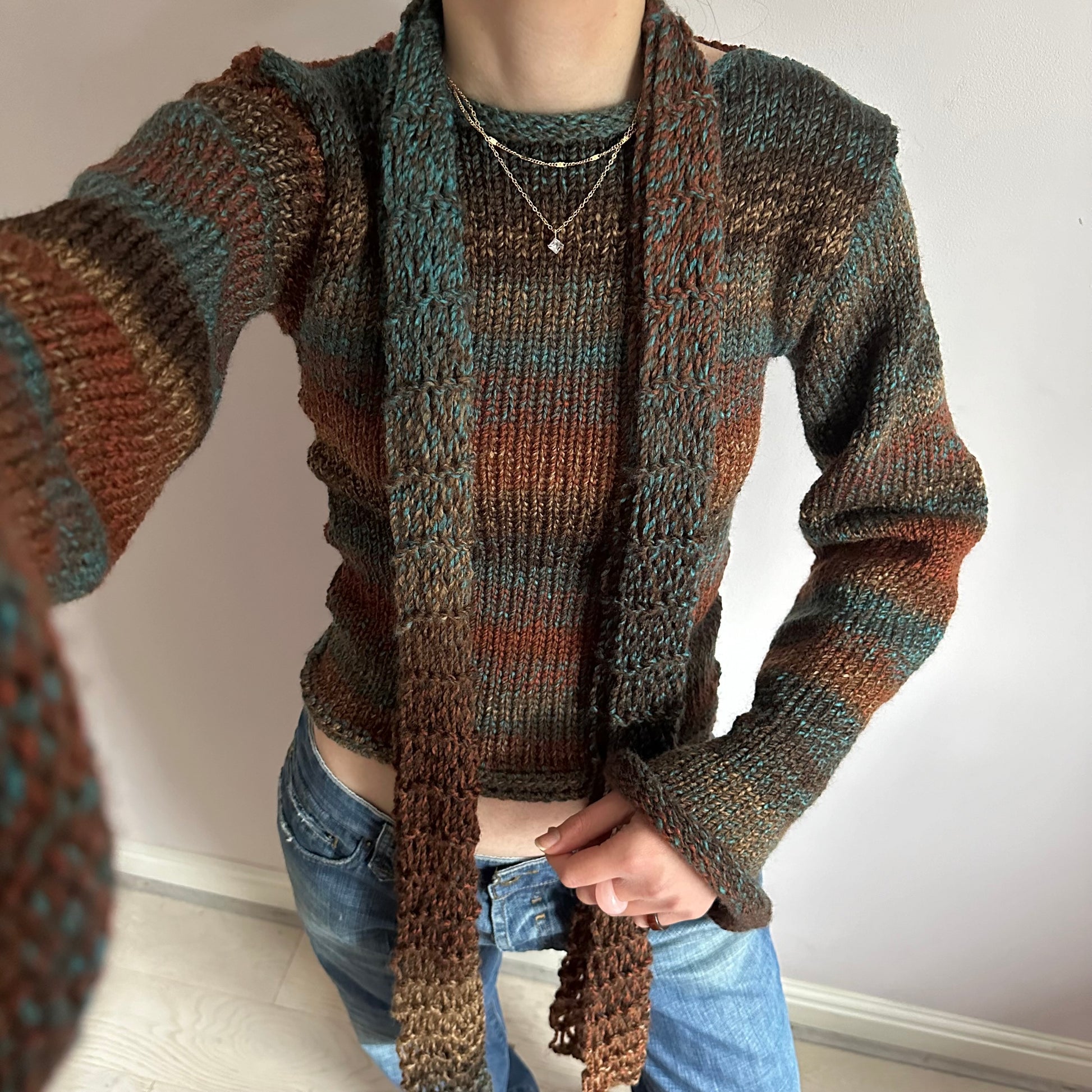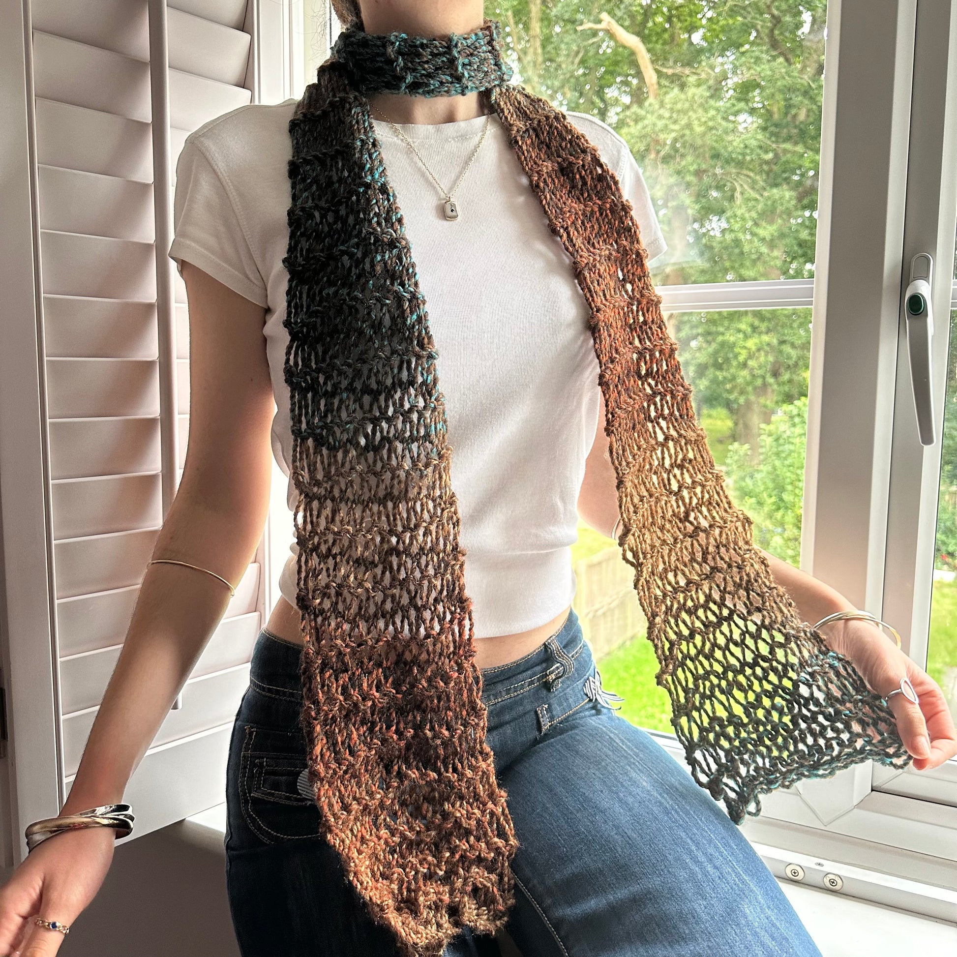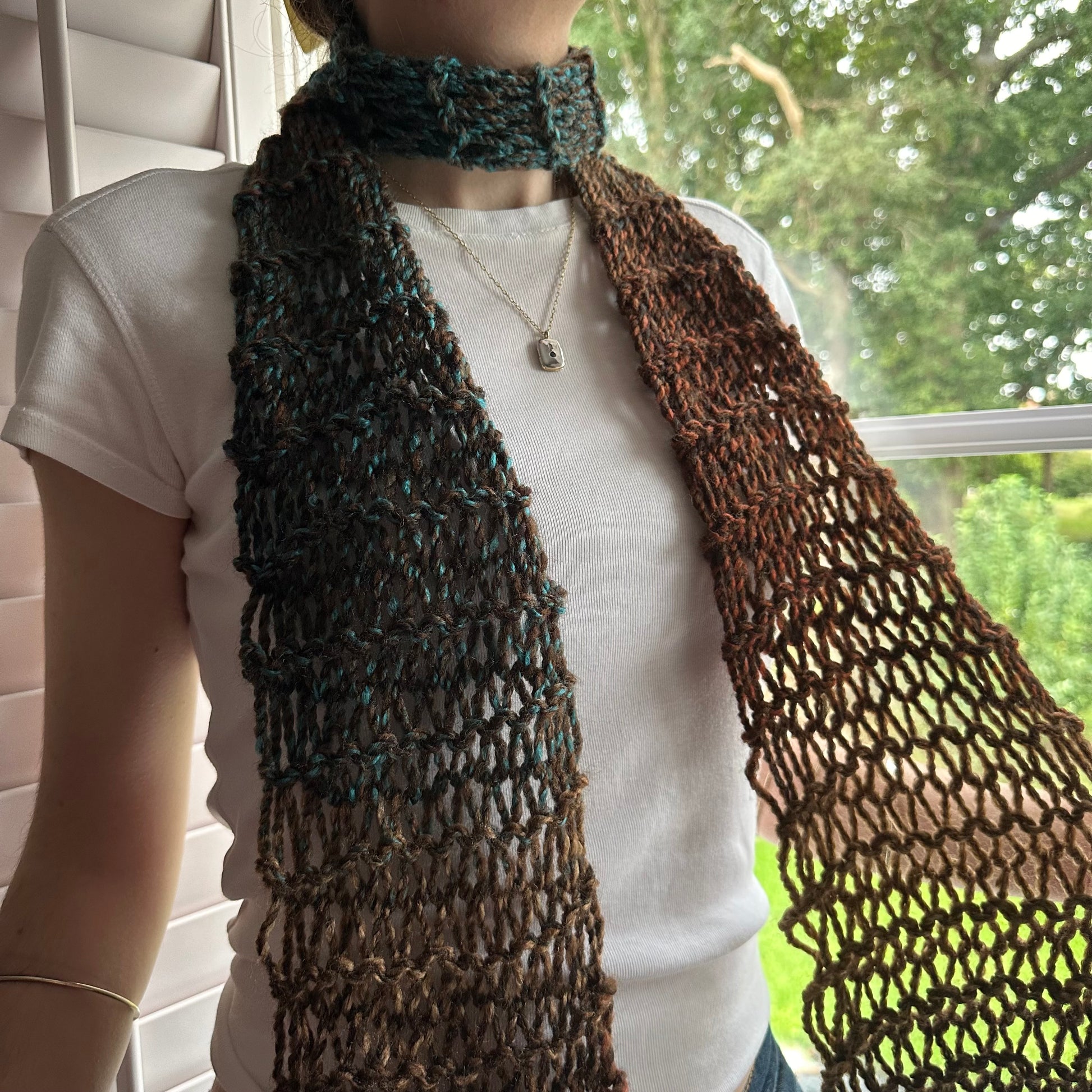 The cutest handmade loose / distressed knit scarf in brown and blue shades 🤎