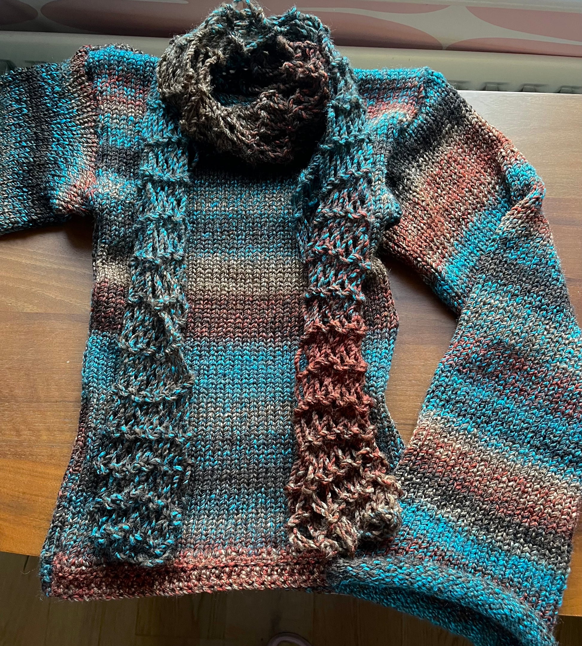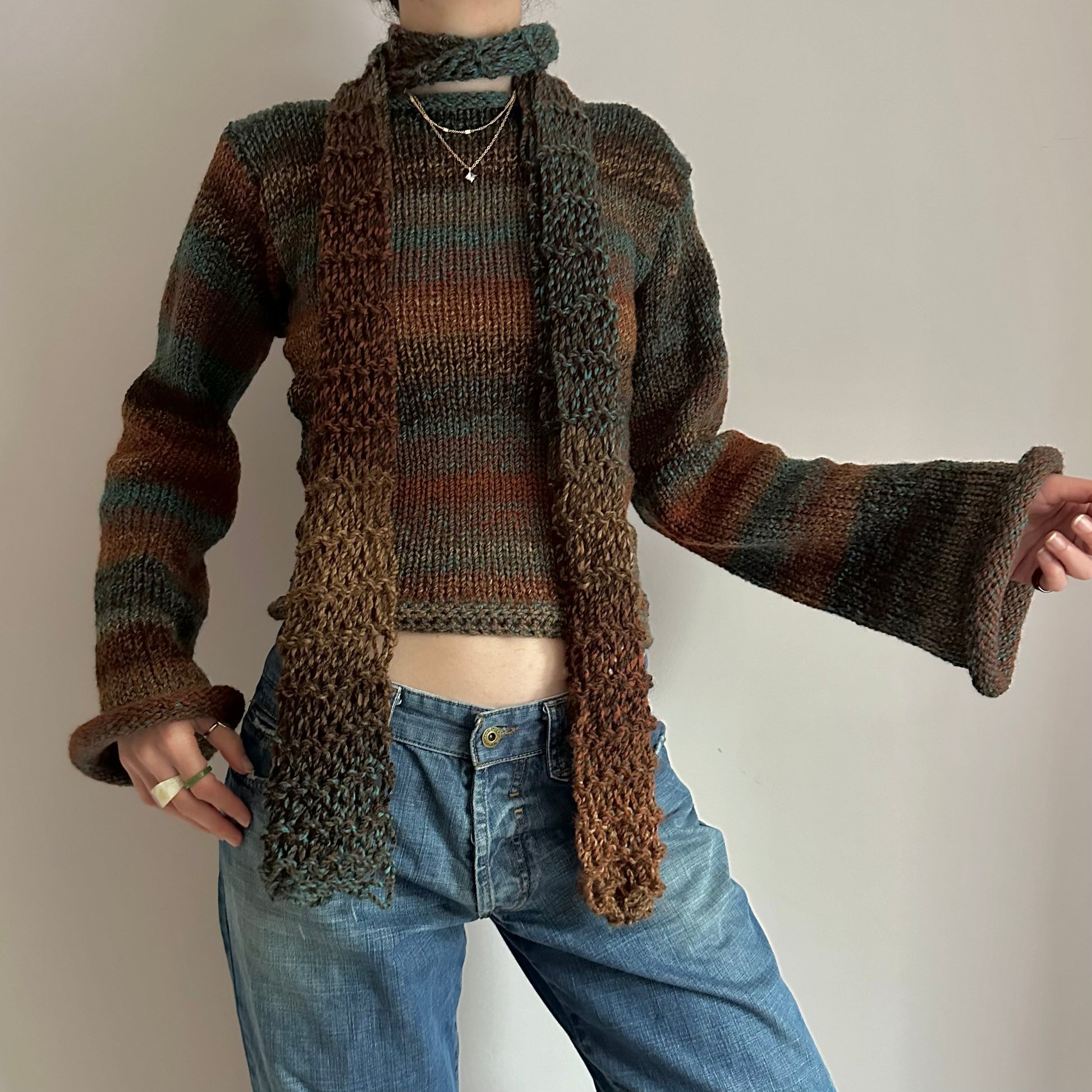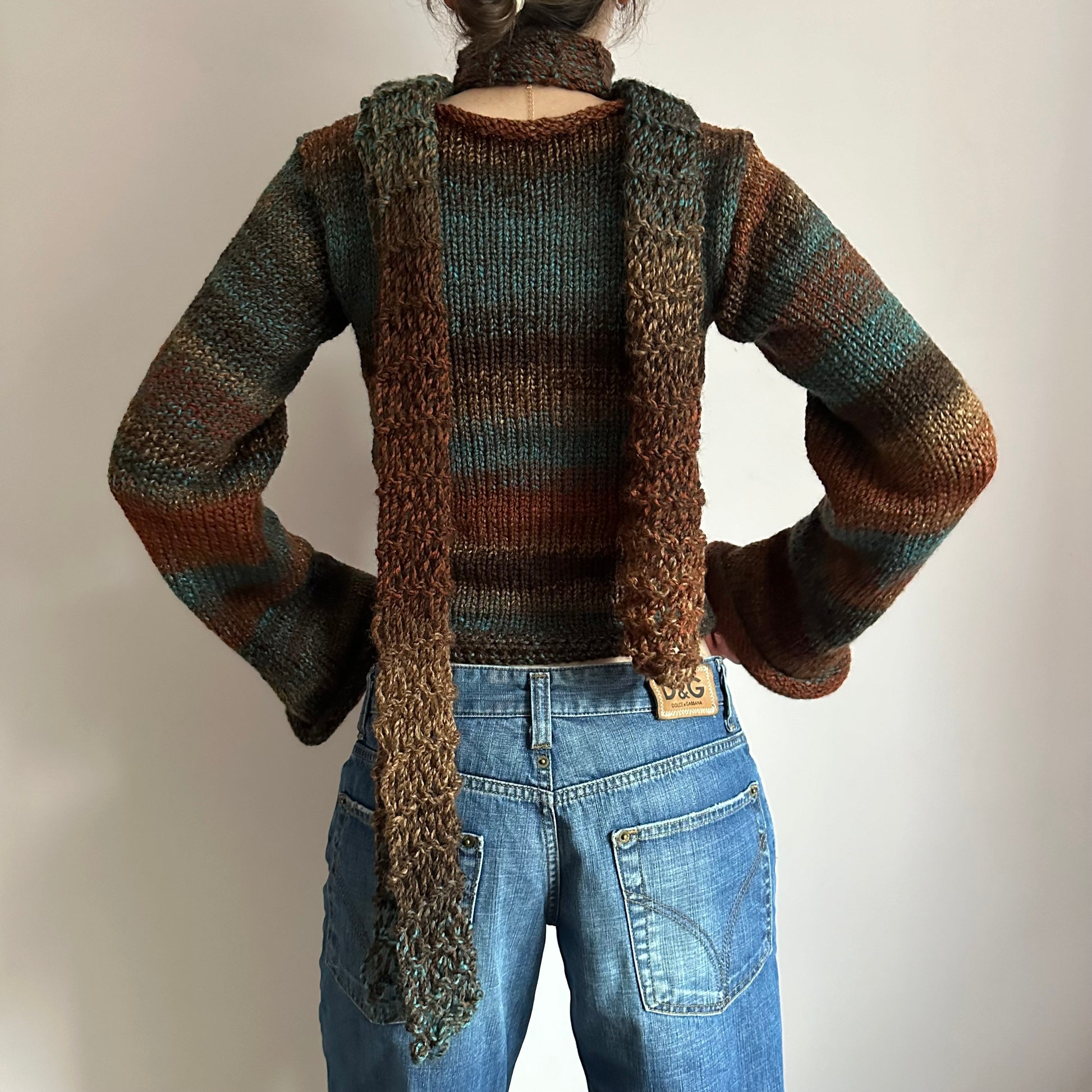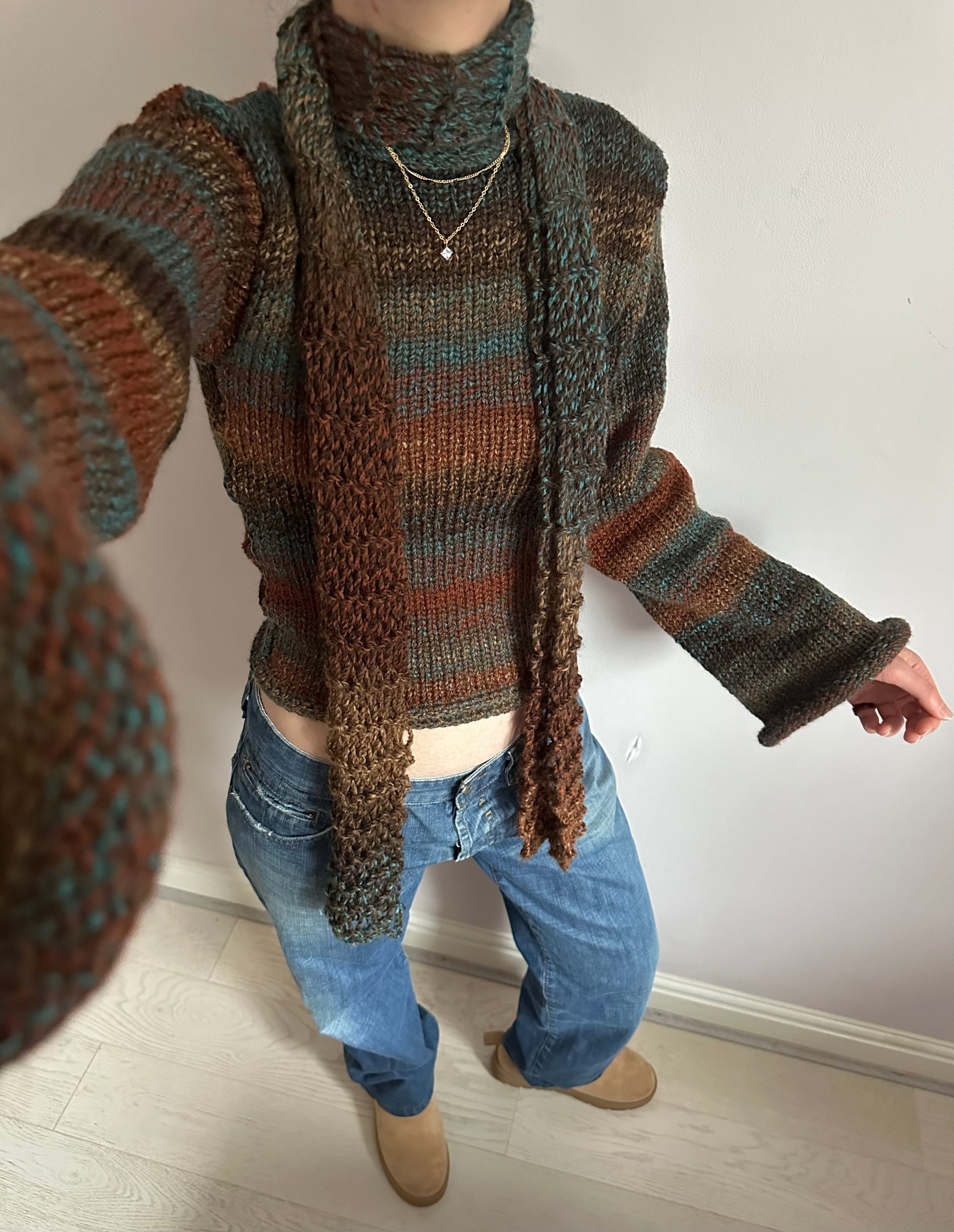 The cutest handmade loose / distressed knit scarf in brown and blue shades 🤎