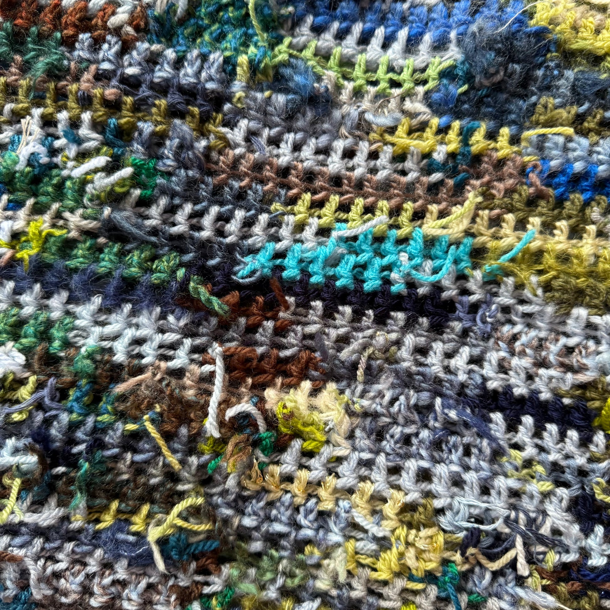 Made of various yarns left over from previous projects, including mohair, acrylic and wool