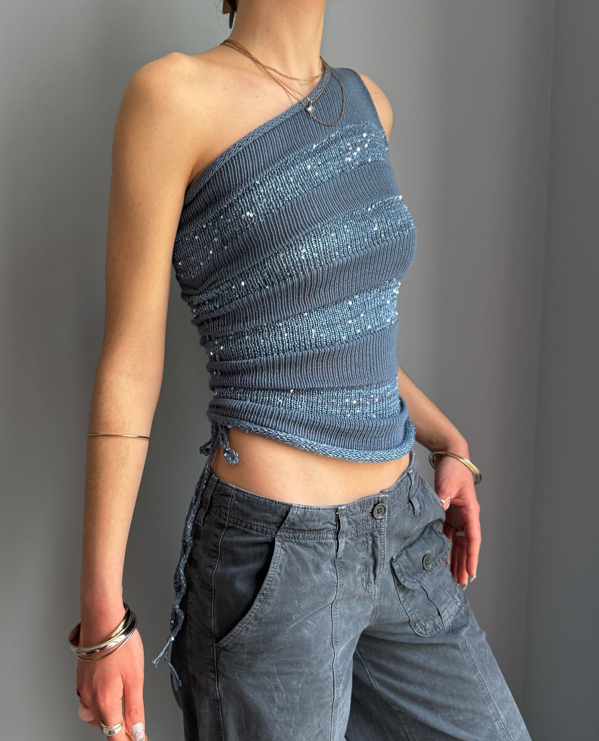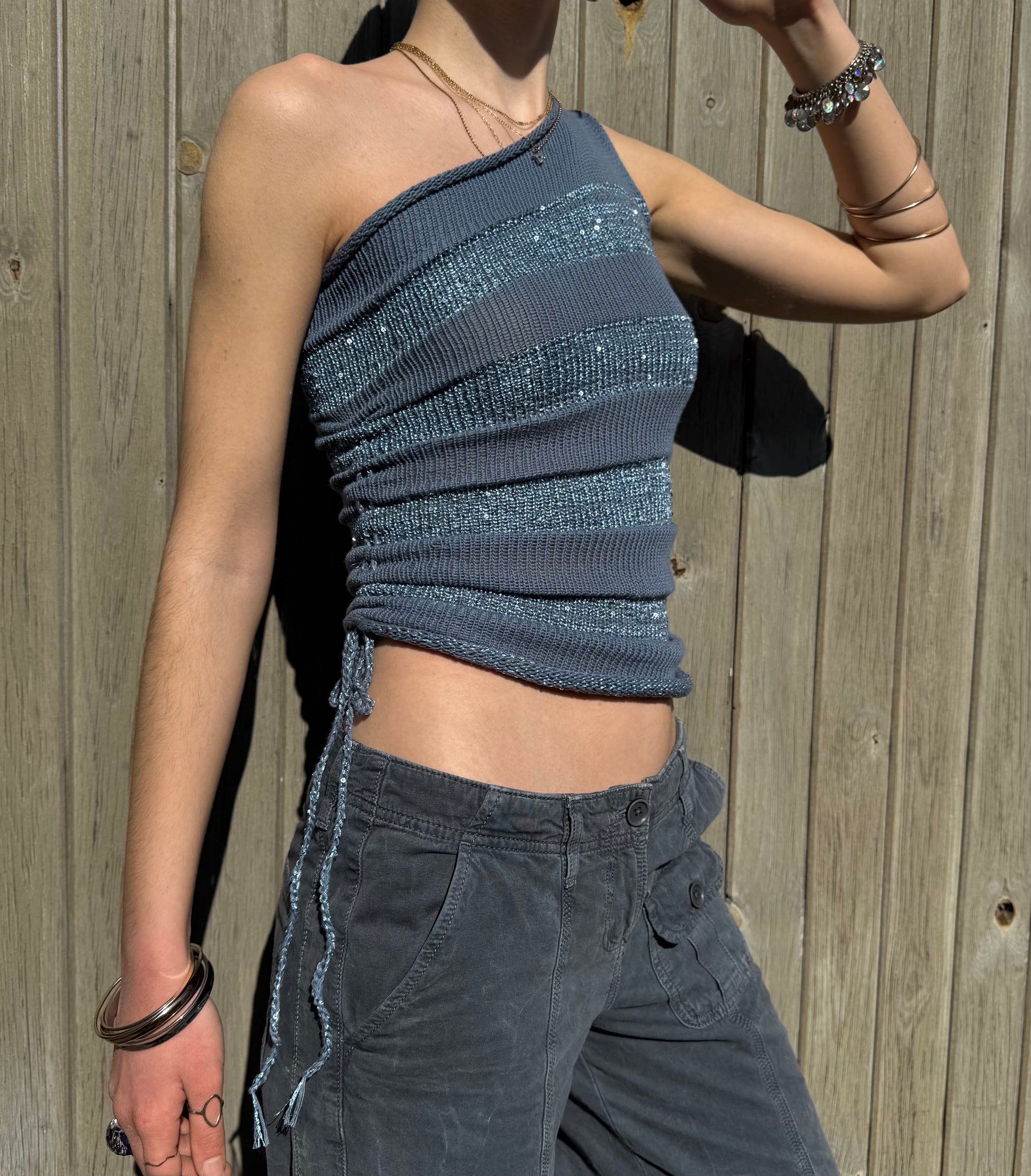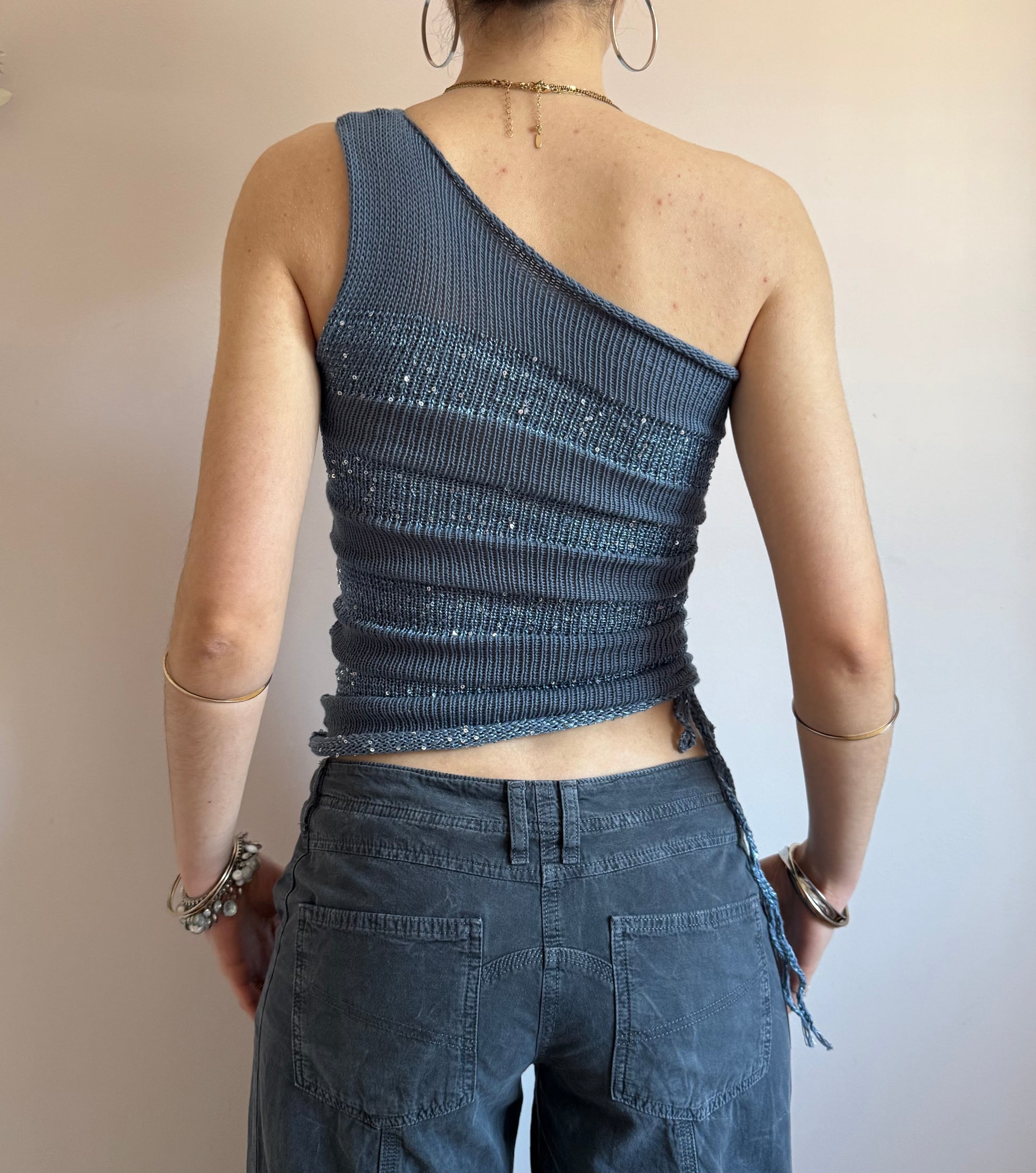 New design! The cutest glittery knitted one shoulder top with a draped effect in a gorgeous denim blue colour 🦋