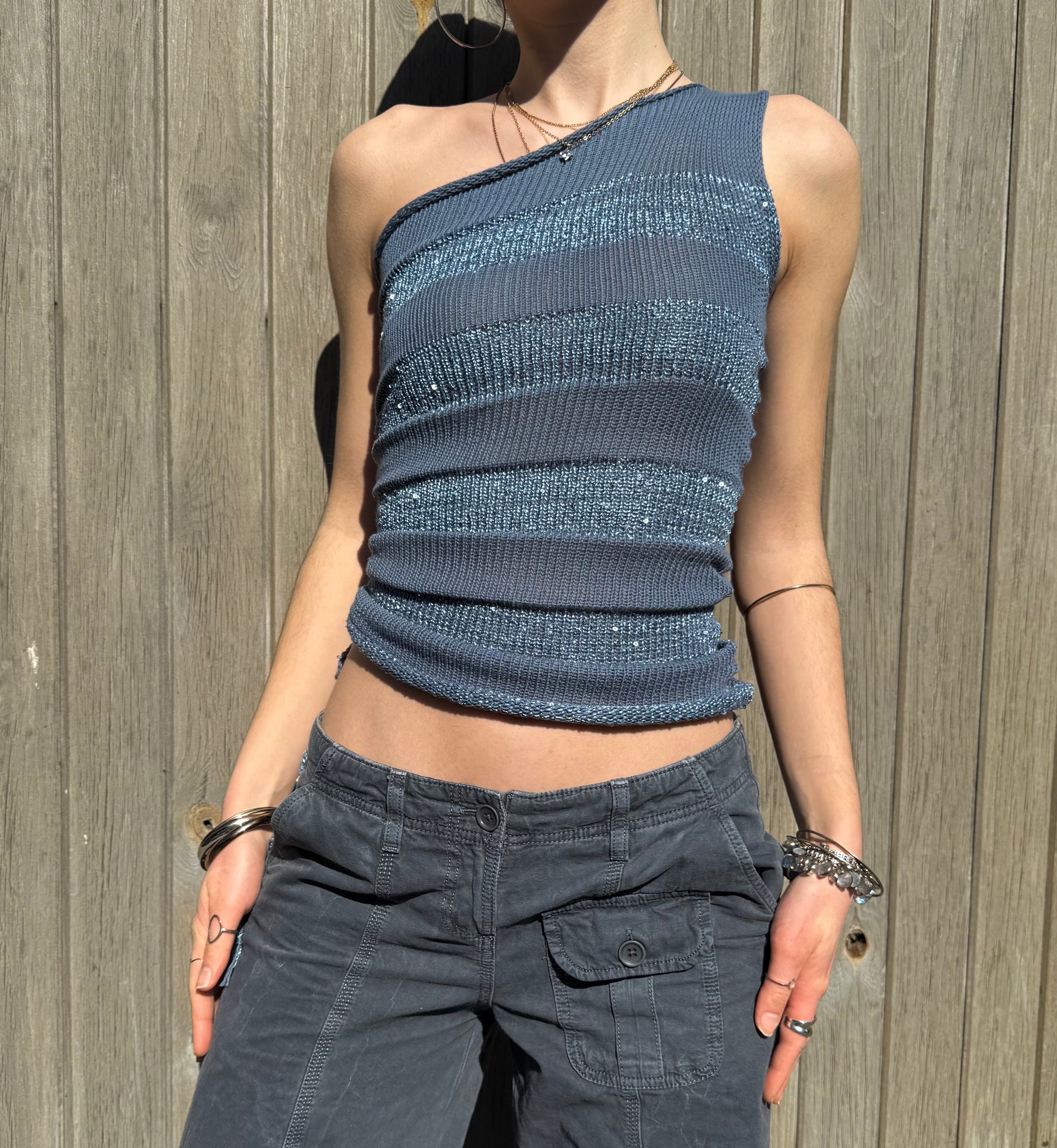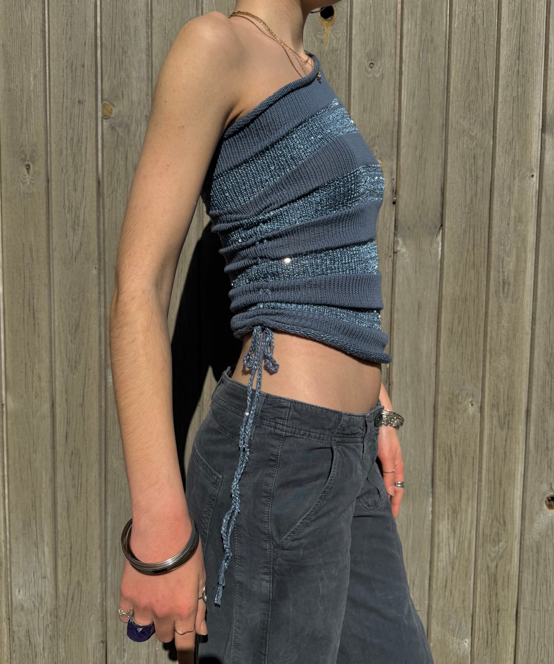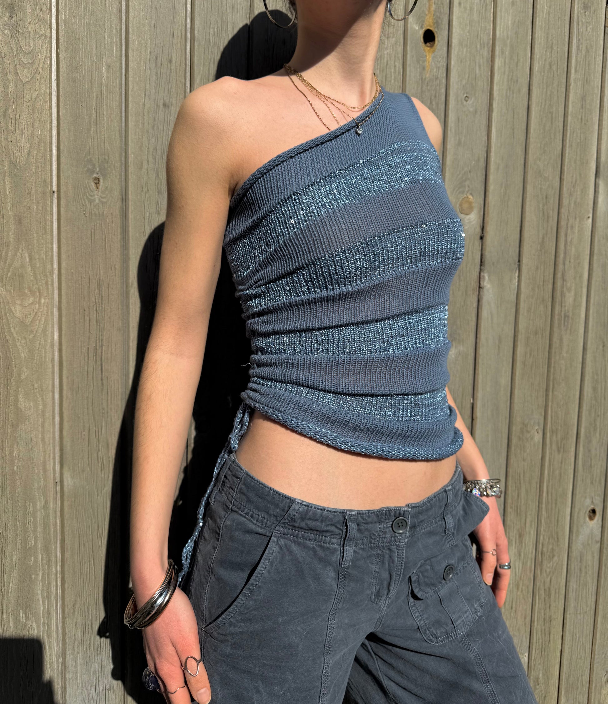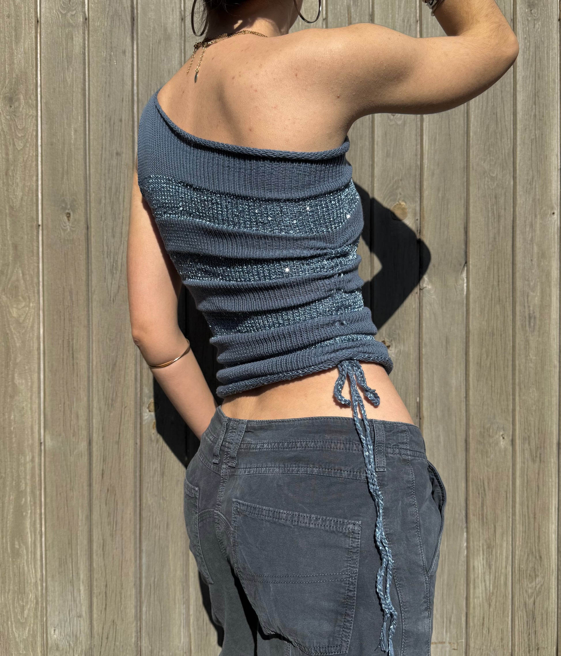 New design! The cutest glittery knitted one shoulder top with a draped effect in a gorgeous denim blue colour 🦋