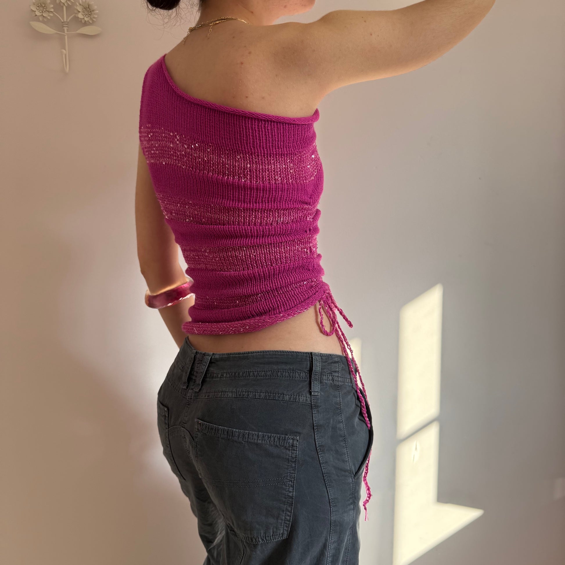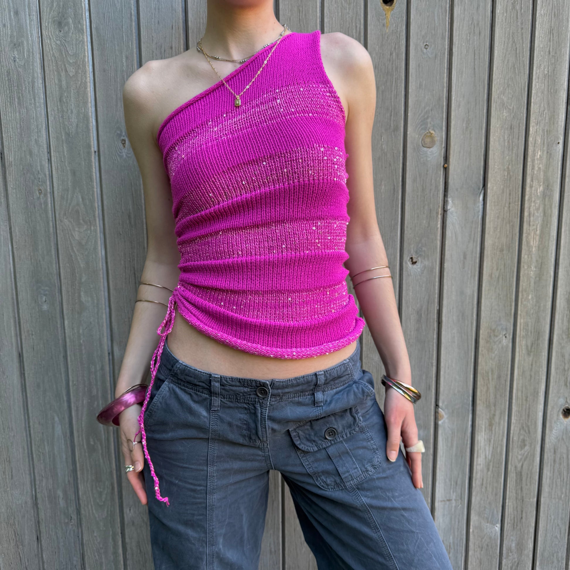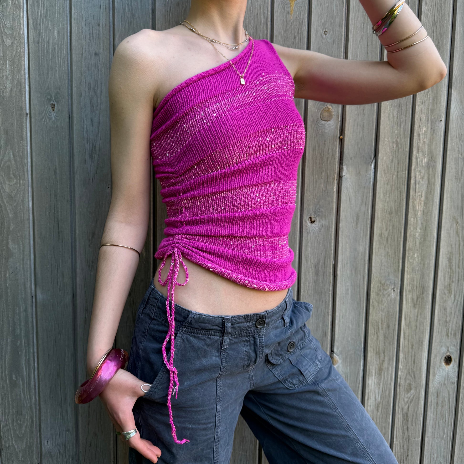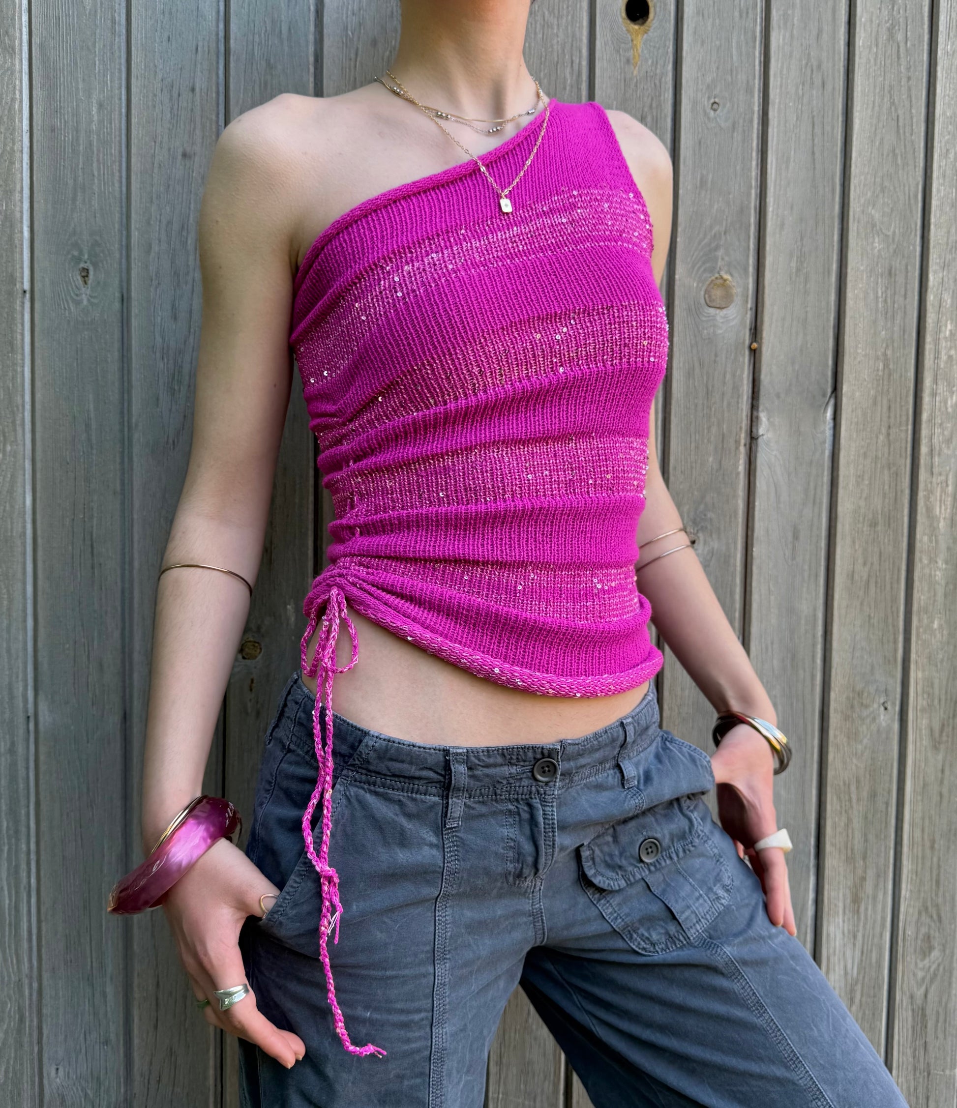 New design! ✨ The cutest glittery knitted one shoulder top with a draped effect in a gorgeous hot pink colour 🩷