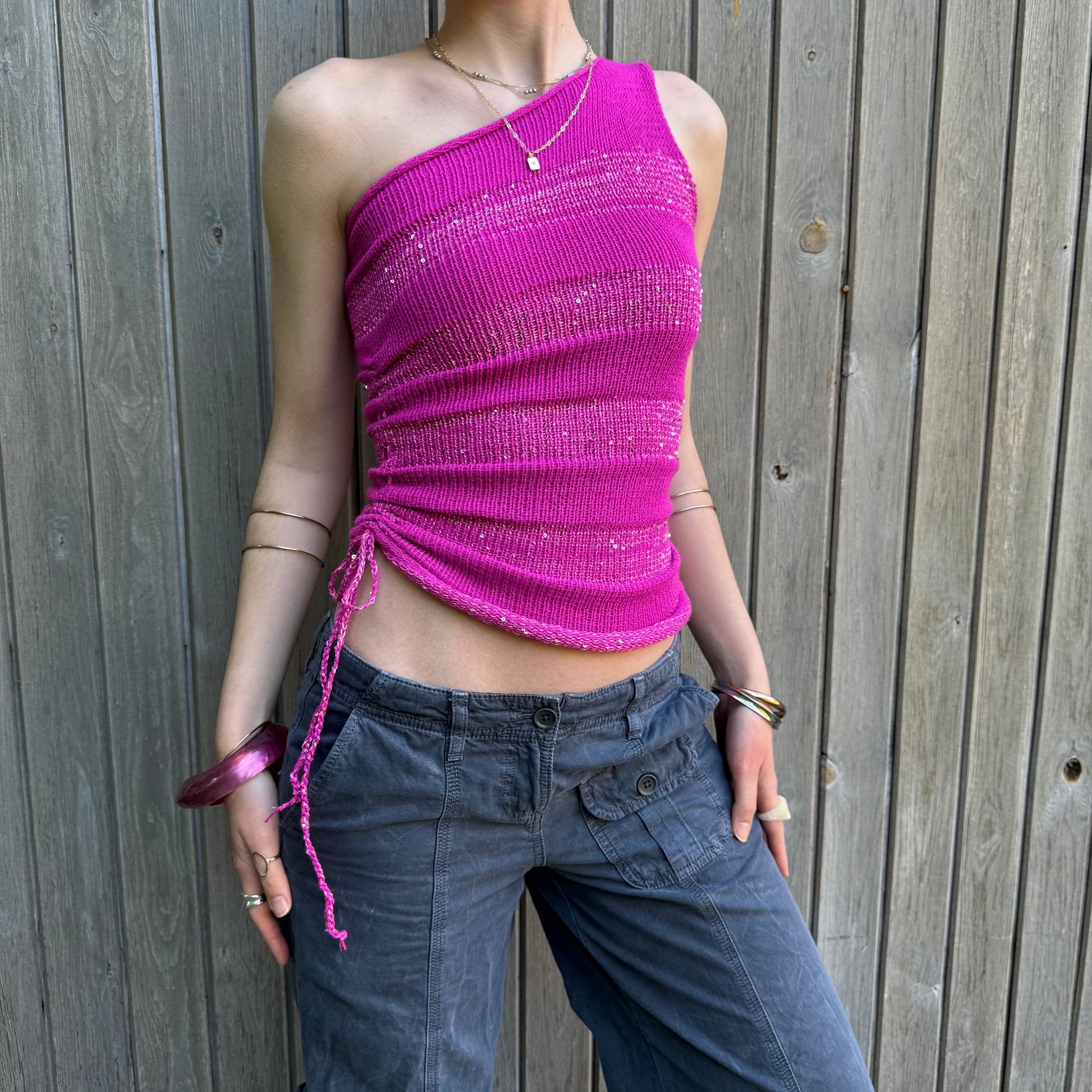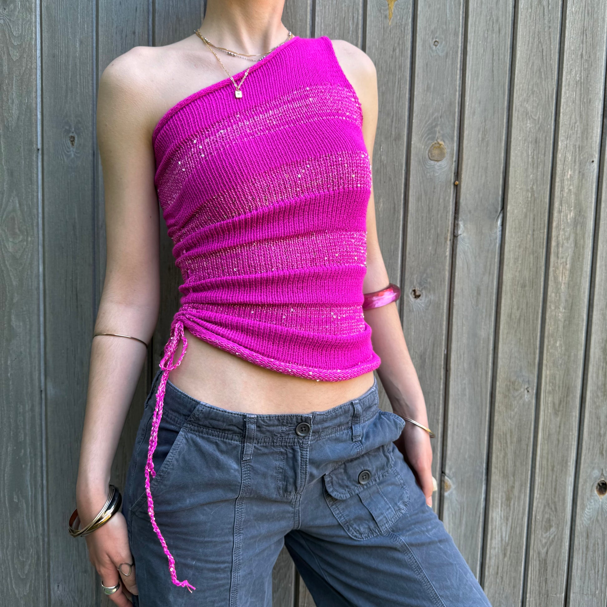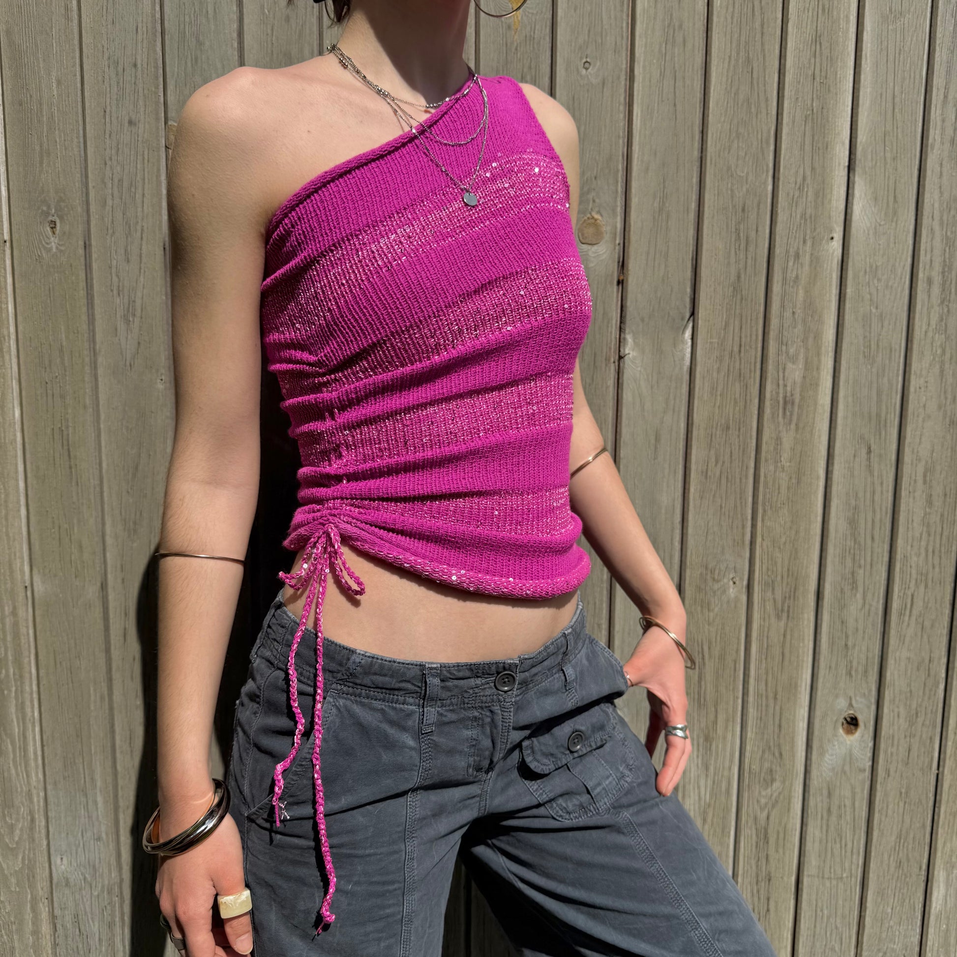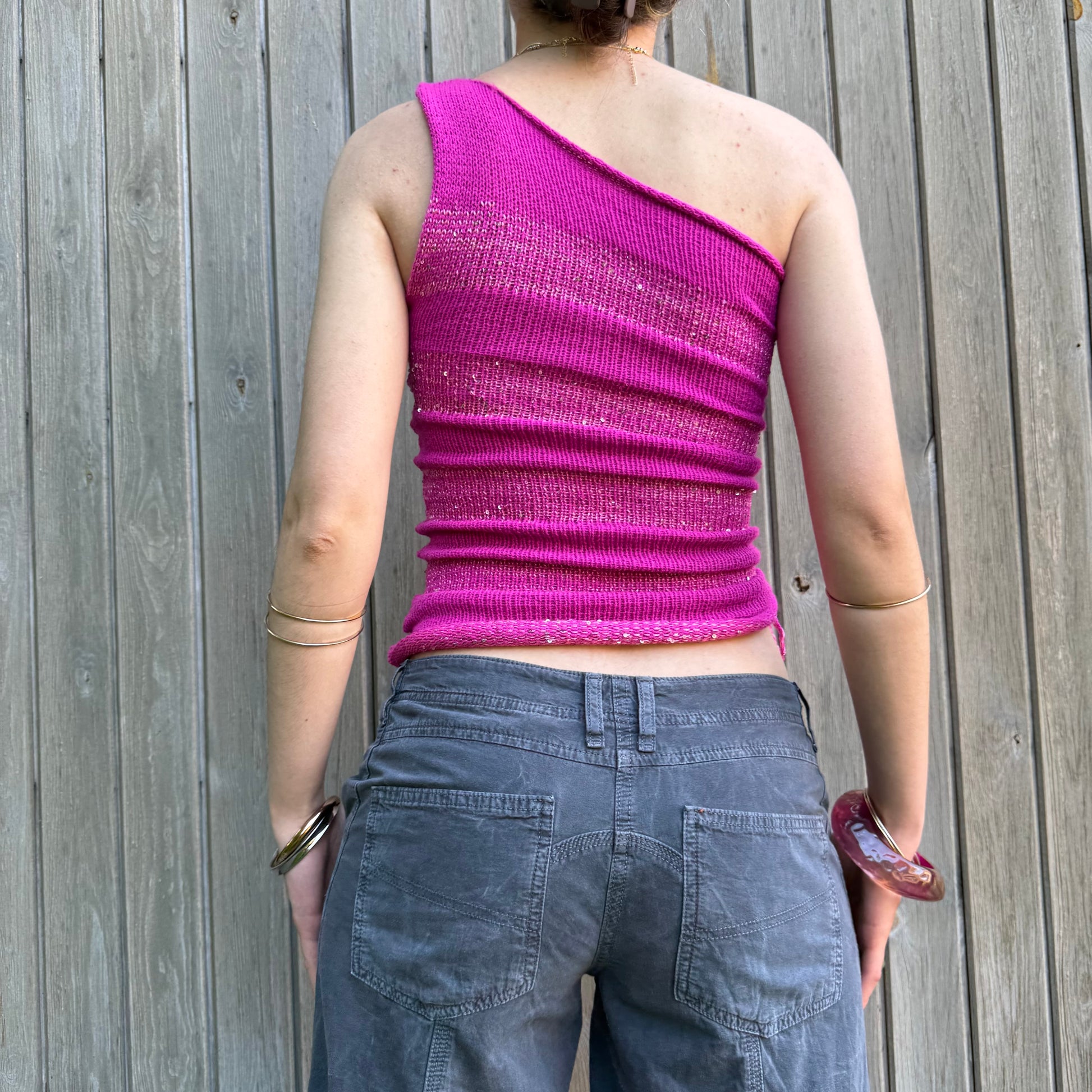 New design! ✨ The cutest glittery knitted one shoulder top with a draped effect in a gorgeous hot pink colour 🩷