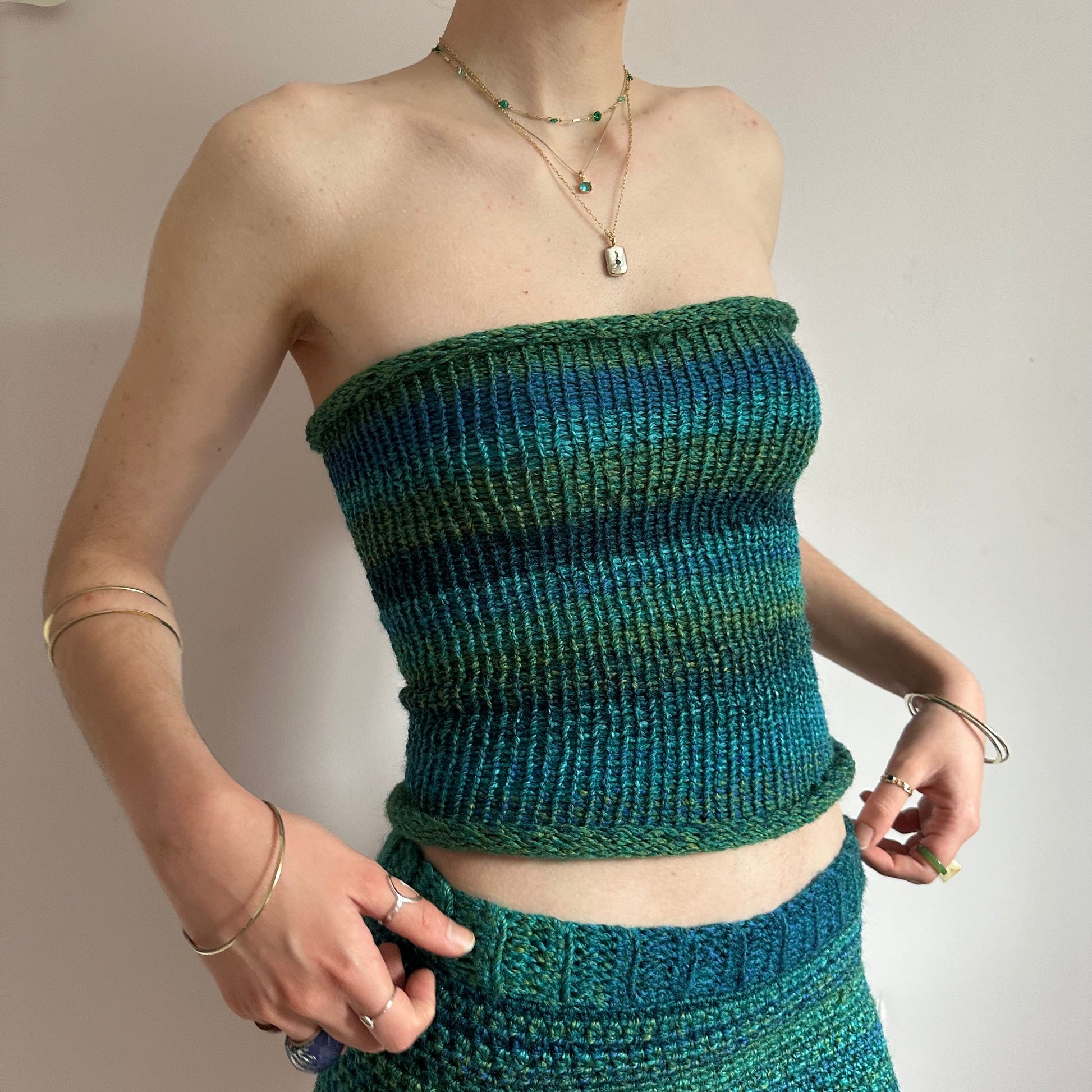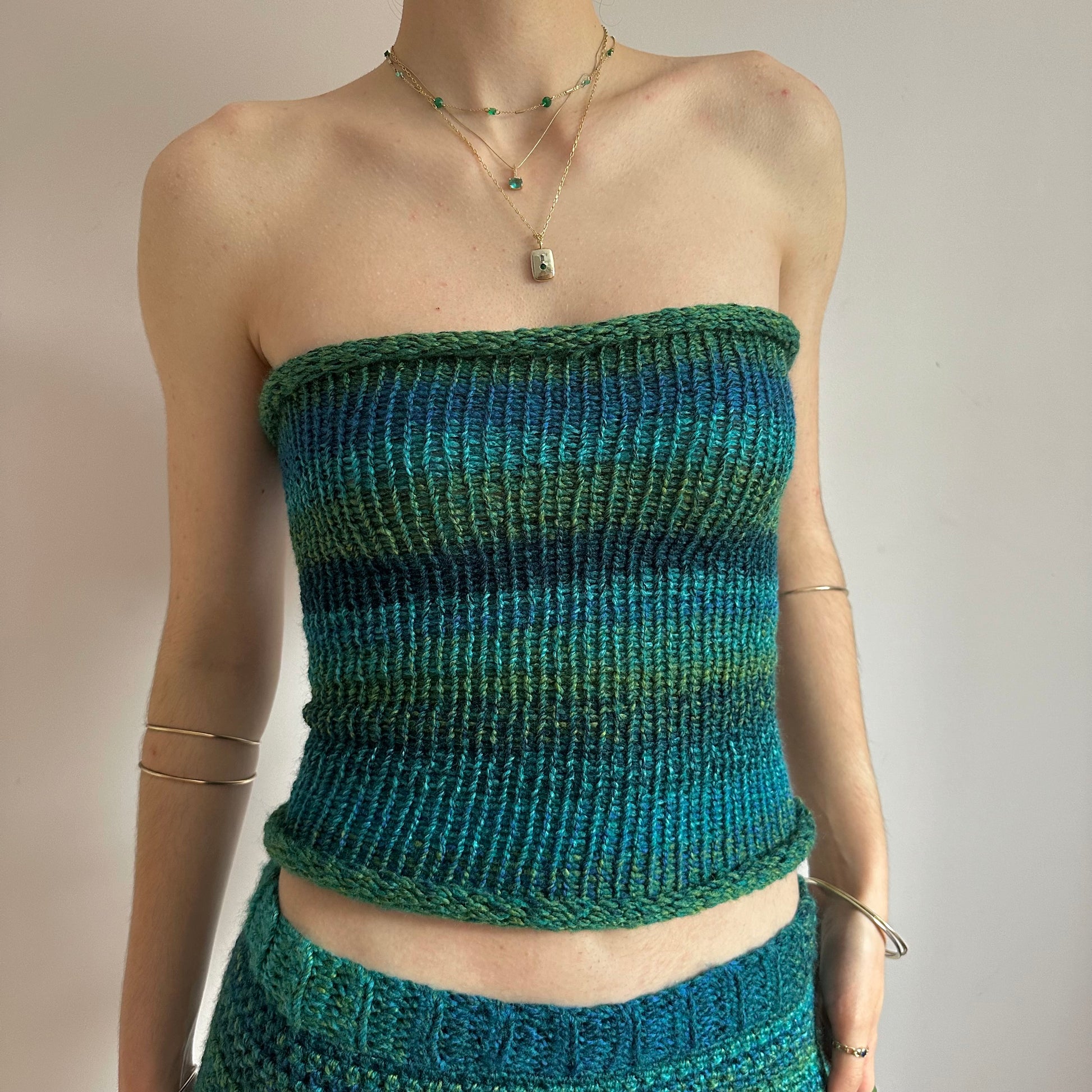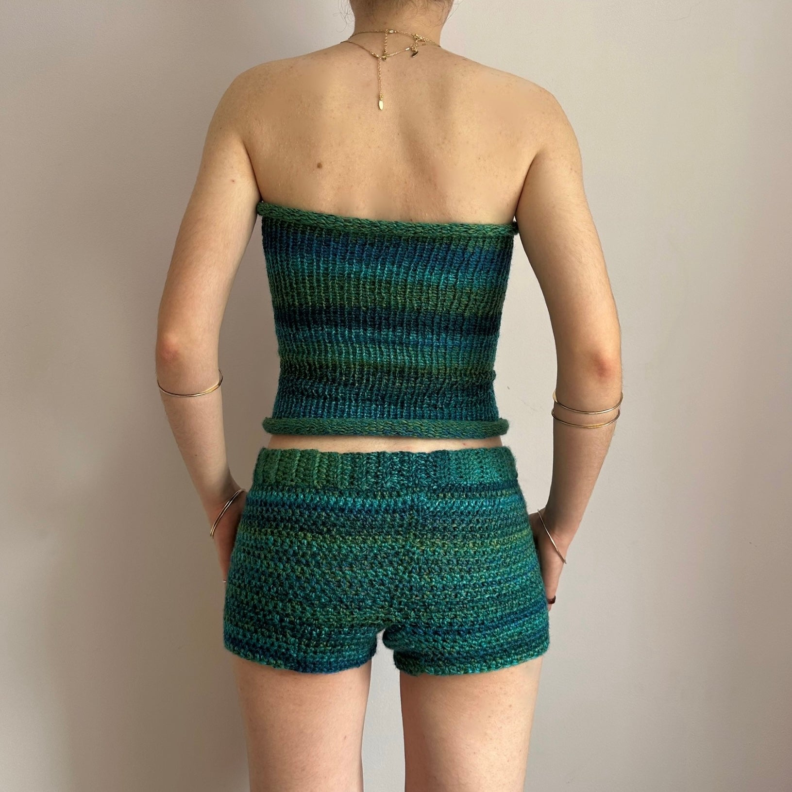Matching set: green and blue striped crochet shorts and knit bandeau top