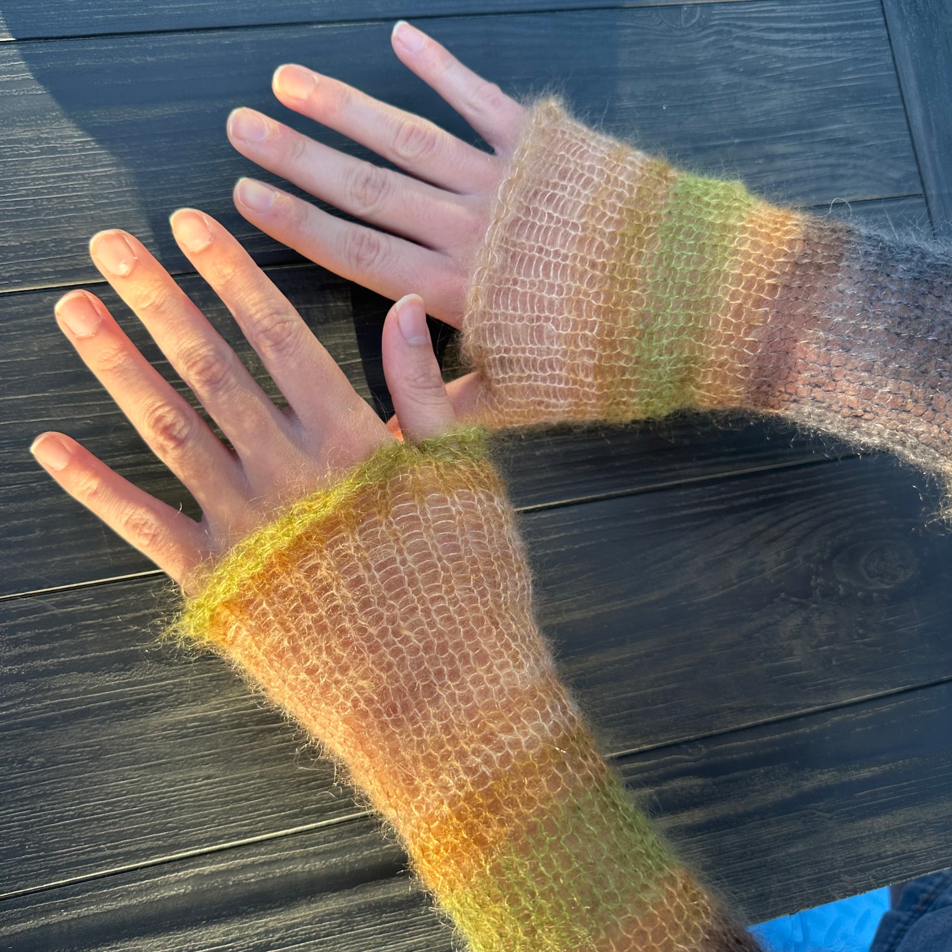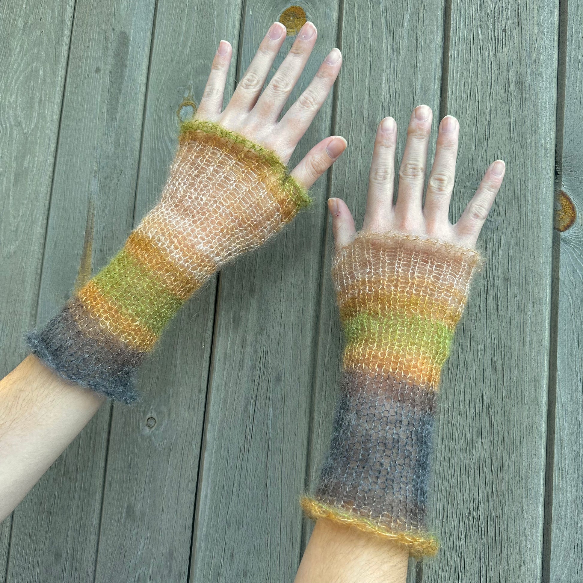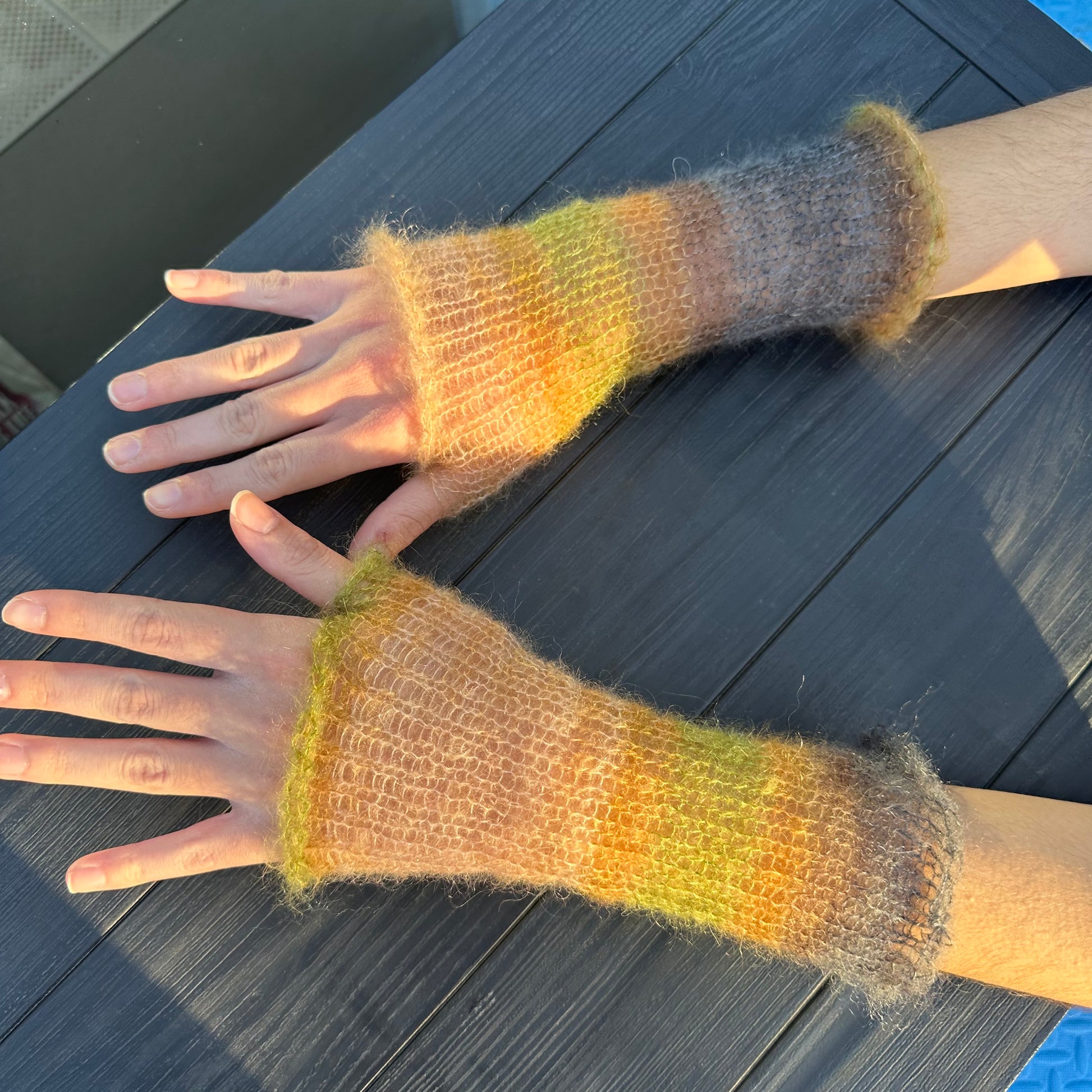 Handmade knitted mohair hand warmers in ombré earth tones - with thumb hole