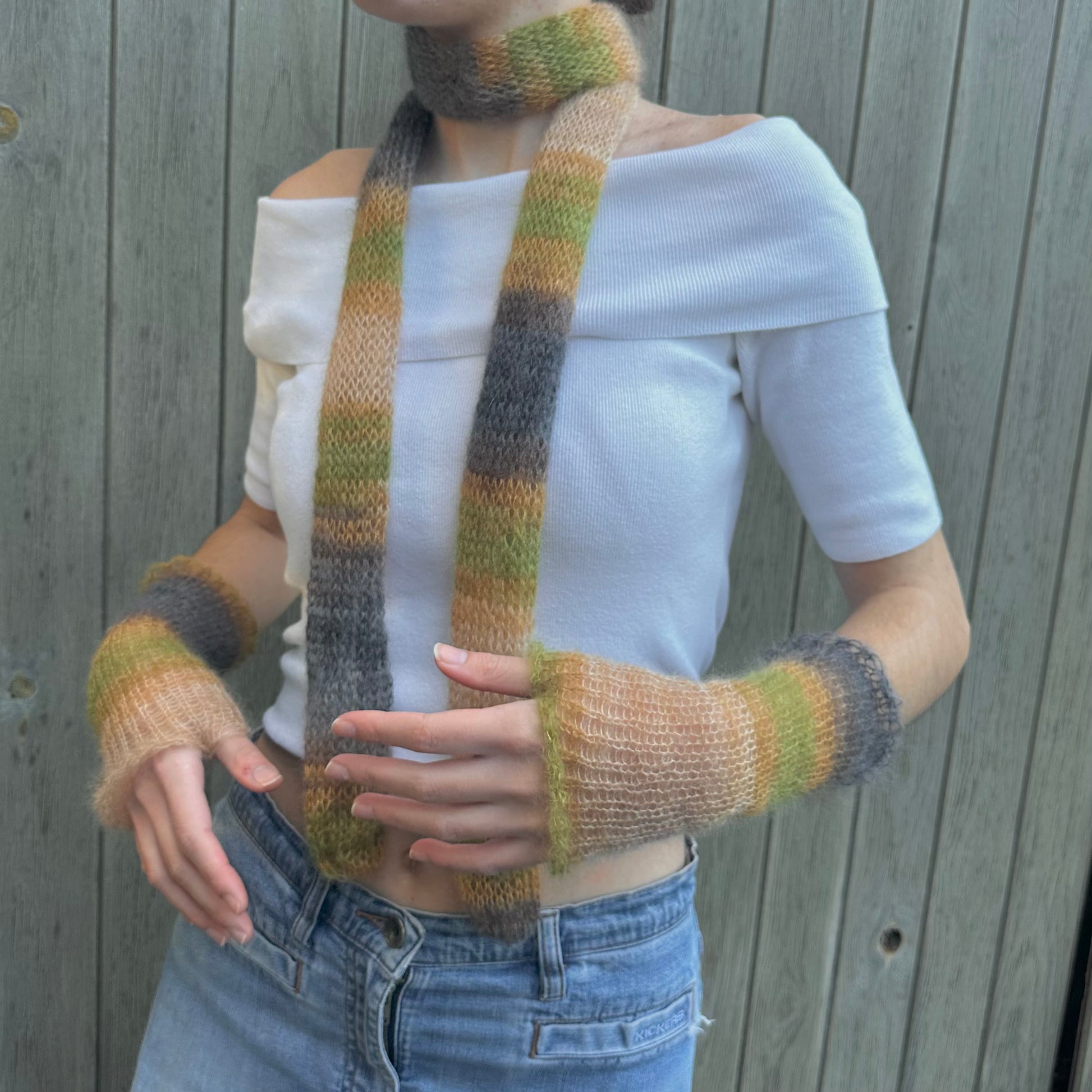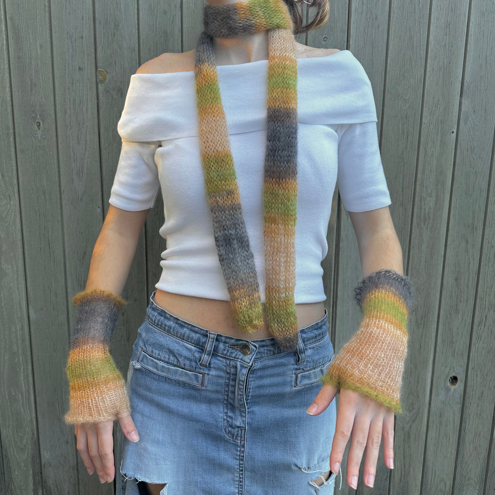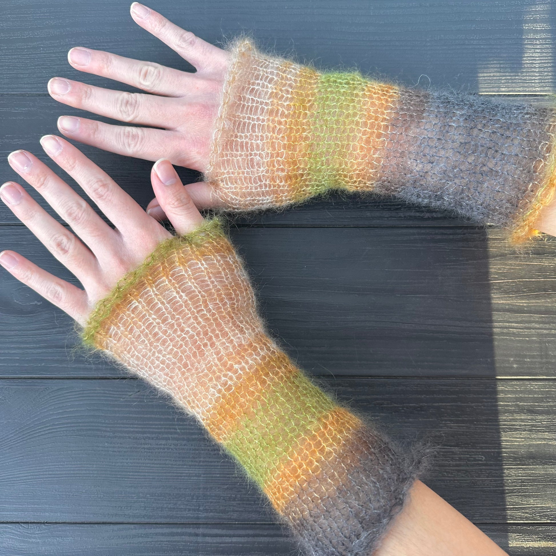 Handmade knitted mohair hand warmers in ombré earth tones - with thumb hole
