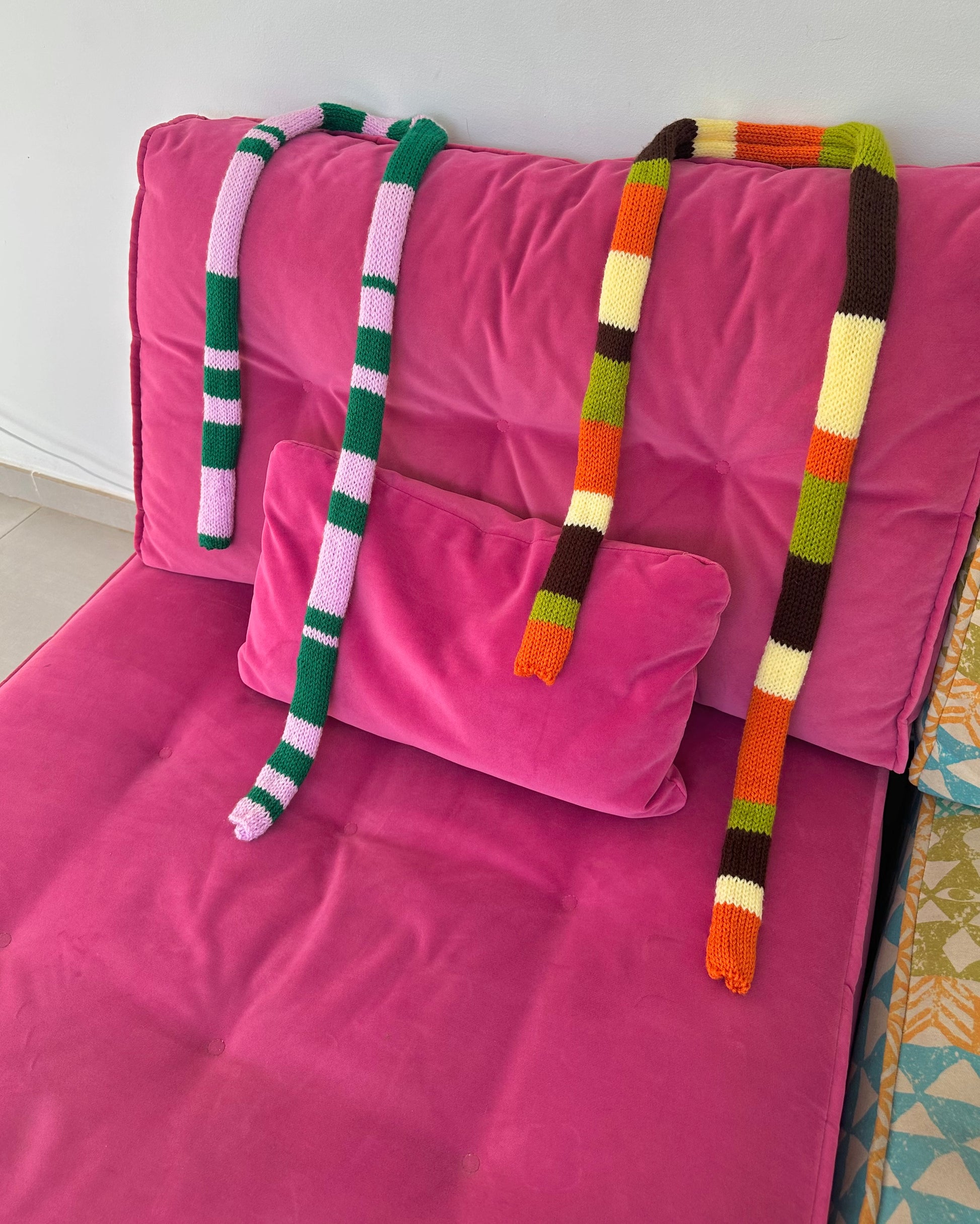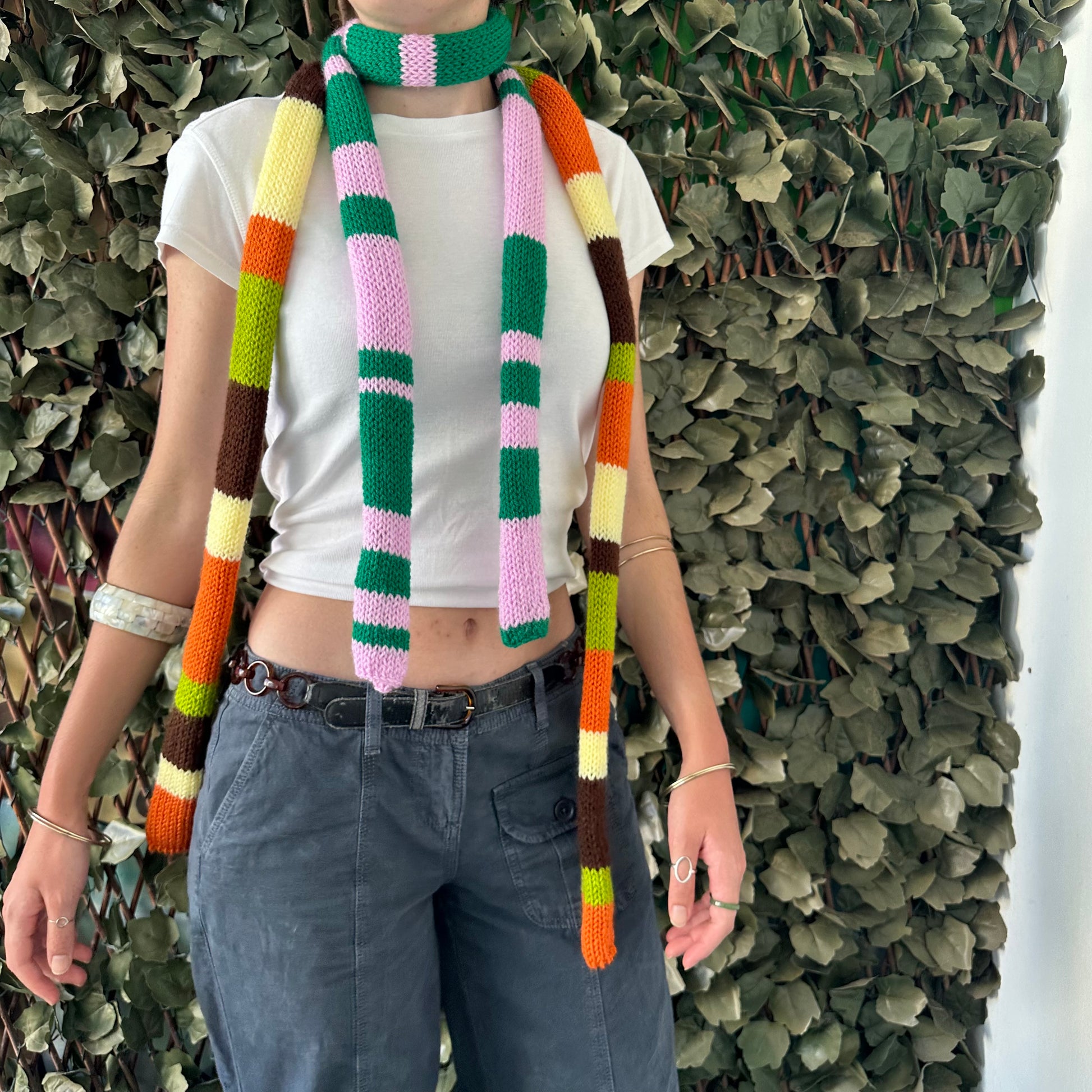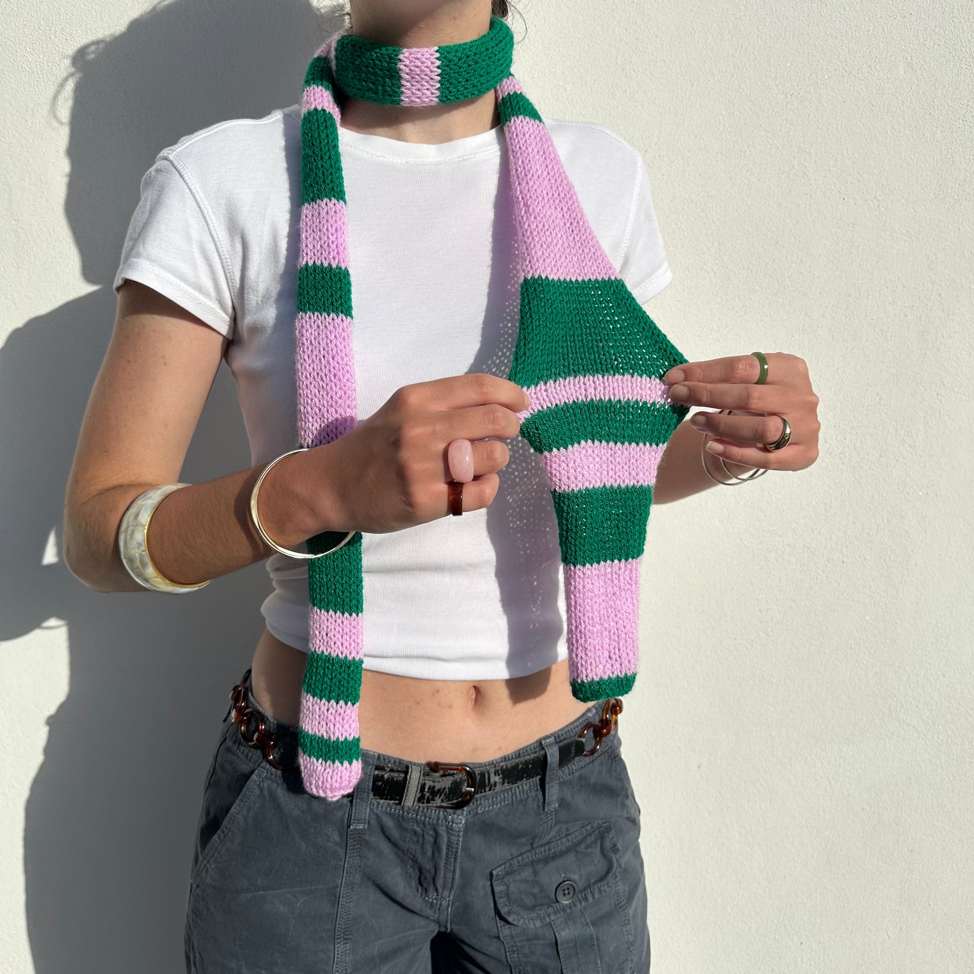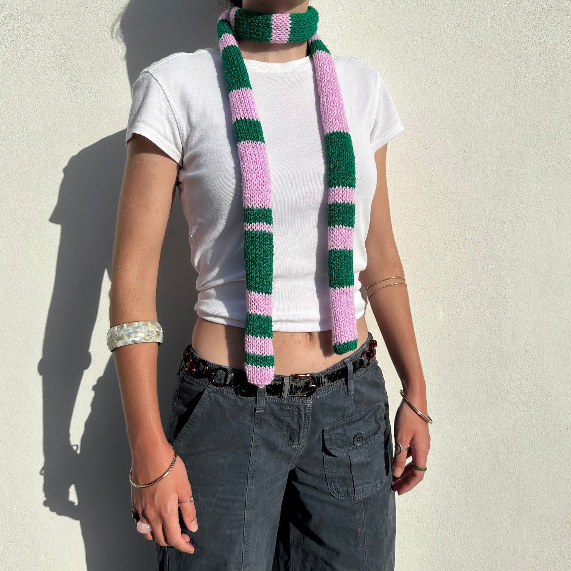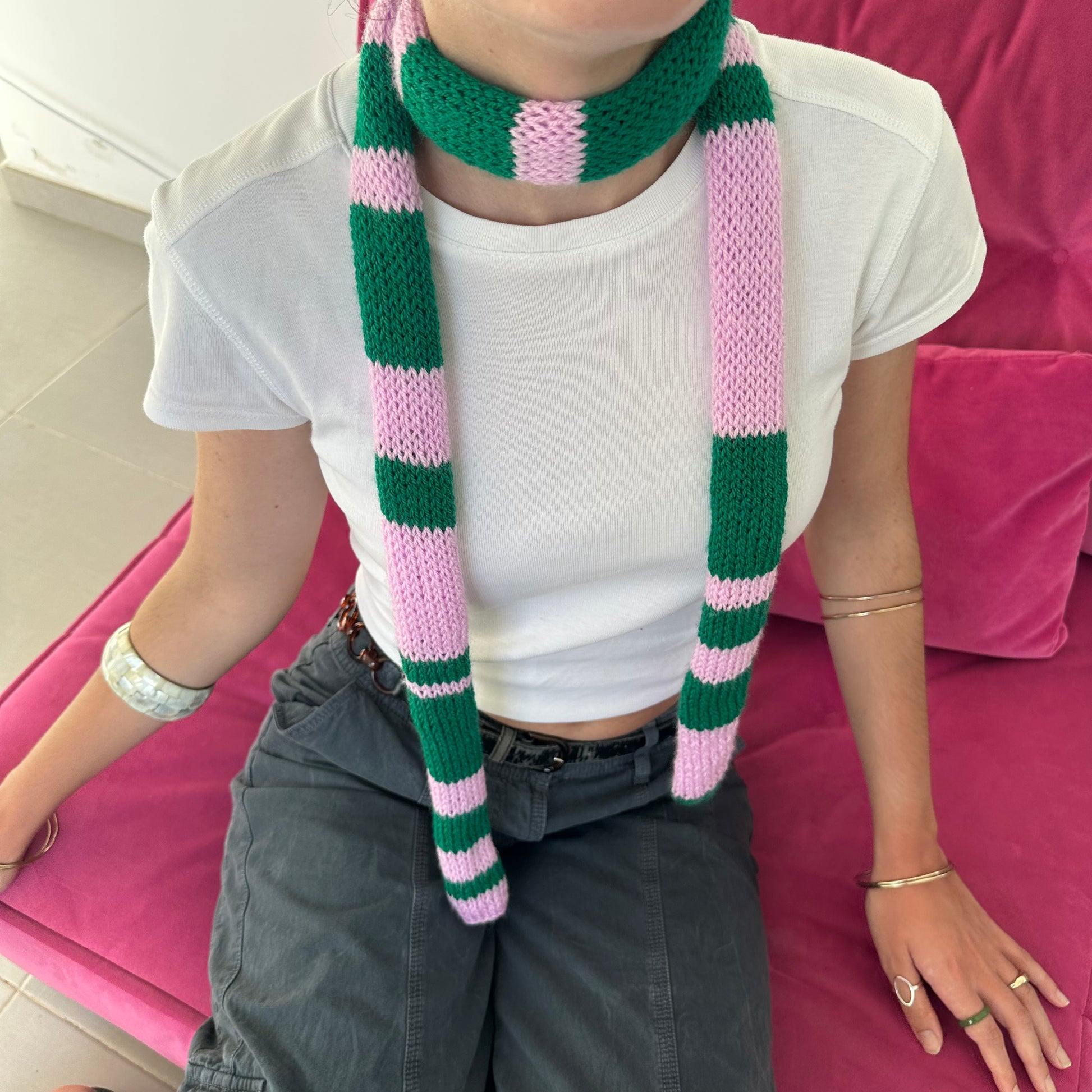 Striped knit skinny scarf in pastel pink and emerald green, the perfect addition to your outfit and really flattering. Great for all year round! 🌸🐢